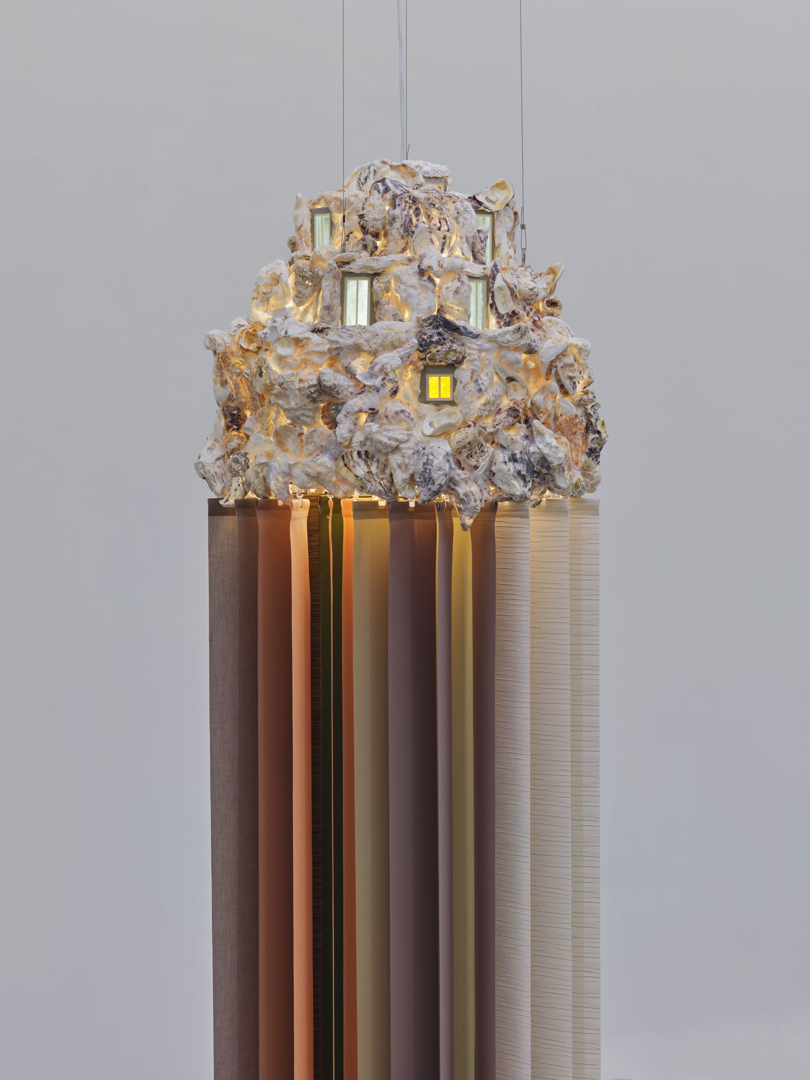 The middle floor is dedicated to domestic space – a place of belonging and protection, but also of projection of inner processes. In the series Hours of Dog (2020–2025), sculptural forms emerge, condensing into cloud-like structures made of oyster shells or fragments of buildings. Neon light glows from within, illuminating the small model windows and making the works appear like miniatures of architectural dreamscapes. This combination creates the impression of being in an intermediate realm that seems both organic and artificial, familiar and alien. With the title, Ingarden suggests a poetic shift by metaphorically alluding to the transition period between day and night. That moment of twilight when the familiar (day, dog) and the unfamiliar (night, wolf) / Kunsthalle Appenzell coexist. Together with the videos The Arm, The Eyes, The Ears, The Womb, The House and The Garden (2018), an image of the house as a living organism is created. Architecture is not represented as a static structure but as a body with organs, moved by messages, objects and personal stories. The home becomes a permeable membrane between the inner psyche and the outside world – a threshold that shows how deeply the private sphere is interwoven with social, media and technological structures.