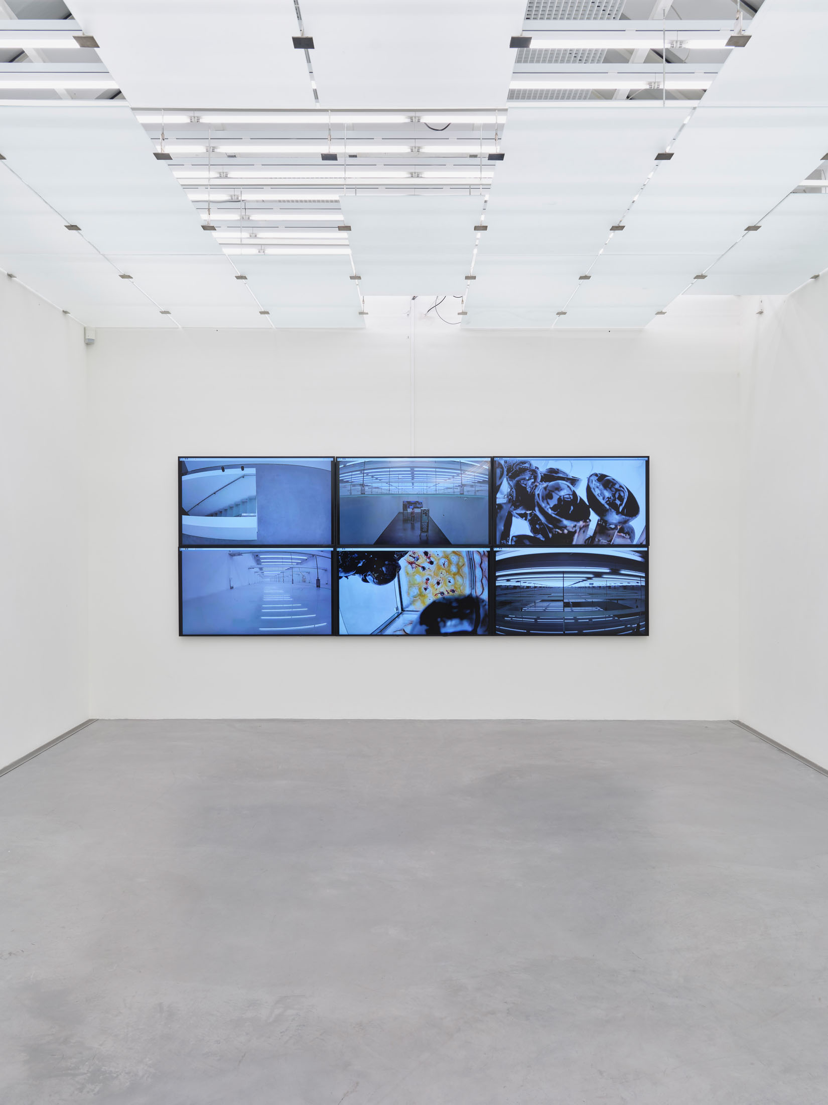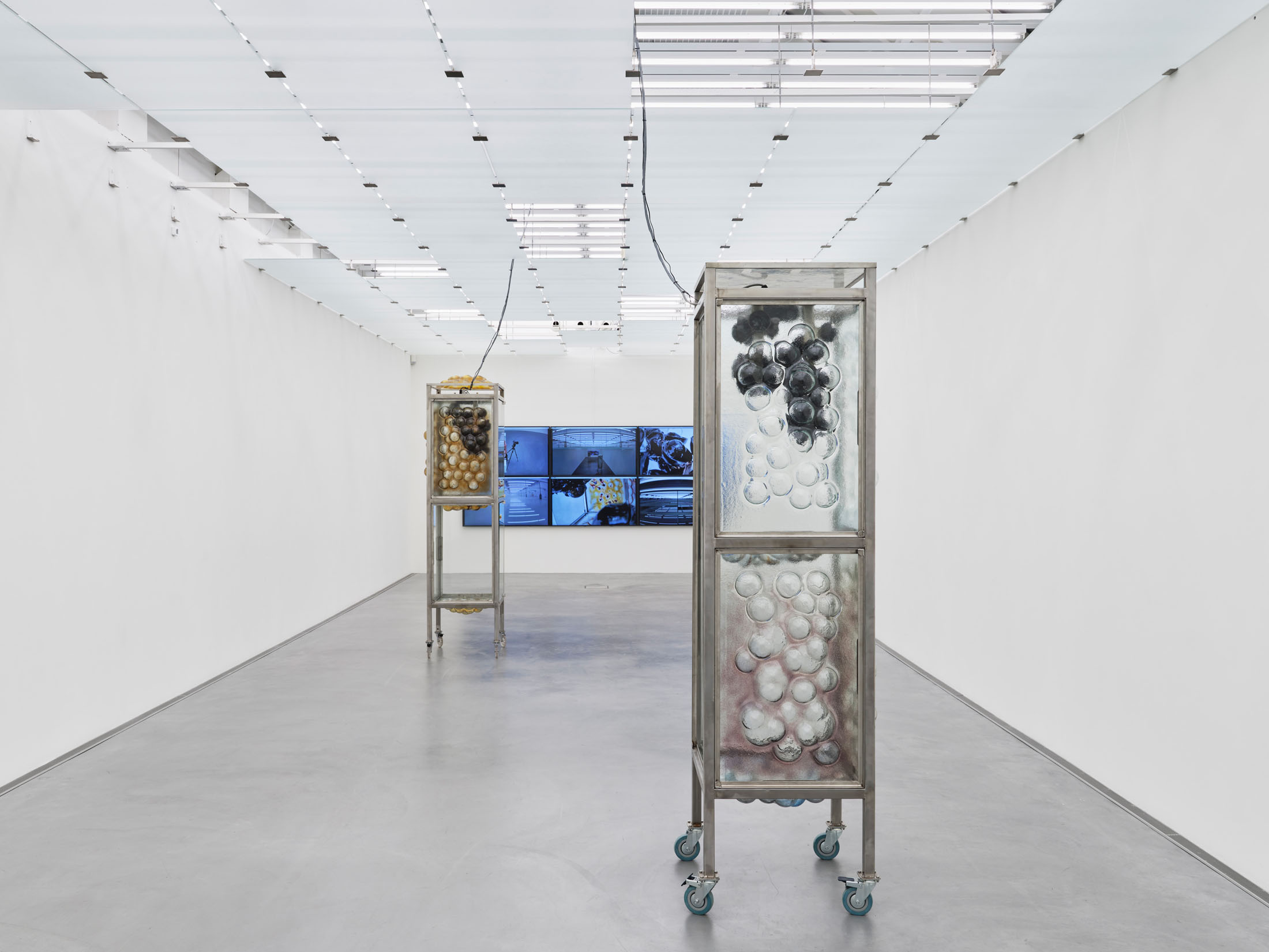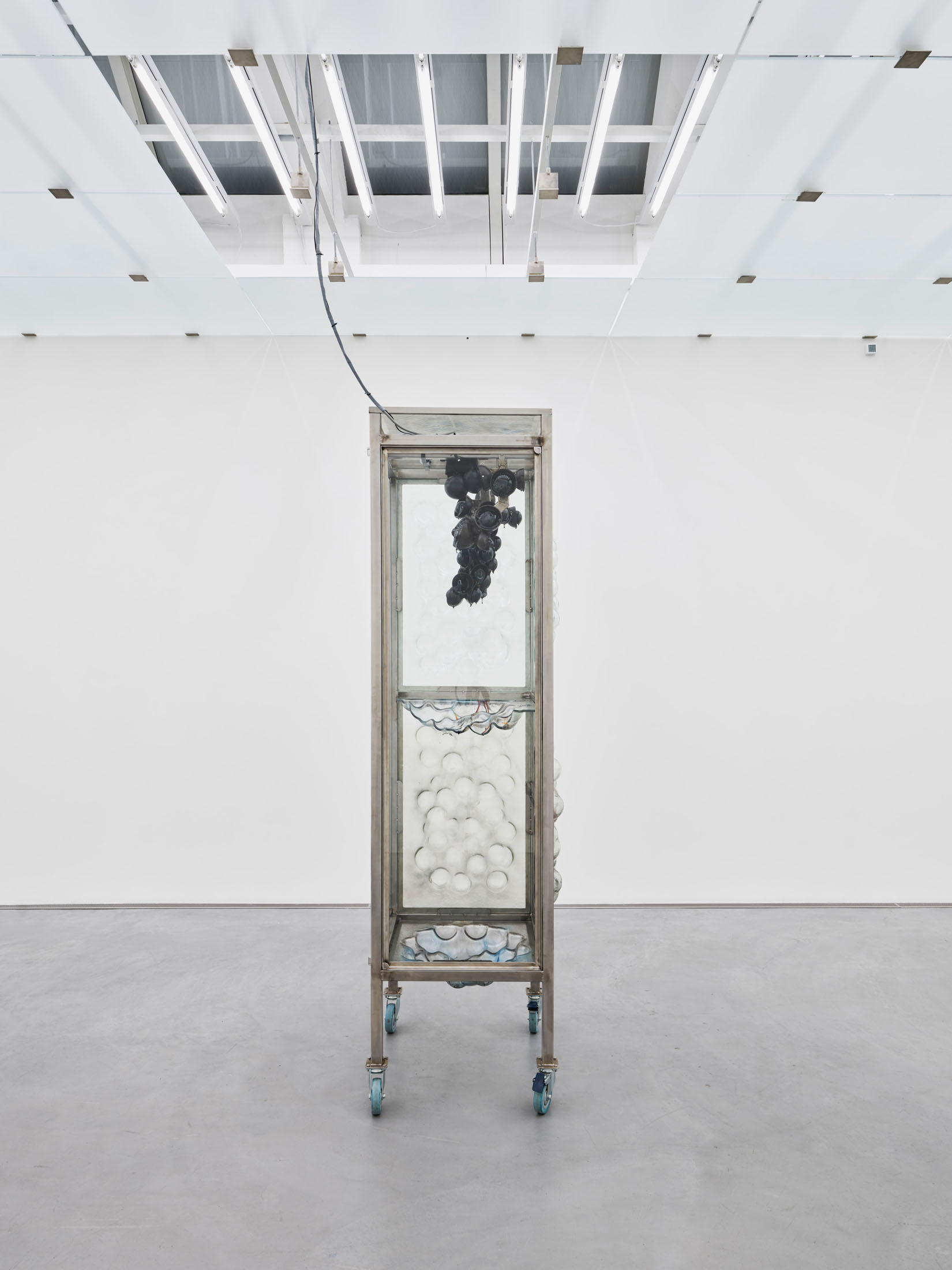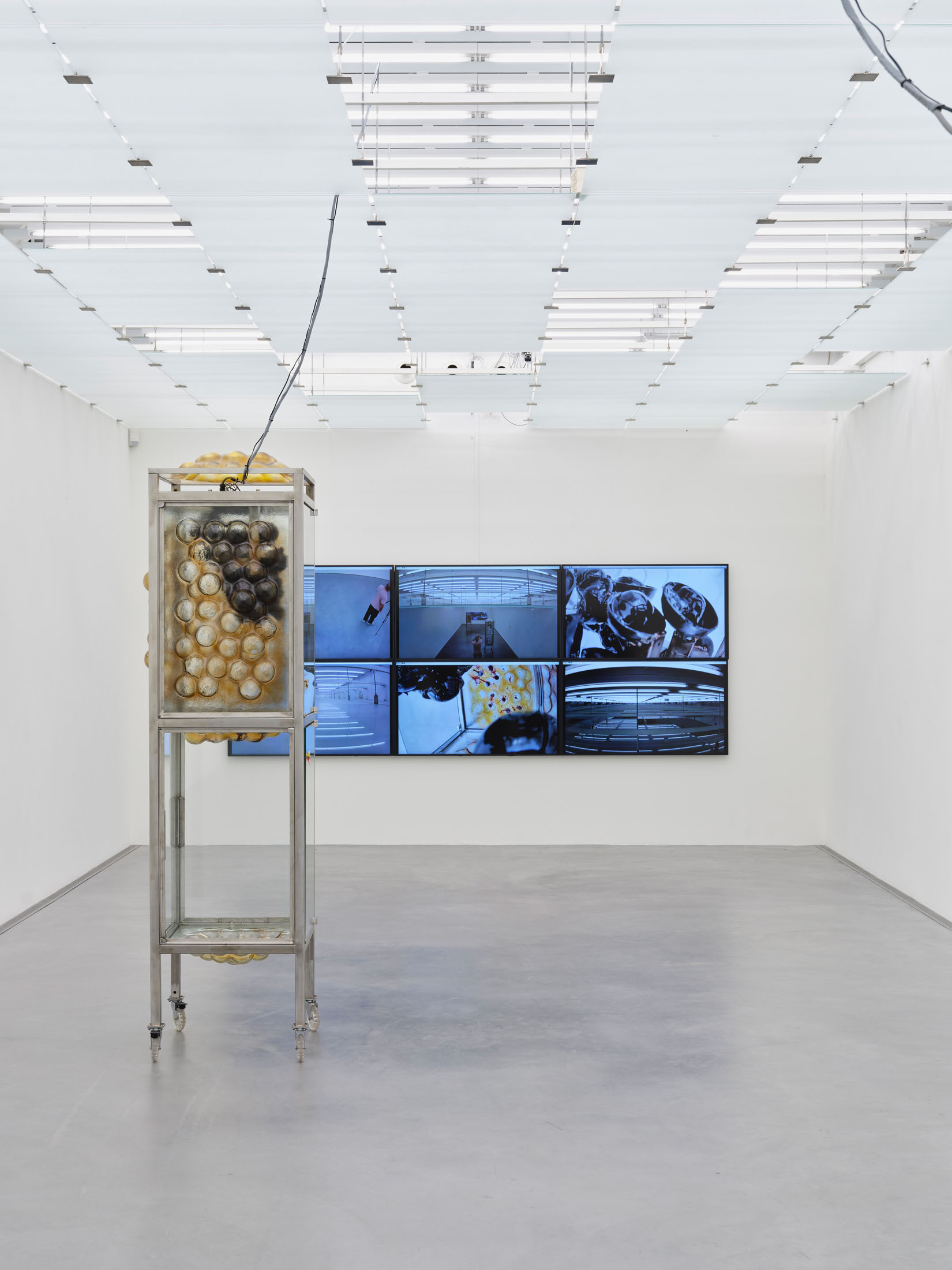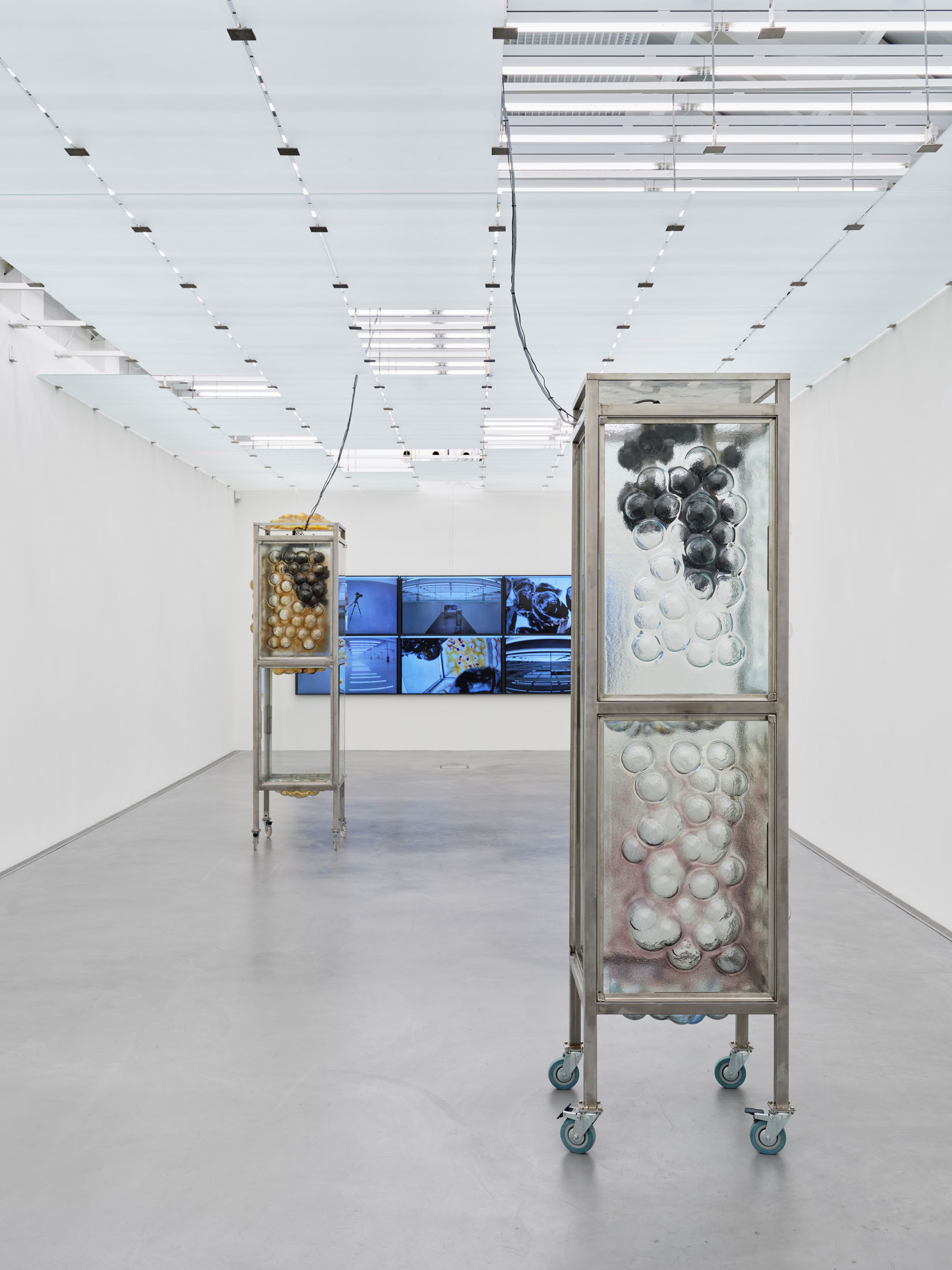 On the top floor, the exhibition leads into the interior – into a room that is both a surveillance centre and a space for reflection. With the works Social Security (Grandma’s Cupboard) and Social Security (Bathroom Fridge) (both 2022), Ingarden explores the intertwining of intimacy, security and control. The subtitles refer to pieces of furniture that are familiar places in everyday domestic life and here become vehicles for questions of protection, care and social dependencies. A wall of monitors, fed with camera transmissions from inside the sculpture and real-time images from the building’s security cameras, transforms the room into a hybrid control centre. By exposing the glass ceiling and playing with reflections, a situation is created that stages both transparency and surveillance, thus making it possible to experience the fragility of security in the tension between privacy and control.