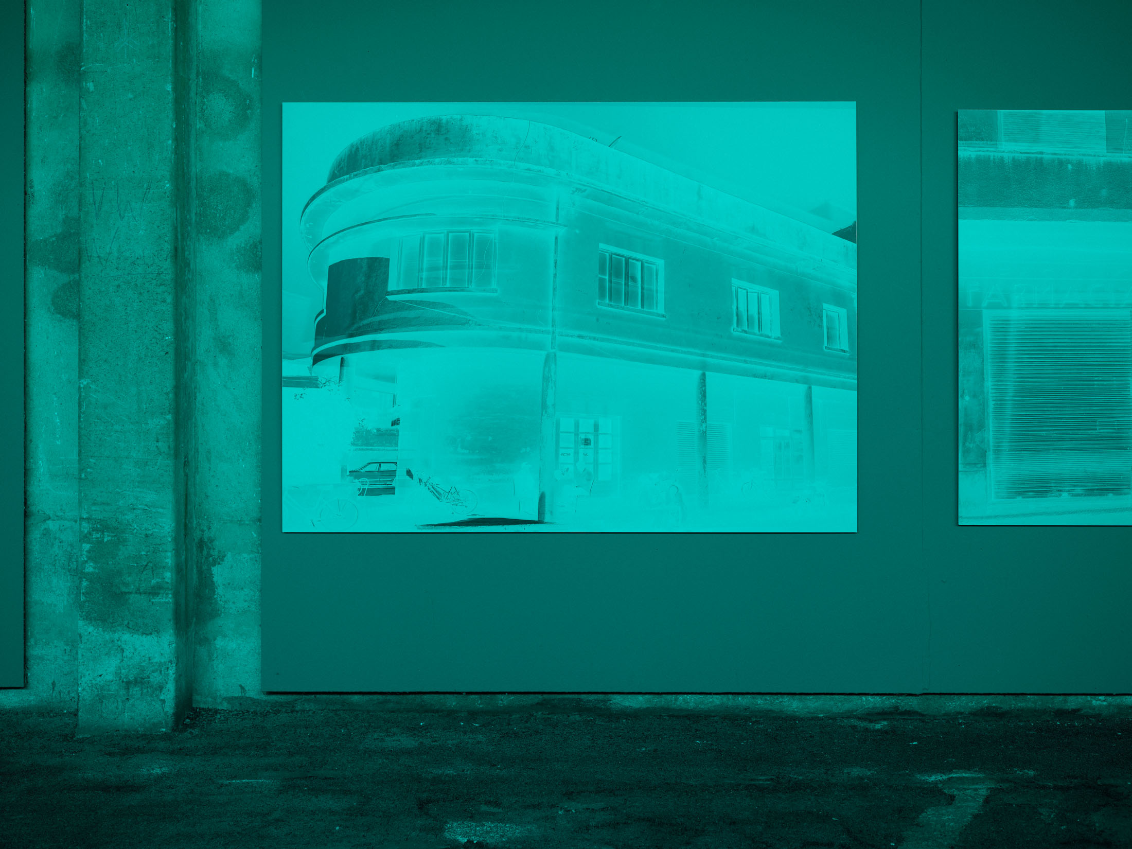 For the exhibition Casa M by Aida Kidane, the Kunsthalle Arbon has been bathed in turquoise light – an effect created by colored foils on the windows. For Aida Kidane, turquoise is a color rich in symbolism, inseparably tied to her birthplace Asmara. It evokes in her a subjective sense of memory of that city, accentuating her personal perspective and perception.