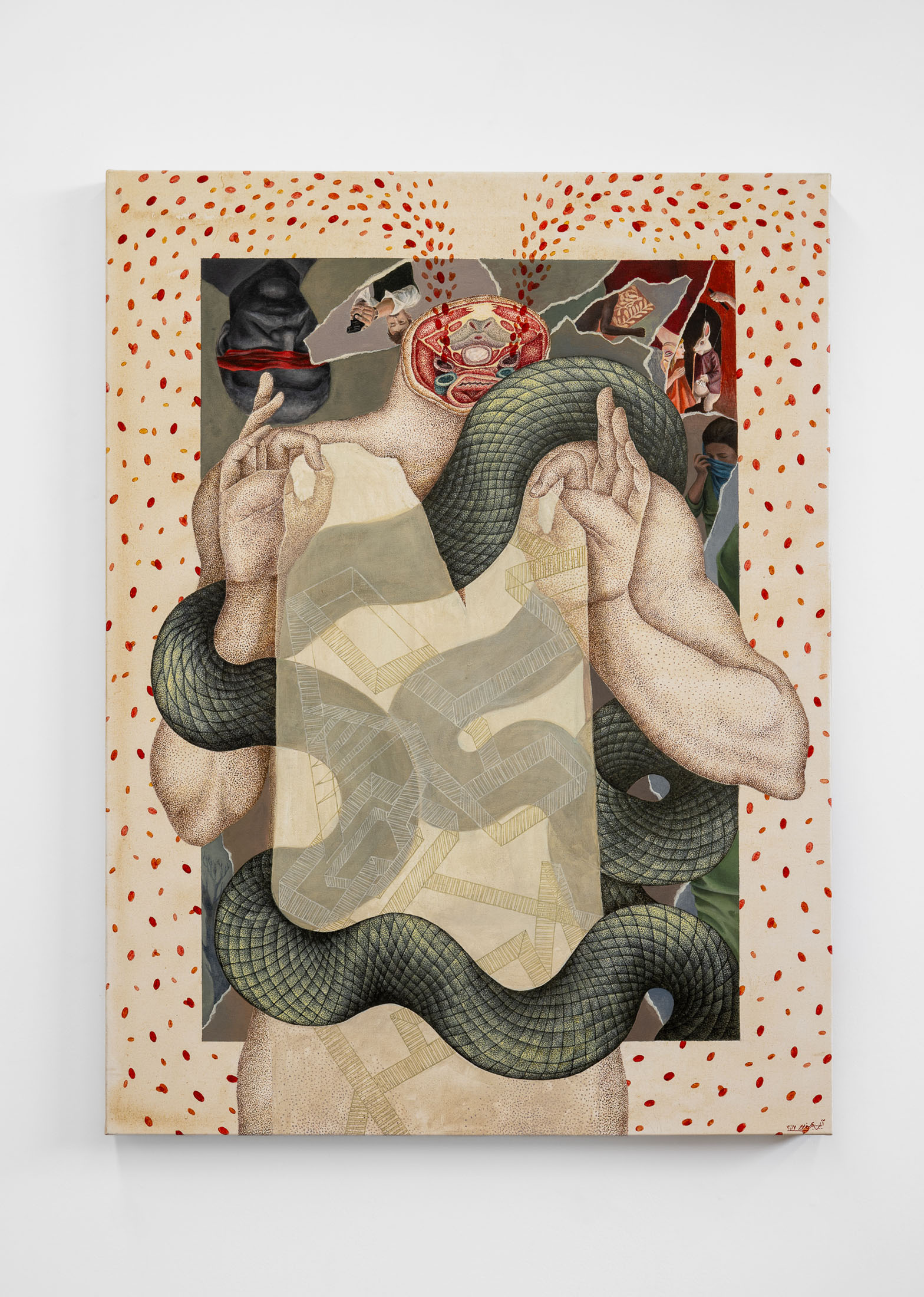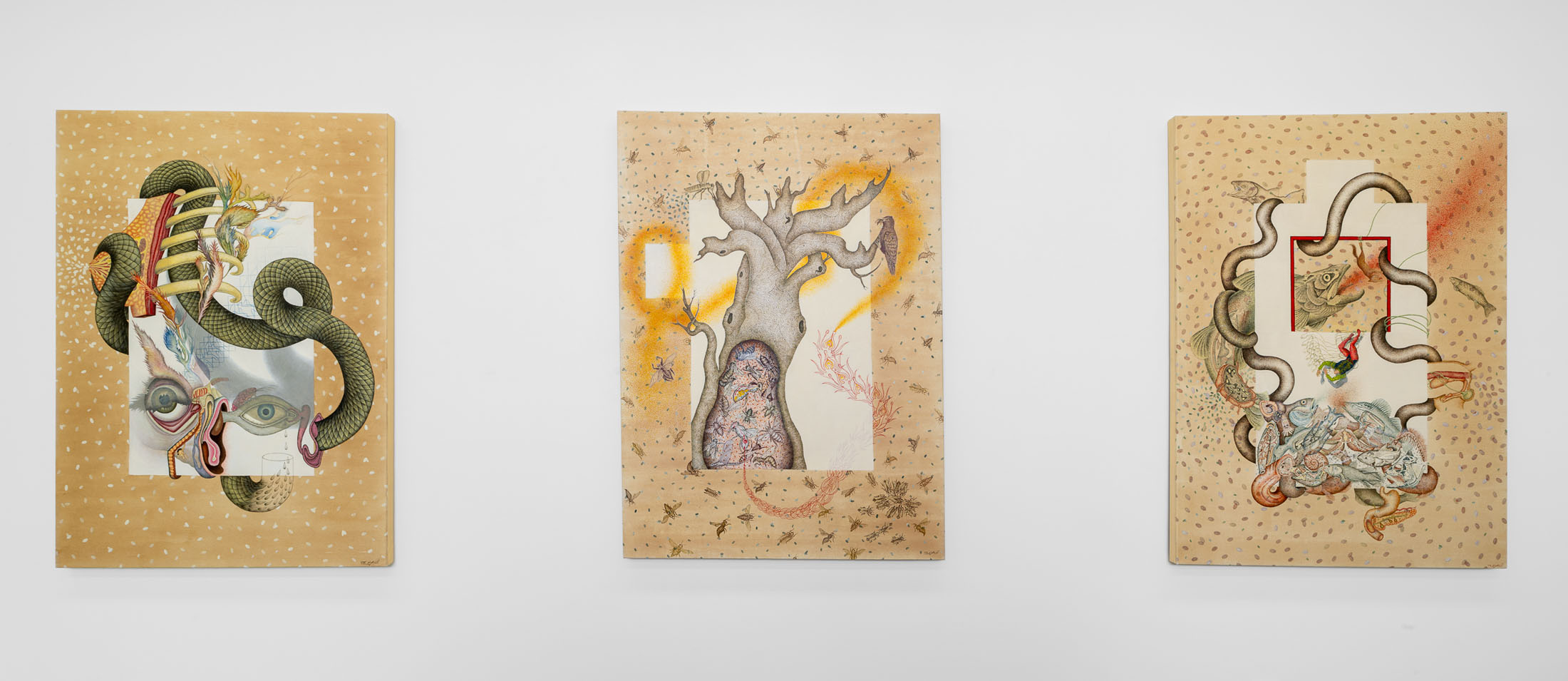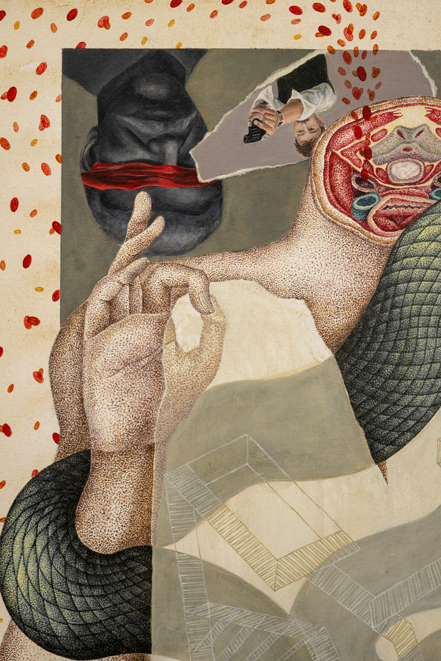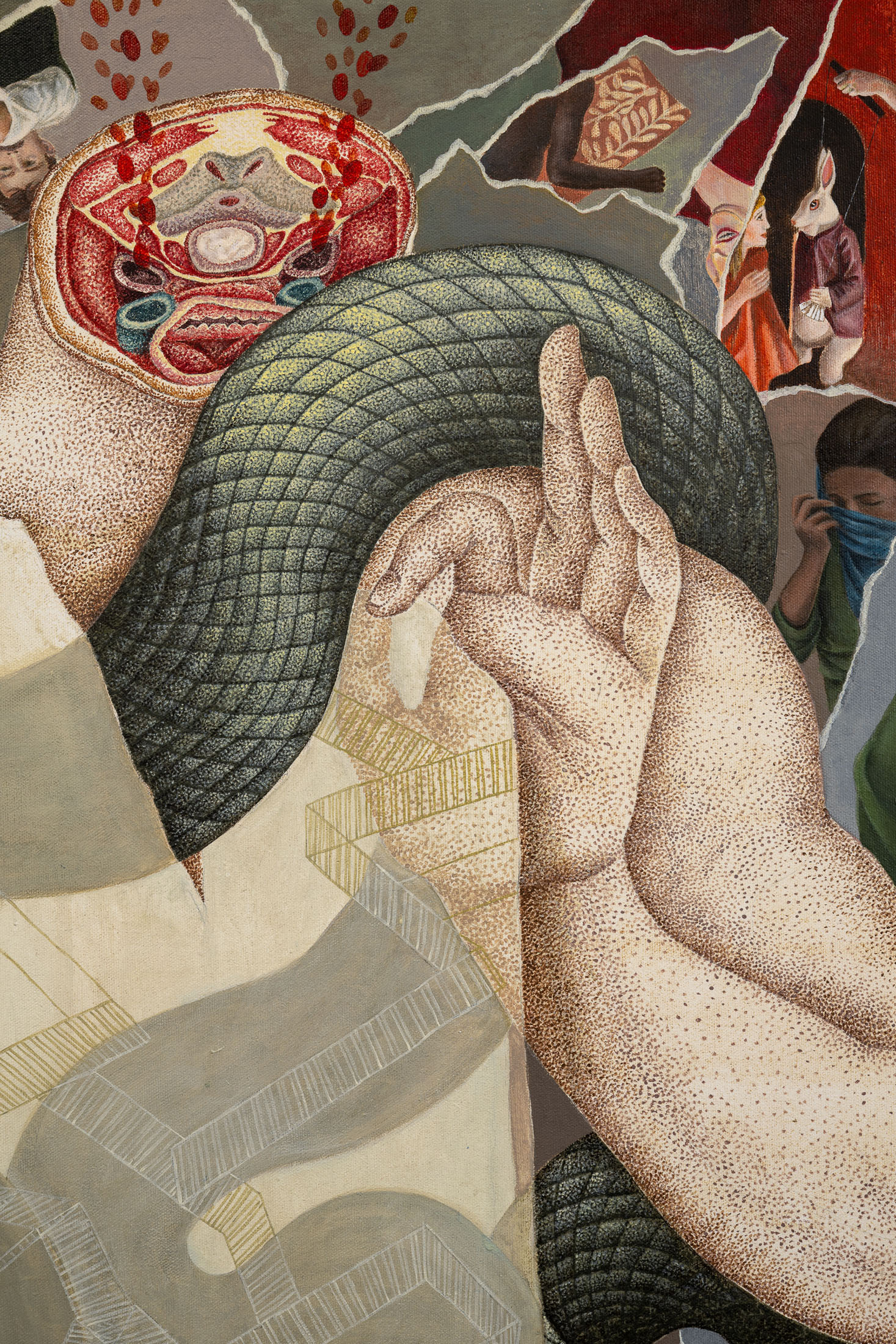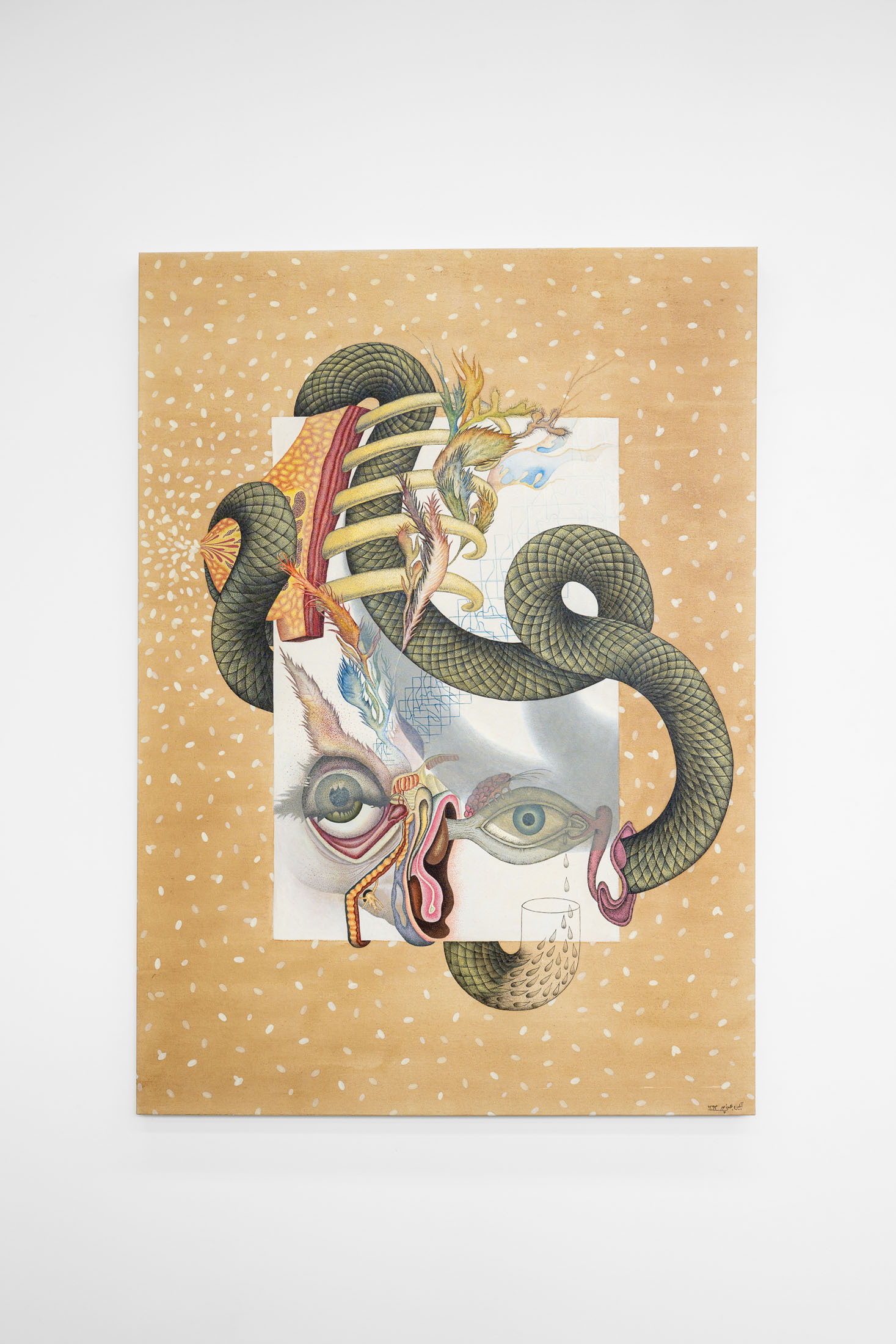 The early works in Zahak-nameh draw from Persian mythology and epic literature, fusing Persian traditional miniature painting with anatomical and biological illustrations. These references form a visual language through which Bahmanipour explores the body as both subject and site of historical memory. In the most recent work, she shifts toward a contemporary narrative, examining the ruptured body of today—physical, cultural, and political.