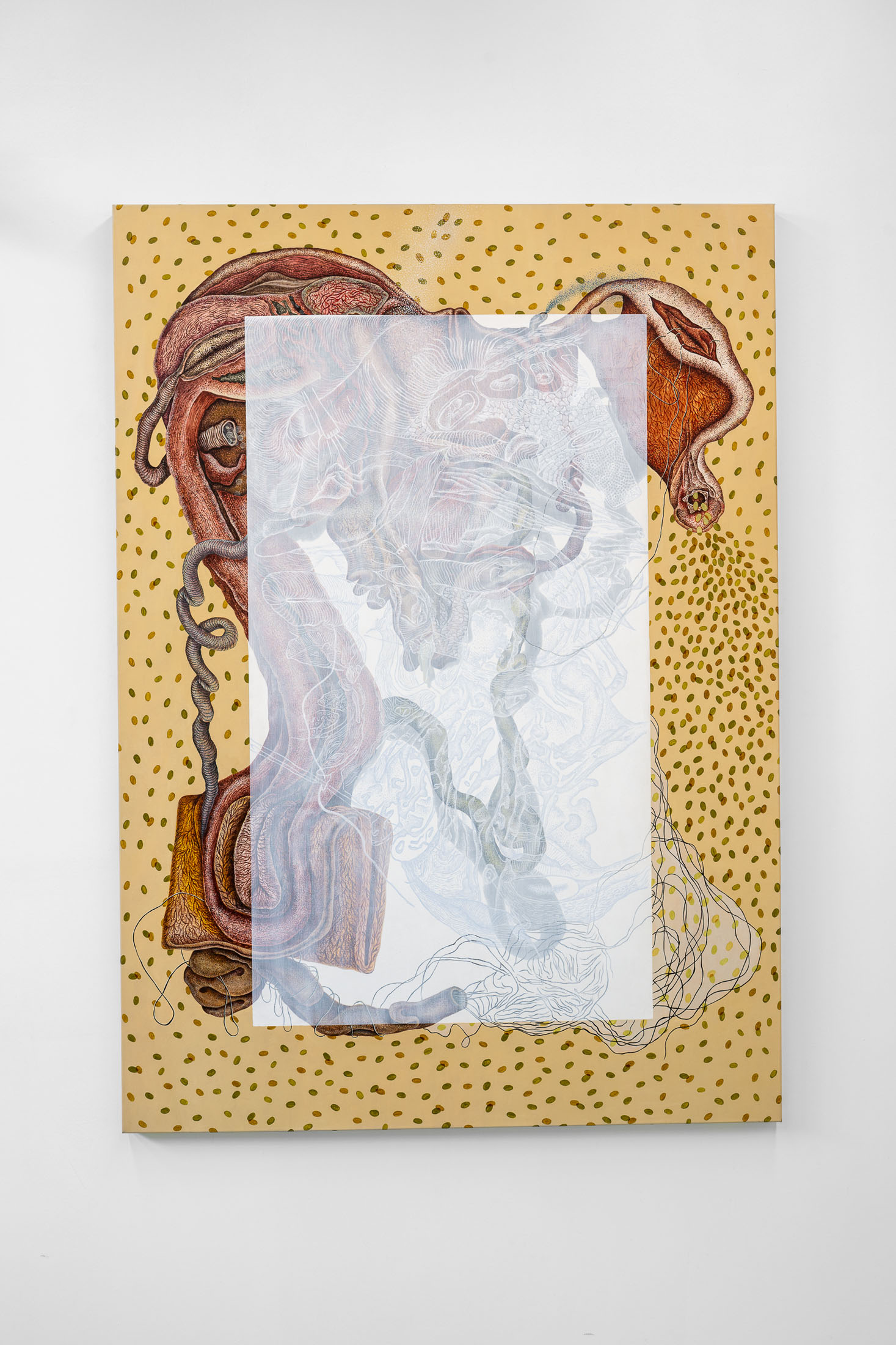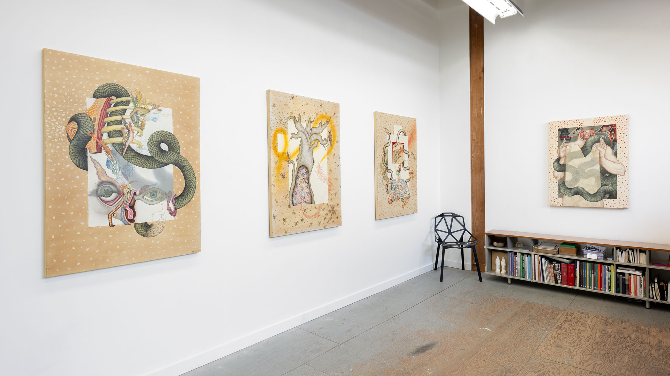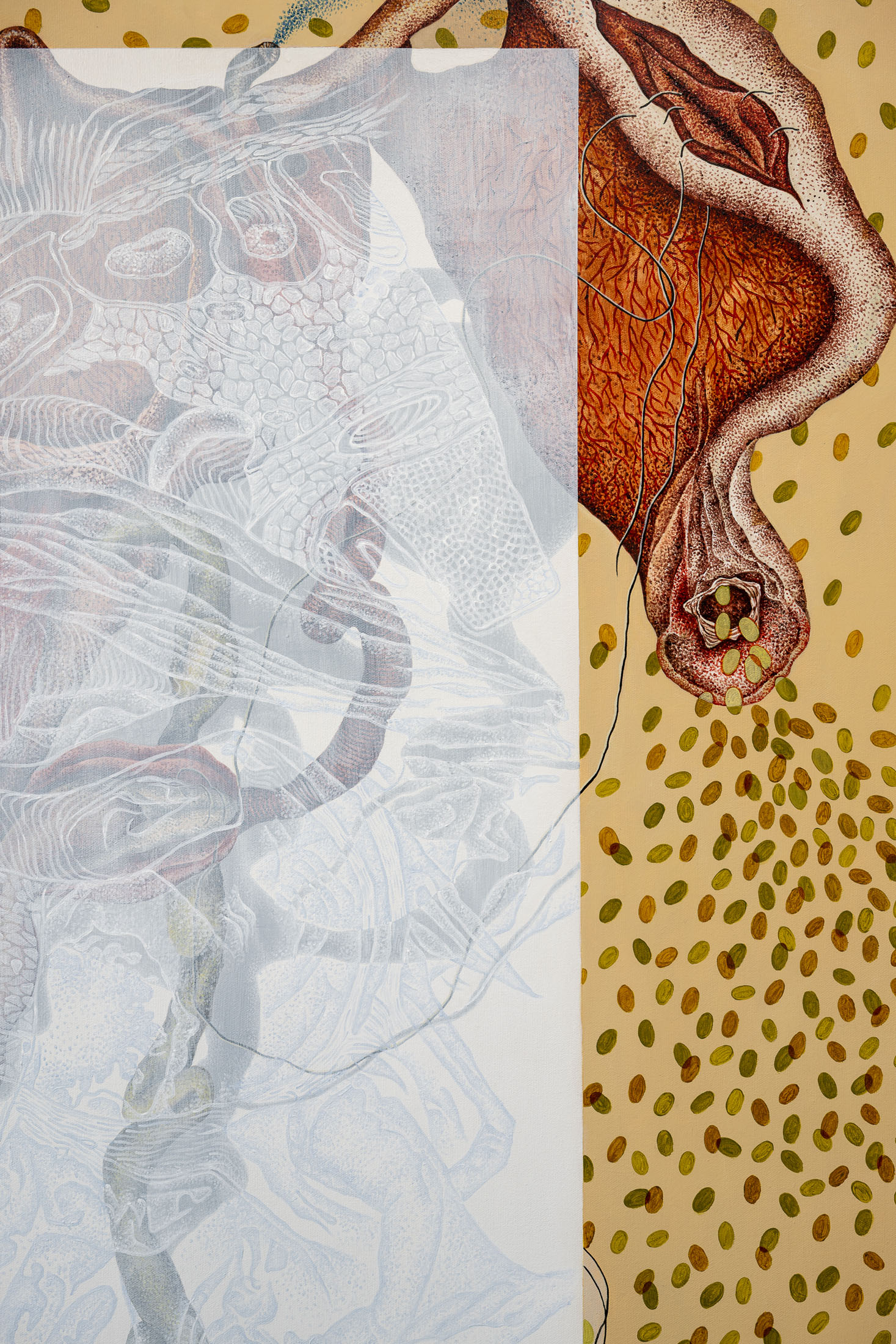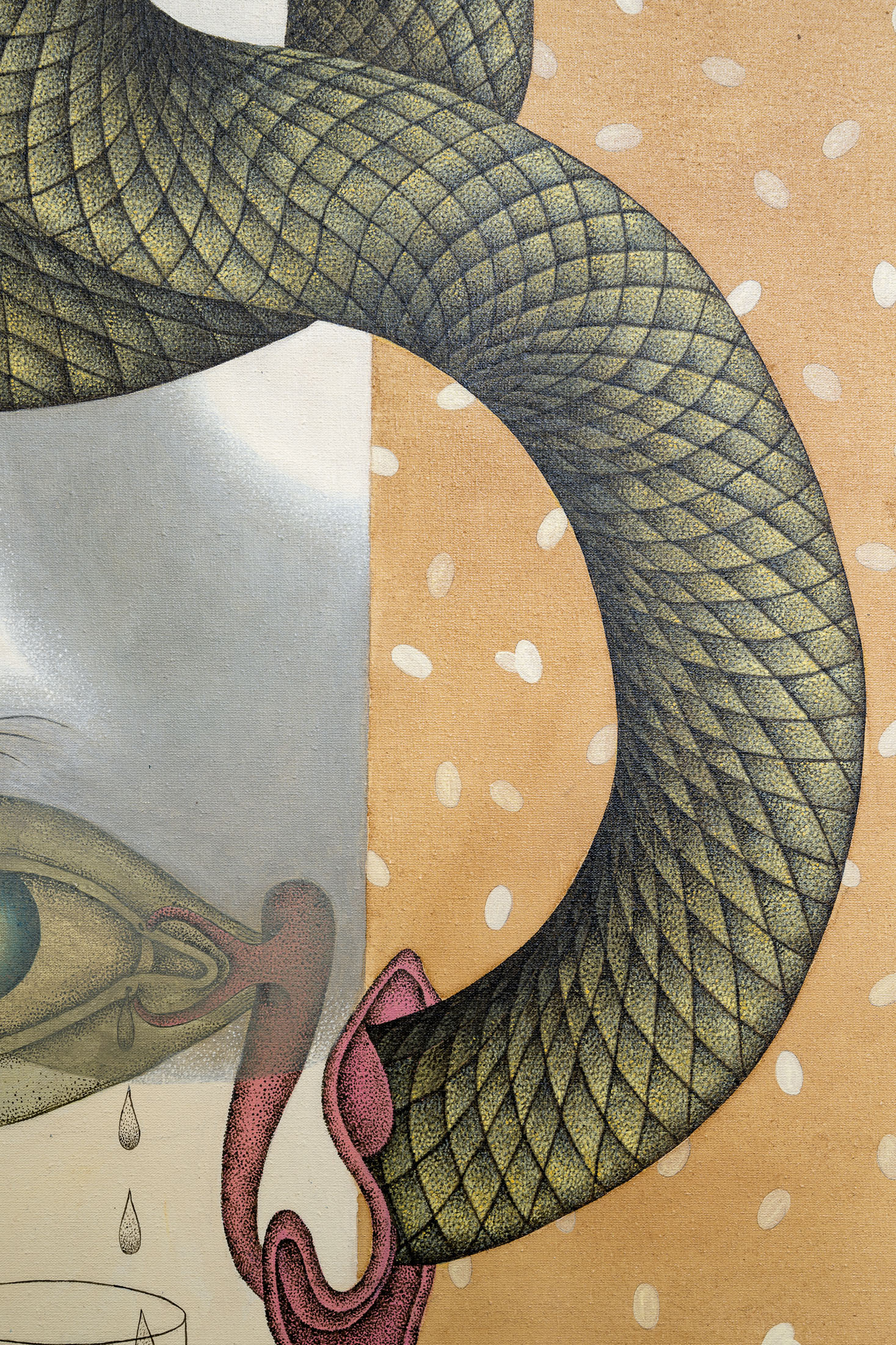 The early works in Zahak-nameh draw from Persian mythology and epic literature, fusing Persian traditional miniature painting with anatomical and biological illustrations. These references form a visual language through which Bahmanipour explores the body as both subject and site of historical memory. In the most recent work, she shifts toward a contemporary narrative, examining the ruptured body of today—physical, cultural, and political.