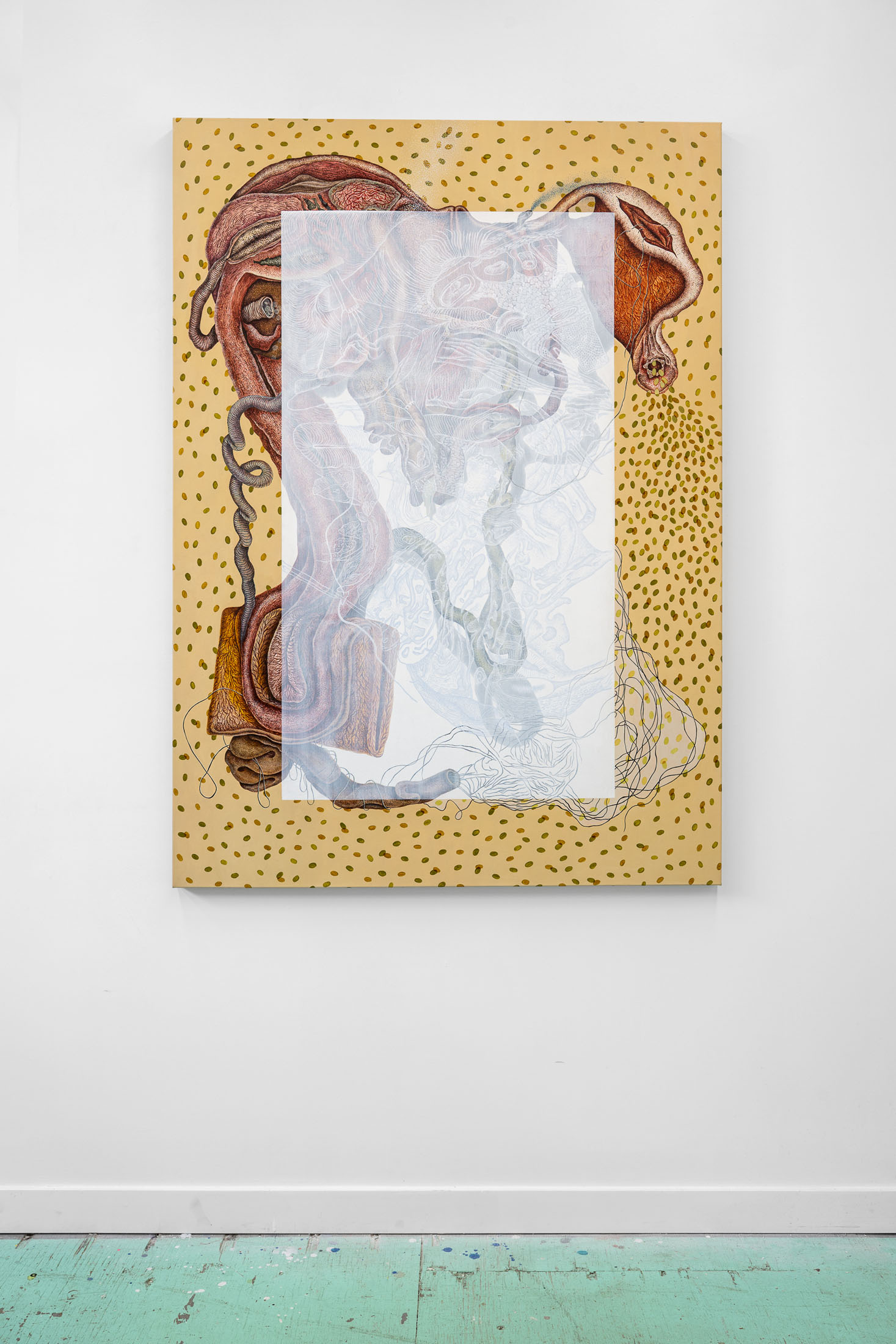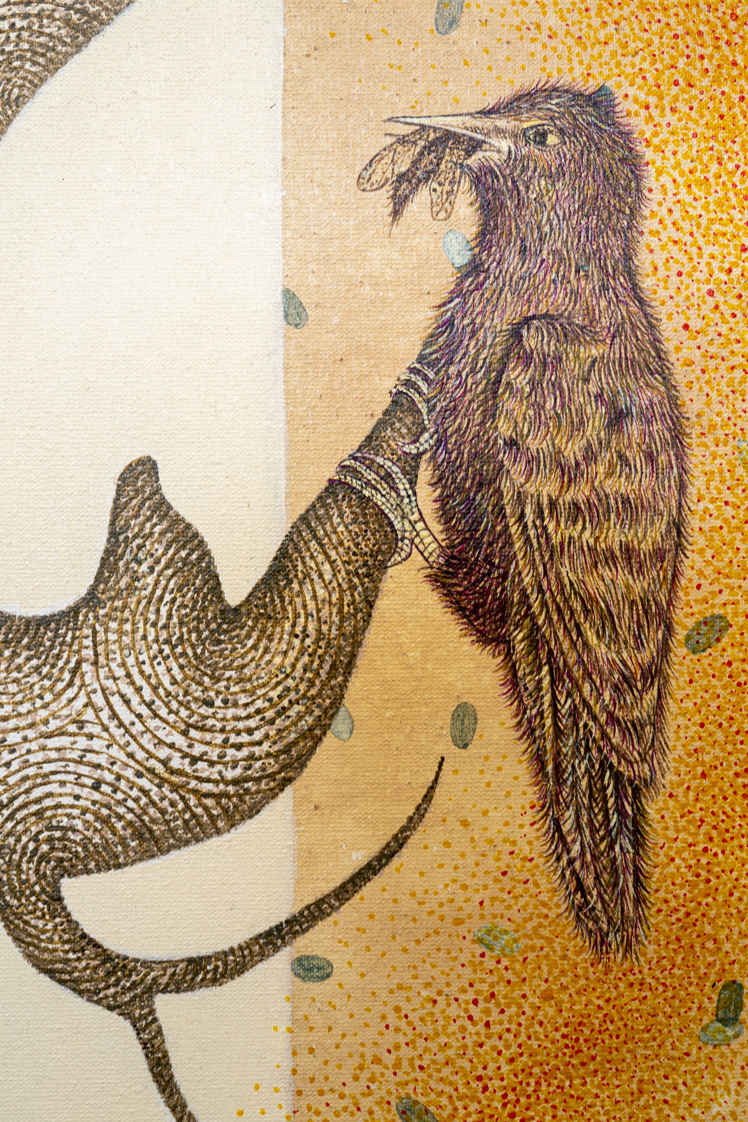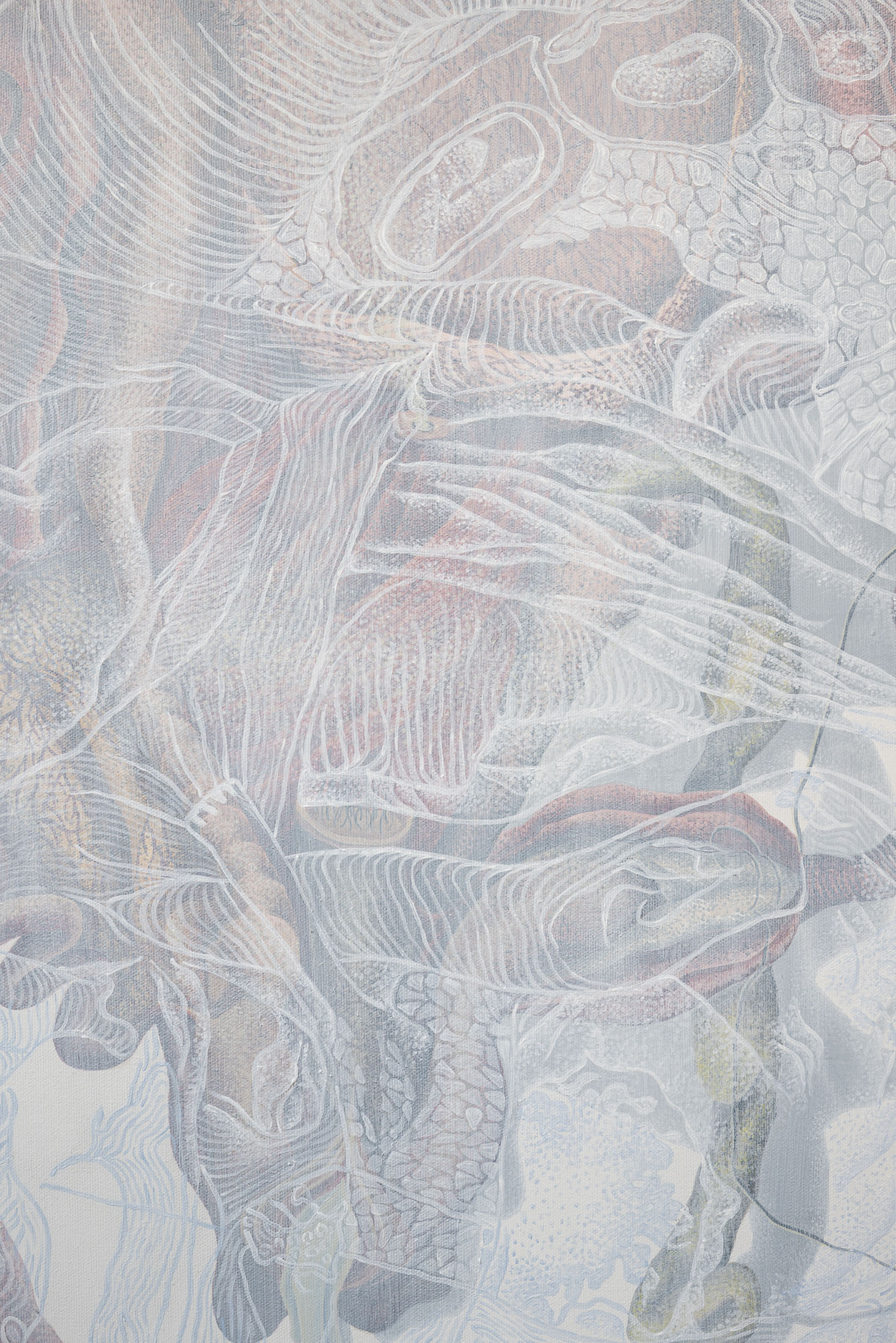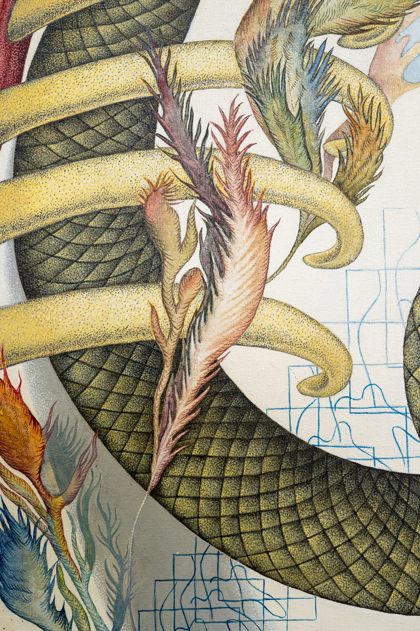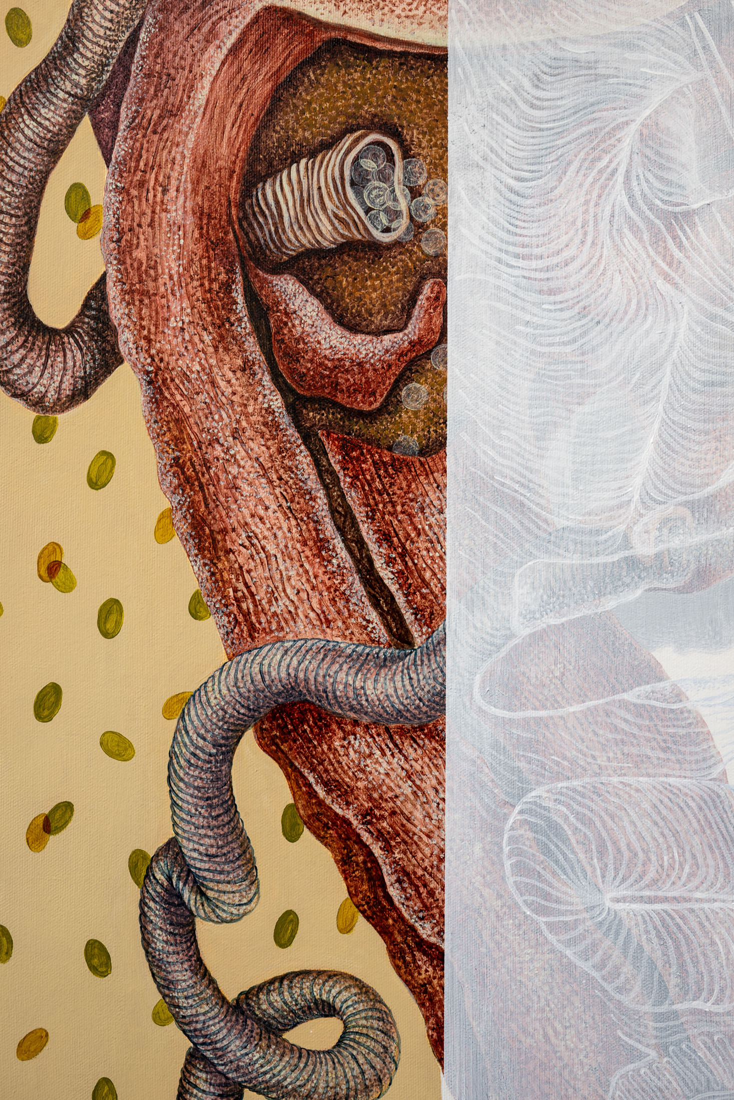 The early works in Zahak-nameh draw from Persian mythology and epic literature, fusing Persian traditional miniature painting with anatomical and biological illustrations. These references form a visual language through which Bahmanipour explores the body as both subject and site of historical memory. In the most recent work, she shifts toward a contemporary narrative, examining the ruptured body of today—physical, cultural, and political.