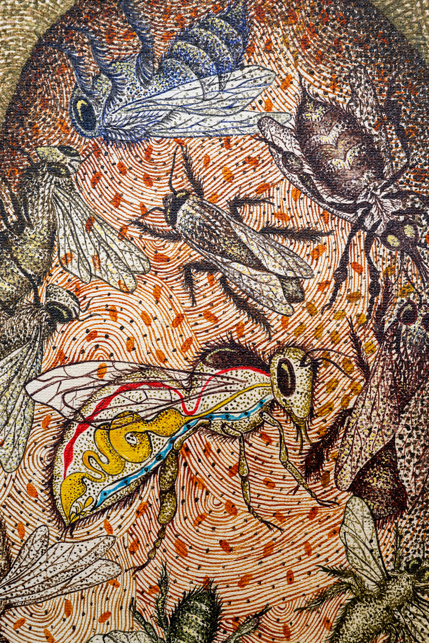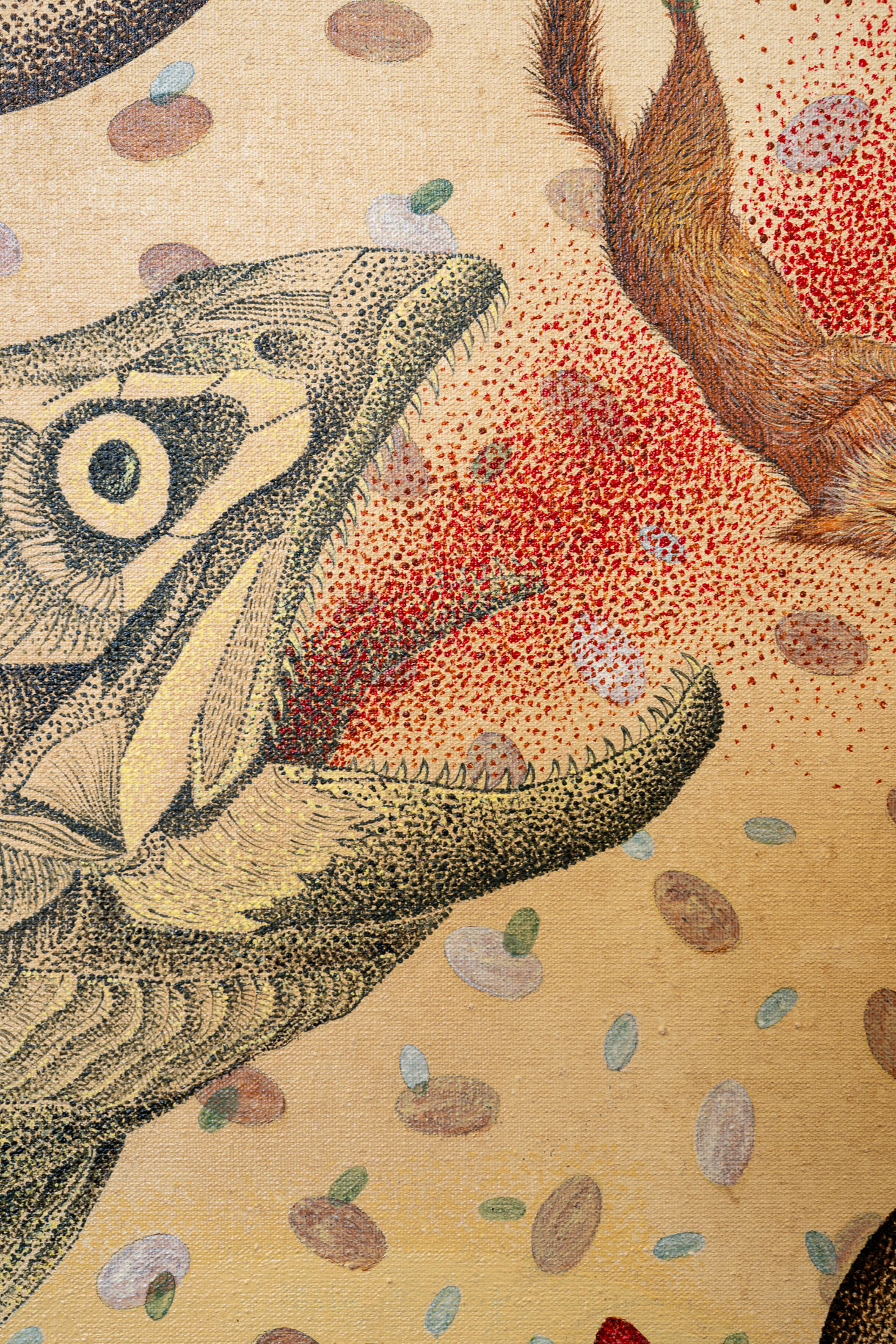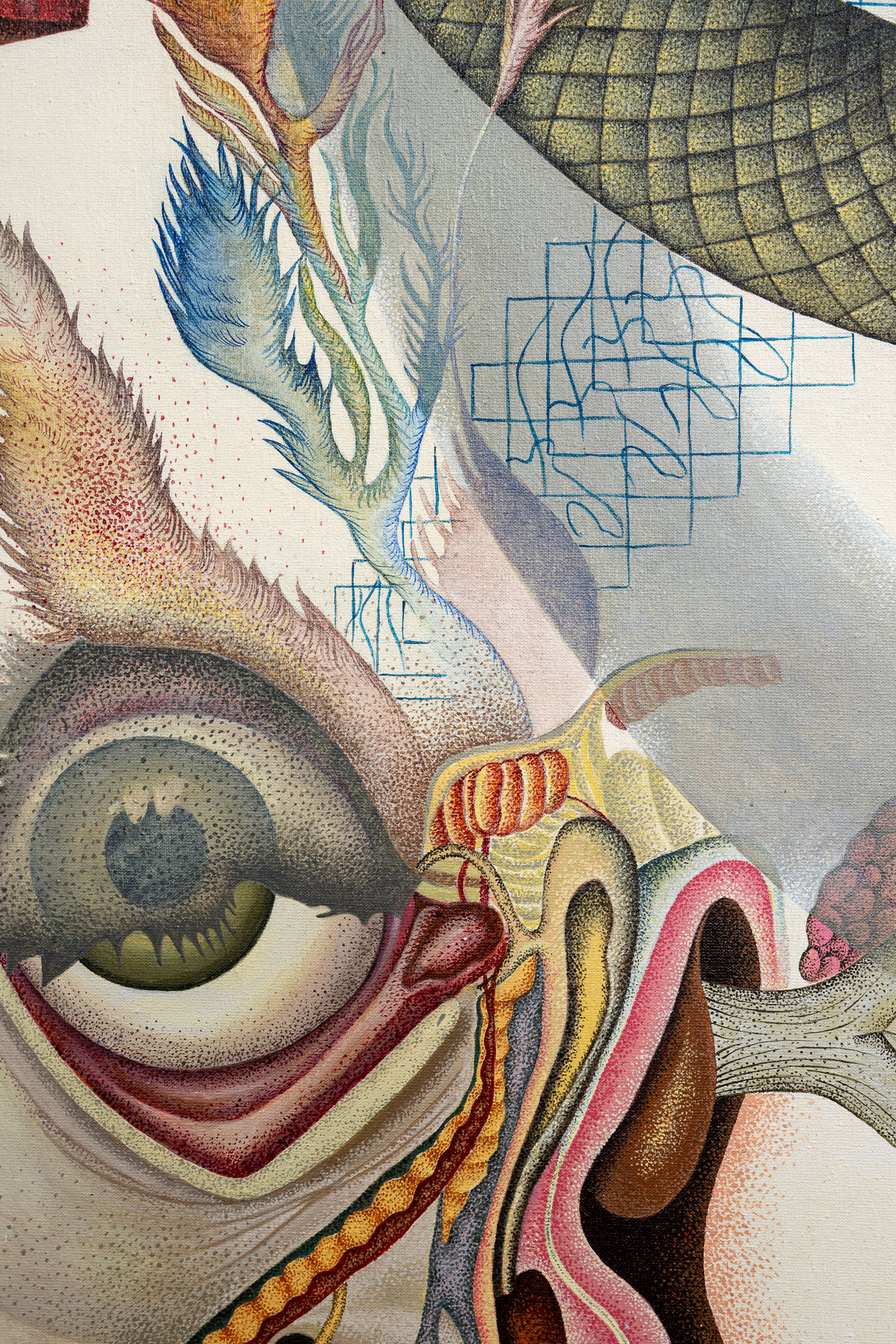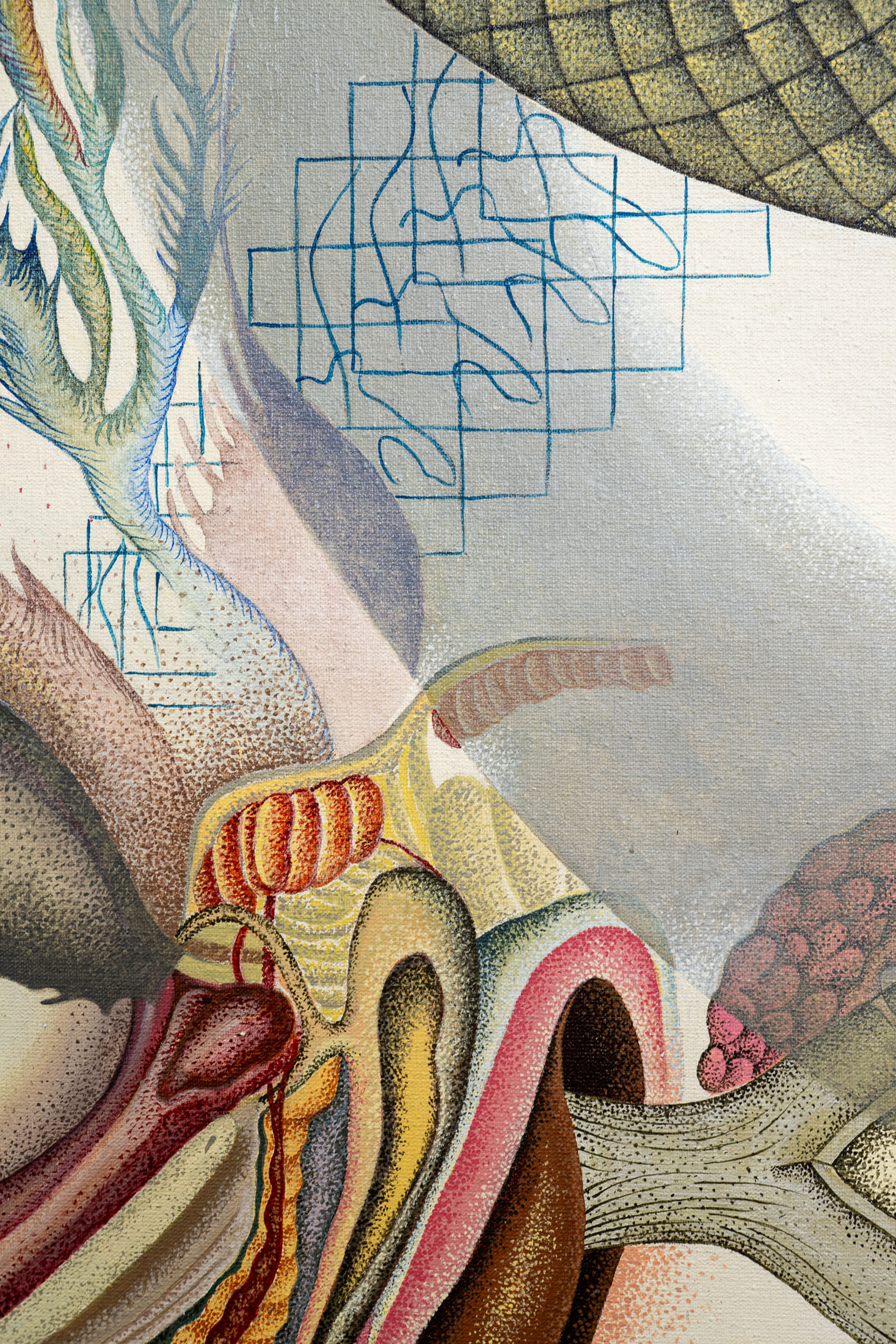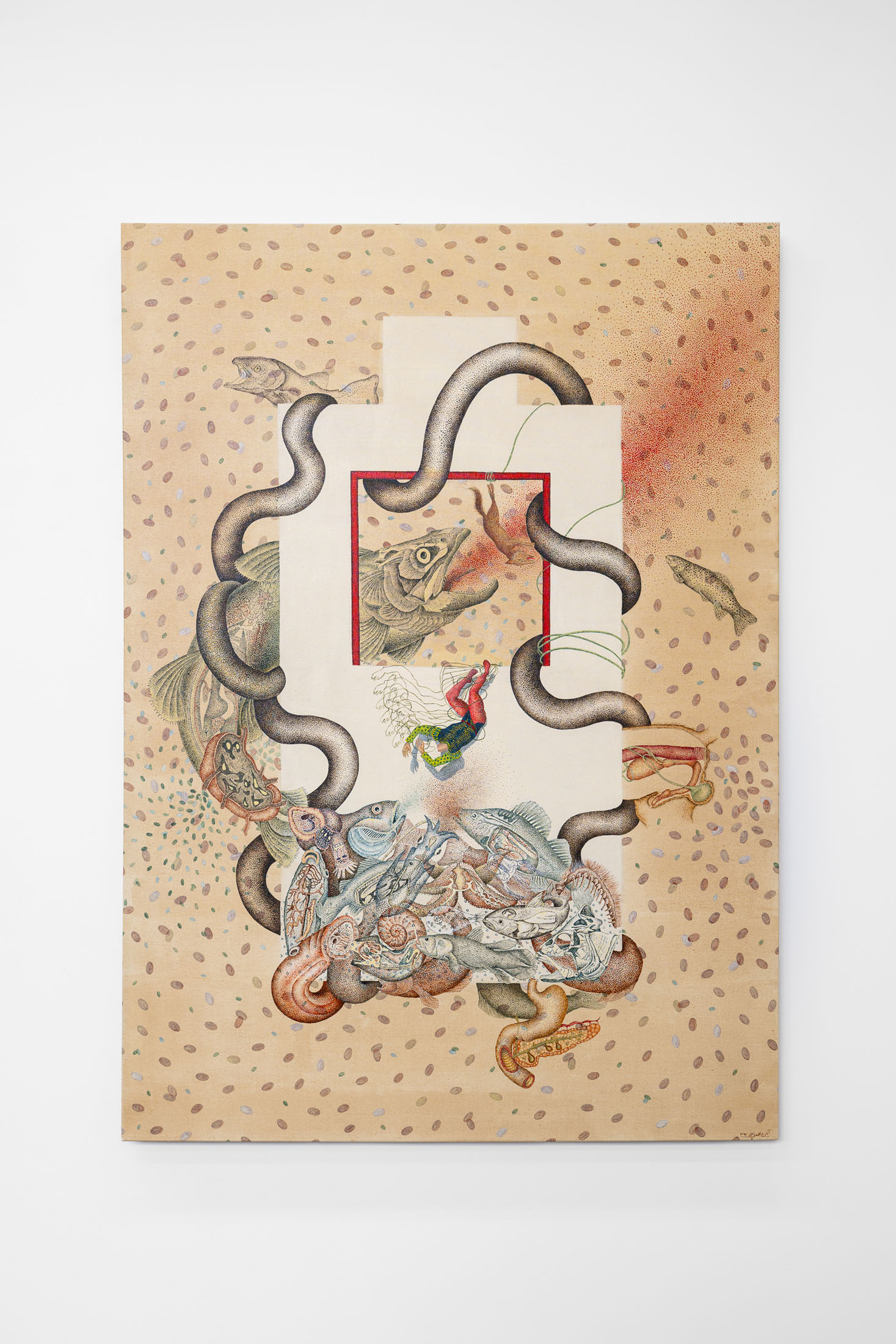 The early works in Zahak-nameh draw from Persian mythology and epic literature, fusing Persian traditional miniature painting with anatomical and biological illustrations. These references form a visual language through which Bahmanipour explores the body as both subject and site of historical memory. In the most recent work, she shifts toward a contemporary narrative, examining the ruptured body of today—physical, cultural, and political.