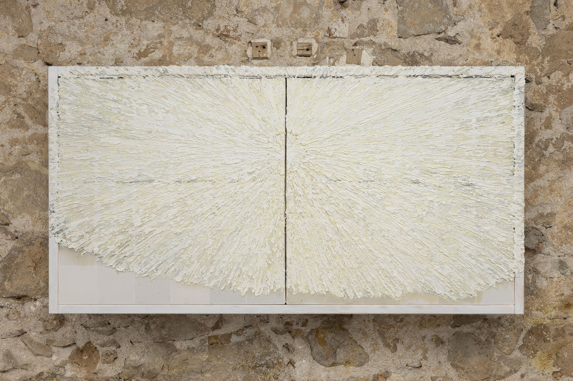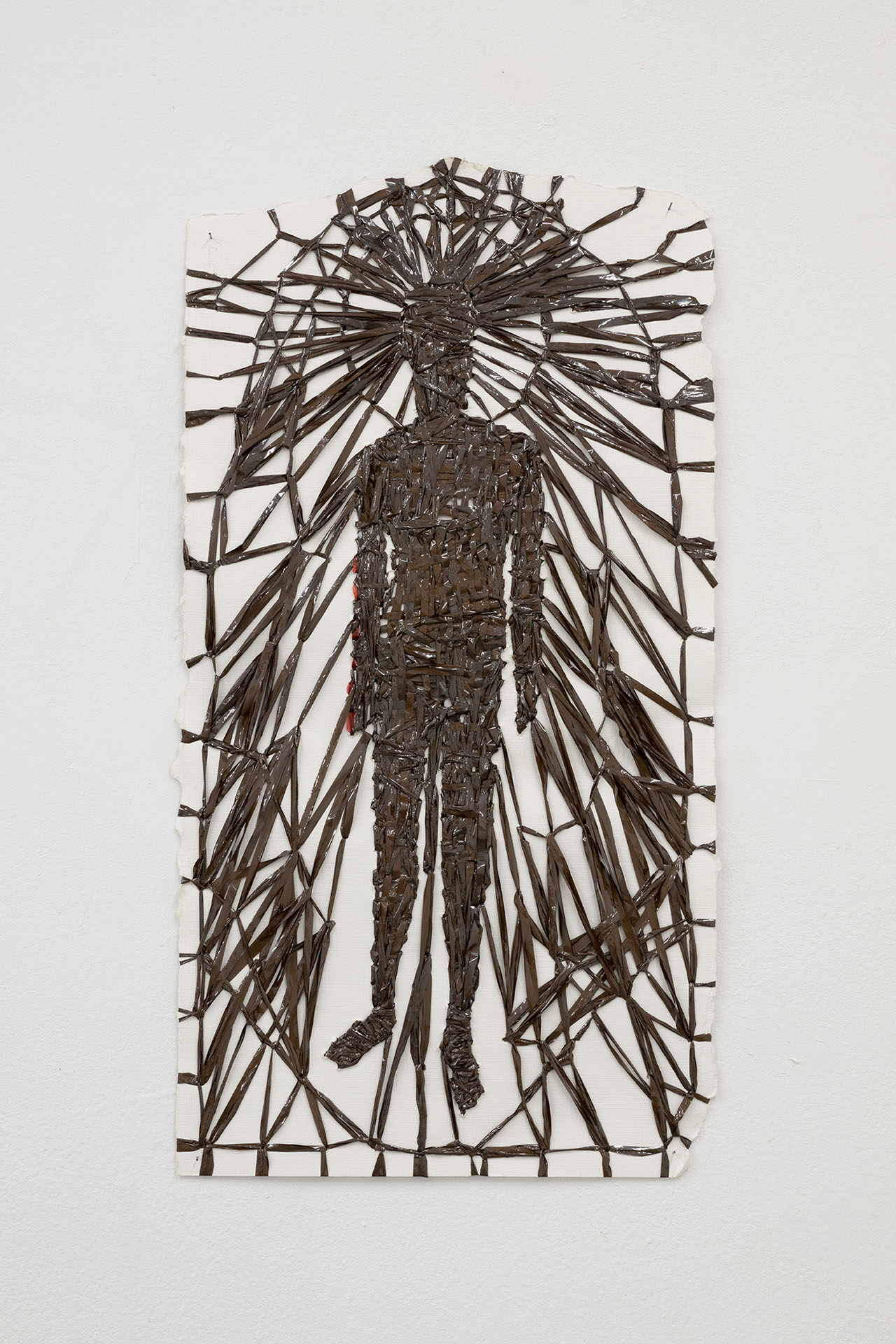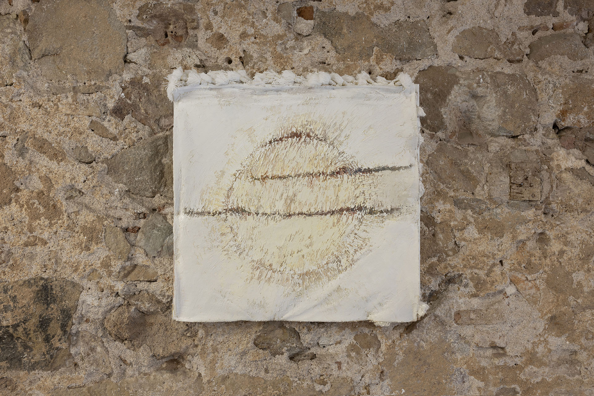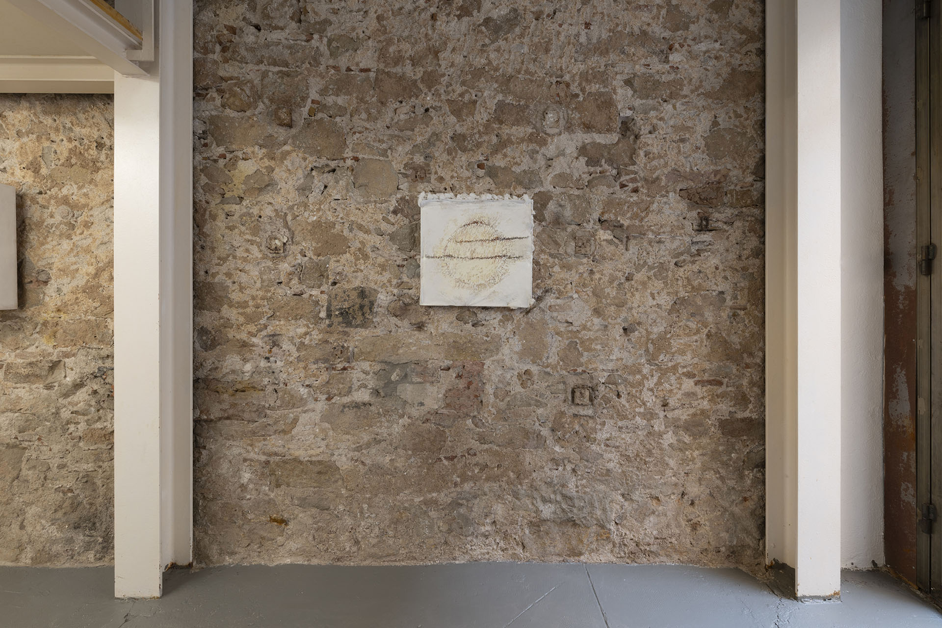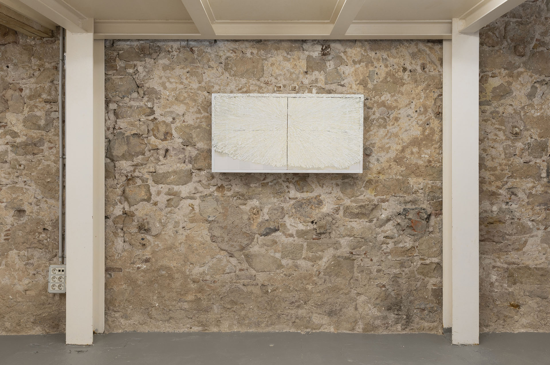 The work on paper titled St John (which gives title to the show like some advocation) is embroidered in magnetic cassette tape and nailed to the wall amidst this particularly magnetic intensive atmosphere. Berdugo speaks of this work: I like that John the Evangelist is the volatile one, the oversensitive one, and also the one to whom Jesus entrusted the care of his own mother moments before his death. His gospel is also the most questioned: many doubt that the Gospel of John was actually written by John the Evangelist. I’m interested in this elevated vulnerability of voice and testimony.