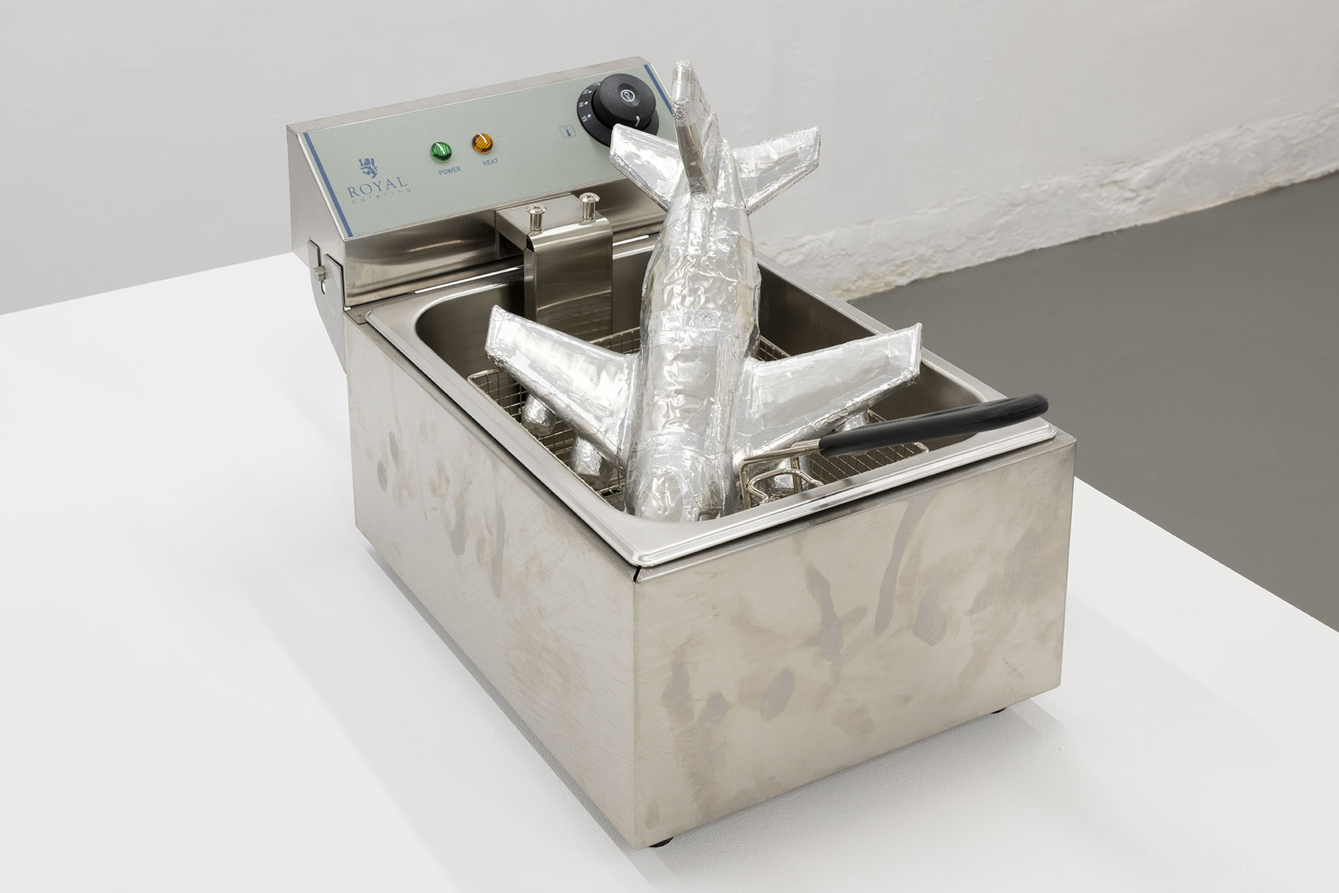 The yellow sculpture is a canary lung, a medical resuscitator adapted to have three bags of air – like the lungs of a canary – rather than just one. The artist is interested in the hypersensitivity of these animals to their environment, the vulnerability that comes from an extra airy respiratory system. Carbon monoxide knocks the birds out in a second, which is why miners took them down with them to the mine in case there were leaks. This sensitivity is paradoxically also what allows them to sing so beautifully.