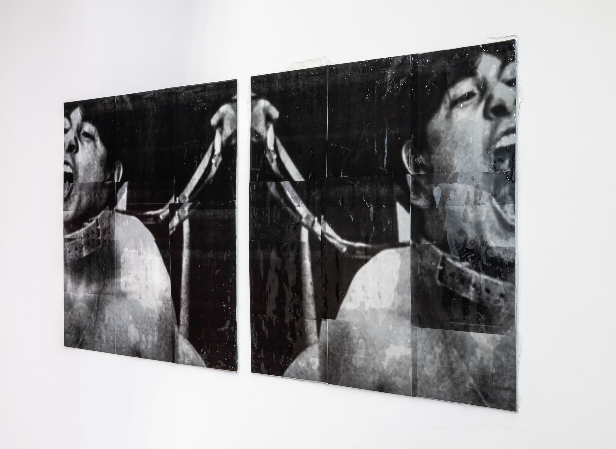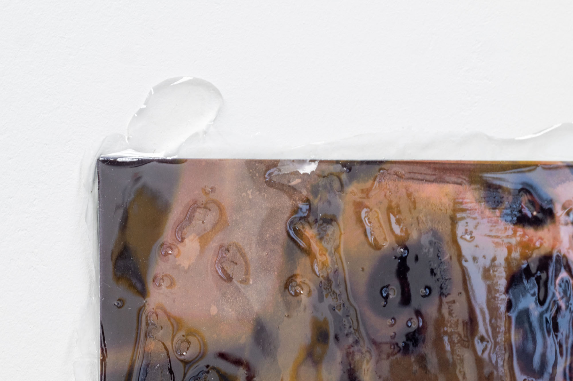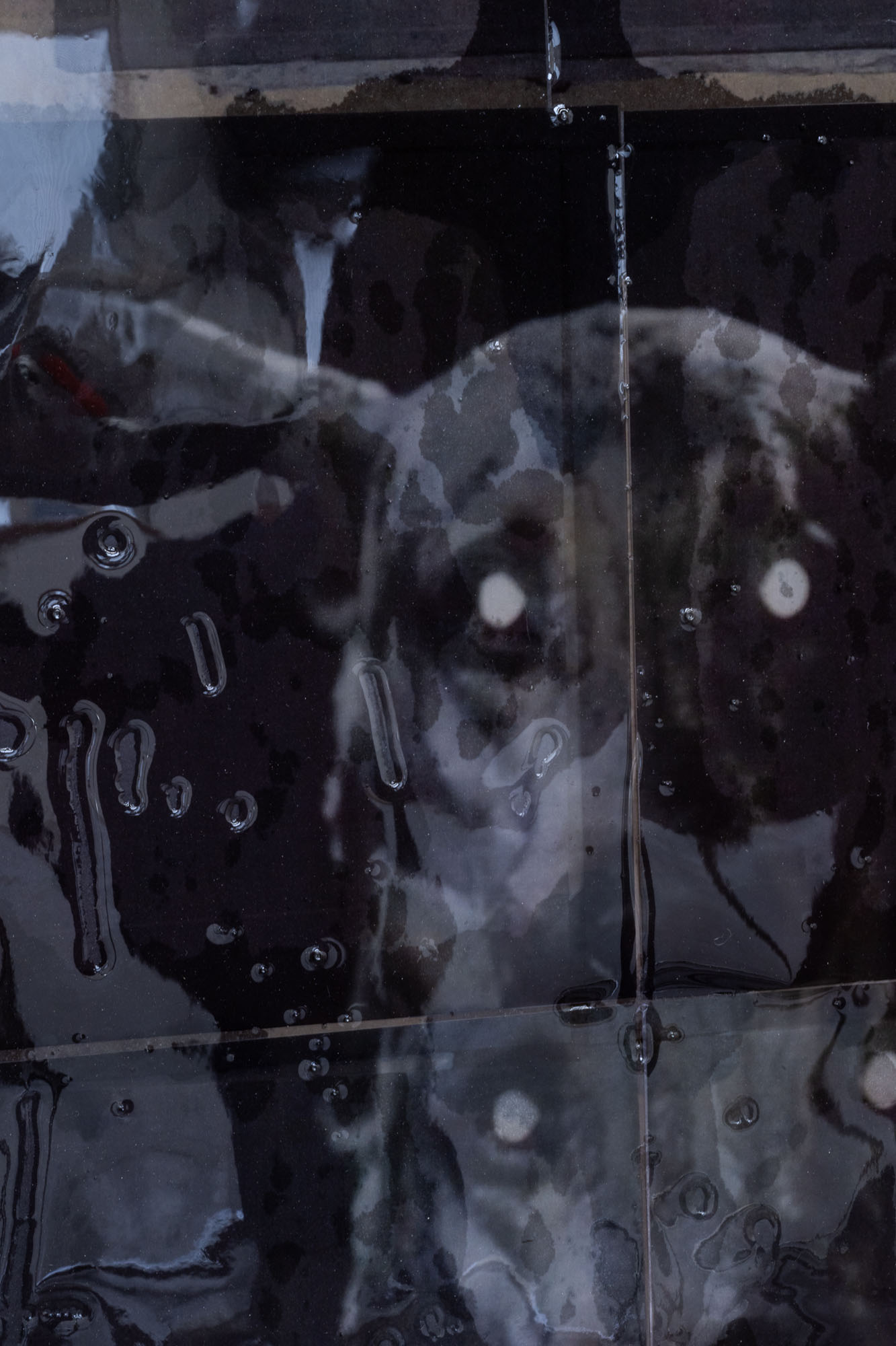 Like the way a dog marks its territory, the images in A hound marks its spot absorb resin which is poured upon them, taking on a wet and fluid quality. The photographs position a dialogue between human/ non-human participants who engage in activities of work/play, to rupture capitalist narratives of dominance/submission.