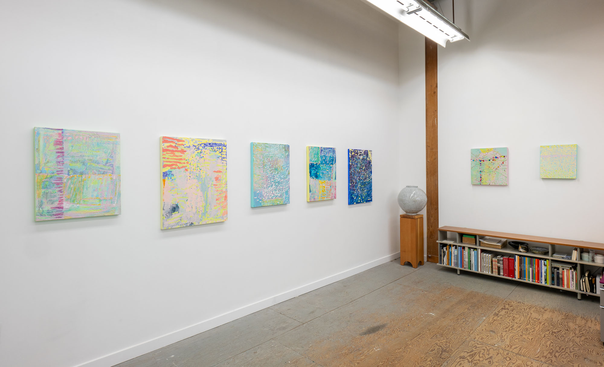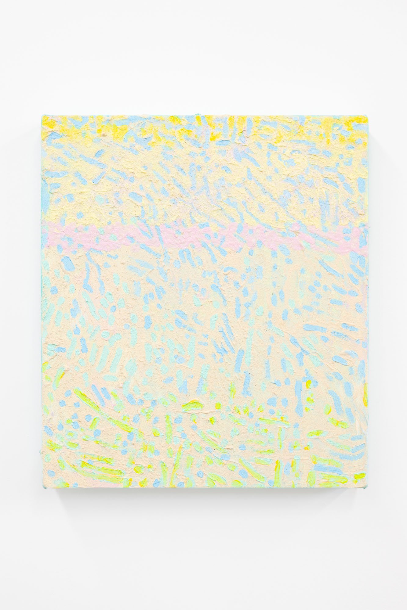 Bringing together works in acrylic, oil and mixed-media, the variety of techniques demonstrate an ongoing inquiry into the juncture of the sensual, formal, and environmental. Multiple works incorporate sand and other materials, in the quest for a vibrant surface. The use of internal subdivision and abutting passages refracts multiple places into the frame of each work while the palette, predominantly pastel with sections of deep blue and violet, conjures the uncertainty of dusk, when the world beckons through the window. Throughout Wind-Eye, wind-swept gestures caress and flow like garlands or fingers.