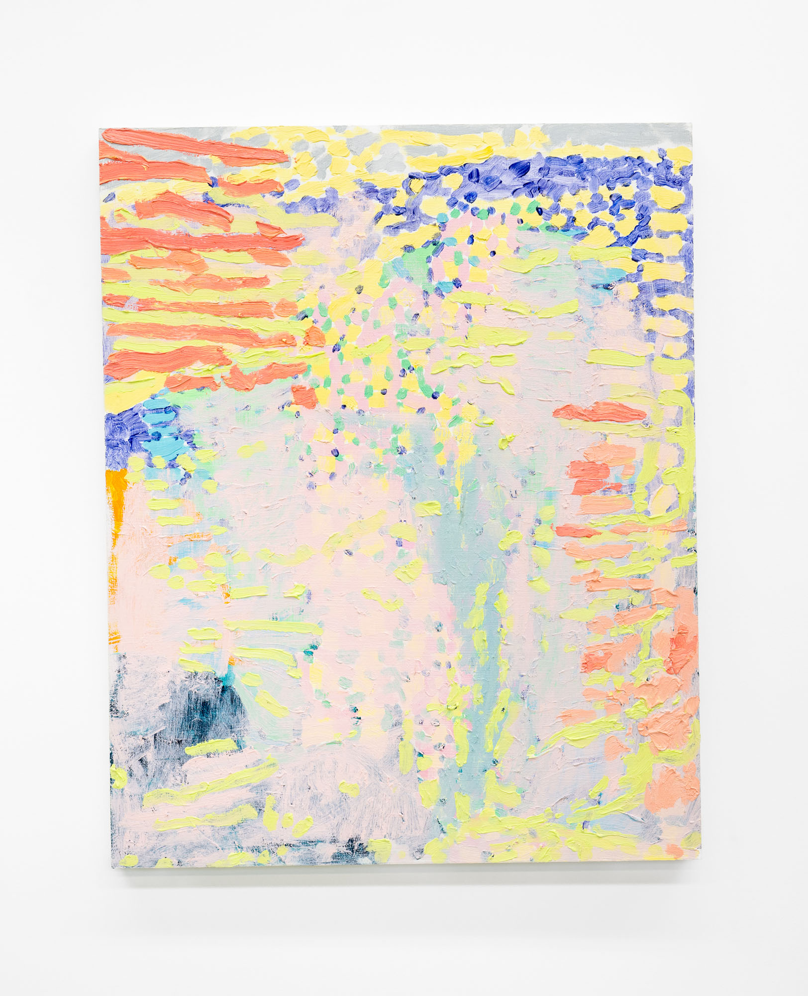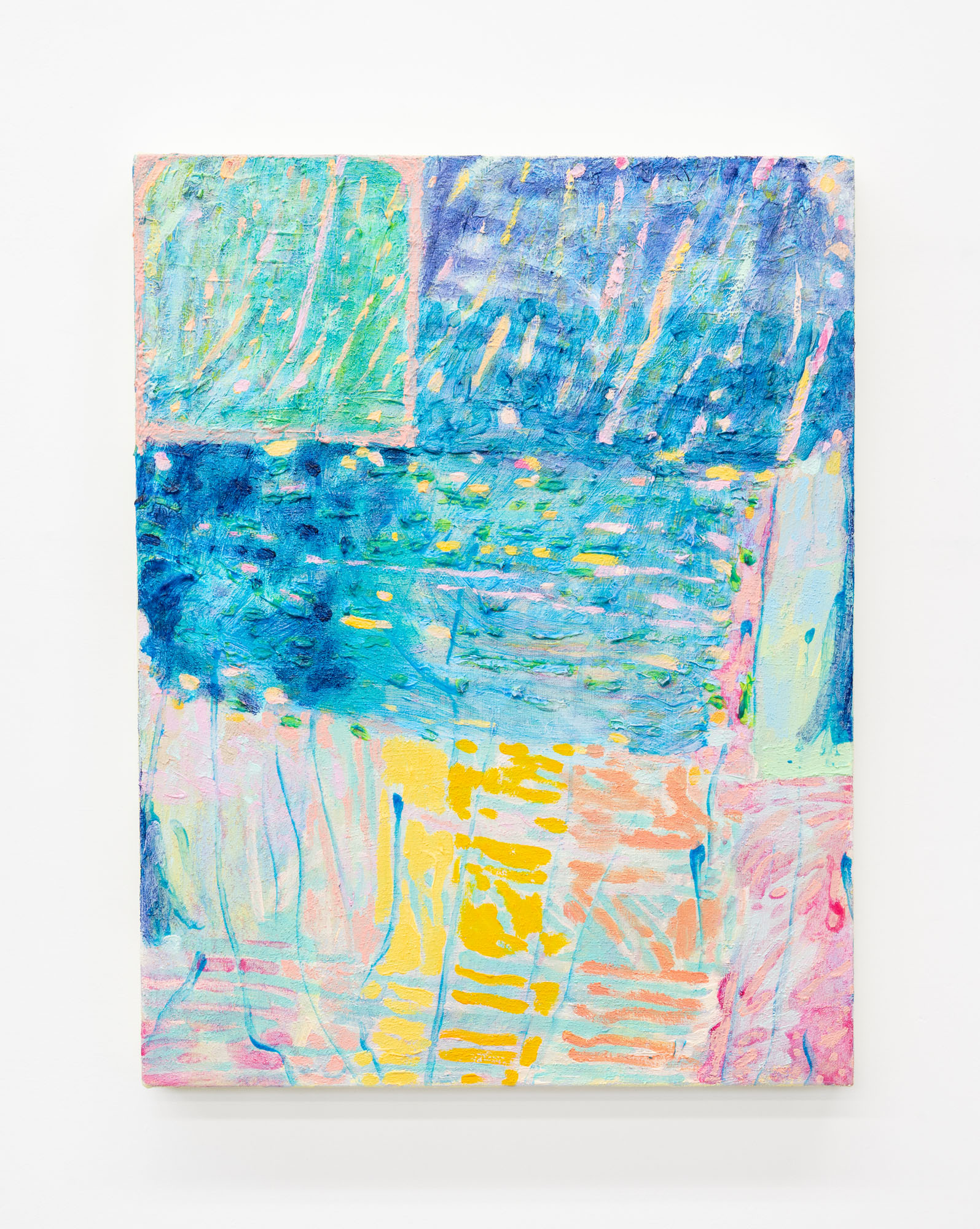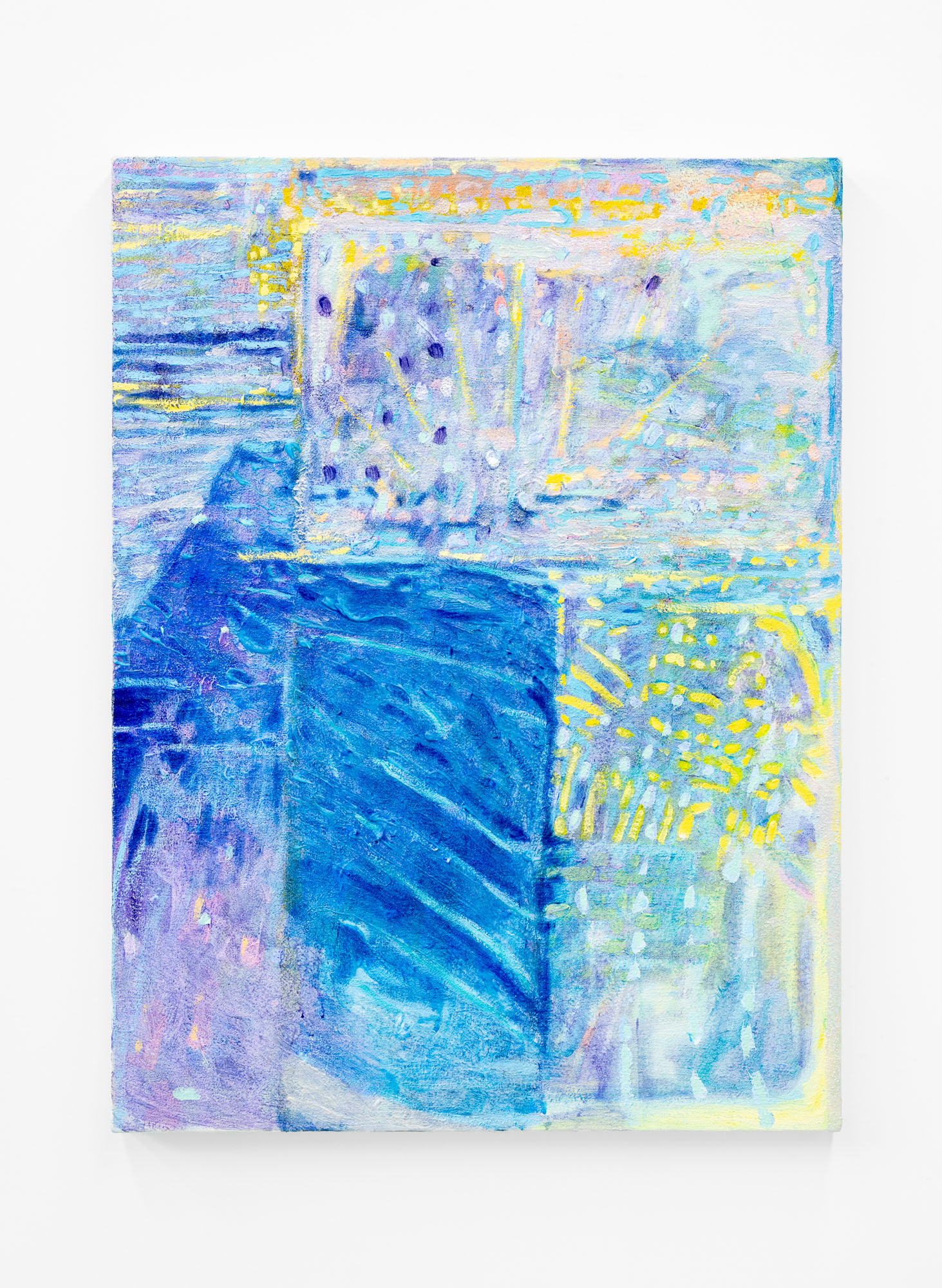 Taking the window as a point of departure—at once a structure for seeing and an old trope in painting—the works in Wind-Eye invoke painting as a technology of location. They document summertime meanderings, queer moments reflected in a pane of glass, rain on the skin and rivulets of cloud and light, cascading out from waves.