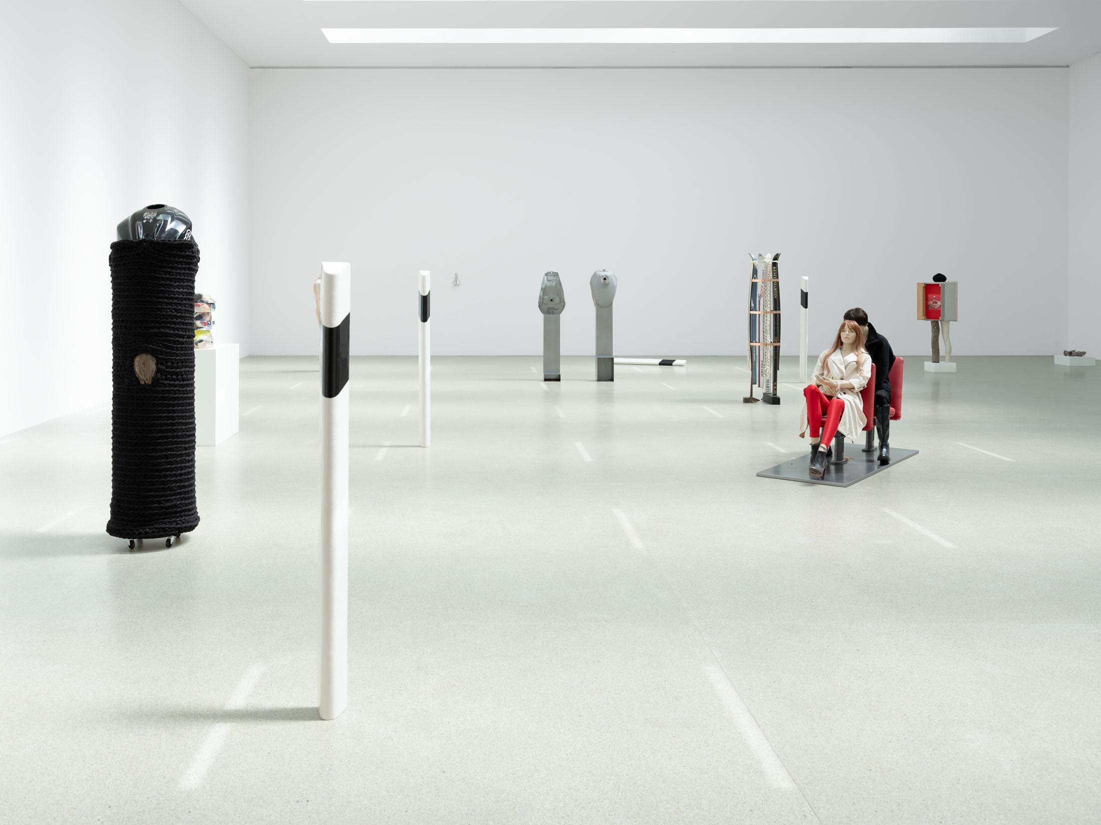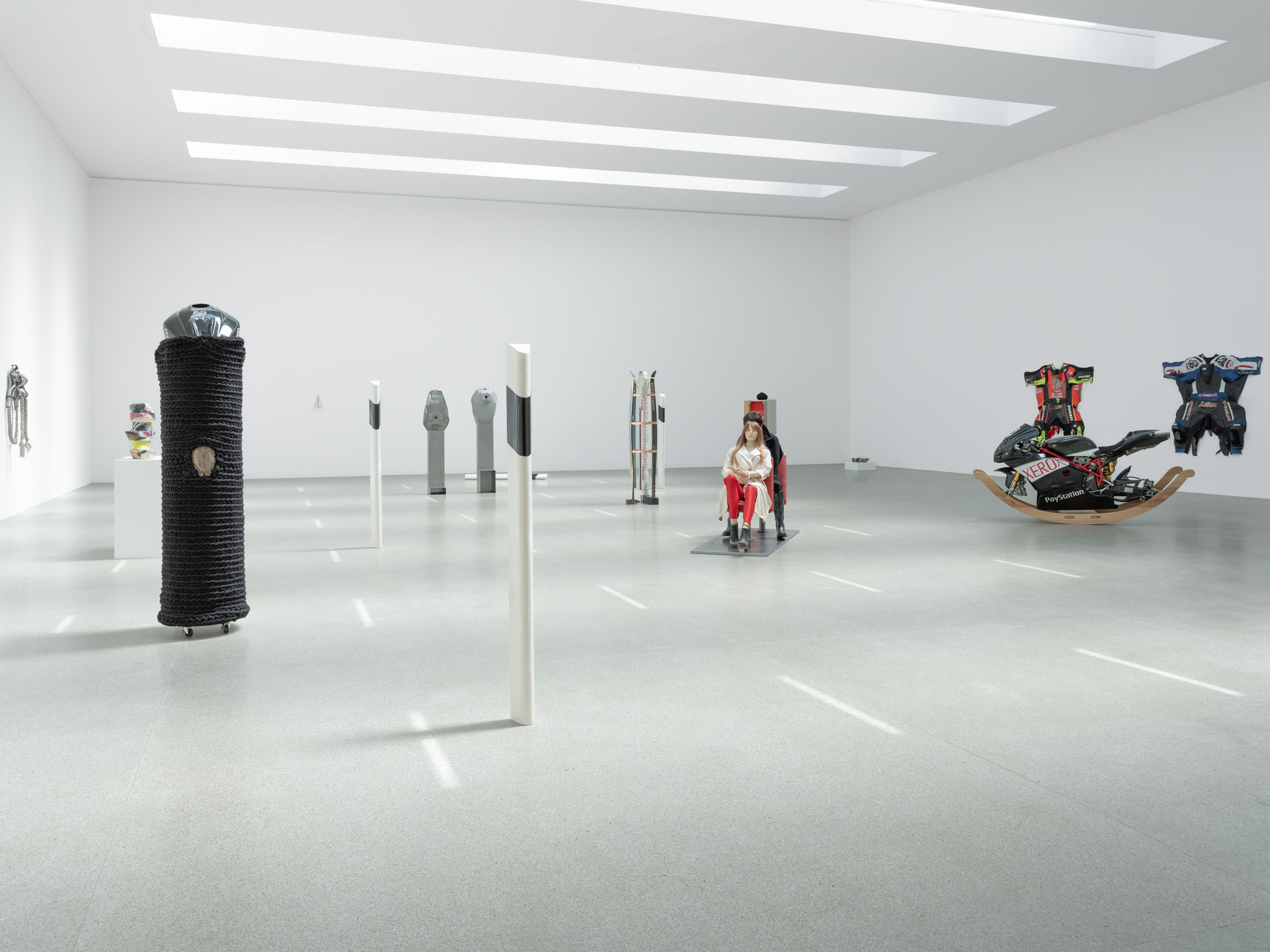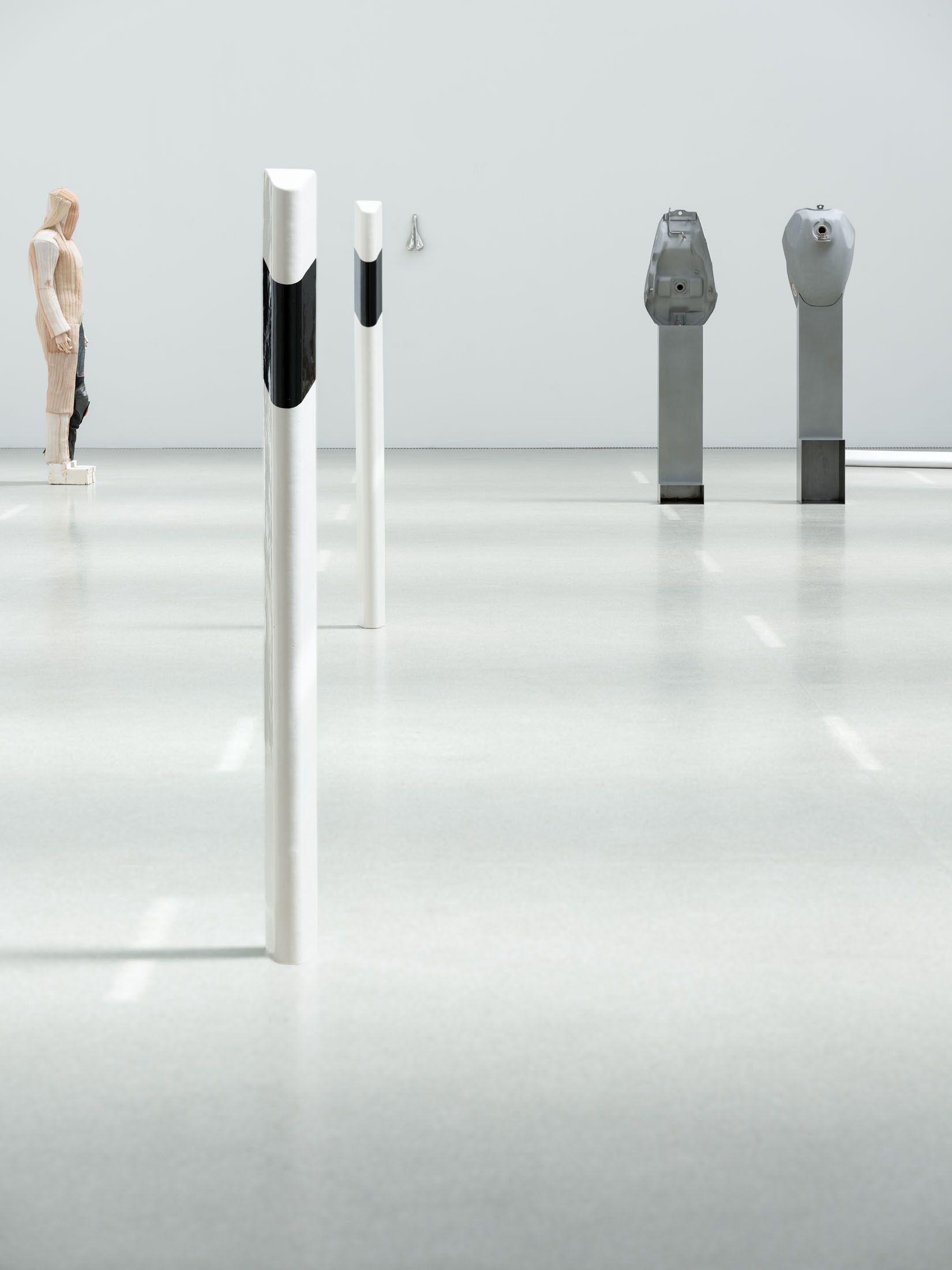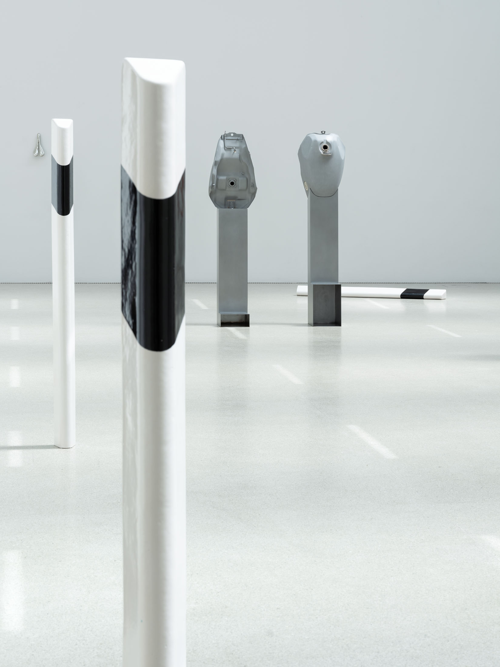 Against this backdrop, PS (Horsepower), as well as the derived sculpture Gebrochenes Pferd (Broken Horse) (2024) featured in the exhibition, can be understood as an attempt to question and literally deconstruct this specific sculptural tradition. The horse, traditionally staged as the bearer of the rider, is rendered dysfunctional: slowed in its movement, stripped of its original dynamism. Only the connecting hinge hints at a potential moment of transformation. The idea of dysfunctionality, or the deliberate braking of established systems, runs through other works as well—pieces that also indirectly reference the motif of the horse, such as Gebrochenes Pferd (Broken Horse) (2023), Paystation (2025), and Ulysses (2025). These sculptures are composed of sawn and re-collaged car engines and motorcycles—machines that have replaced the horse as a means of transport—and thus reflect both a technical and symbolic reversal of historical narratives of progress. Finally, this theme continues in the work I (2025), created specifically for the exhibition: the serially moulded ceramic delineators are also a reference to the limitation of mobility. Positioned in a grid in the Salle Poma, they form points of reference in the space.
