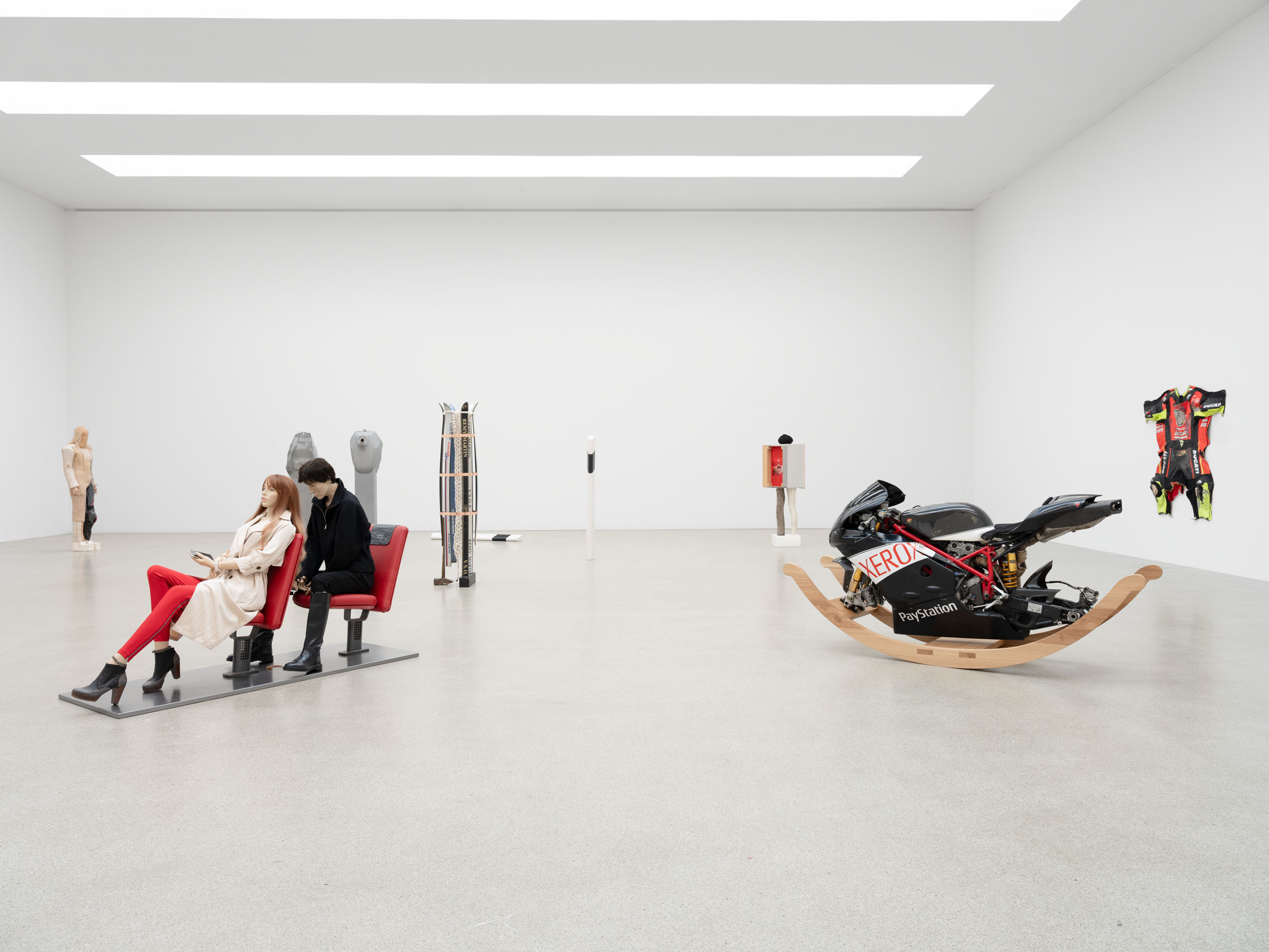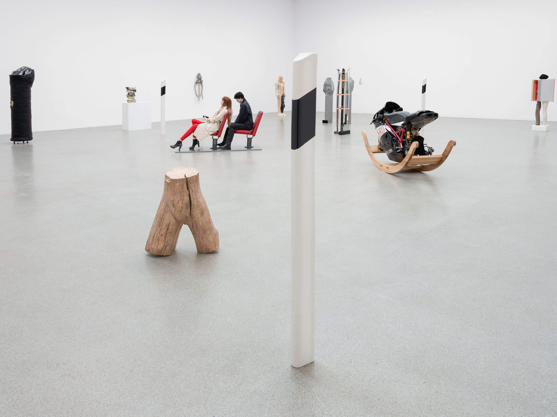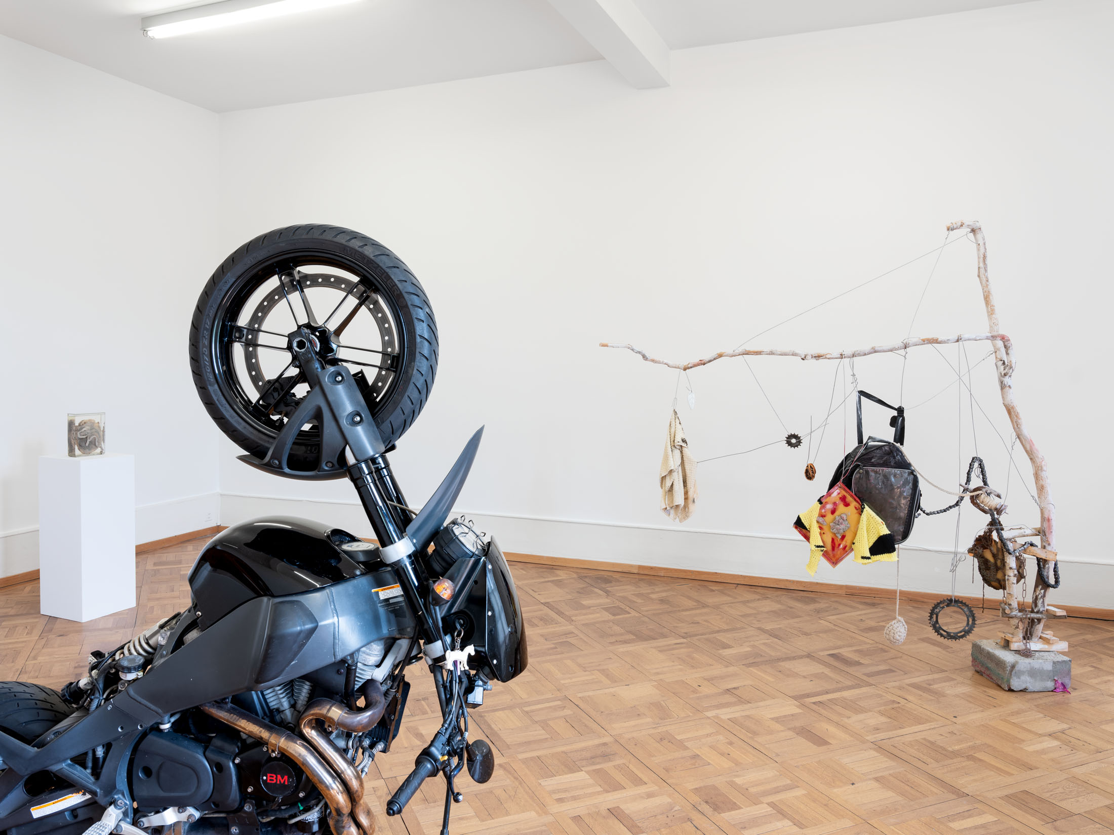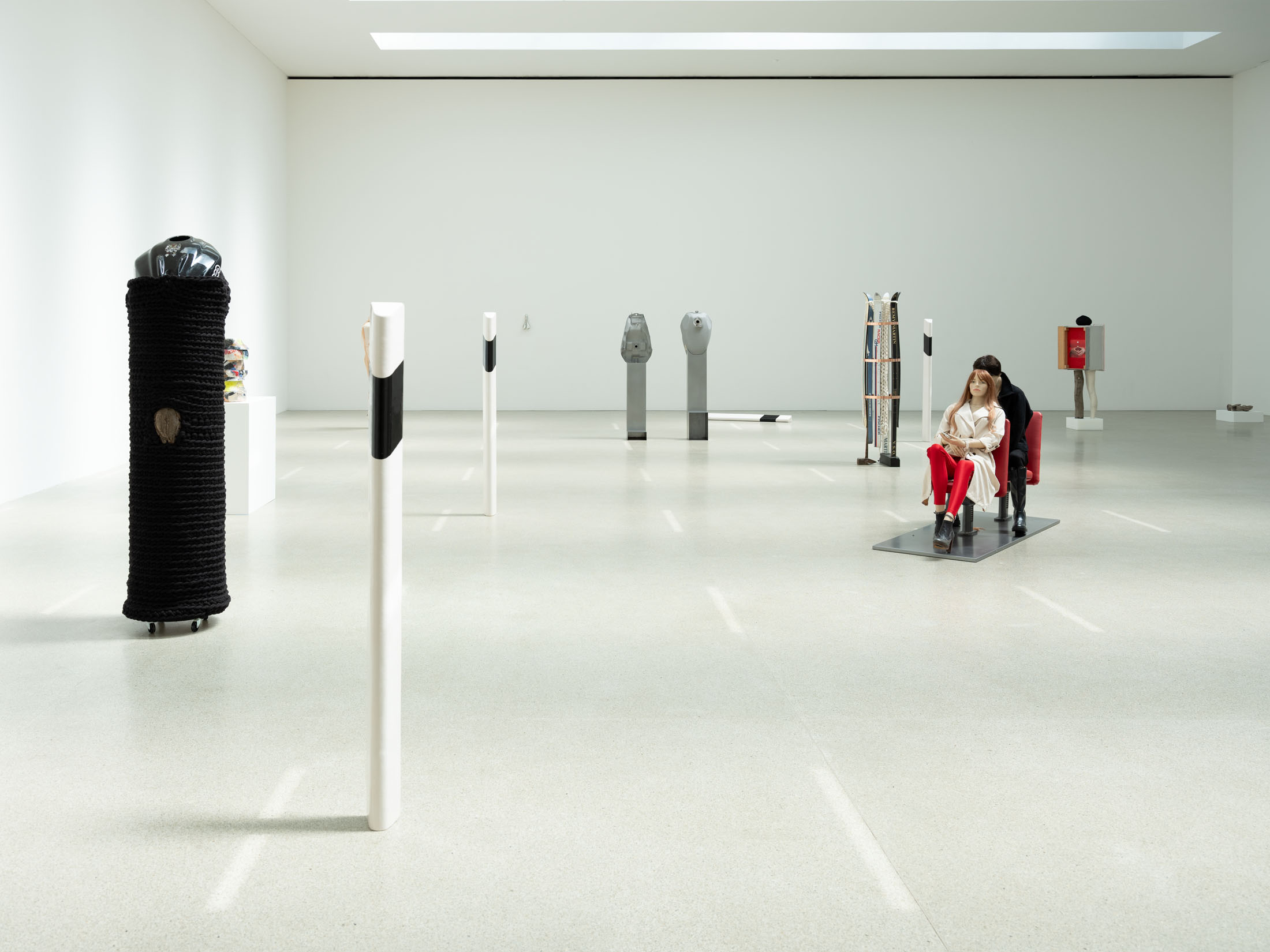 Against this backdrop, PS (Horsepower), as well as the derived sculpture Gebrochenes Pferd (Broken Horse) (2024) featured in the exhibition, can be understood as an attempt to question and literally deconstruct this specific sculptural tradition. The horse, traditionally staged as the bearer of the rider, is rendered dysfunctional: slowed in its movement, stripped of its original dynamism. Only the connecting hinge hints at a potential moment of transformation. The idea of dysfunctionality, or the deliberate braking of established systems, runs through other works as well—pieces that also indirectly reference the motif of the horse, such as Gebrochenes Pferd (Broken Horse) (2023), Paystation (2025), and Ulysses (2025). These sculptures are composed of sawn and re-collaged car engines and motorcycles—machines that have replaced the horse as a means of transport—and thus reflect both a technical and symbolic reversal of historical narratives of progress. Finally, this theme continues in the work I (2025), created specifically for the exhibition: the serially moulded ceramic delineators are also a reference to the limitation of mobility. Positioned in a grid in the Salle Poma, they form points of reference in the space.