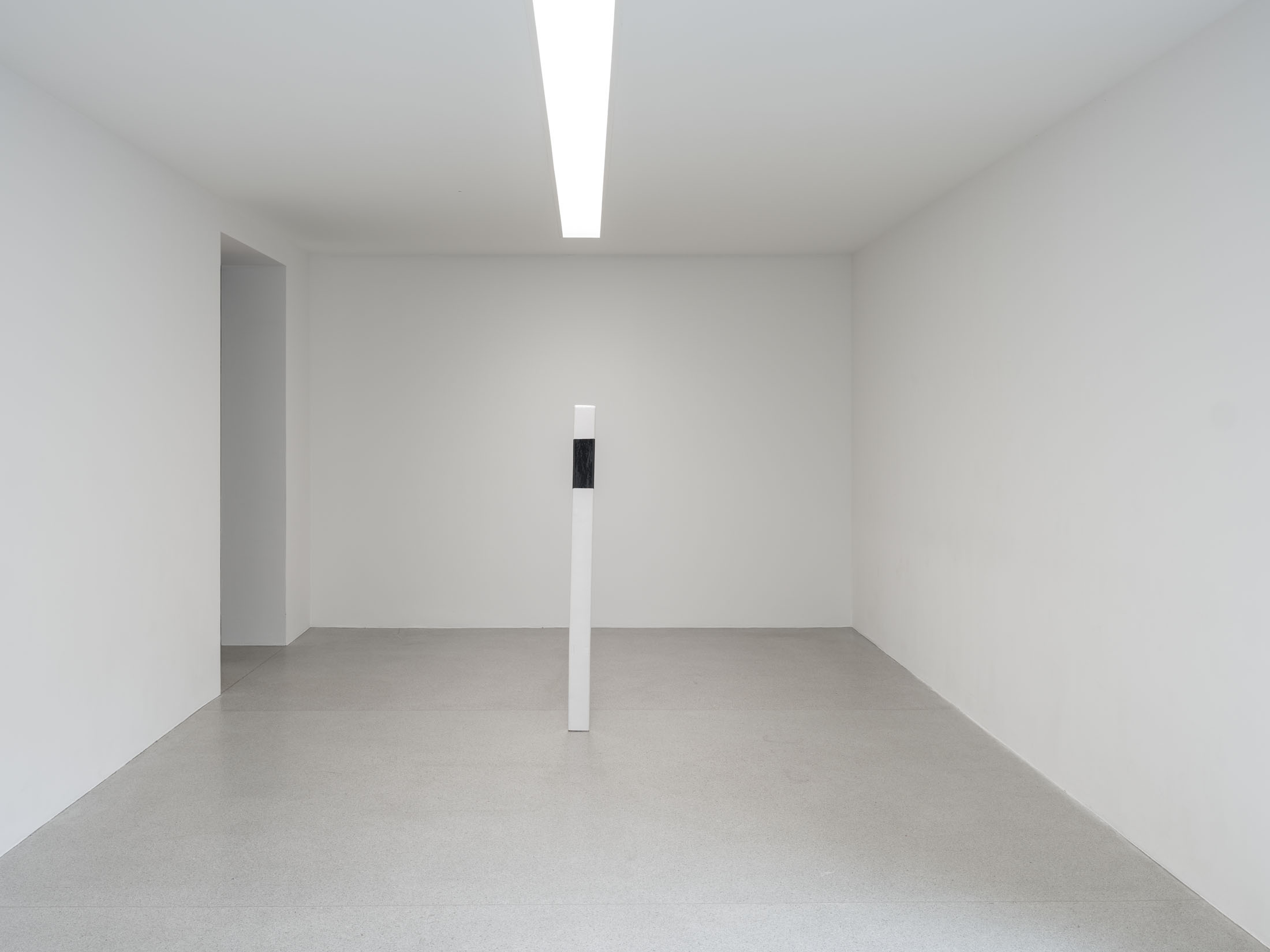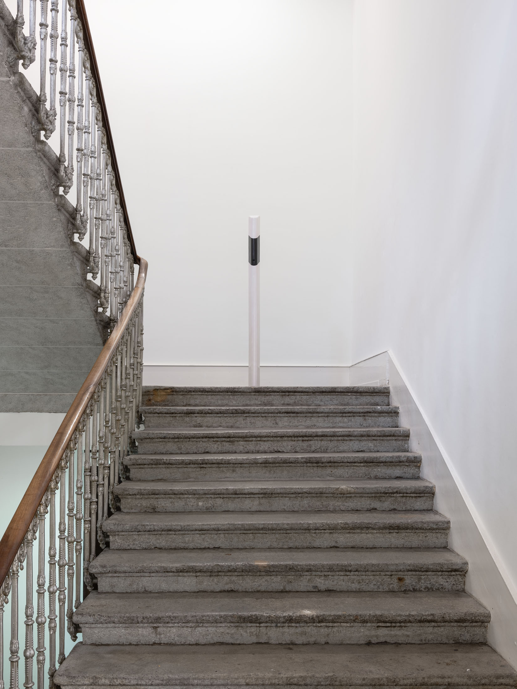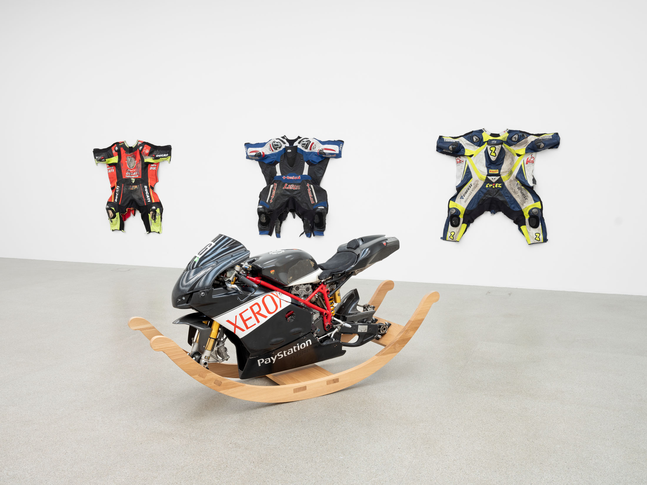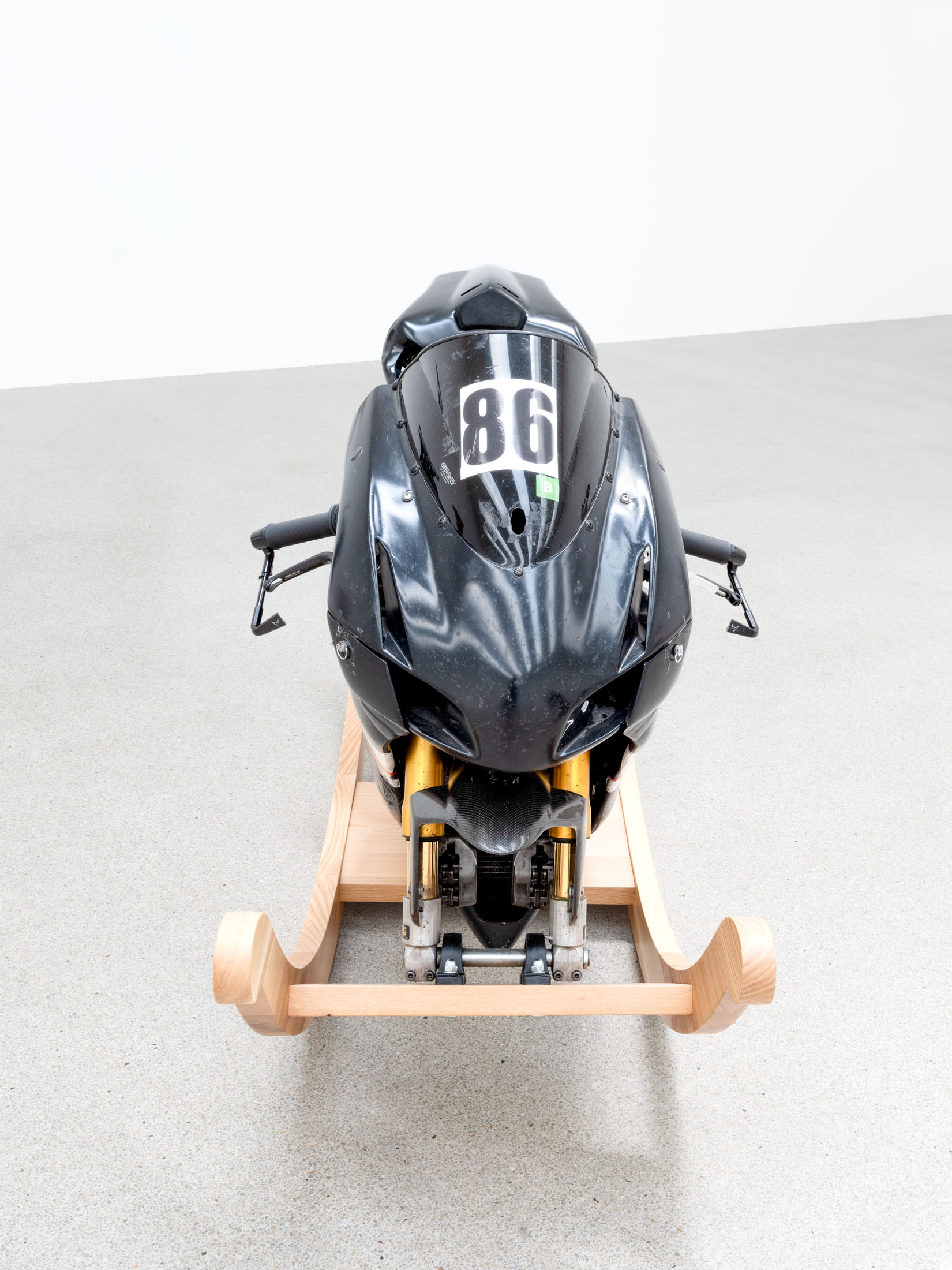 Against this backdrop, PS (Horsepower), as well as the derived sculpture Gebrochenes Pferd (Broken Horse) (2024) featured in the exhibition, can be understood as an attempt to question and literally deconstruct this specific sculptural tradition. The horse, traditionally staged as the bearer of the rider, is rendered dysfunctional: slowed in its movement, stripped of its original dynamism. Only the connecting hinge hints at a potential moment of transformation. The idea of dysfunctionality, or the deliberate braking of established systems, runs through other works as well—pieces that also indirectly reference the motif of the horse, such as Gebrochenes Pferd (Broken Horse) (2023), Paystation (2025), and Ulysses (2025). These sculptures are composed of sawn and re-collaged car engines and motorcycles—machines that have replaced the horse as a means of transport—and thus reflect both a technical and symbolic reversal of historical narratives of progress. Finally, this theme continues in the work I (2025), created specifically for the exhibition: the serially moulded ceramic delineators are also a reference to the limitation of mobility. Positioned in a grid in the Salle Poma, they form points of reference in the space.