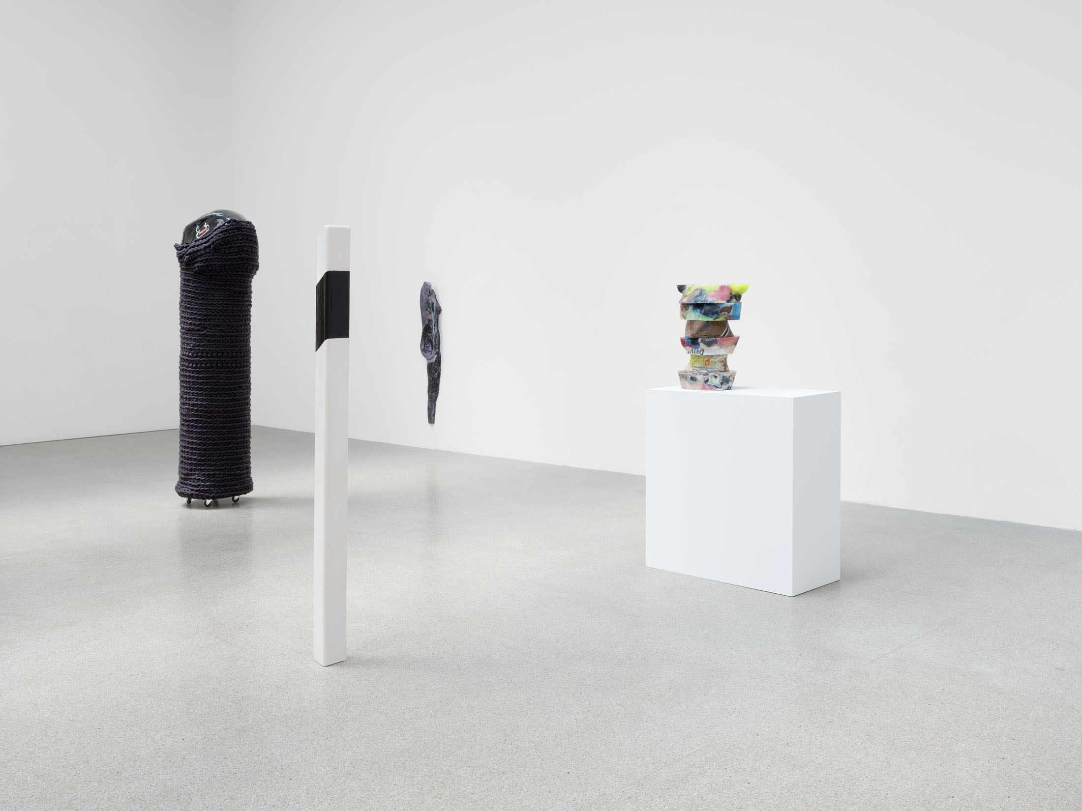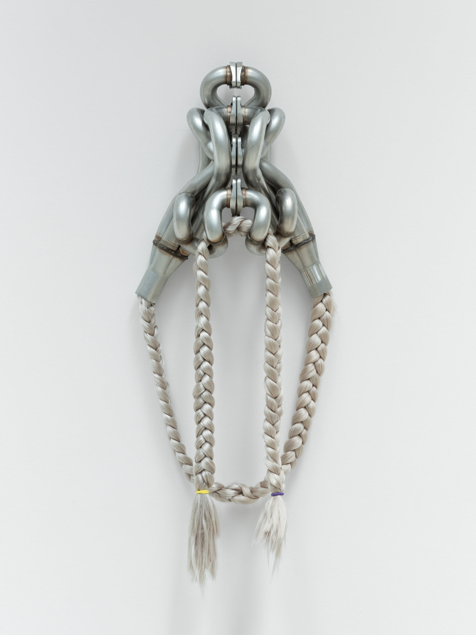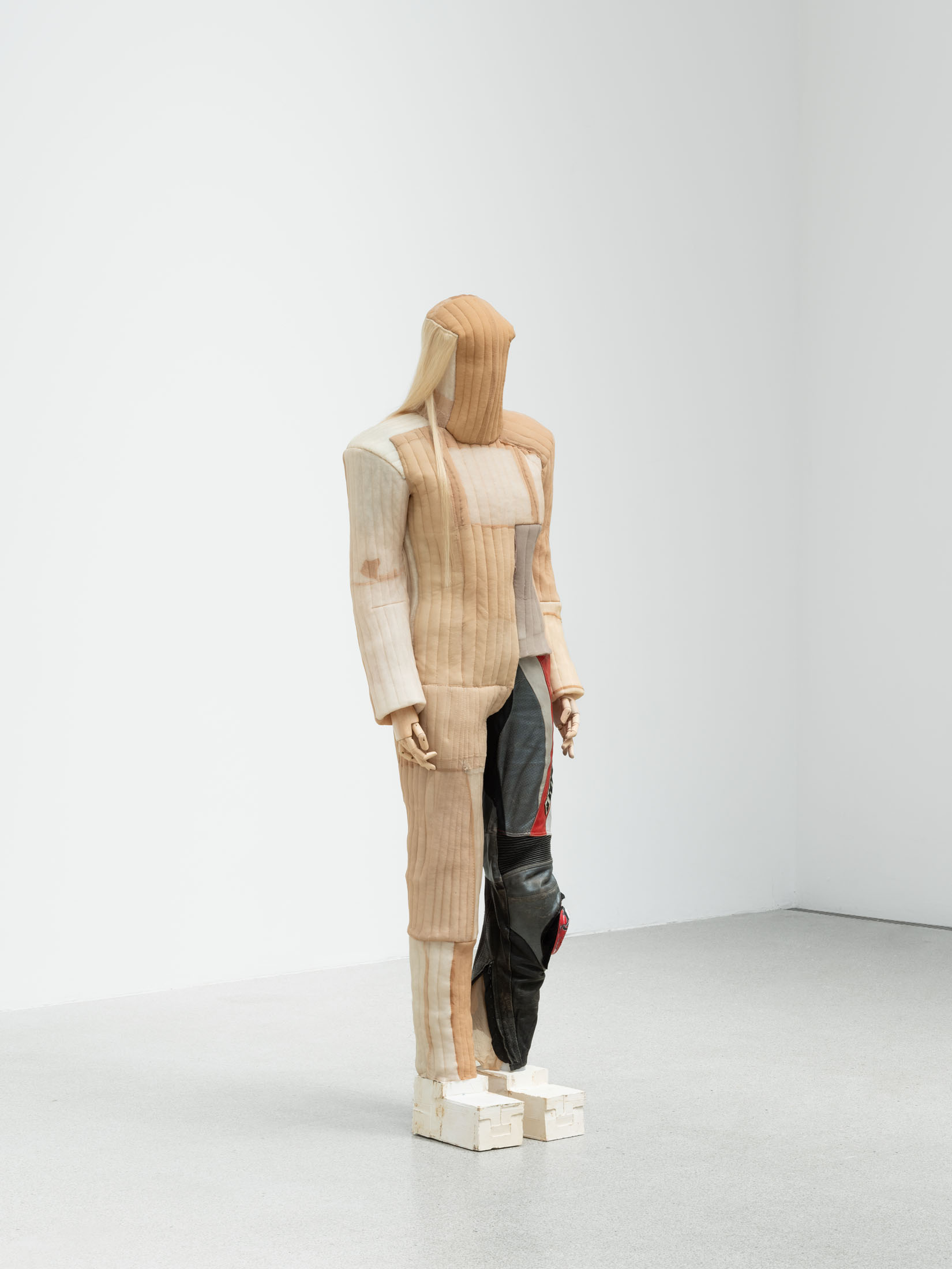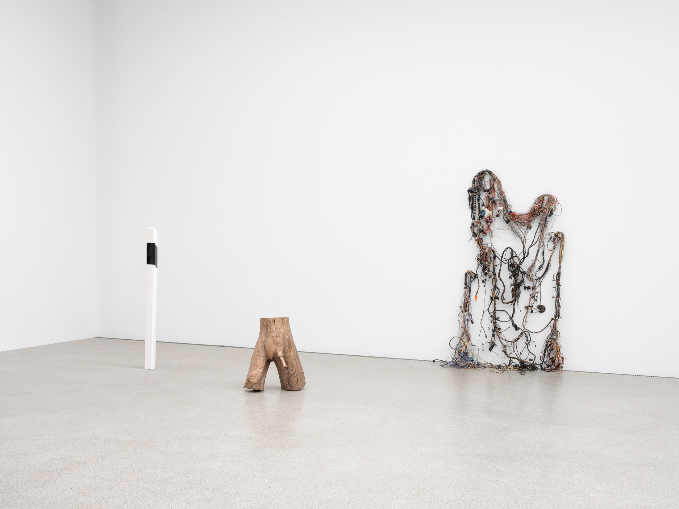 The sculptural work of Alexandra Bircken explores analogies between the human body and machines, examining the structures of protection, identity, and the extension of the individual. The Berlin-based artist combines a wide range of materials and techniques—often woven or knitted textiles—to probe the boundary between humans and their constructed environments. She also dissects everyday technical ob-jects with surgical precision, revealing the biomorphic qualities of machines. This dual approach results in an ambivalent body of work that is both cyborg-like and androgynous, questioning human behavior and desire, as well as the vulnerability of bodies in relation to technology.