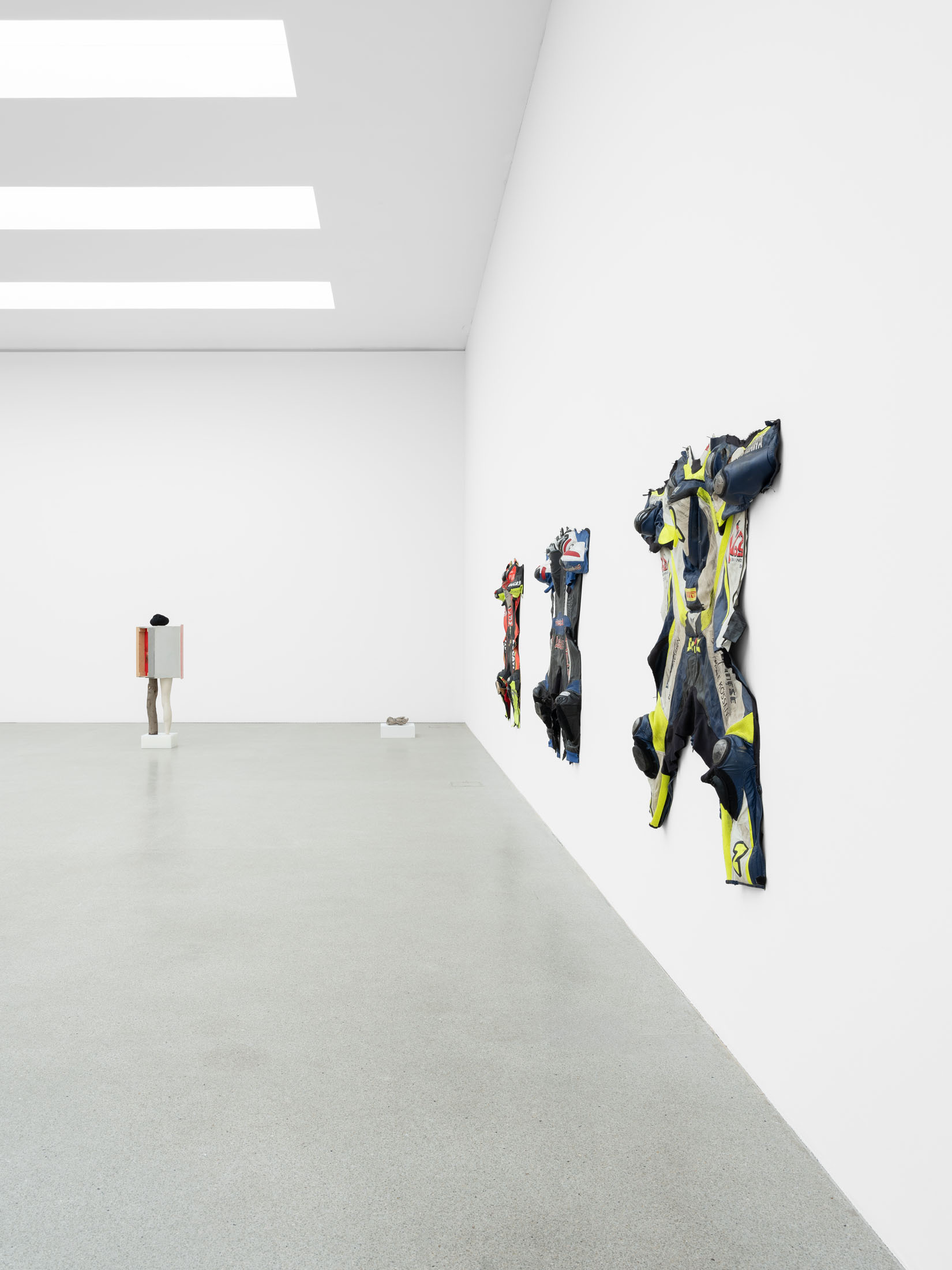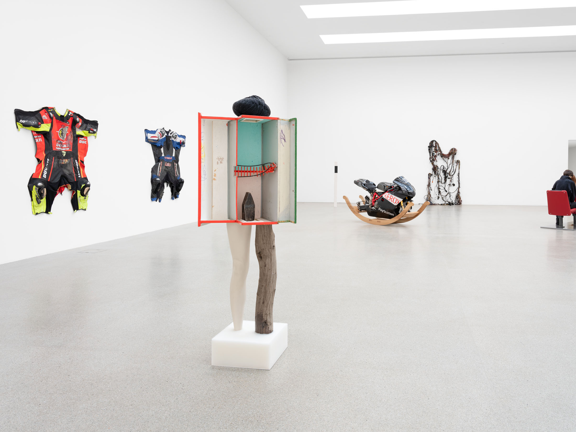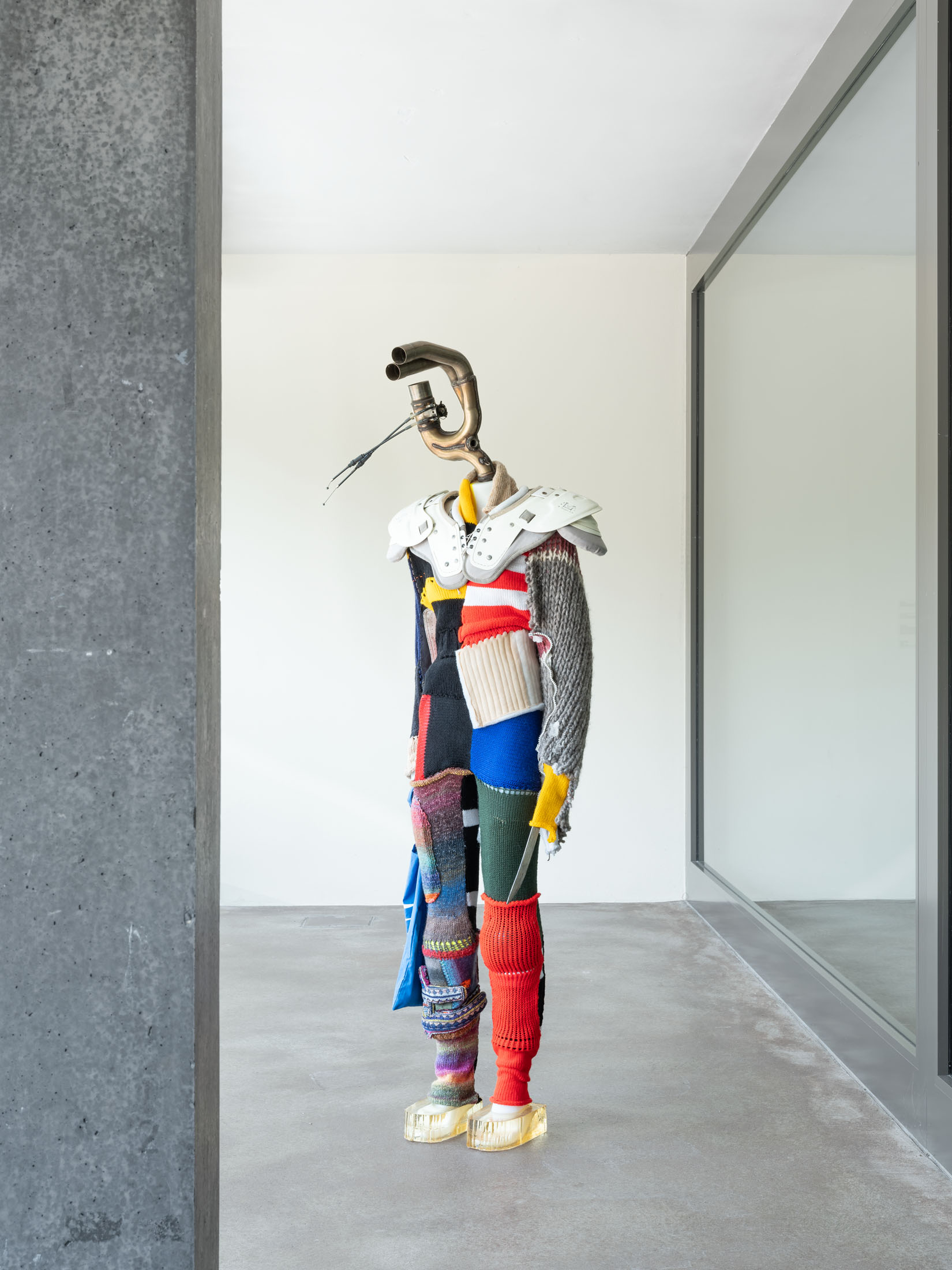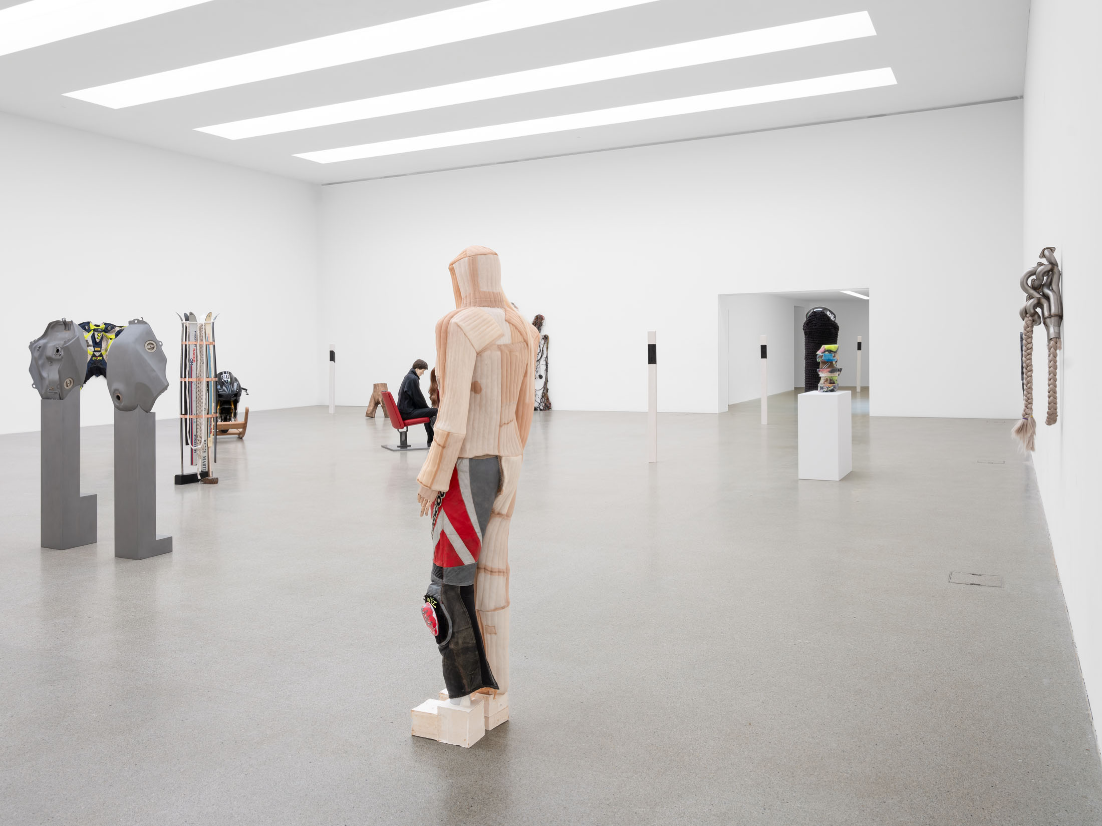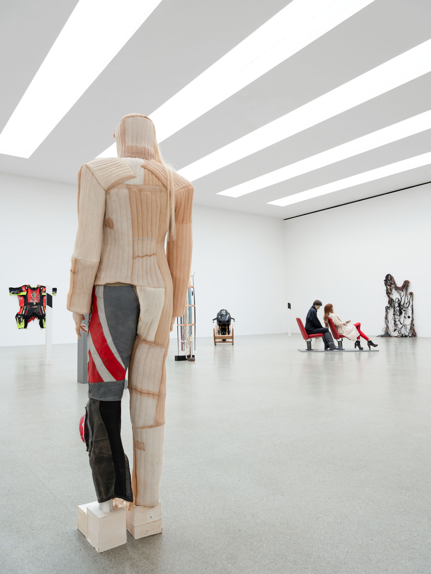 The sculptural work of Alexandra Bircken explores analogies between the human body and machines, examining the structures of protection, identity, and the extension of the individual. The Berlin-based artist combines a wide range of materials and techniques—often woven or knitted textiles—to probe the boundary between humans and their constructed environments. She also dissects everyday technical ob-jects with surgical precision, revealing the biomorphic qualities of machines. This dual approach results in an ambivalent body of work that is both cyborg-like and androgynous, questioning human behavior and desire, as well as the vulnerability of bodies in relation to technology.