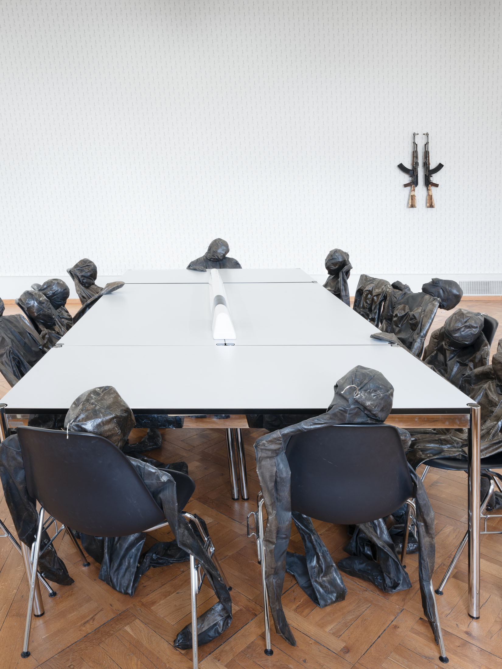 PB/SM: You also reference other symbols of authority in your work, such as the so-called «Merkel rhombus,» a gesture characteristic of the former German chancellor. This gesture appears notably in the work Doppelhaushälfte (2021), where you associate it with a dollhouse standing on two legs.