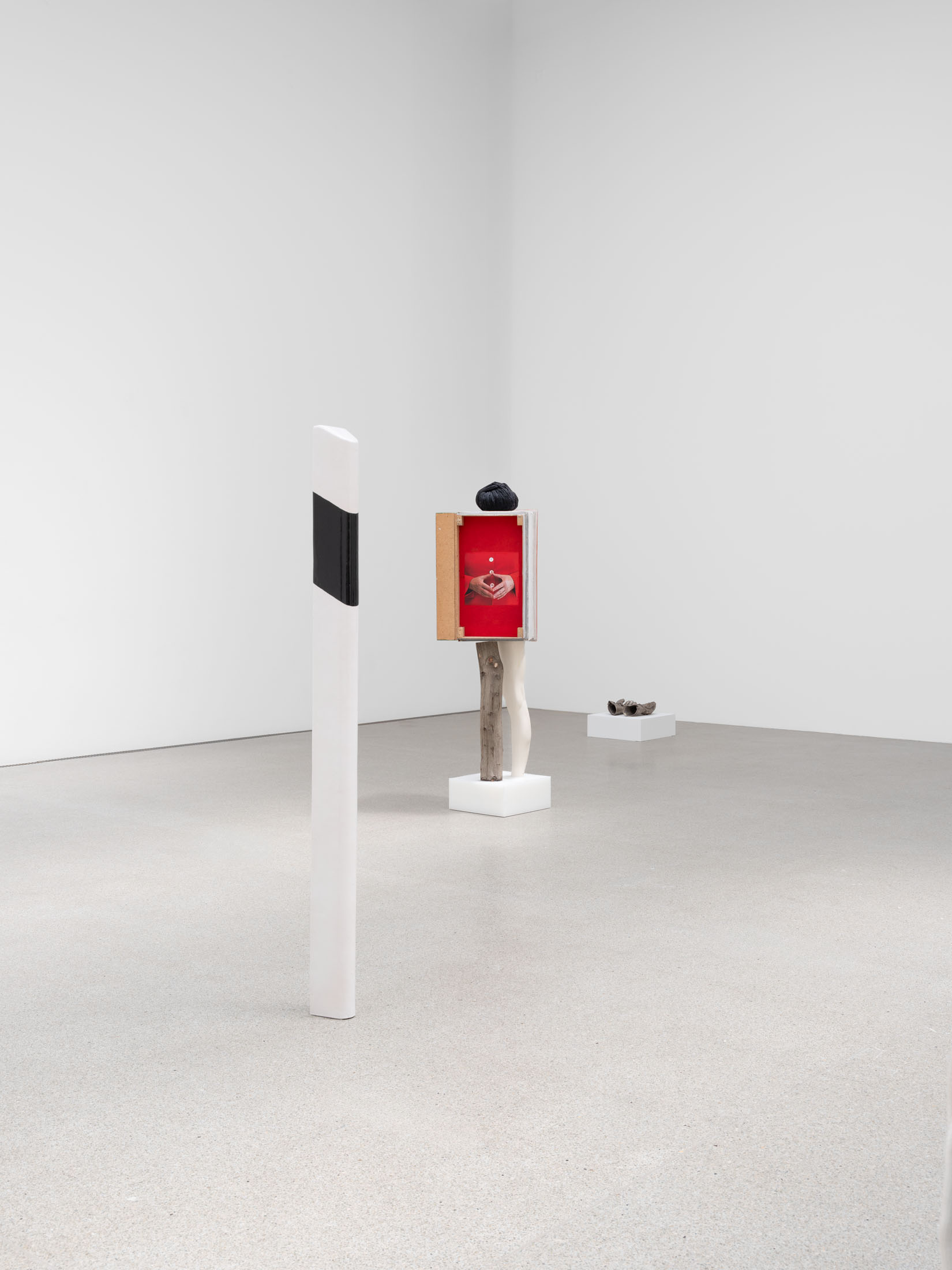 AB: The showcases (Vitrine I-V, 2025), presented here for the first time, offer me a playful opportunity to relate collected impressions and materials to each other. The showcases thus form a kind of dynamic echo that reverberates back and forth between ongoing personal research and my works in the space. Similar to my sculptures, some showcases are more conceptually or thematically driven, while others suggest an associative approach—a kind of montage, in the cinematic sense of the word.