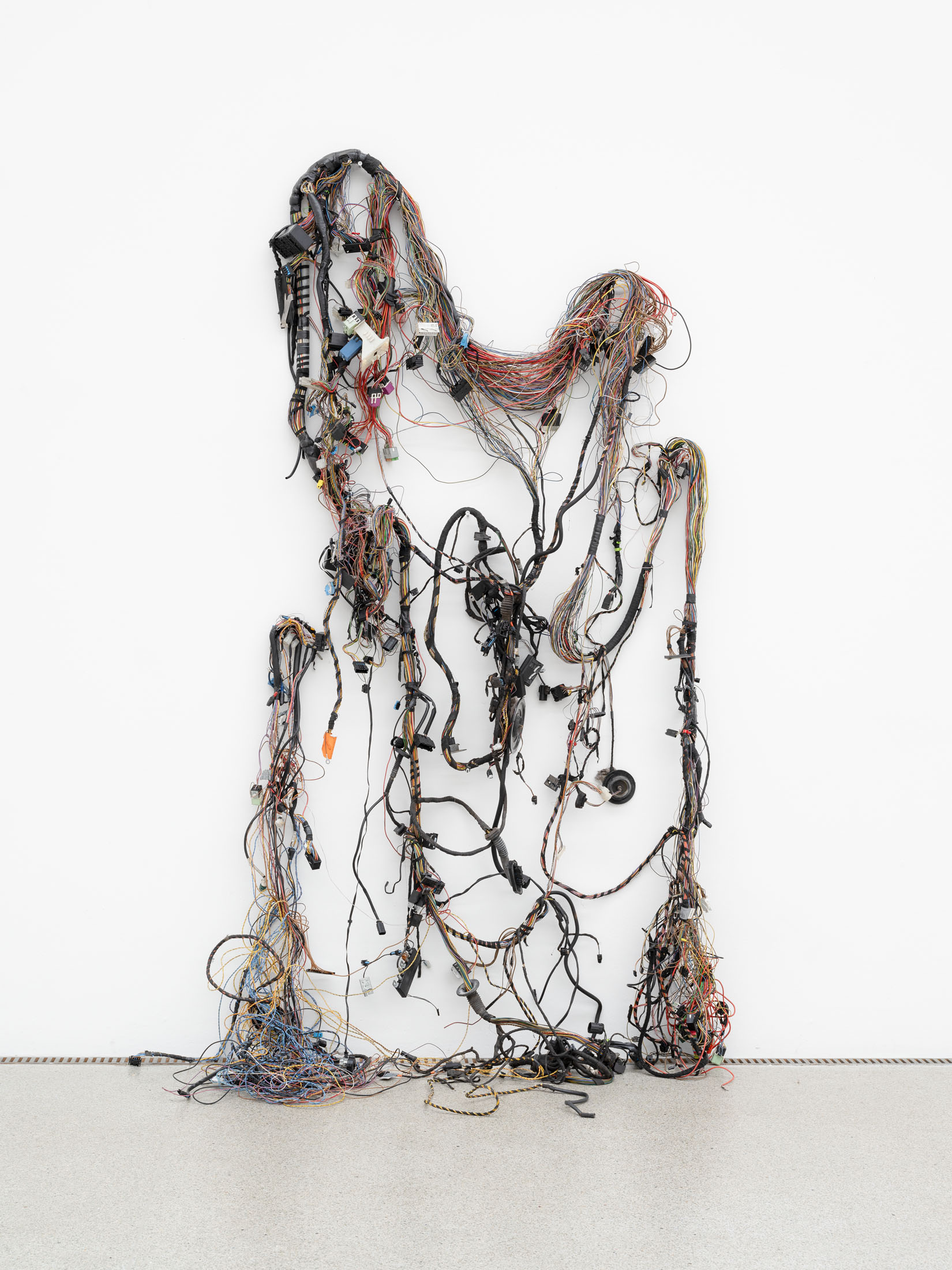 AB: Inside machines and engines, complex bundles of cables, known in German as «Kabelbäume,» (eng. cable harnesses) run through them. These highly branched structures resemble the human nervous or vascular system, both formally and functionally. Just as a network of fine veins extends from the heart through the human body, in a car, the battery serves as the central organ supplying power to electrical components—ignition, navigation system, radio, heating and cigarette lighter—through the cable harnesses. This transfer of organic principles to technical systems fascinates me and is a central motif in my work. The wall piece Efeu Elektro (2023) expresses this most clearly: the work consists of a rhizomatically grown cable harness that takes the form of an organic-technical sculpture.