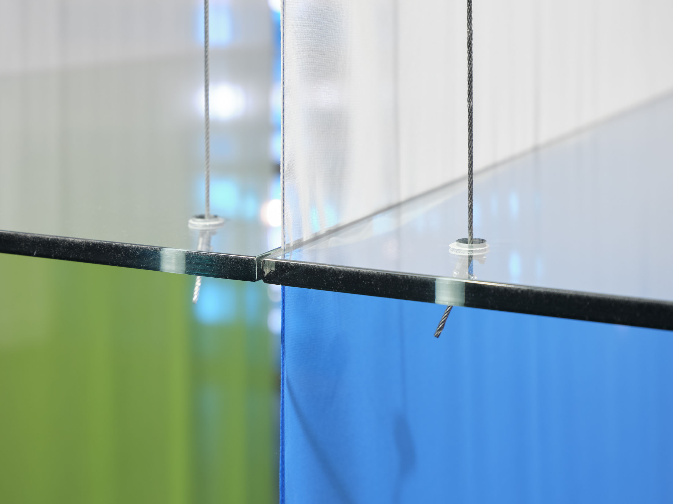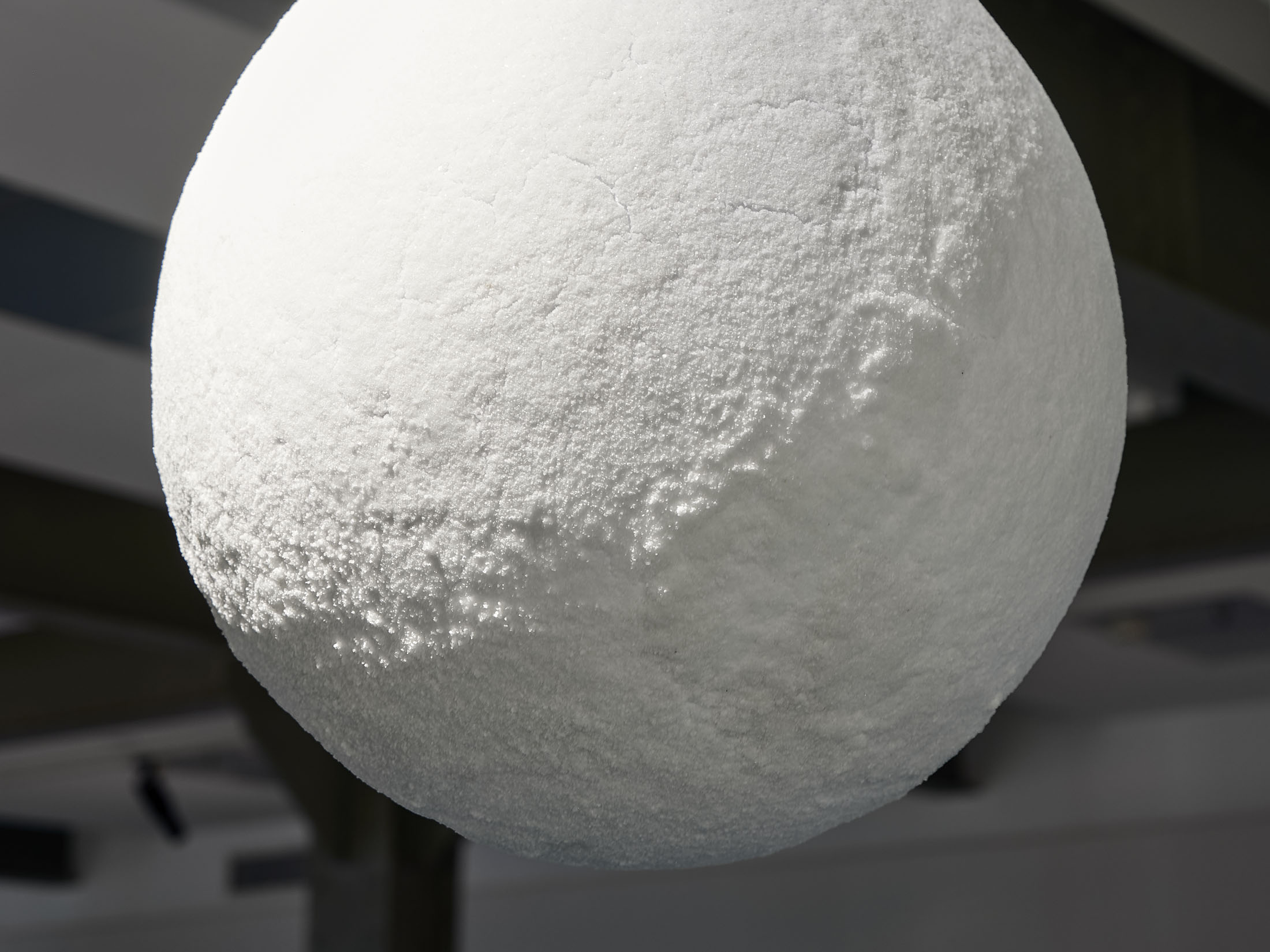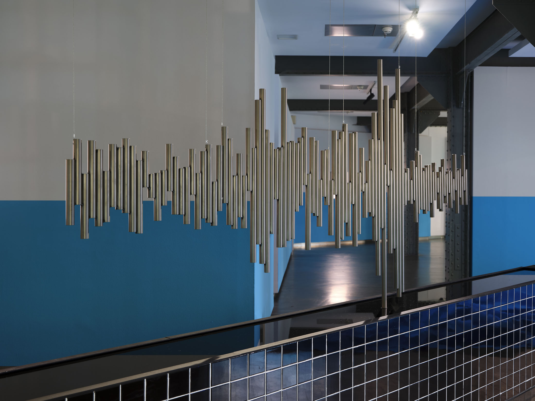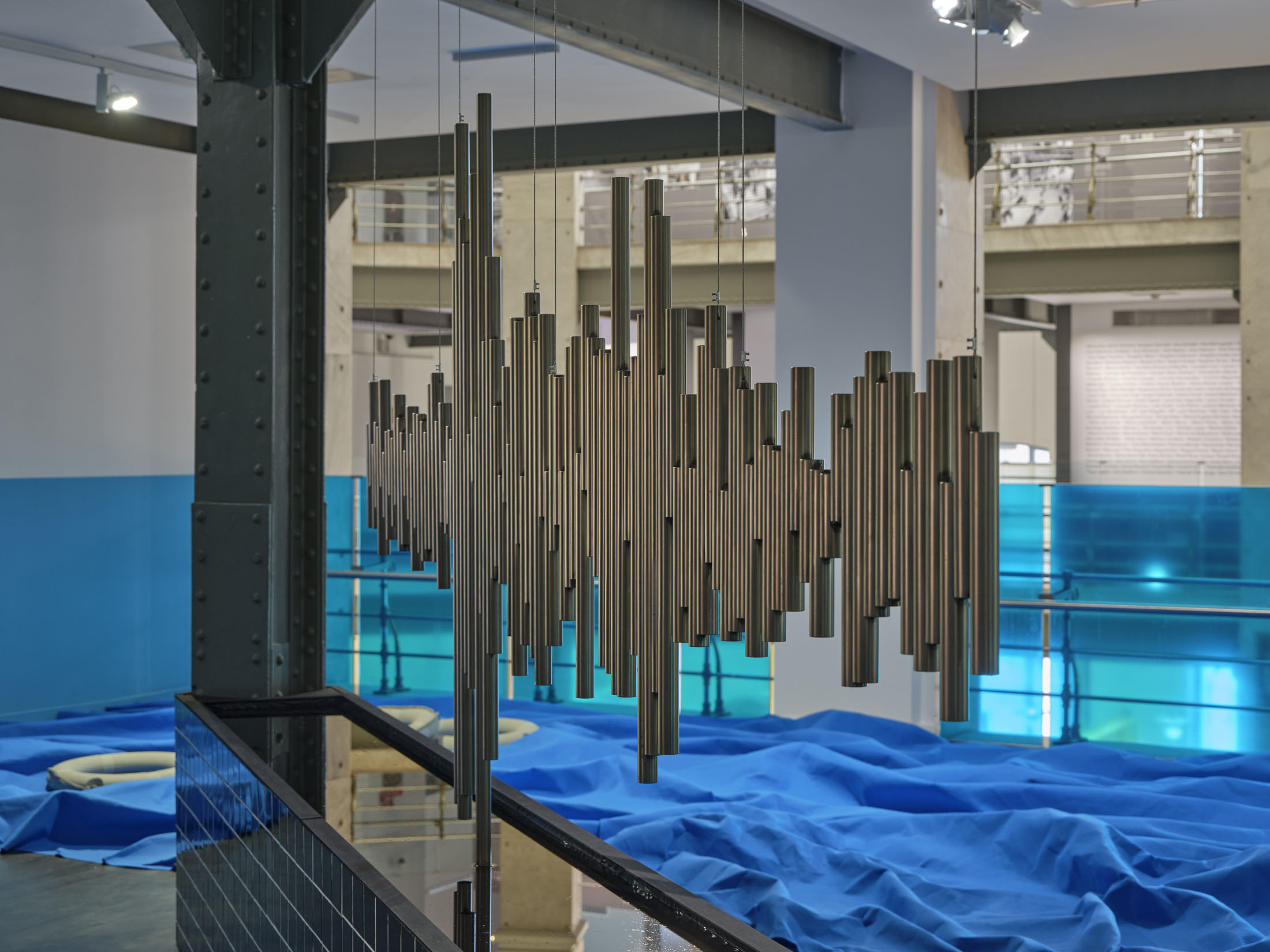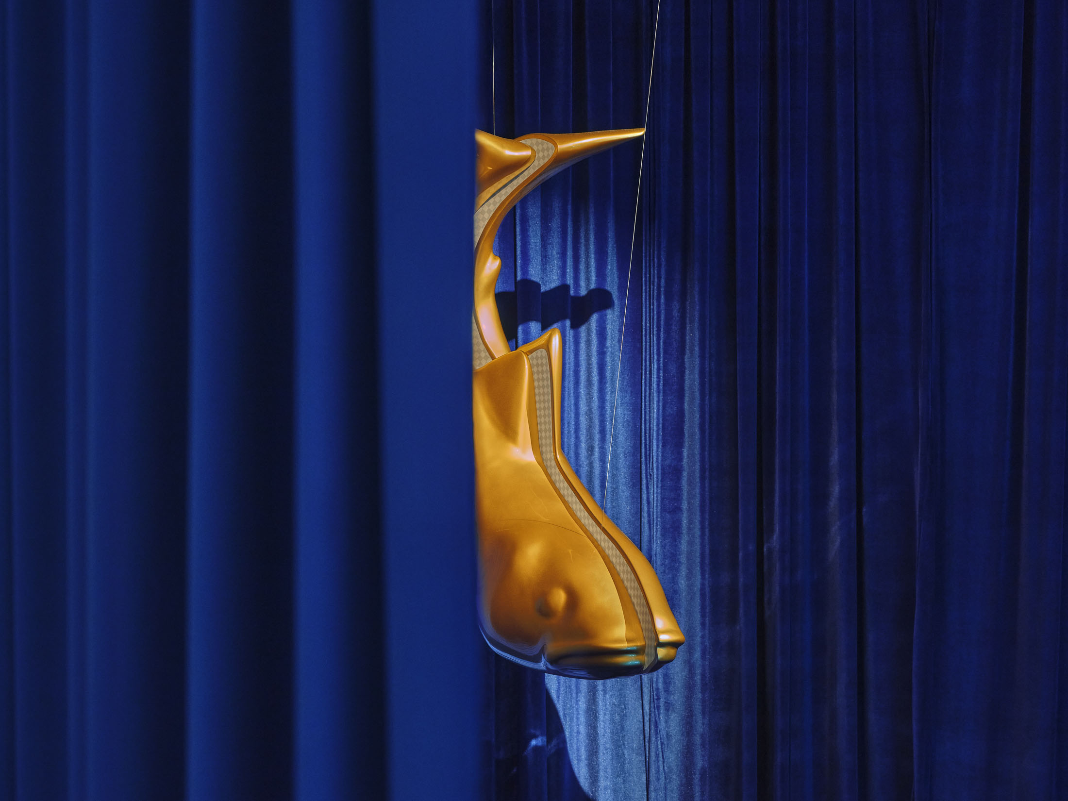 Themes such as visibility, dual identity, and the subconscious are present throughout the exhibition—from the video La Bellaventura, where palmistry intersects with beauty rituals, to sculptures like Falling and Floating, inspired by the tears of Lewis Carroll’s Alice. The materialization of sound also plays a key role, with the suspended installation Melancholy and Restraint, which visually echoes the song Teardrop by Massive Attack.