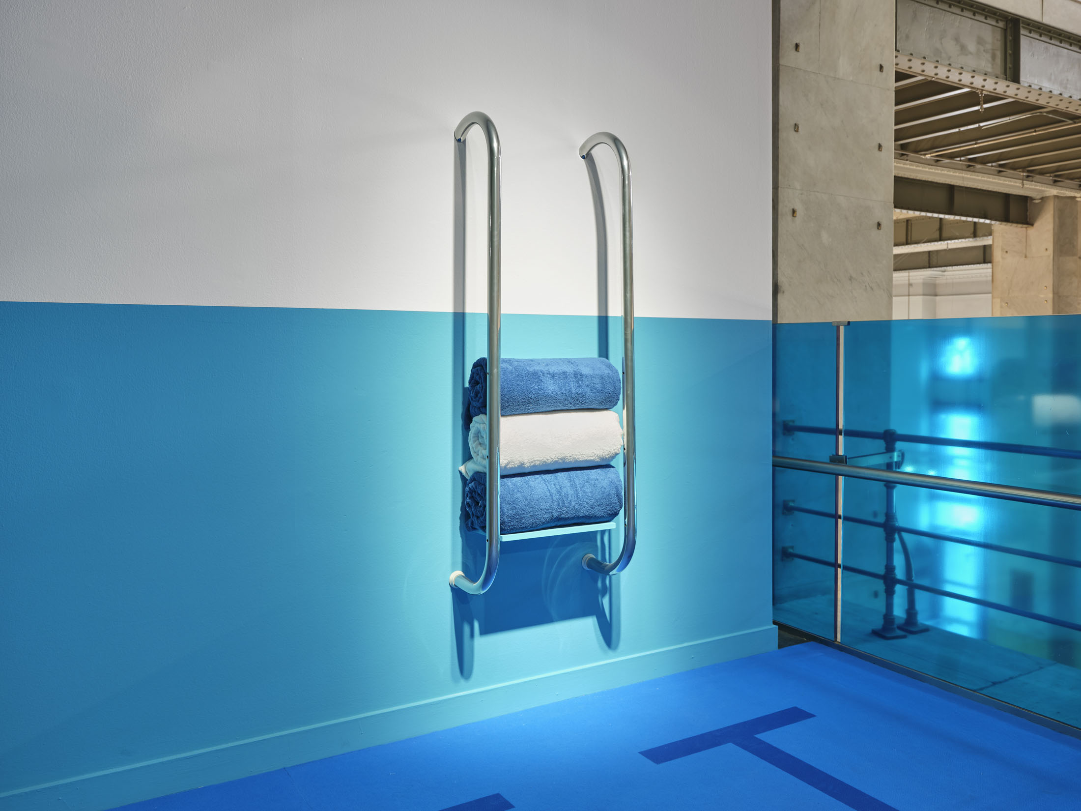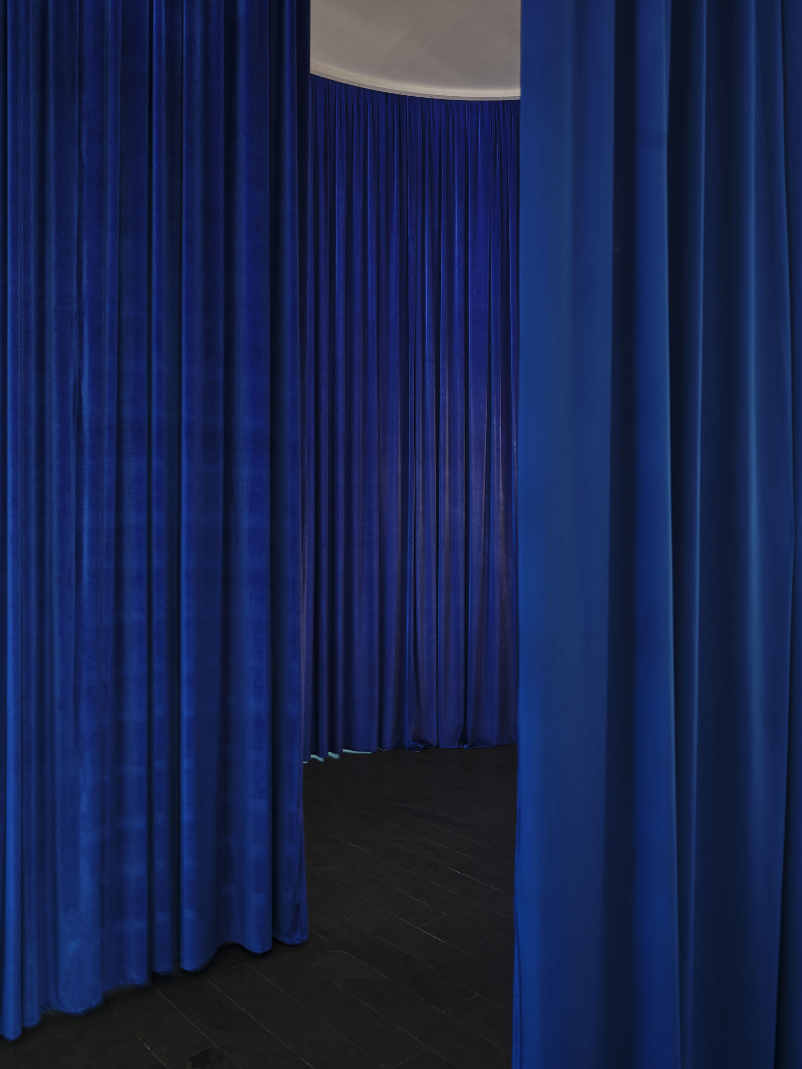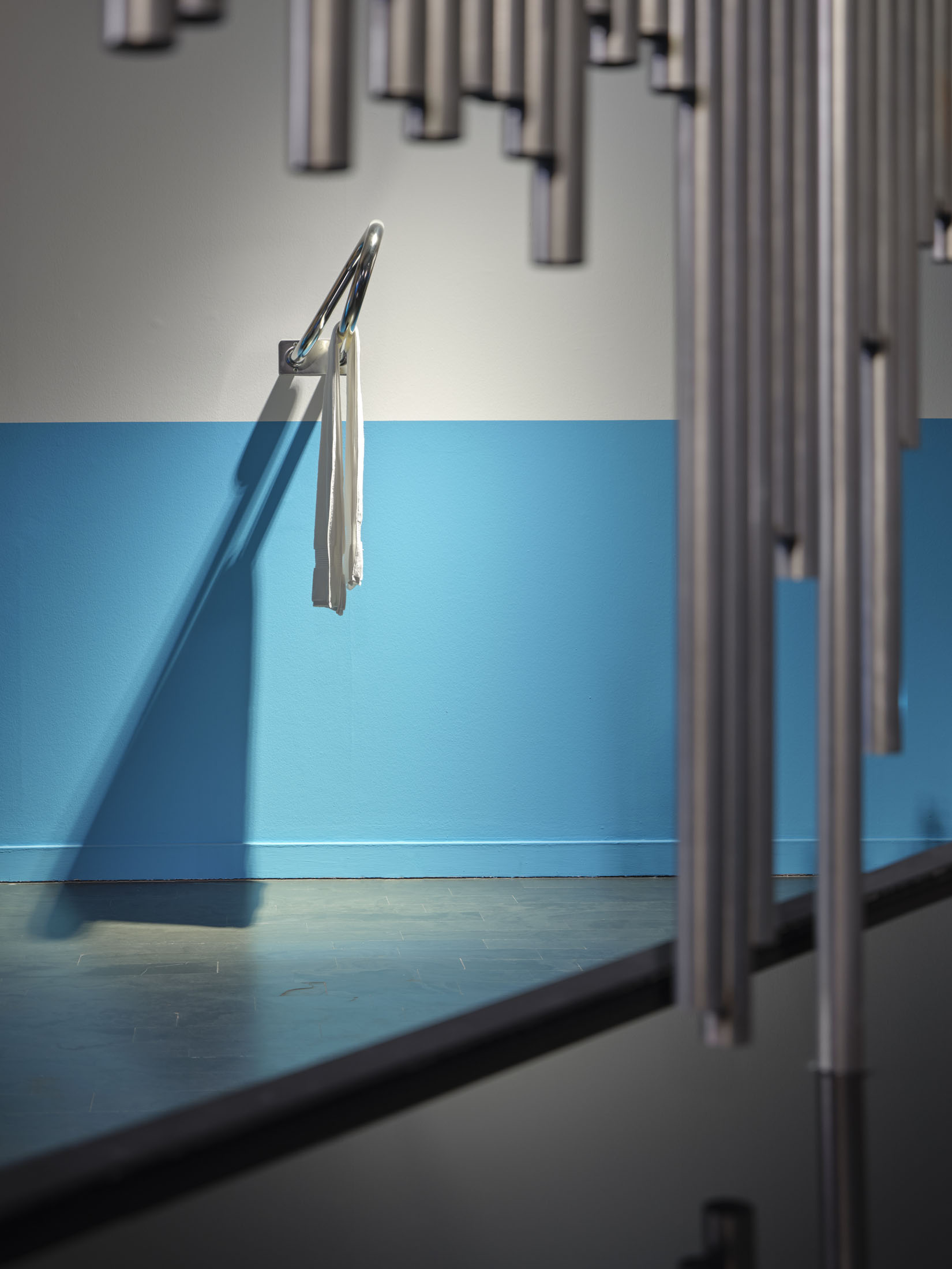 The exhibition explores dualities and repetition, using the unique architecture of the venue as a narrative device. A blue band at neck height runs throughout the entire floor, transforming the space into a metaphorical pool. This visual element connects all the rooms and recalls Lobera’s previous works on liminality and perception.