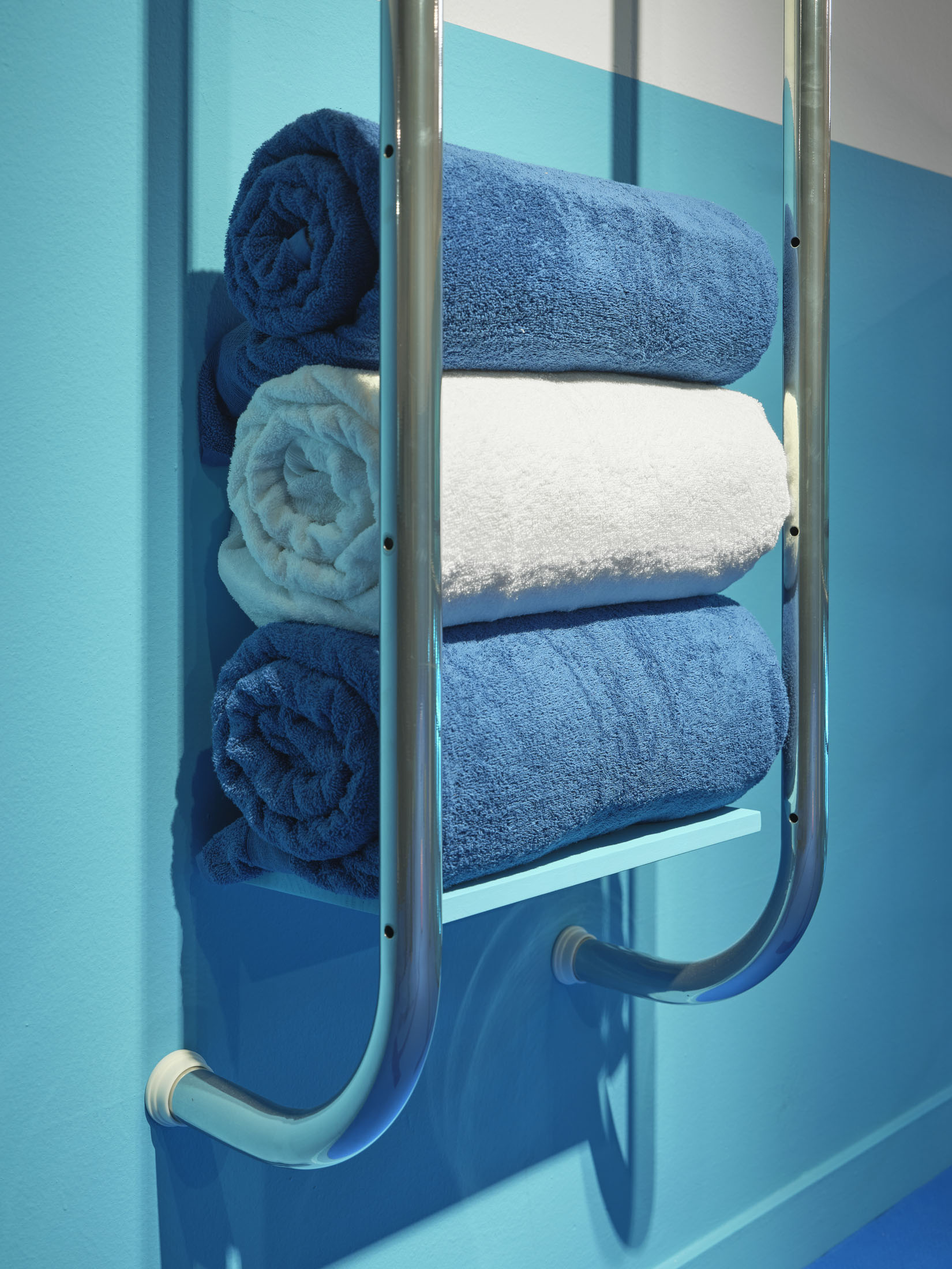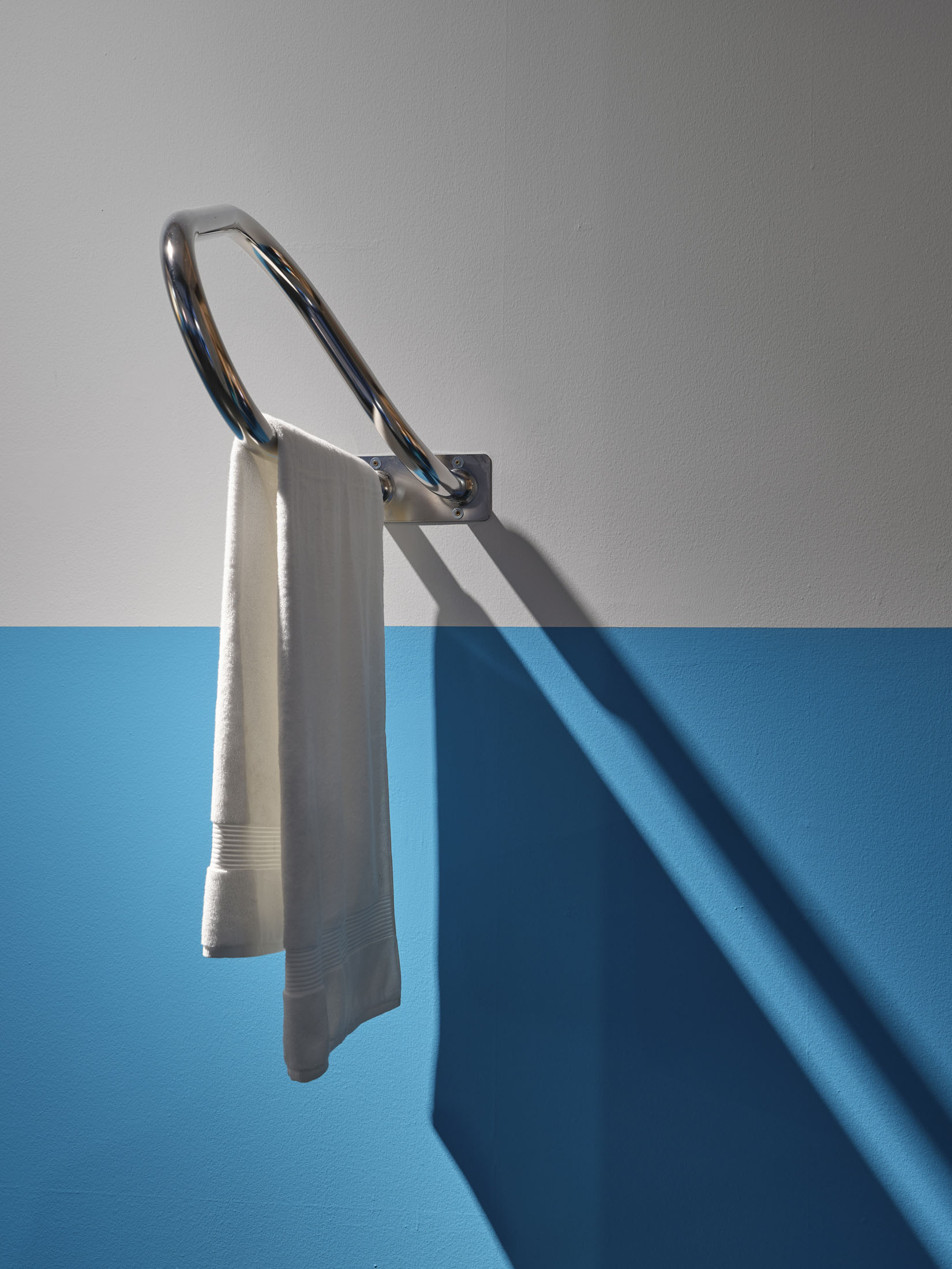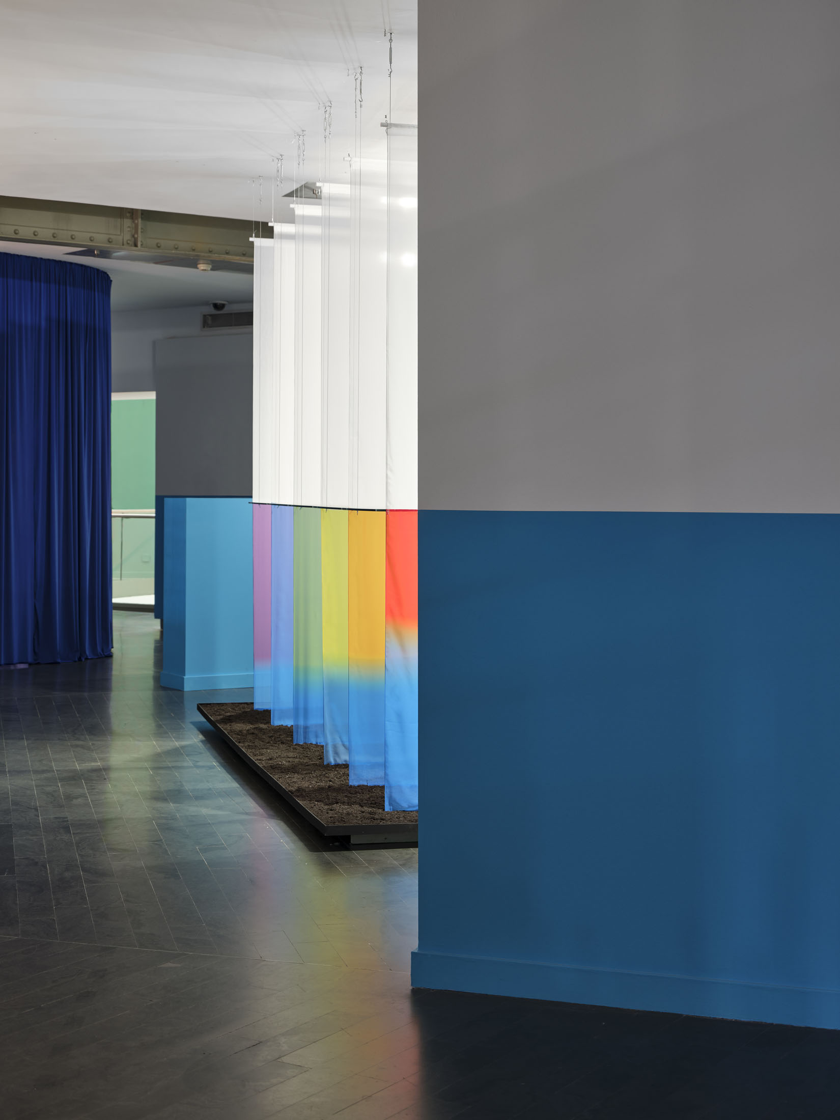 The exhibition explores dualities and repetition, using the unique architecture of the venue as a narrative device. A blue band at neck height runs throughout the entire floor, transforming the space into a metaphorical pool. This visual element connects all the rooms and recalls Lobera’s previous works on liminality and perception.