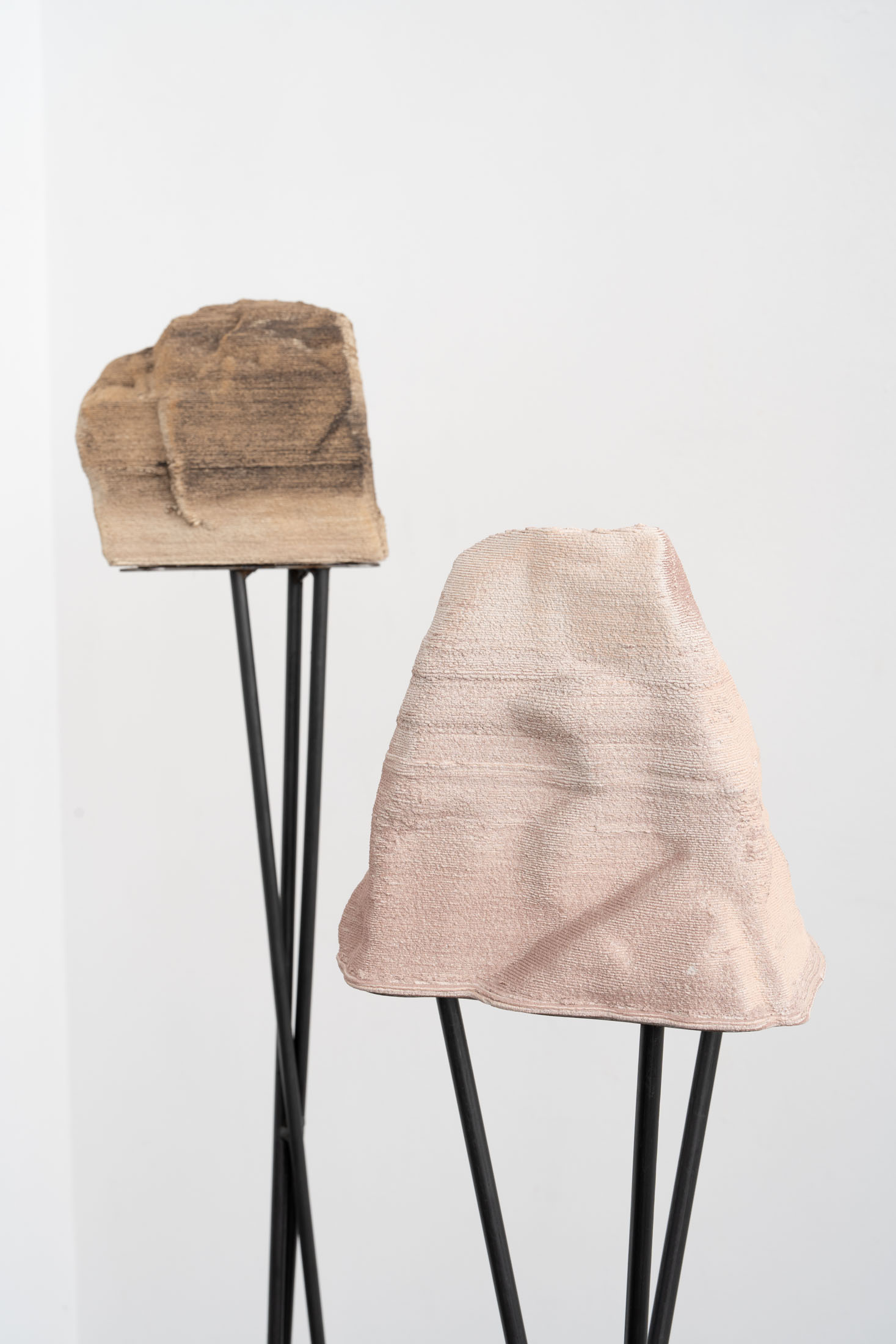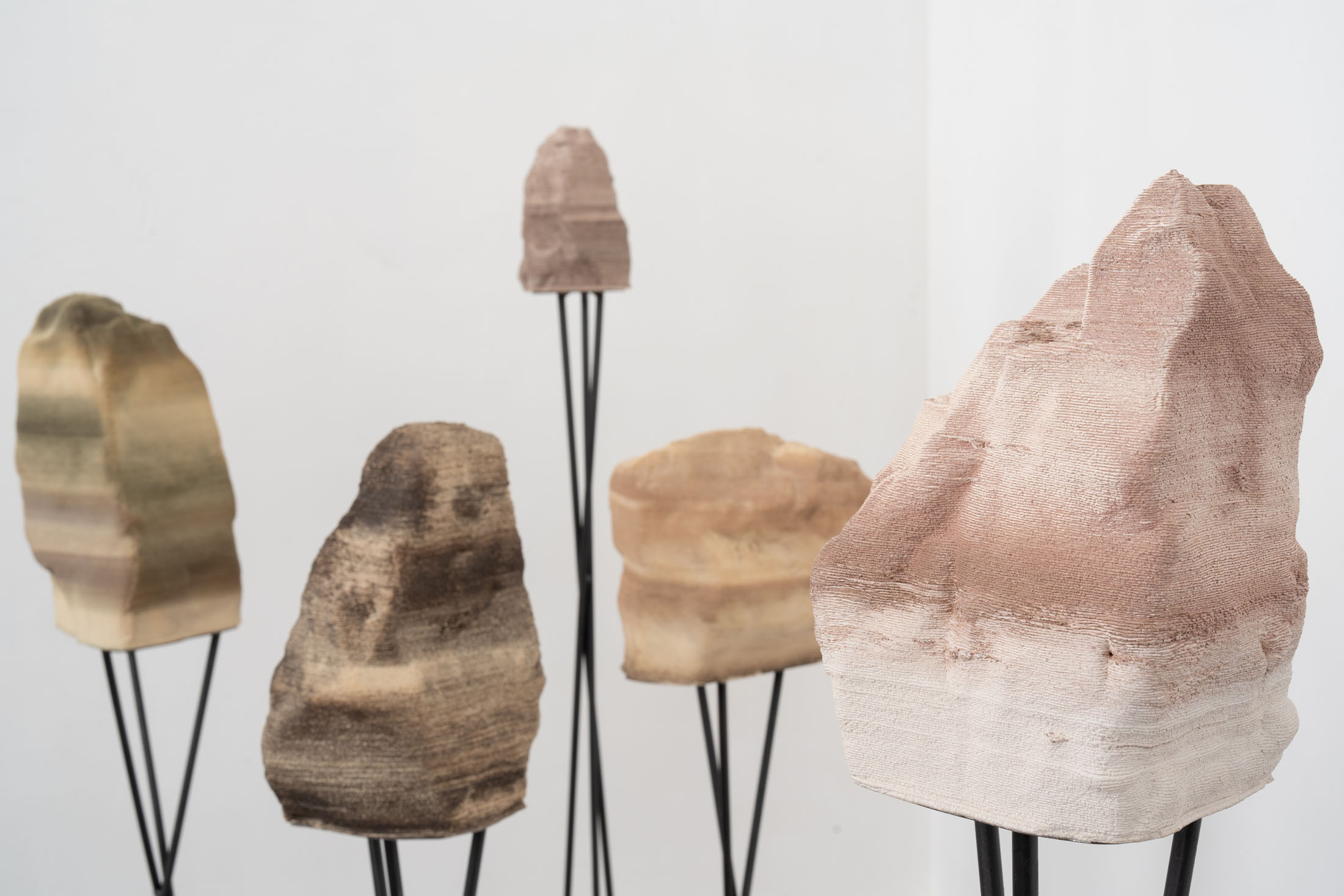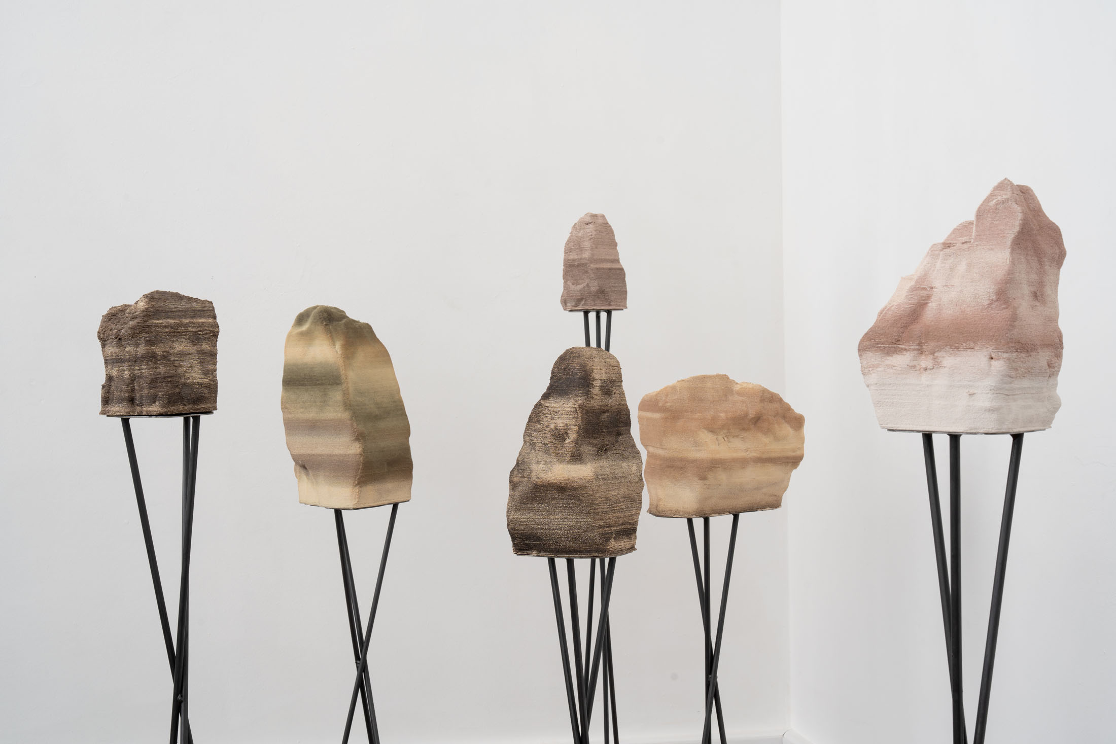 Scattered throughout the space are Padilla’s digitally reconstructed ceramic stones and photographs taken from her travels. With attention to the tension between natural and artificial, living and inert, near and far, she constructs a landscape grounded in her experience of displacement. Through sound, materiality, and rhythm, her work assumes a symbolic, imaginary, and metaphysical character.