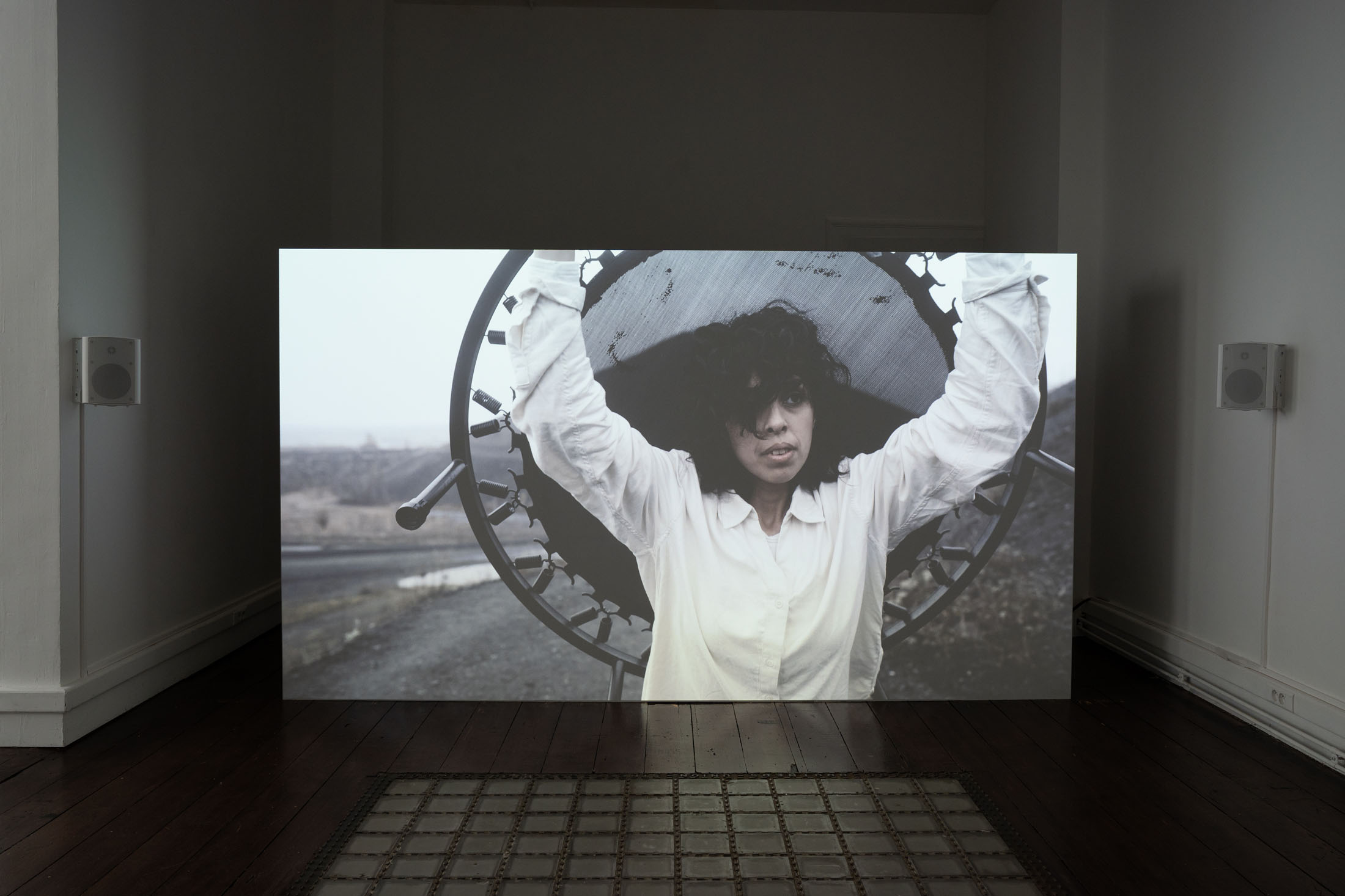 In her video piece La Ola Que Vino De Lejos (The Wave That Came From Afar), Padilla ascends one such terril in a Sisyphean act to place a black trampoline on its peak. Once at the top, she bounces beneath the open sky, gazing toward a distant terril, silently communicating with the elements. The inverted shape of the mountain, echoed in the trampoline’s form, evokes a subterranean presence—an echo from the earth’s depths.