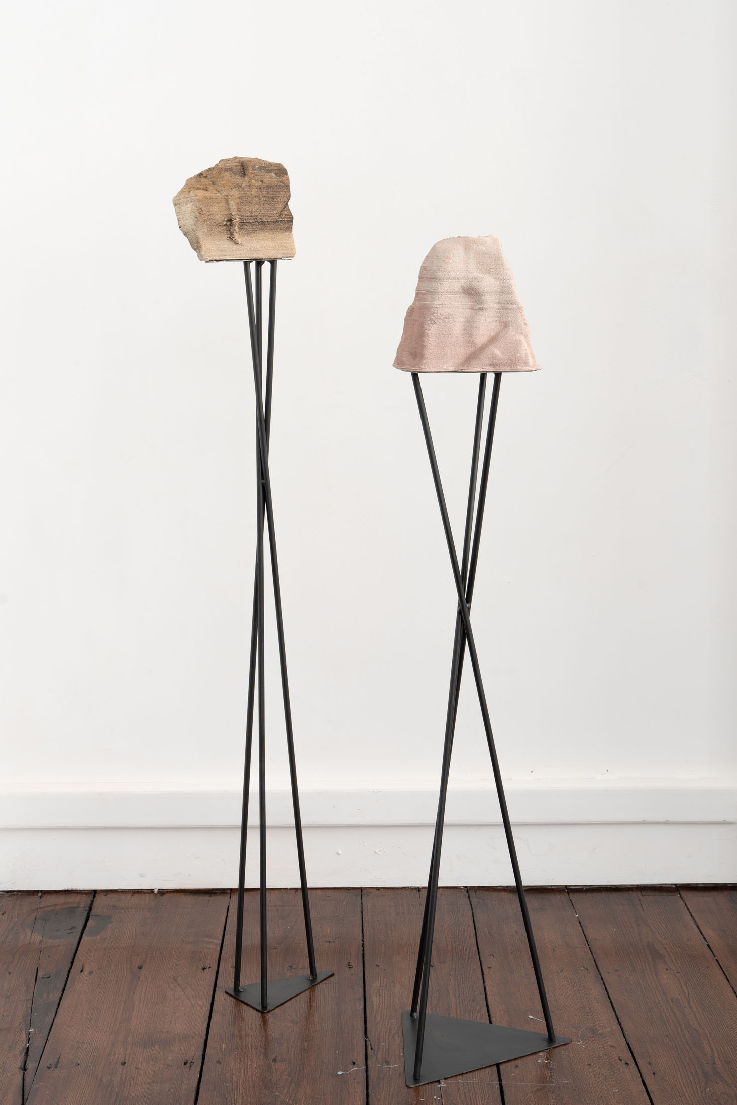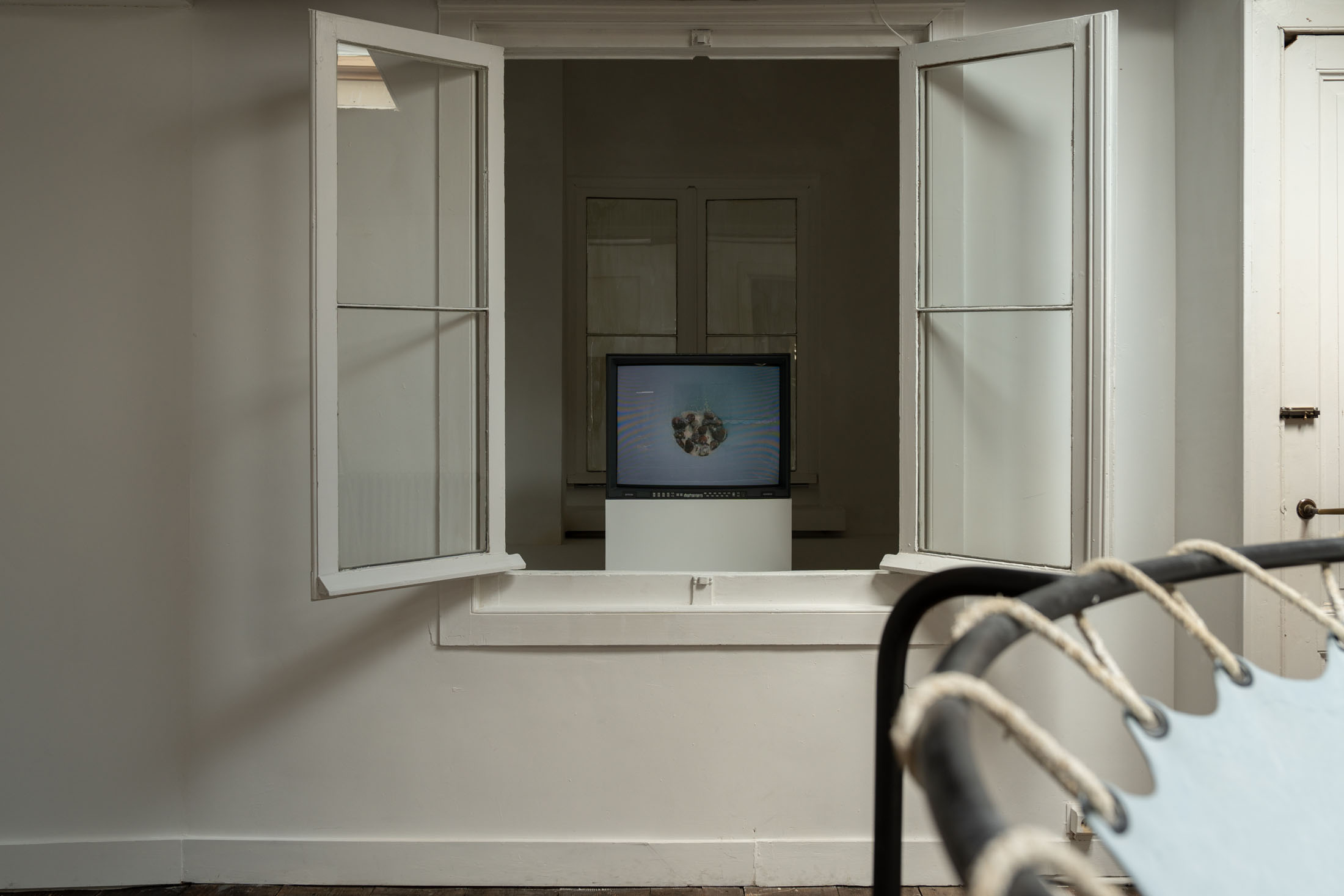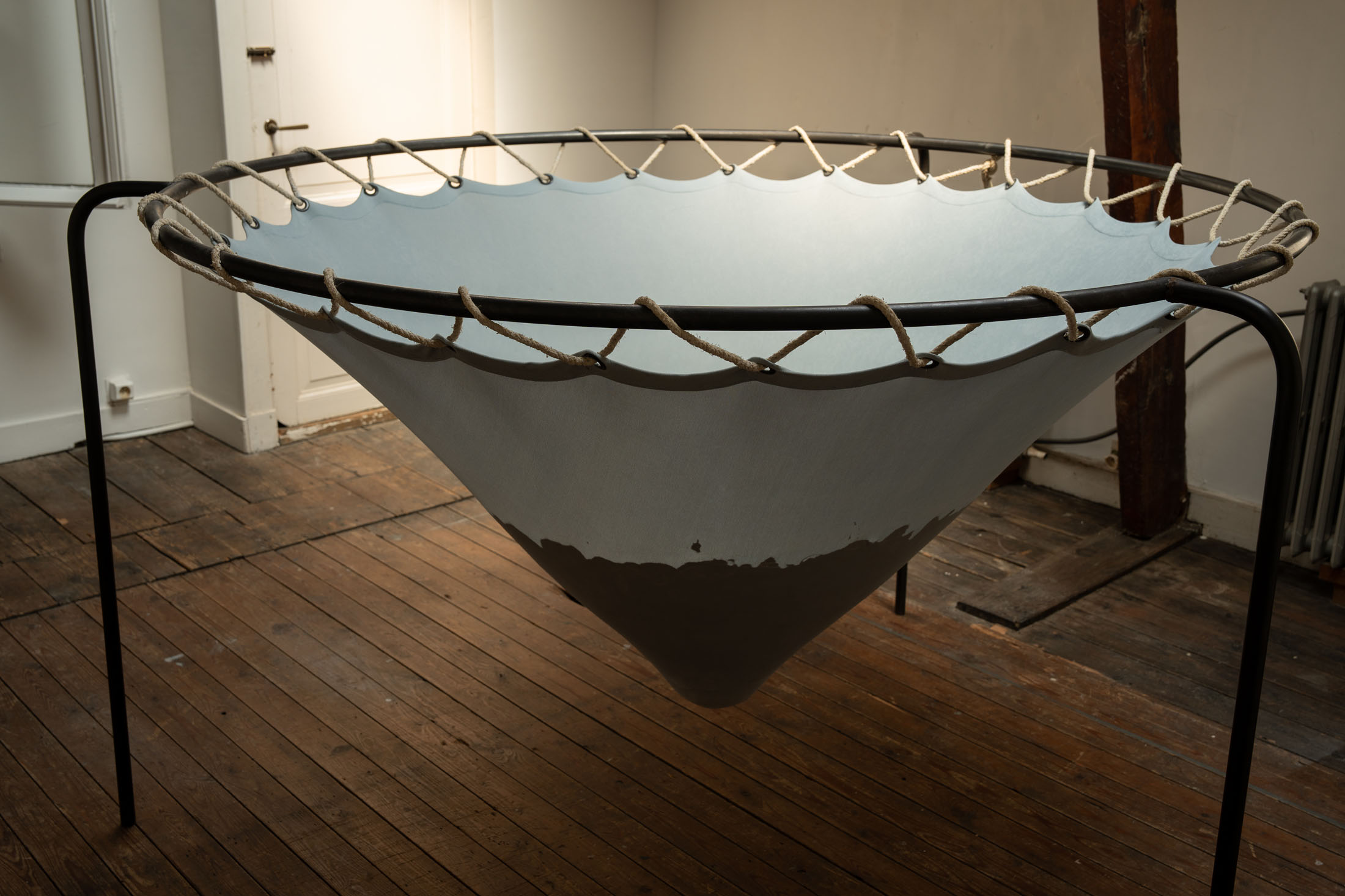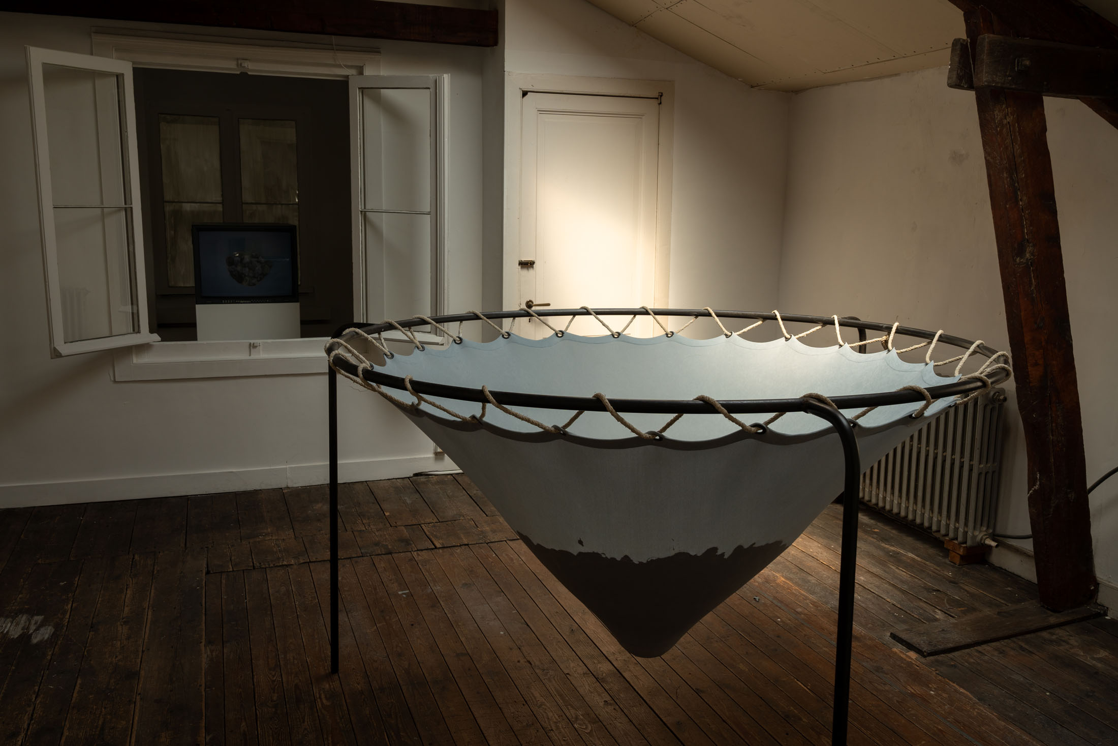 Upstairs, she revisits a 2018 piece: The Blue of Distance. In response to the installation below, a blue elastic trampoline—evoking the sky—is stretched downwards by the weight of stones and a hardened plaster mass. A video projection reveals the slow transformation of these materials, forming a consuming “blue-hole,” accompanied by a soundscape of cosmic reflections—astral bodies, physics, and poetry—exploring the forces of gravity and time.