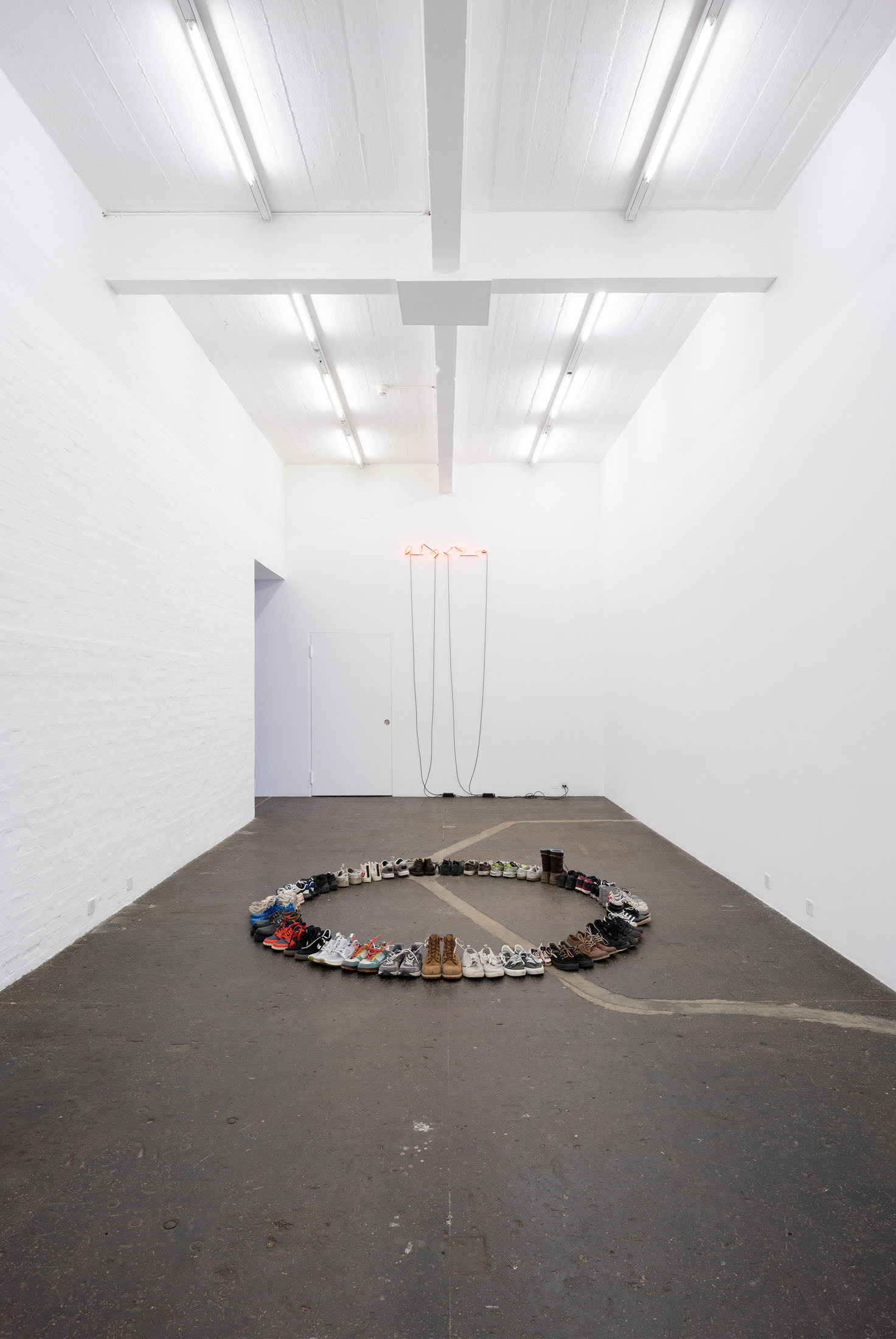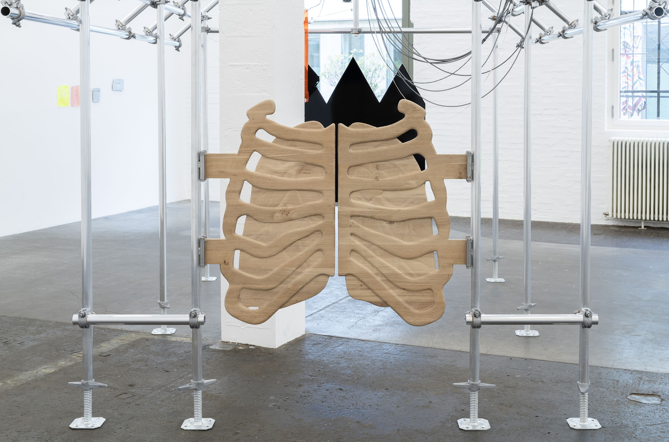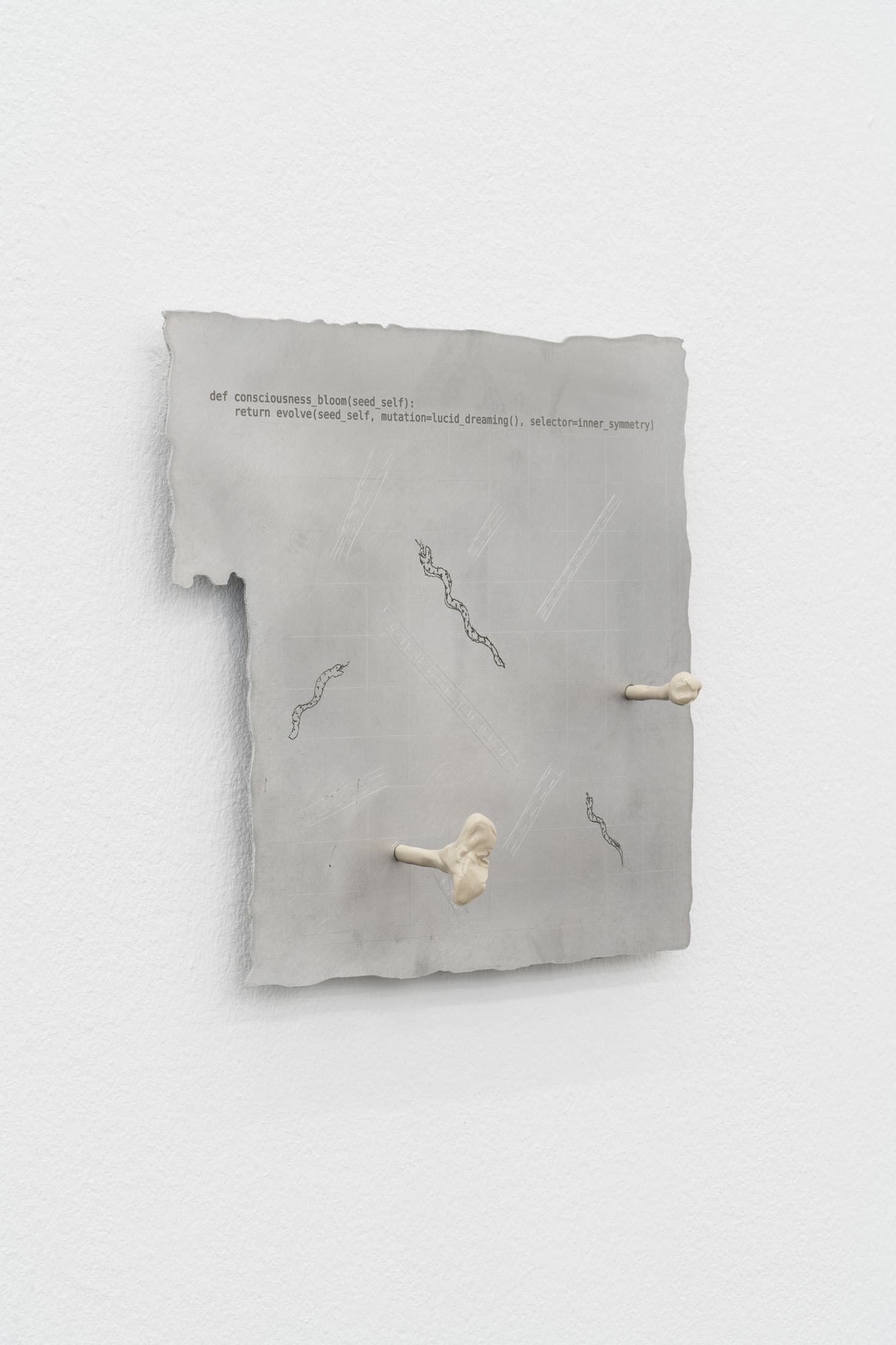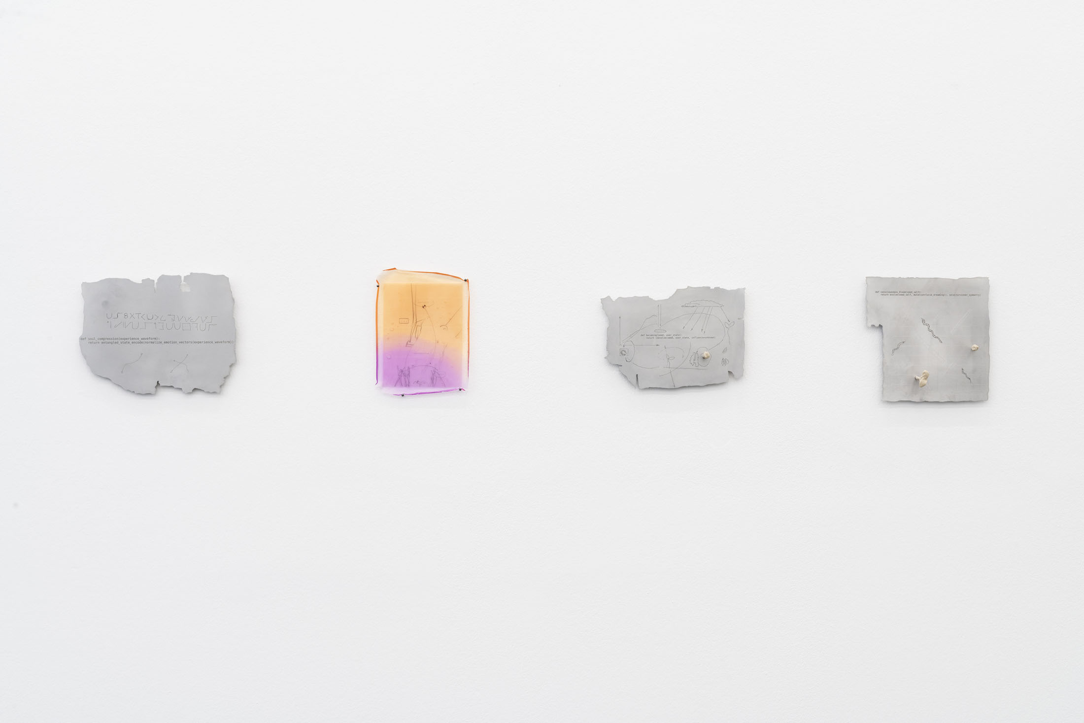 In his most comprehensive solo exhibition to date, Navarro explores algorithms as media of revelation and contemporary oracles. Language runs through his kaleidoscopic work as both material and method: Spoken lines of code turn into poems, fragments of algorithms into neon signs, letters into holy figures. His practice of typing thoughts and observations with a typewriter on recycled paper sheets often lays the groundwork for his pieces. From this evergrowing archive, Navarro develops works such as his ongoing series II (Inflected Introspection): As an alchemist might, the artist casts his paper notes in resin and hangs them on the wall like precious amber inclusions. In his installation Ratking’s hyper-sanctum, specifically developed for the Kunst Halle Sankt Gallen, Navarro turns mirror-smooth surfaces into display-like altar pieces. And in his series Defixio, the young artist draws on the milleniums-old custom of curse tablets: inscriptions carved into thin sheets of lead, buried near graves or temples, intended to bewitch people. Navarro transfers such occult practices to aluminium plates, into which he incises fragments of fictitious algorithms. With such works, Aramis Navarro draws connections between magic rituals, notions of the sacred, and digital technologies. In this way, «algorithmic-mega-death-superspell.exe» questions the role which algorithms play in our current belief systems.