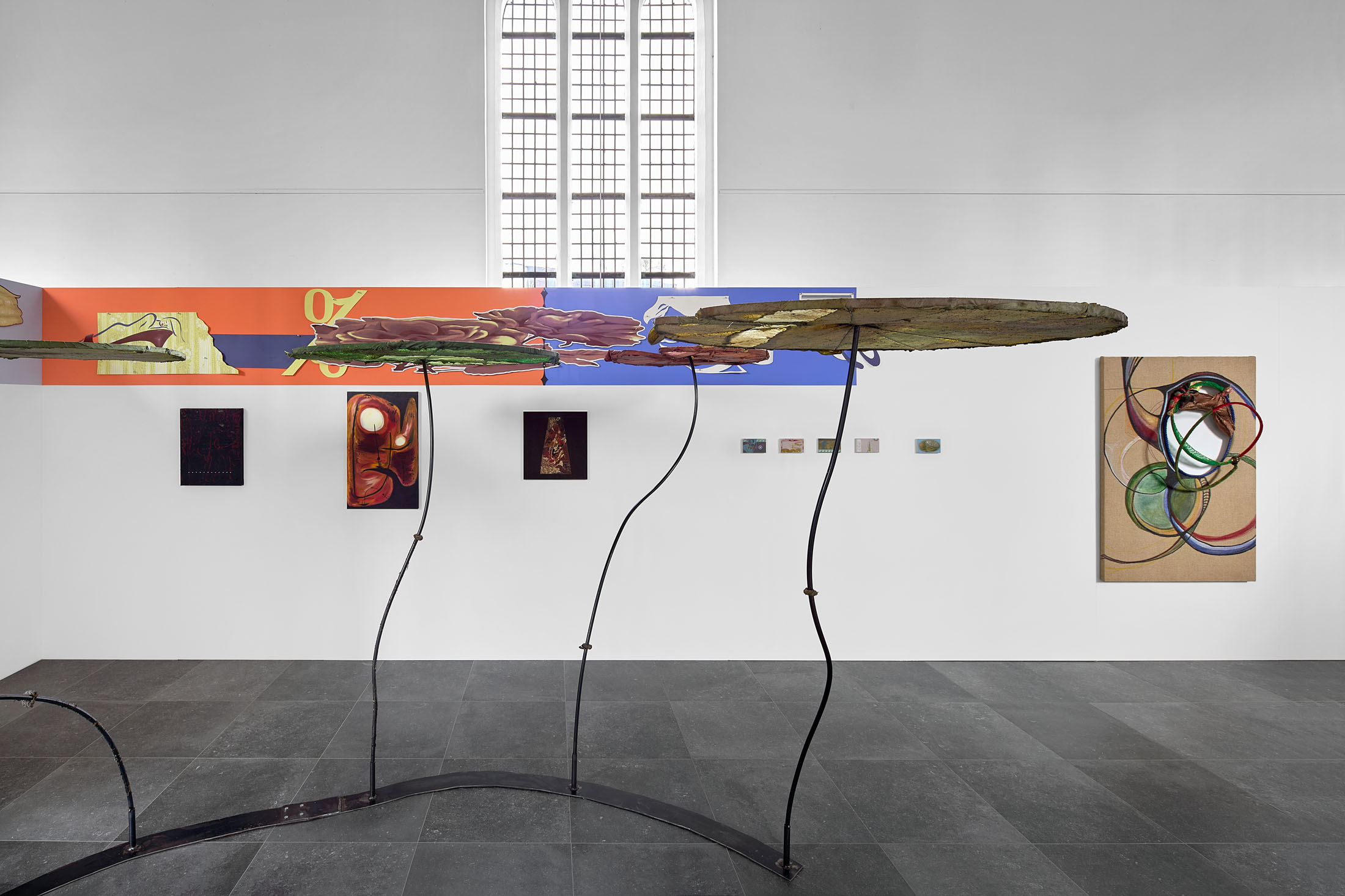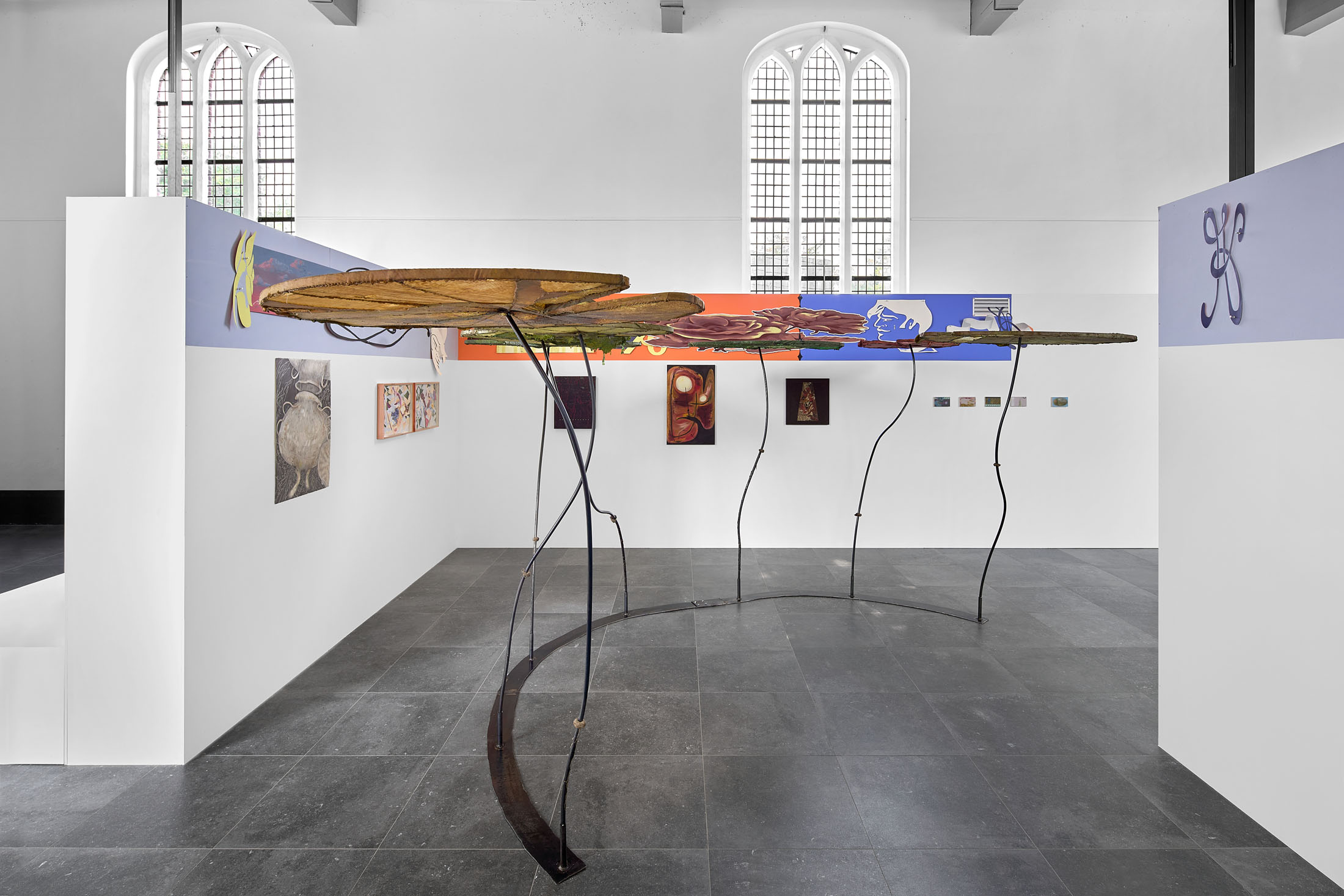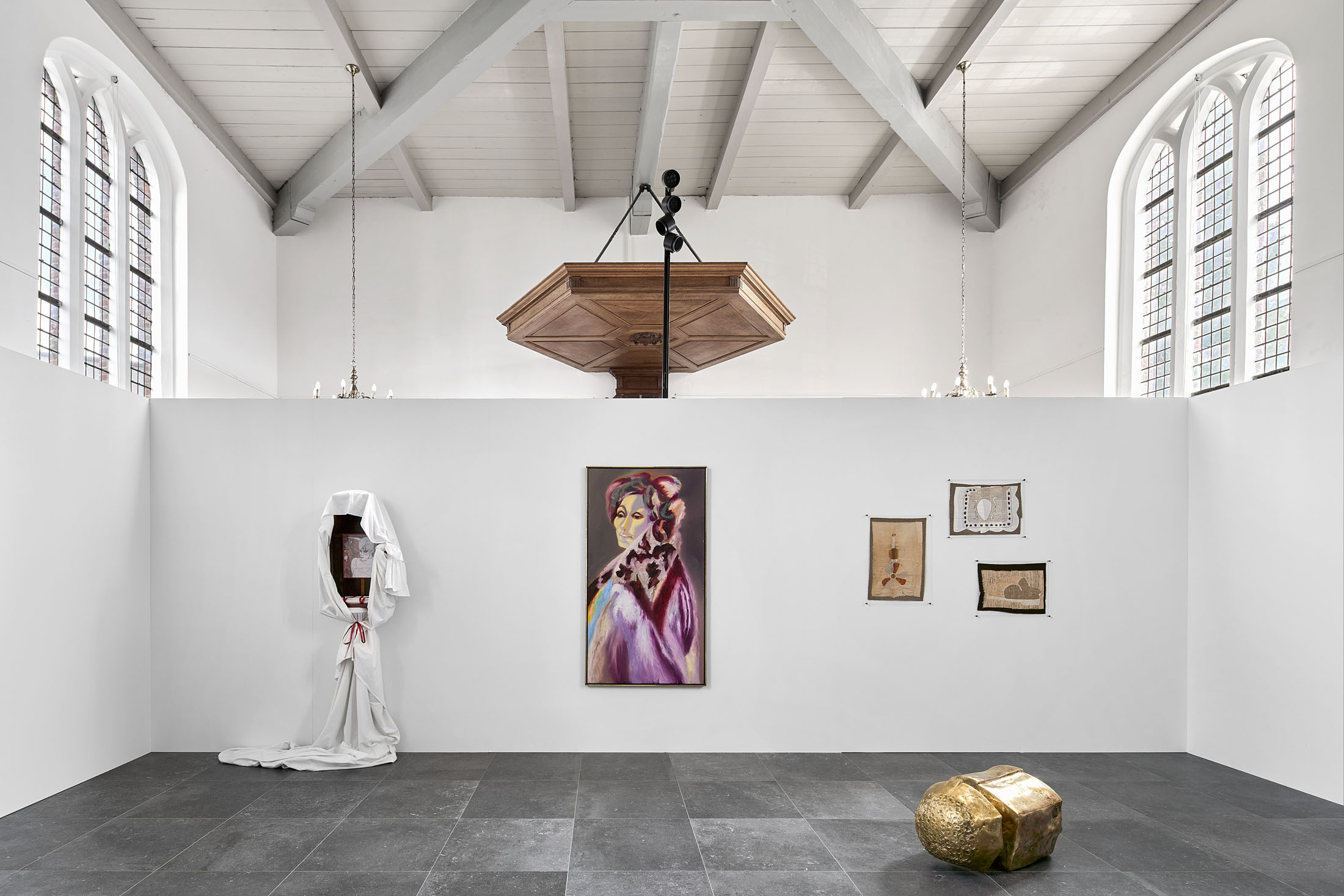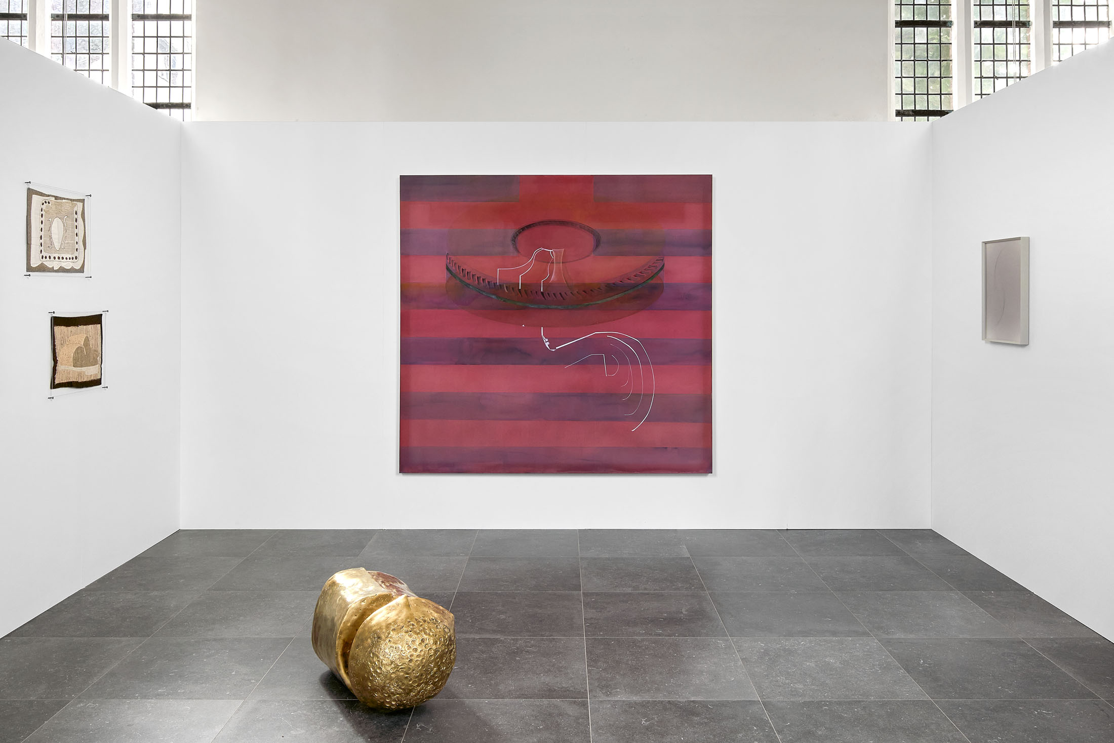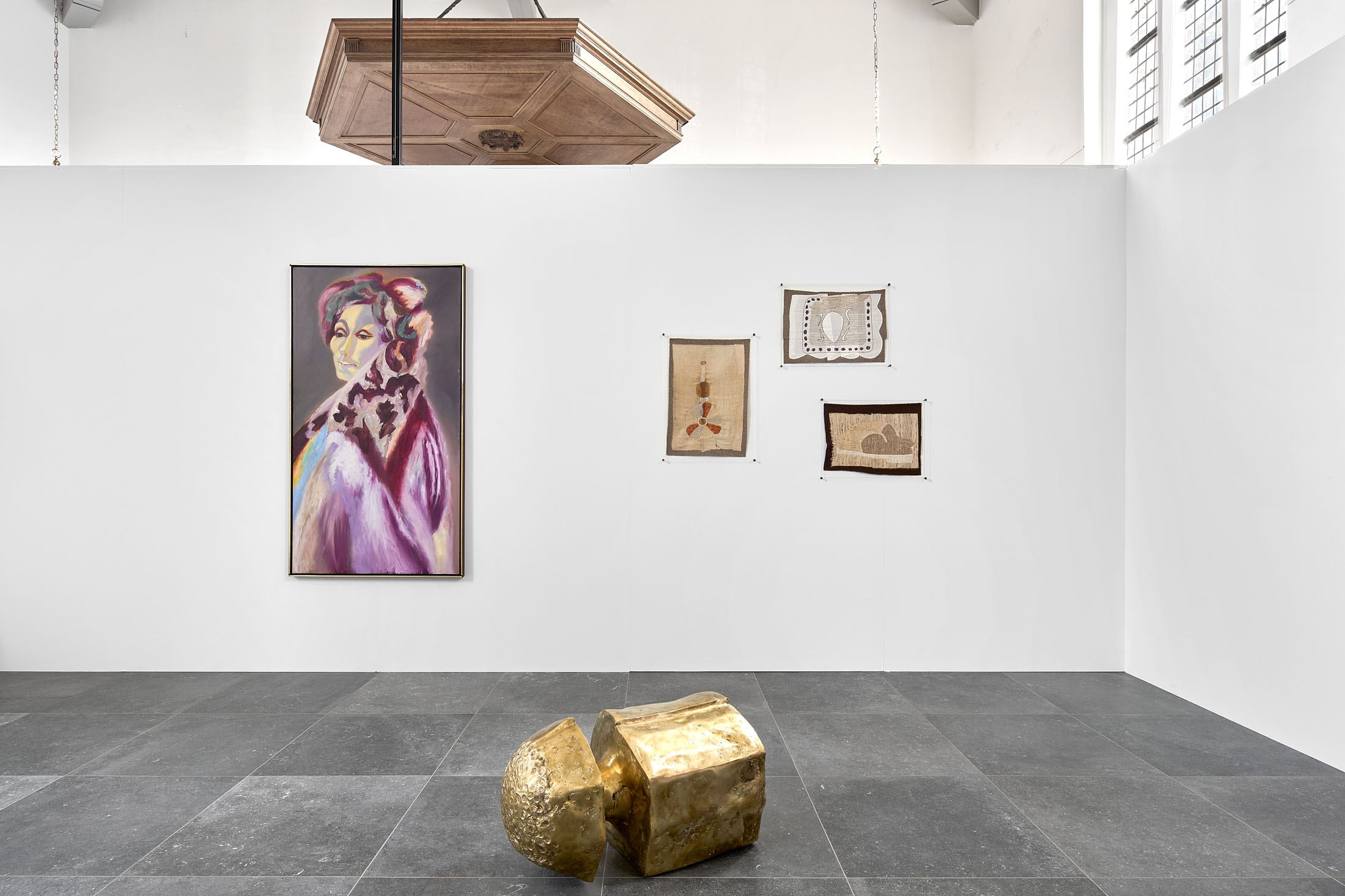 Marlene Smith inherited crochet napkins and doilies, then rolled them into sugar fondant to try and remember what sugar meant in the Caribbean, and to the memory of those who would have felt at home around these heirlooms. Sonia Gomes exclusively works with textiles that were previously worn, always respectfully adopting the social entanglements of their previous owners. Intimate expressions and traces of use through fabrics are also present in the works by Fernando Marques Penteado. His first gesture is often one of restoration or conservation – backing fragile leftovers with heavy-duty, rainproof felt. Jessy Razafimandimby pushes his paintings beyond good old bourgeois taste with cotton baldaquins that feel right at home in the chapel.