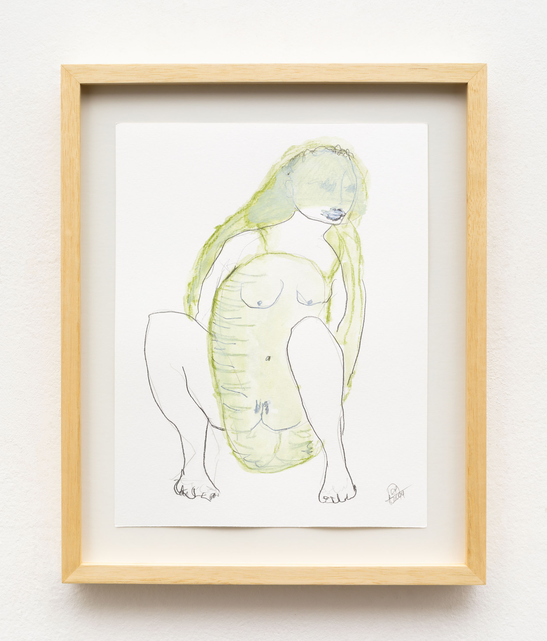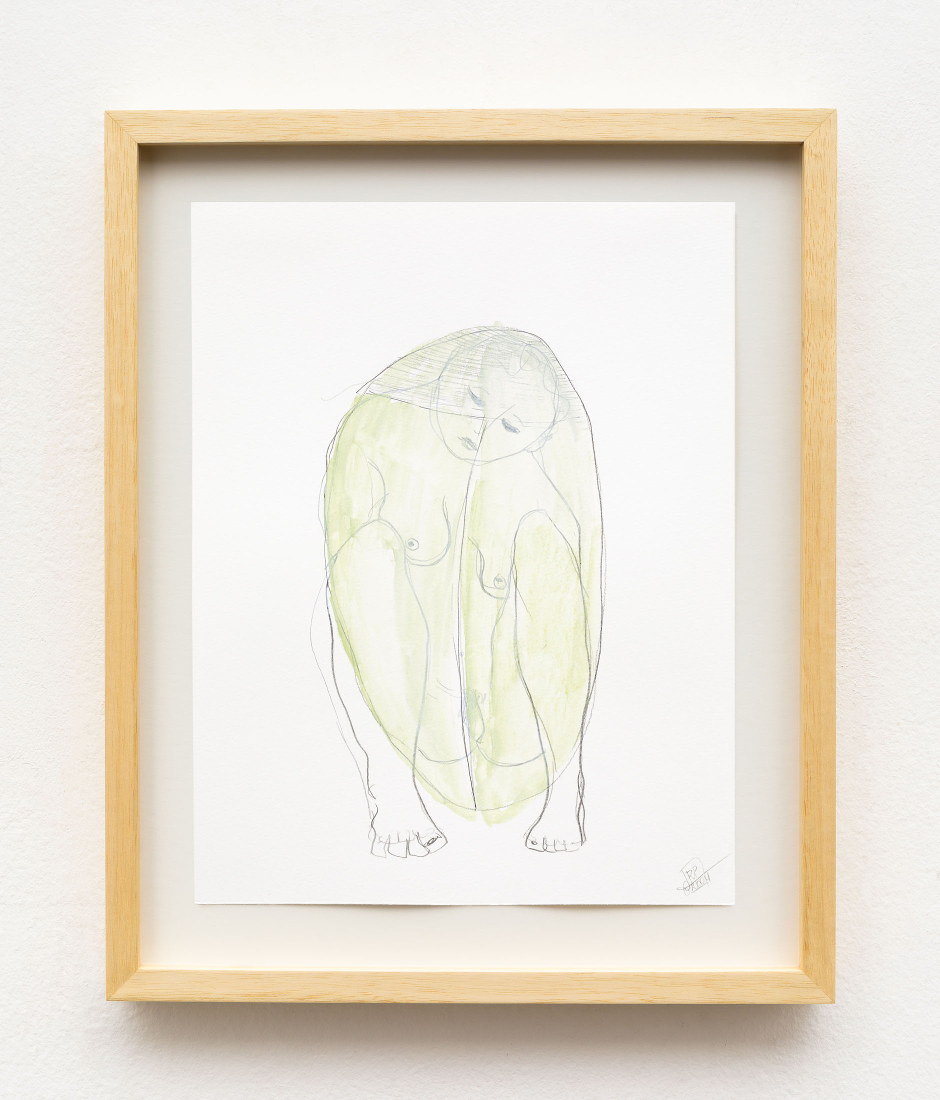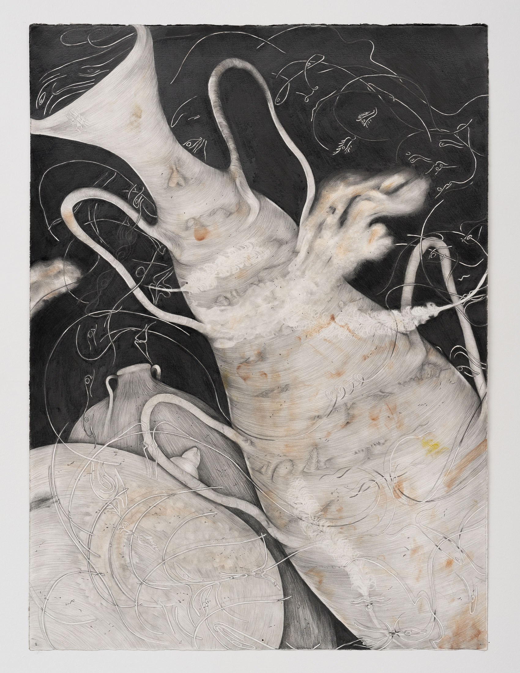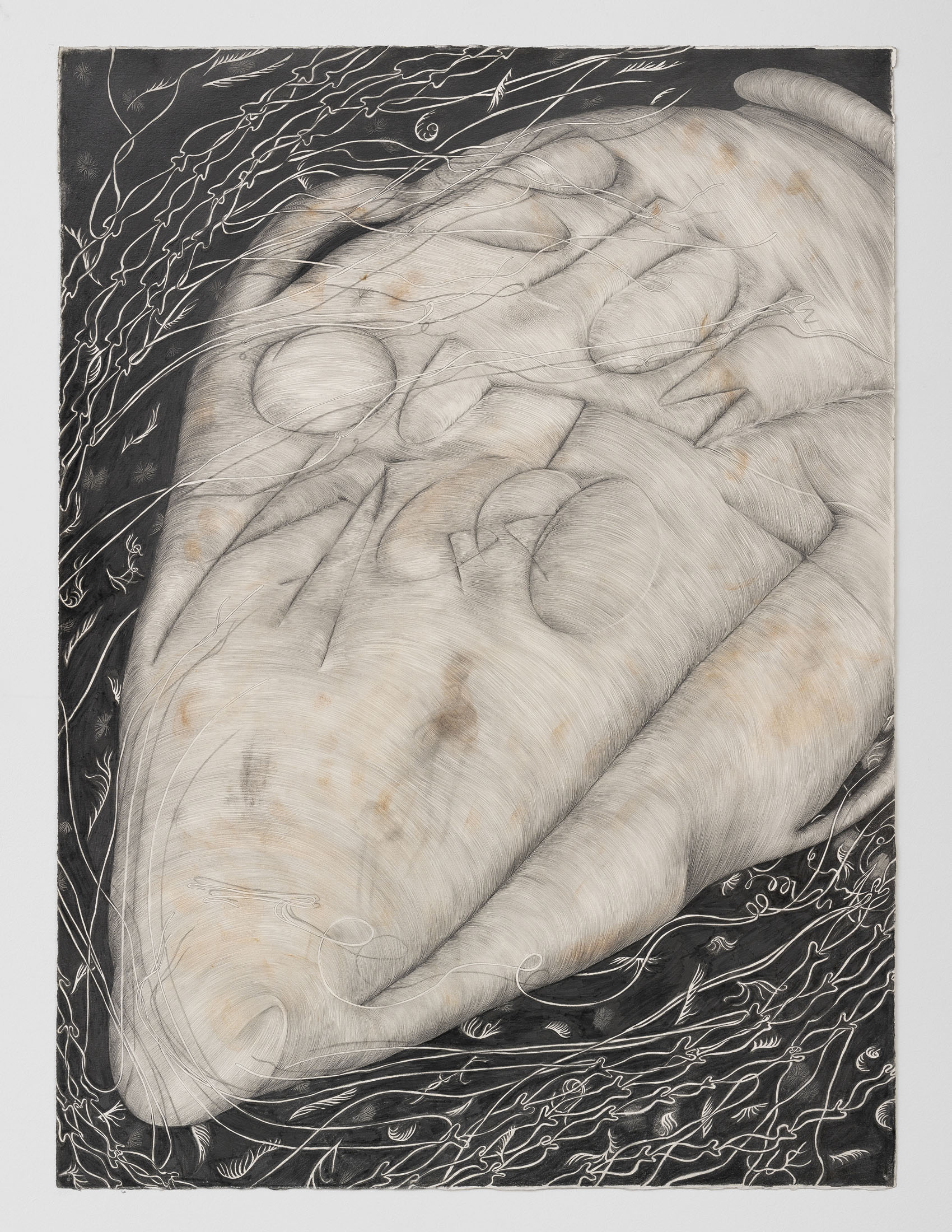 Laís Amaral’s precise visual language rolled out of the conversations on race, gender, and social matters she had within the Trovoa collective, a group known for hands-on artistic practices, experimenting with various mediums and discussing their experiences as racialized women in Brazilian society. She scratches and (hair)brushes dark paint on linen. Castiel Vitorino Brasileiro’s elaborate practice proposes or evokes new territories, this time through a painting, sometimes through other psychic-spiritual activities. And Rosana Paulino’s critical research and investigations of social constructs led to the Carapace of Protection series in this exhibition. Her sketches depict female bodies more or less enveloped in a protective cocoon – a chrysalis of a woman – hoping she will not endure the injustices inherited from the past.