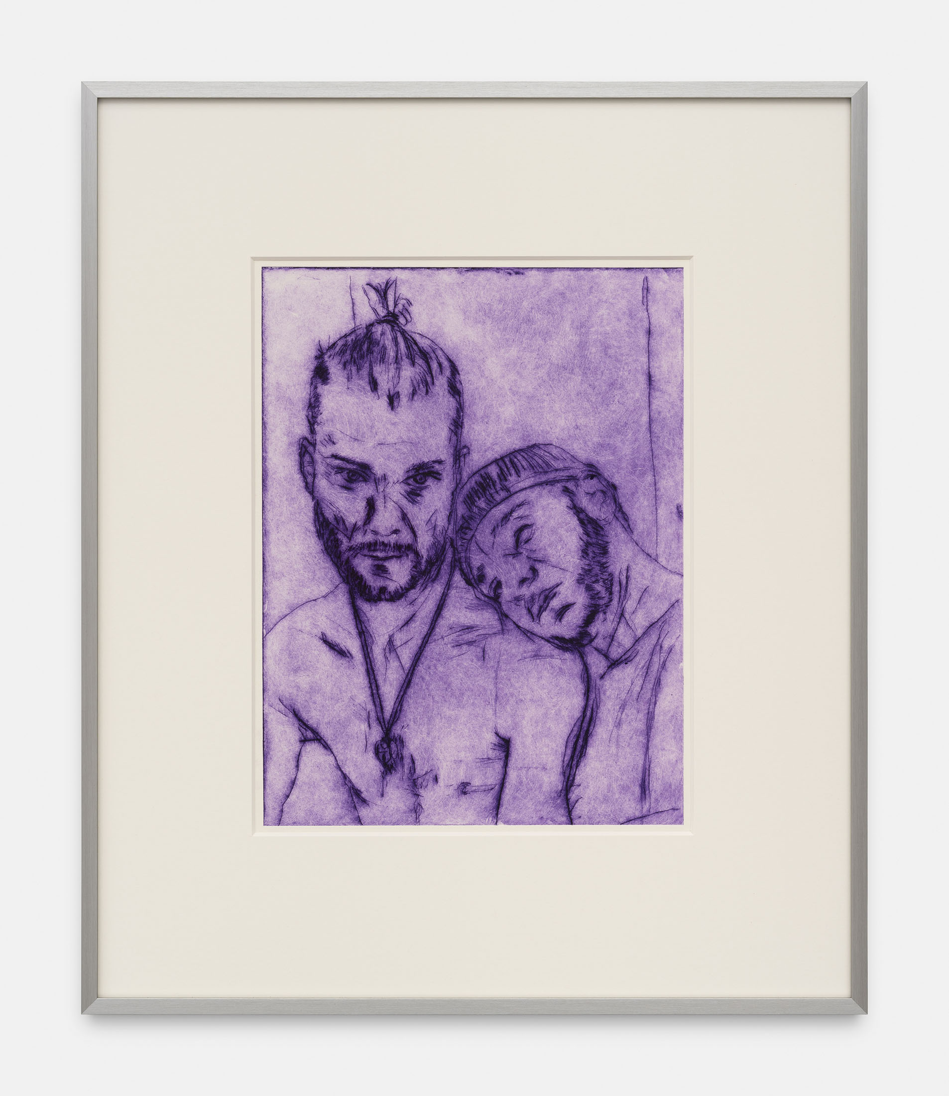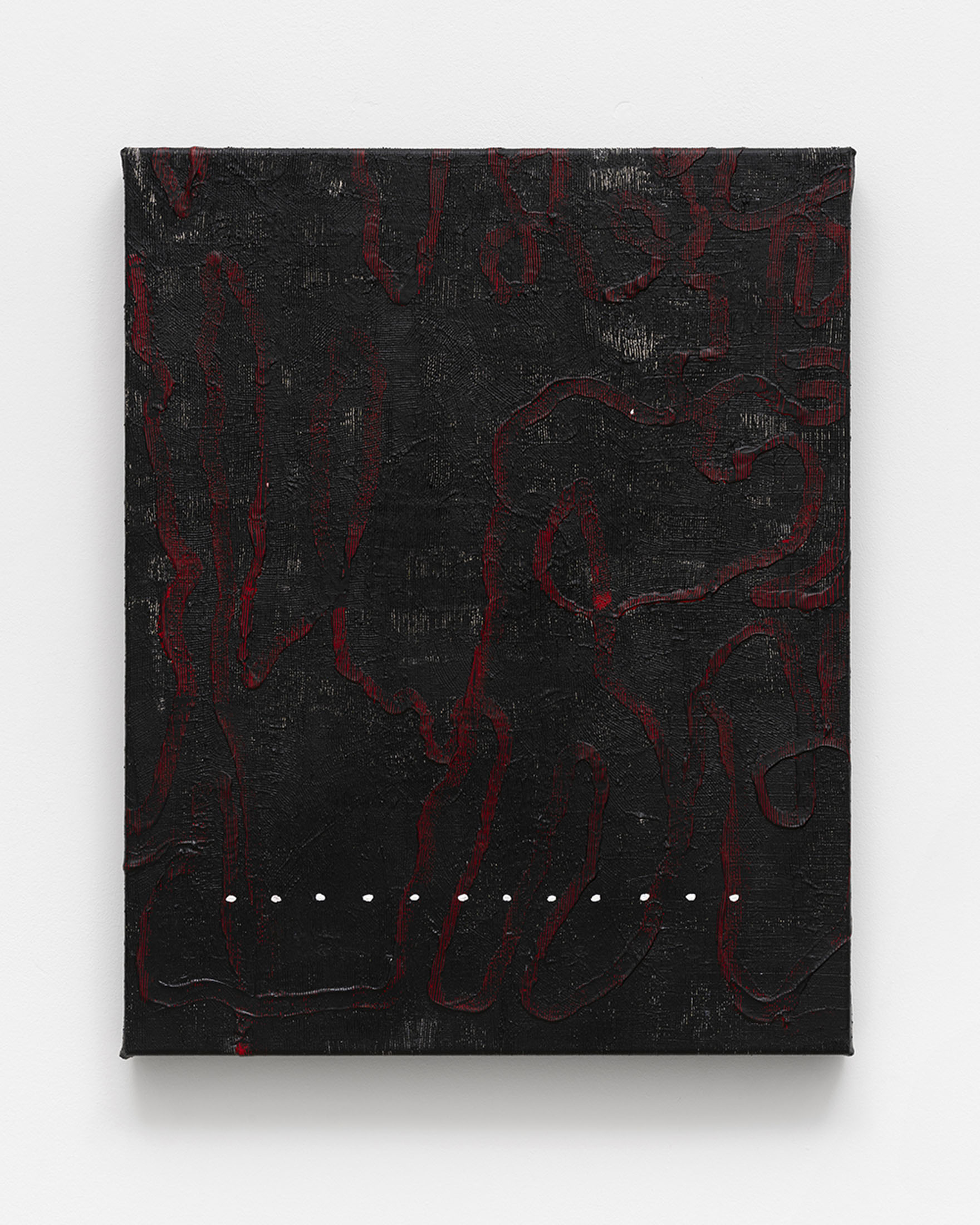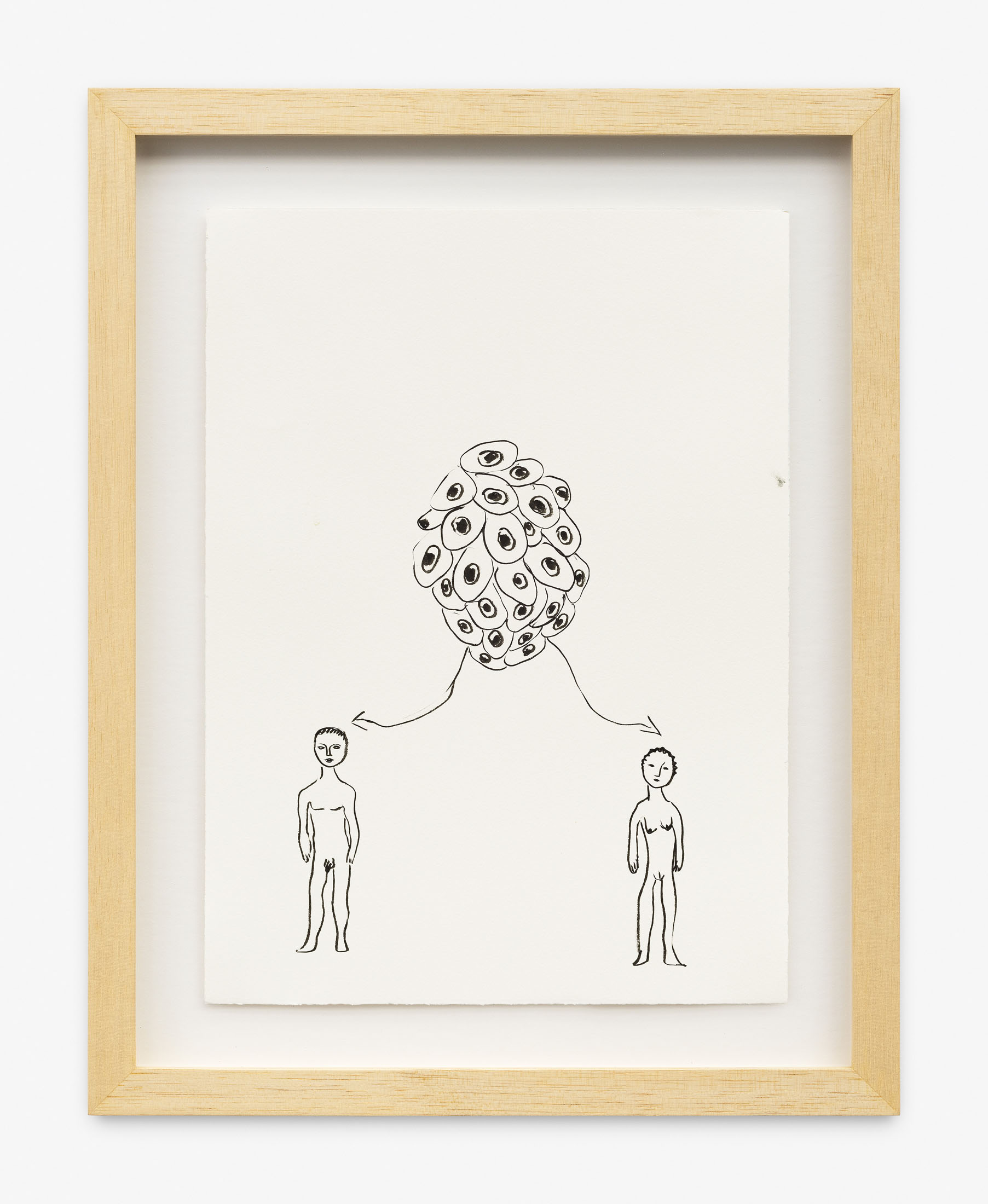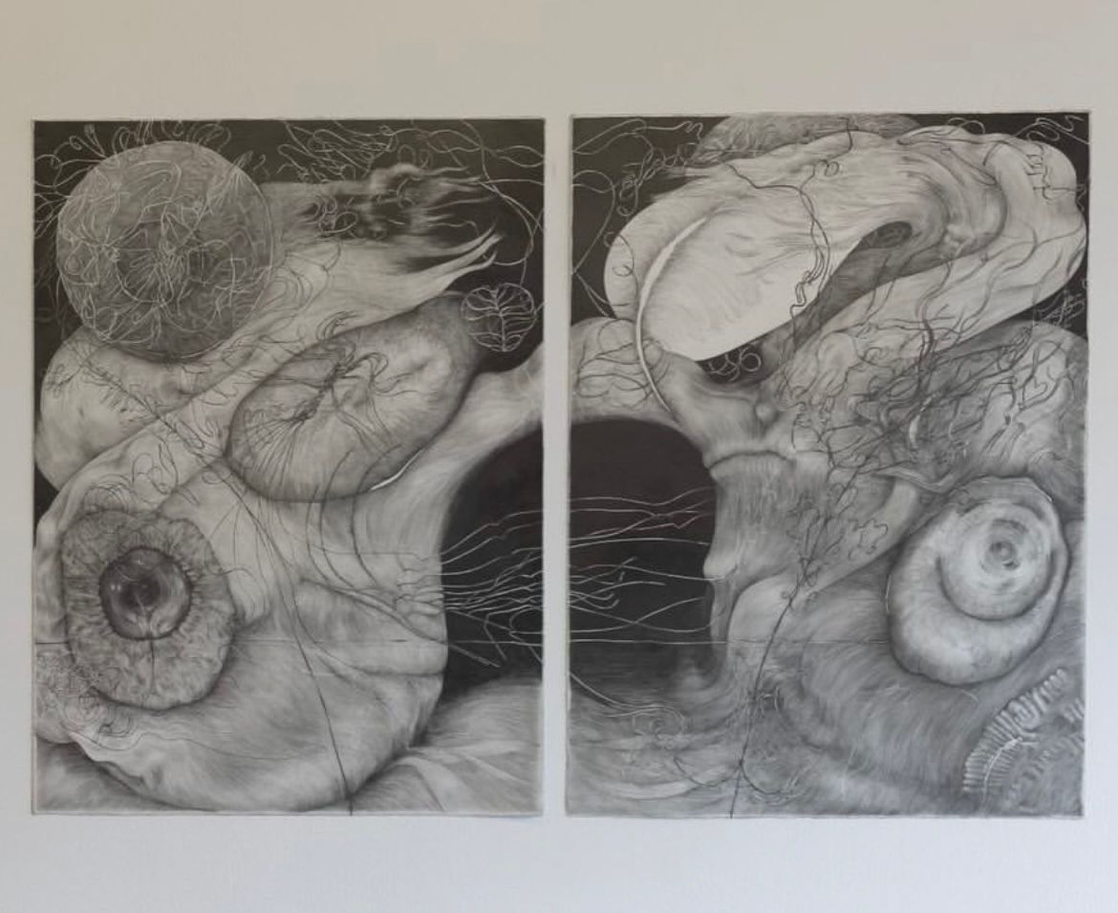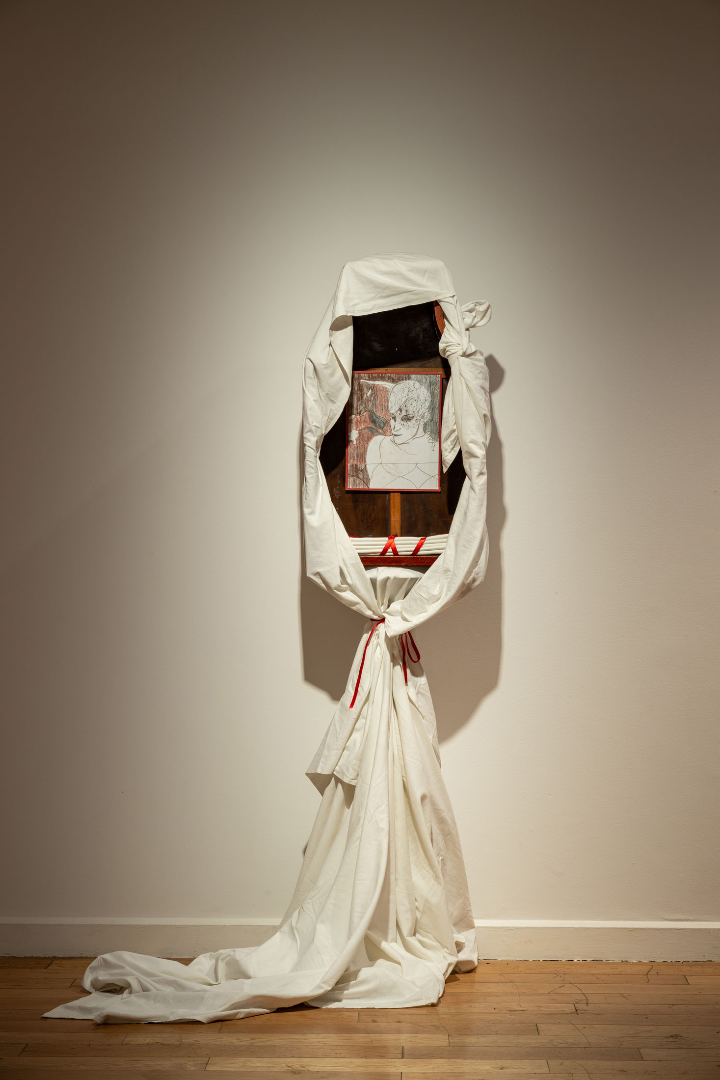 Laís Amaral’s precise visual language rolled out of the conversations on race, gender, and social matters she had within the Trovoa collective, a group known for hands-on artistic practices, experimenting with various mediums and discussing their experiences as racialized women in Brazilian society. She scratches and (hair)brushes dark paint on linen. Castiel Vitorino Brasileiro’s elaborate practice proposes or evokes new territories, this time through a painting, sometimes through other psychic-spiritual activities. And Rosana Paulino’s critical research and investigations of social constructs led to the Carapace of Protection series in this exhibition. Her sketches depict female bodies more or less enveloped in a protective cocoon – a chrysalis of a woman – hoping she will not endure the injustices inherited from the past.