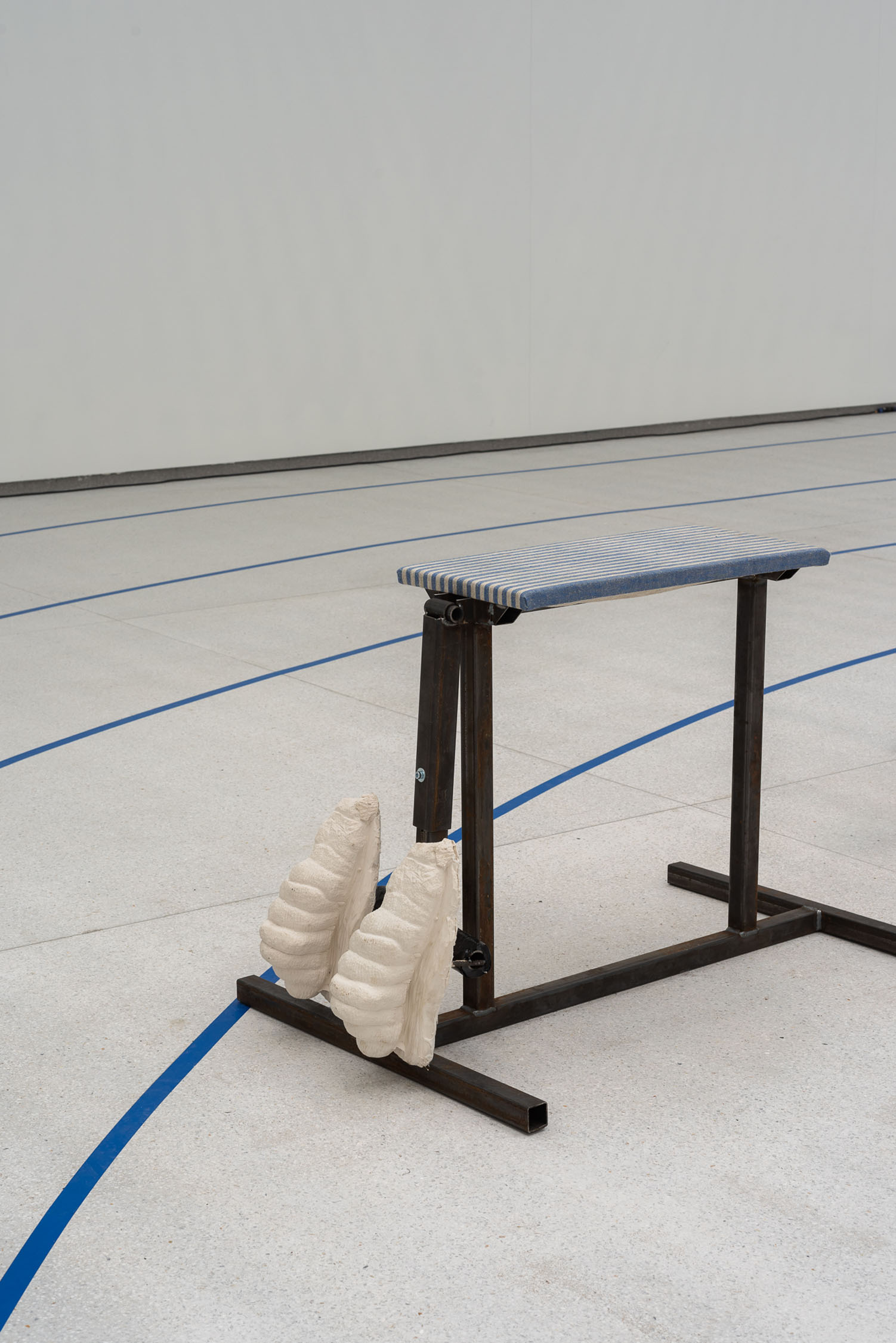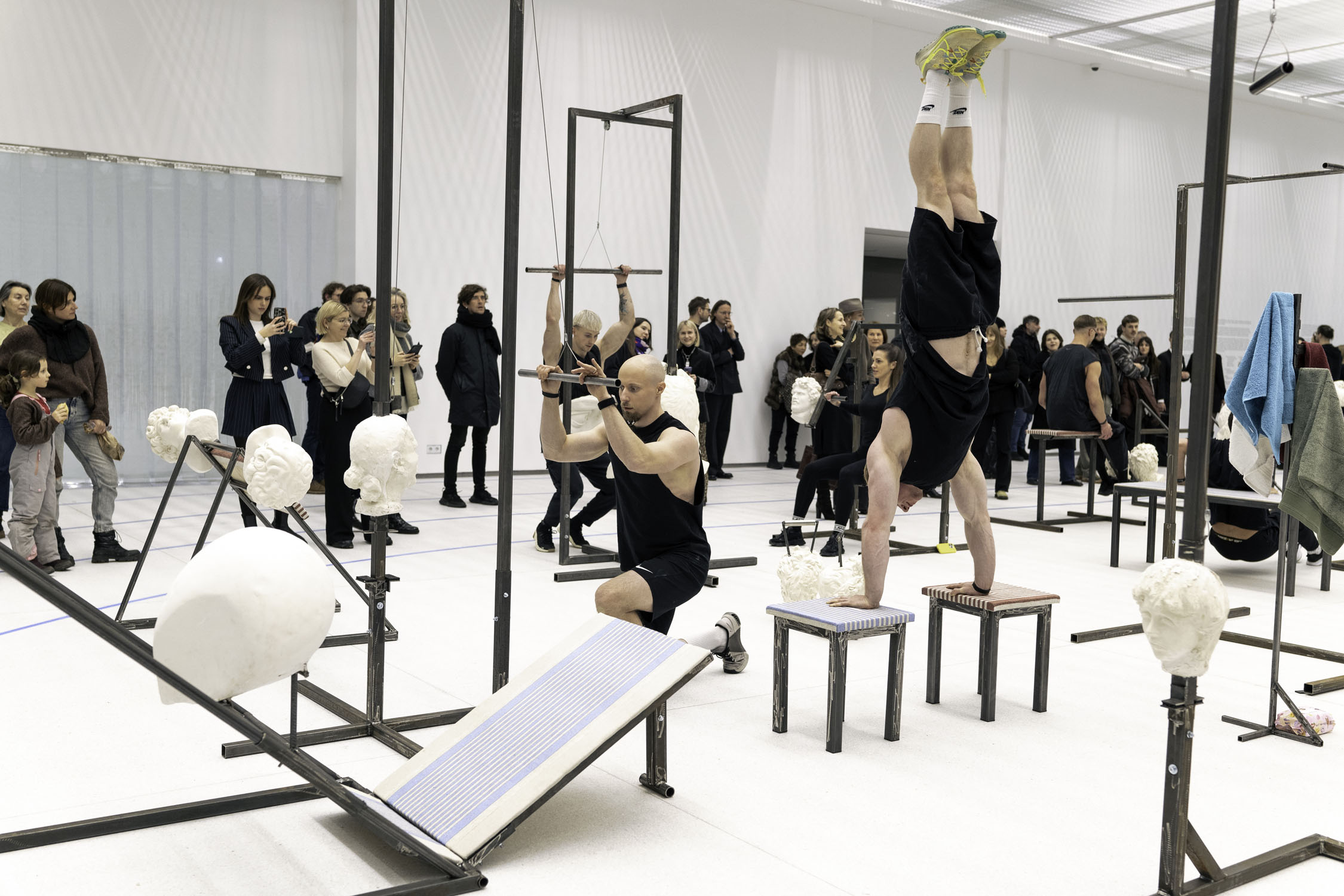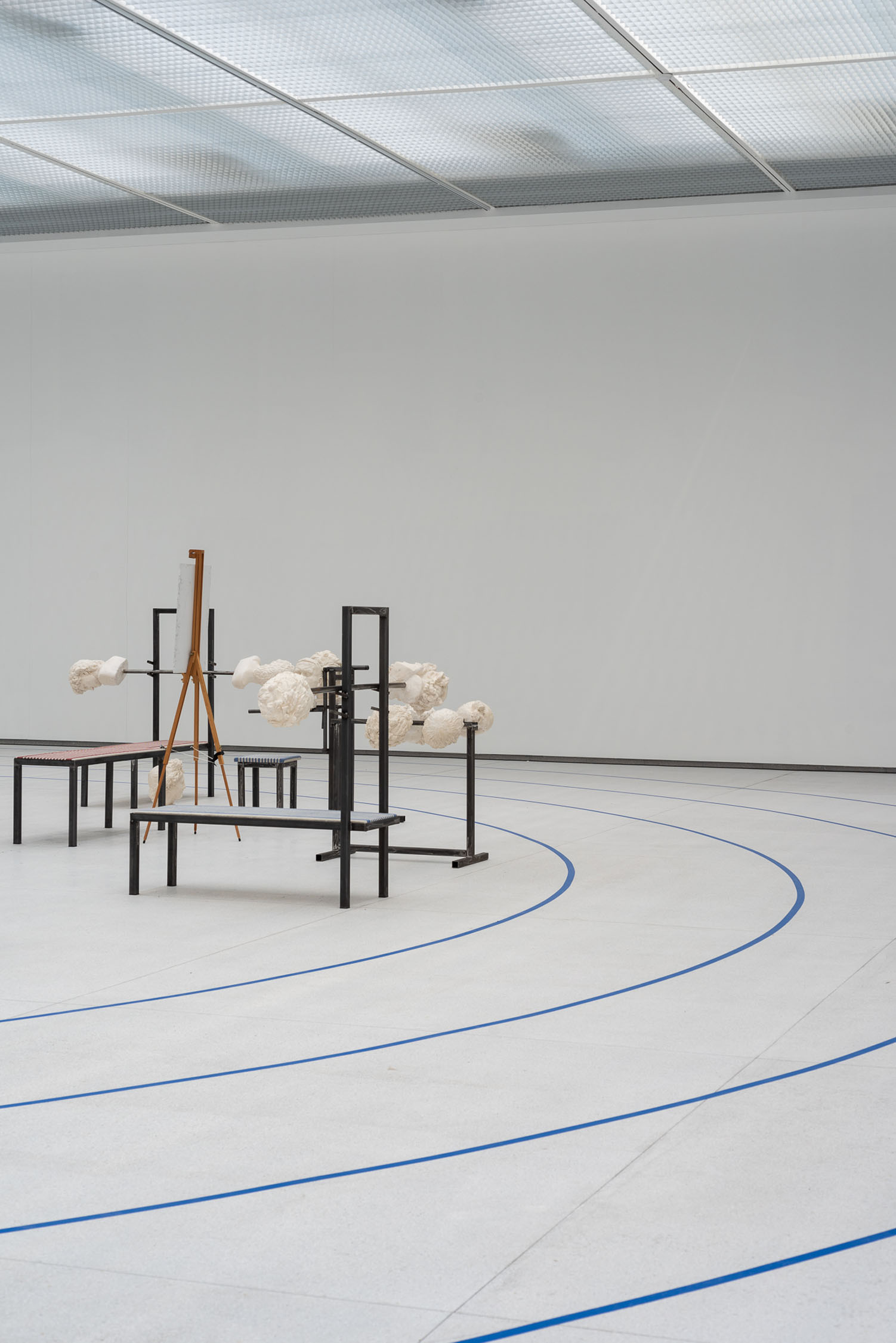 The first iteration of Physical Culture was created in 2012 while Serapinas was a third-year student at the Vilnius Academy of Arts’ Sculpture Department. Since then, various versions of the installation have been exhibited at major international contemporary art platforms, including Unlimited at Art Basel in Switzerland (2023), 1857 project space in Oslo (2017), Bâtard performance art festival in Brussels (2016), and Frieze art fair in London (2016). The CAC now presents the most expansive edition of this work, covering 1,000 square metres and featuring fully operational fitness machines where replicas of plaster sculptures replace conventional weights.