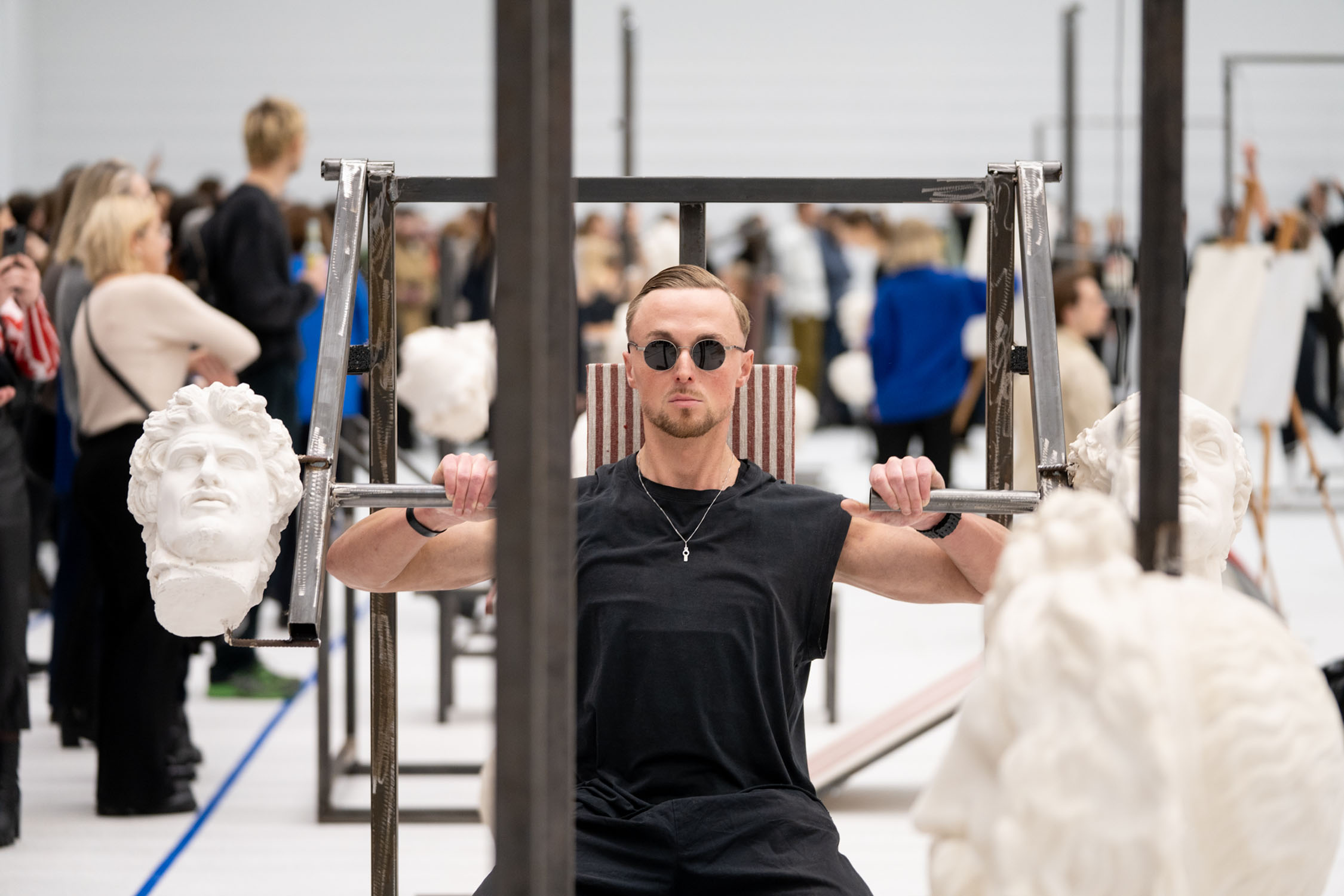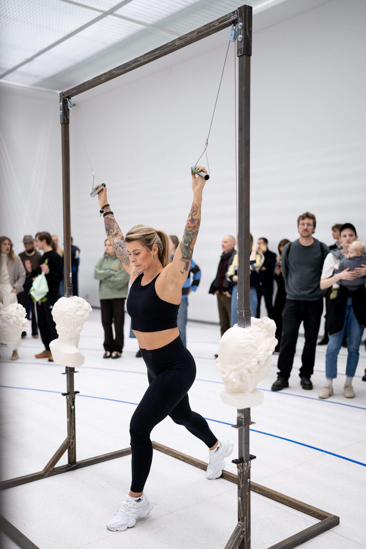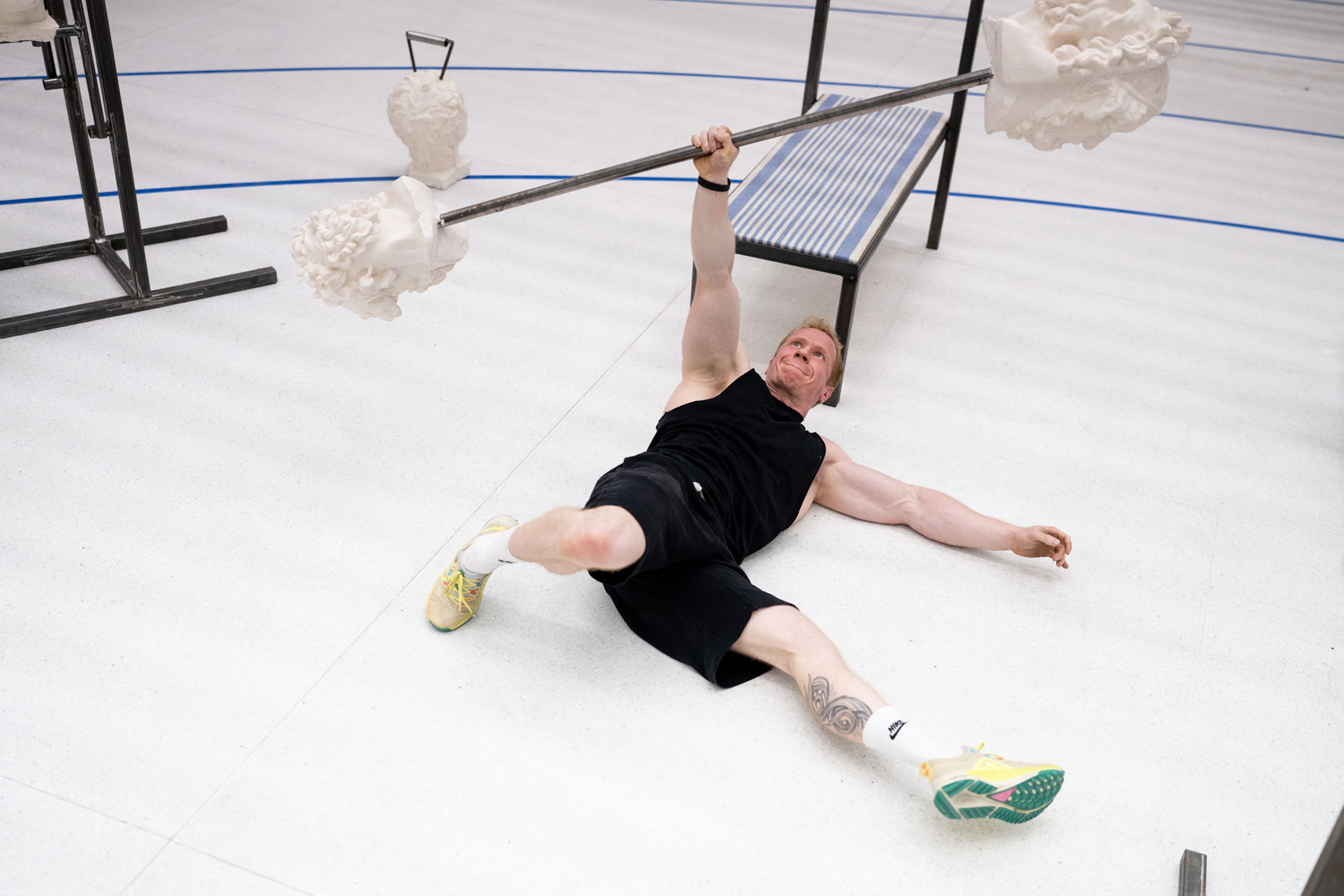 The first iteration of Physical Culture was created in 2012 while Serapinas was a third-year student at the Vilnius Academy of Arts’ Sculpture Department. Since then, various versions of the installation have been exhibited at major international contemporary art platforms, including Unlimited at Art Basel in Switzerland (2023), 1857 project space in Oslo (2017), Bâtard performance art festival in Brussels (2016), and Frieze art fair in London (2016). The CAC now presents the most expansive edition of this work, covering 1,000 square metres and featuring fully operational fitness machines where replicas of plaster sculptures replace conventional weights.