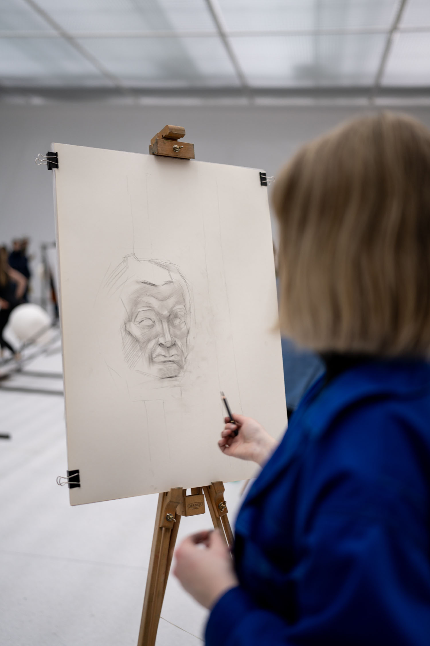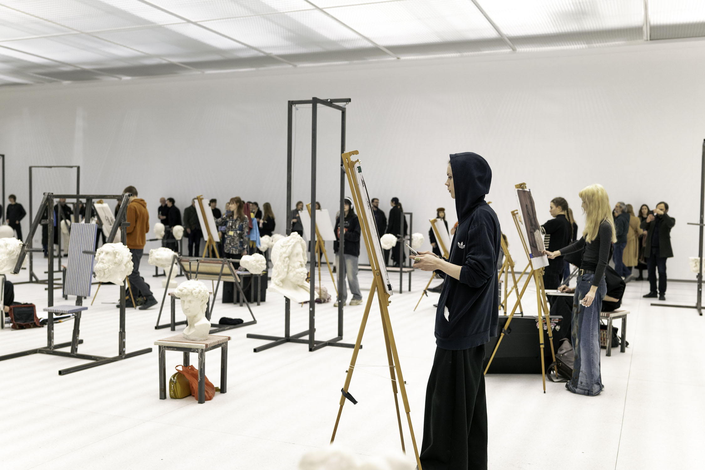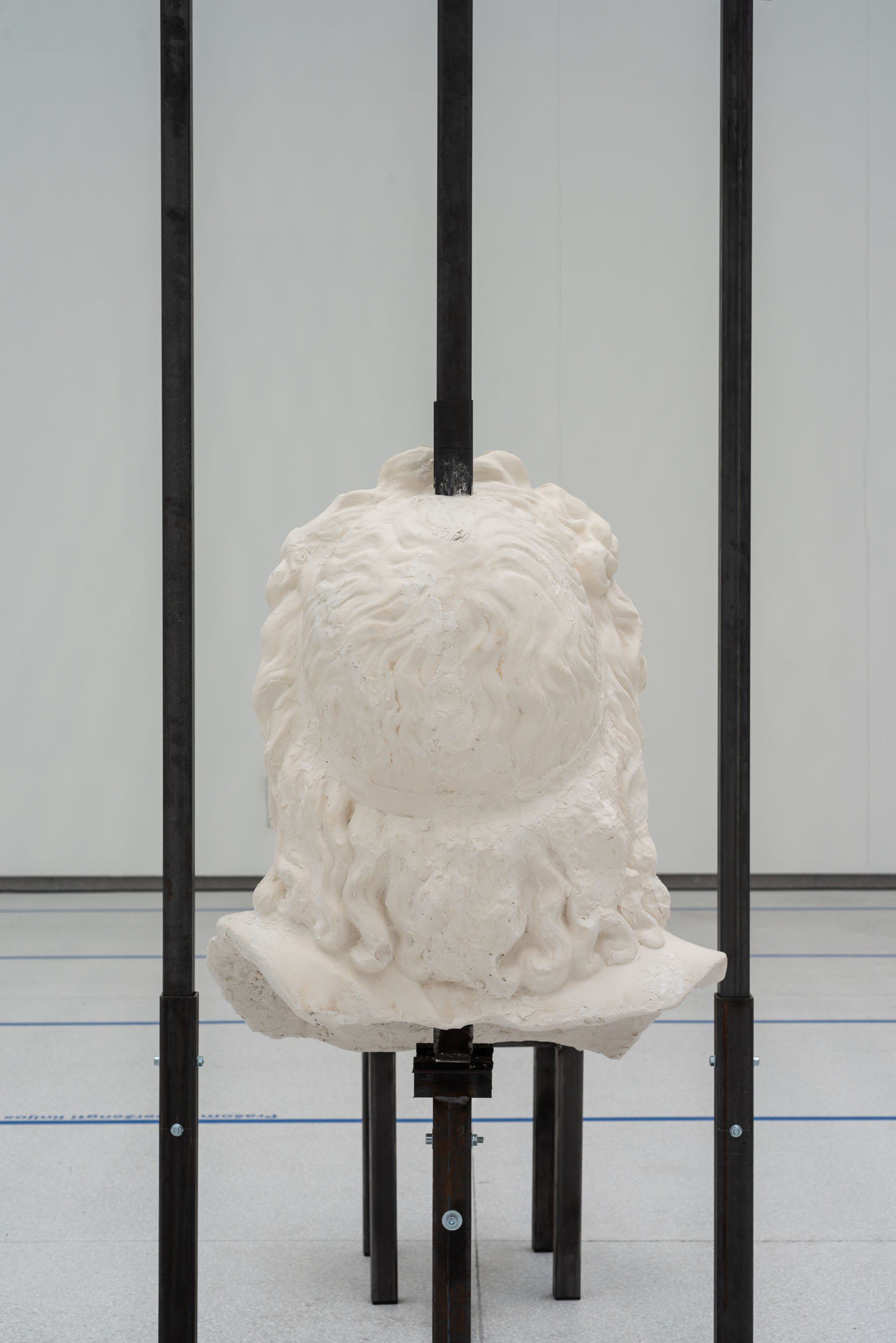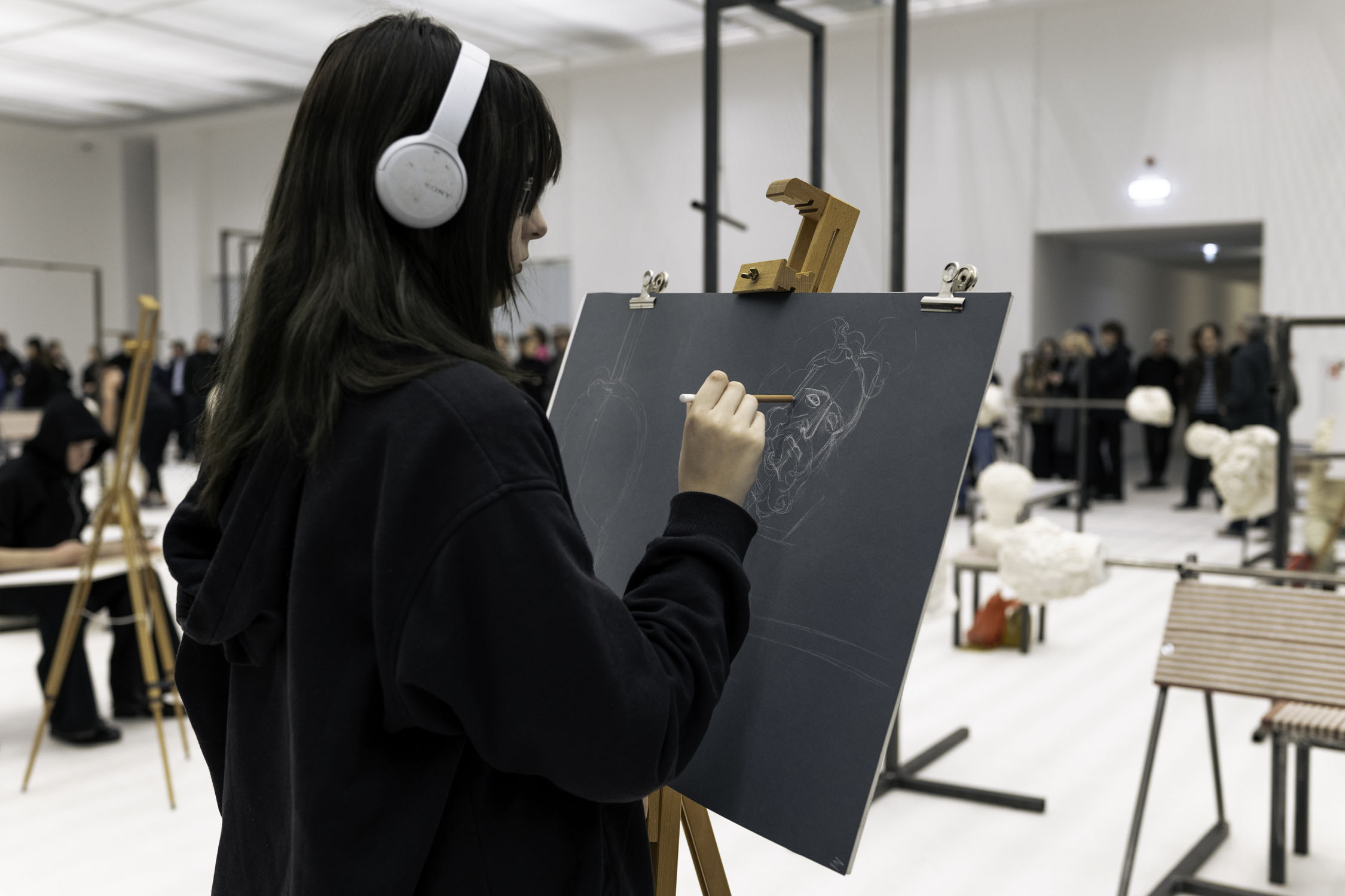 The installation is inspired by Serapinas’ experience as a student at the National M. K. Čiurlionis School of Art in Vilnius, where art education follows a classical methodology emphasising life drawing and the mastery of painting and sculpture techniques. Revisiting the school’s archives, Serapinas reconstructs copies of his own student work, such as portraits of his classmates, an earthworm, and an alien, as well as plaster models once used for drawing classes. The exhibition includes replicas of well-known sculptures, such as Michelangelo’s David (16th century) and Apollo Belvedere (2nd century), long considered exemplars of Classical Antiquity.