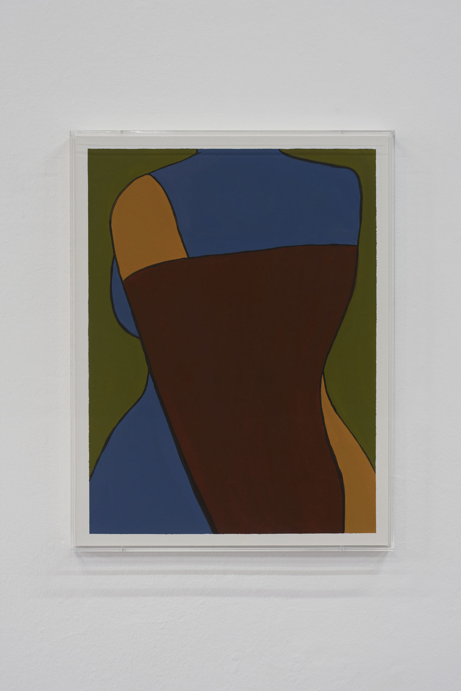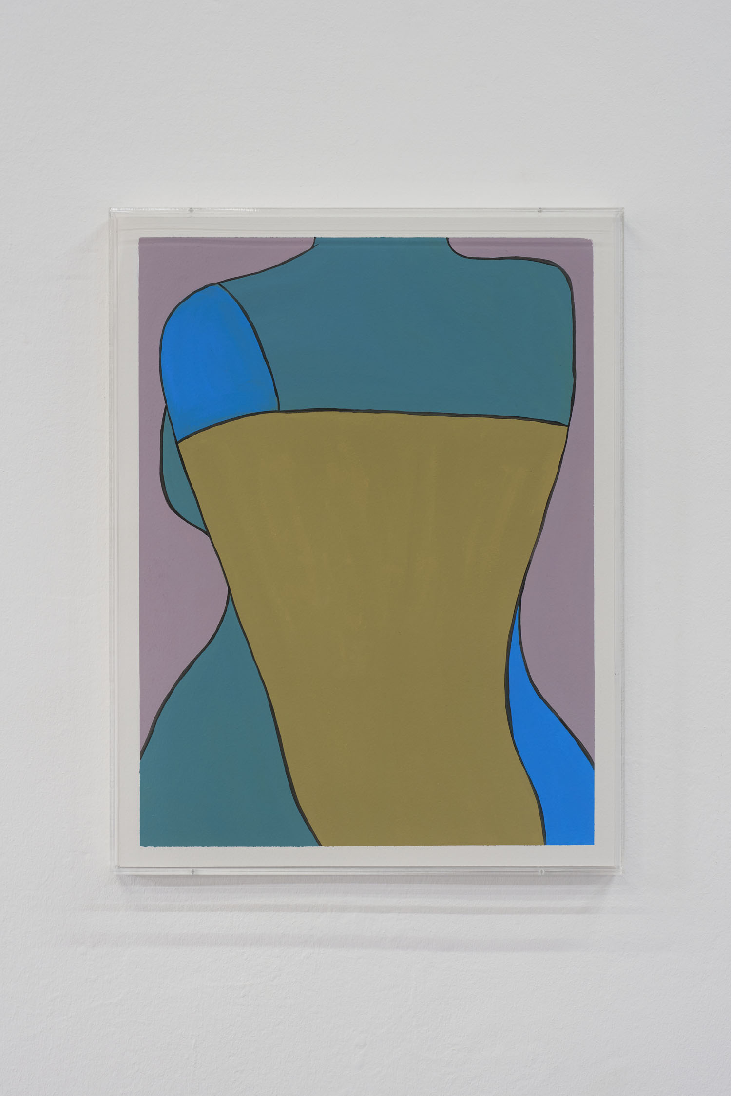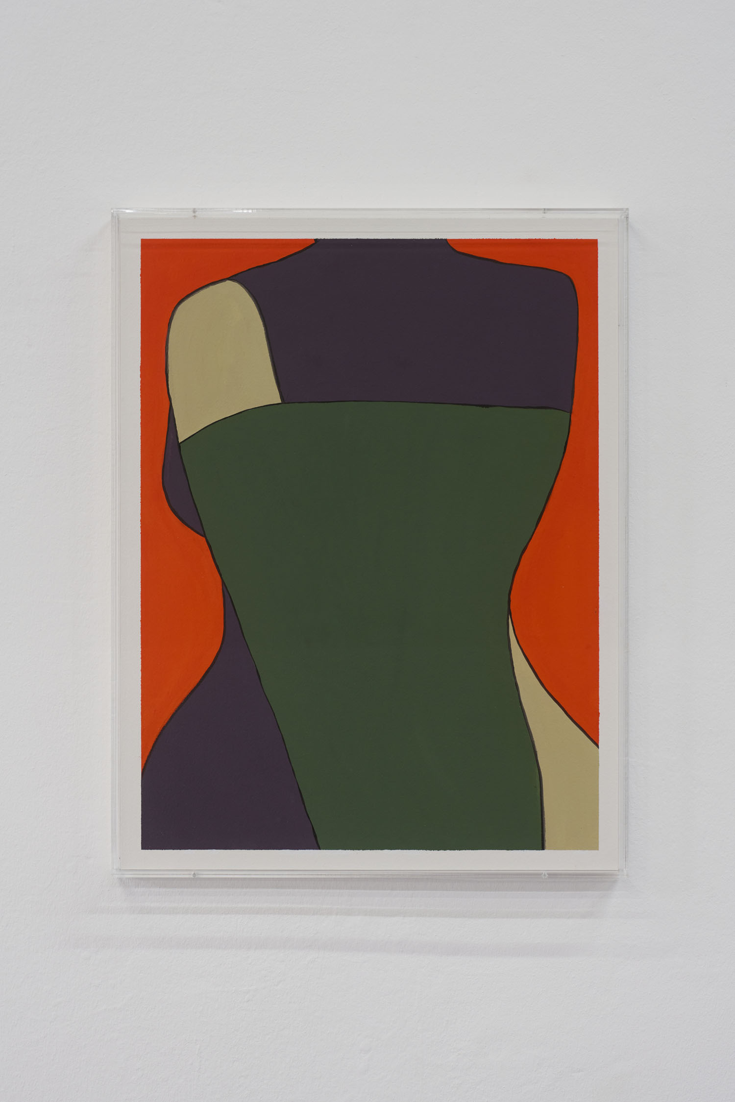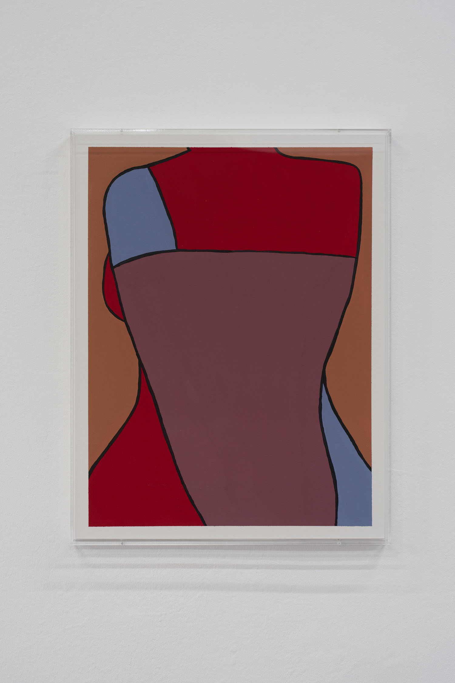 Her exhibition is made up of two ensembles. Outside the curtain, the motif of a bust is repeated across eighteen paintings on paper, with a series of different patterns cut. Reminiscent of preparatory work for a collection, the palette draws from a swatch of 110 colours developed by the artist for the work. Blocks of colour appear side by side in each painting, without any mixing taking place. The figure seen from the back both resists representation and offers itself to abstraction. The curves that form the body impose themselves on it to create a sovereign plane on which the aesthetic is constructed.