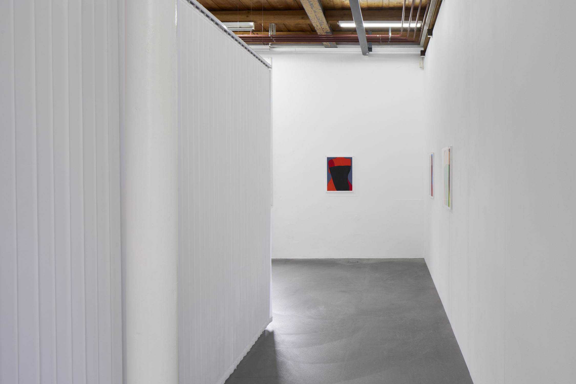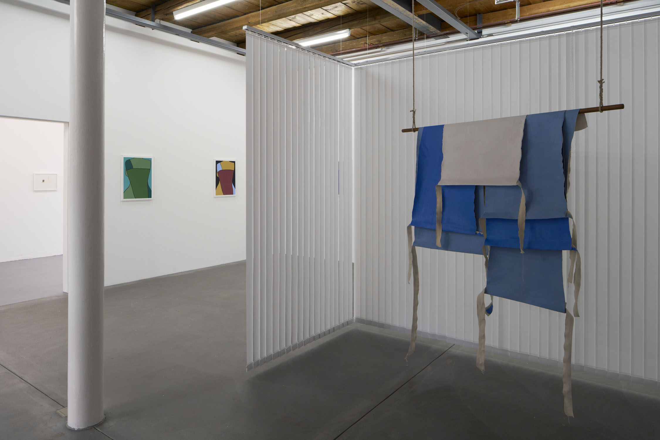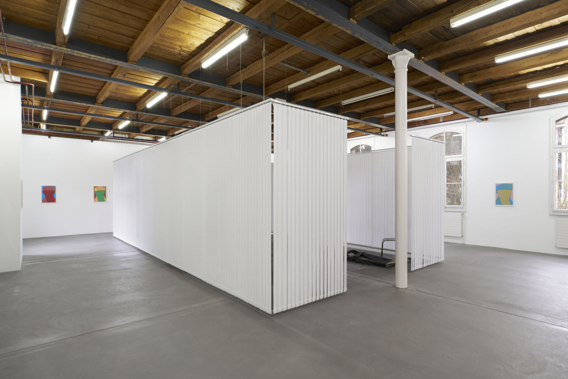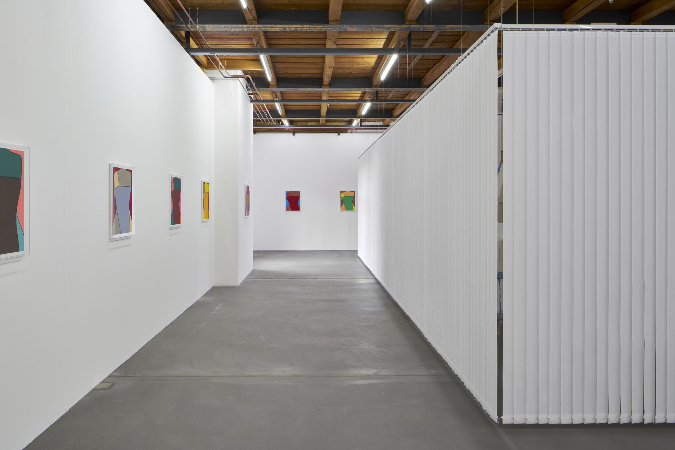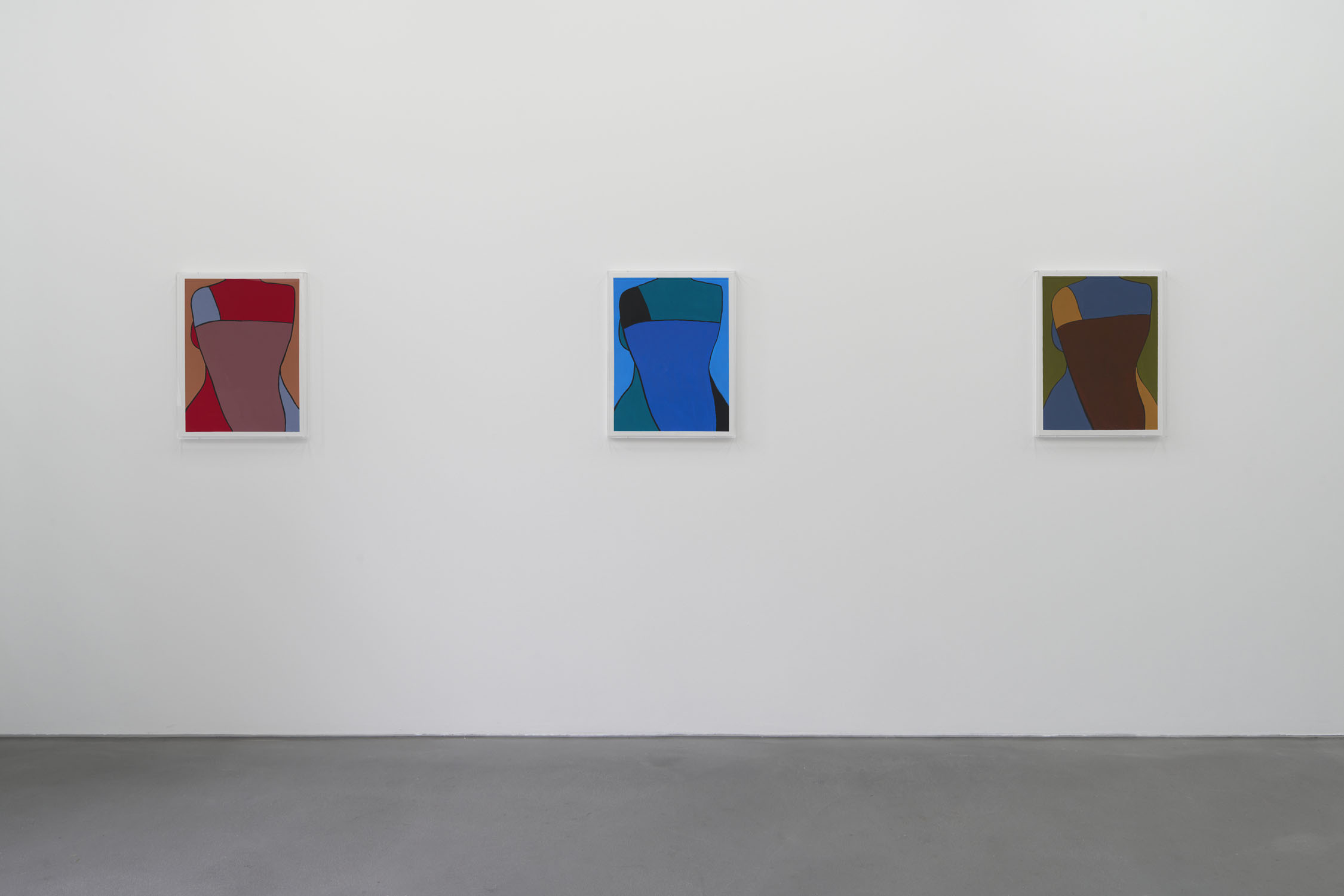 Her exhibition is made up of two ensembles. Outside the curtain, the motif of a bust is repeated across eighteen paintings on paper, with a series of different patterns cut. Reminiscent of preparatory work for a collection, the palette draws from a swatch of 110 colours developed by the artist for the work. Blocks of colour appear side by side in each painting, without any mixing taking place. The figure seen from the back both resists representation and offers itself to abstraction. The curves that form the body impose themselves on it to create a sovereign plane on which the aesthetic is constructed.