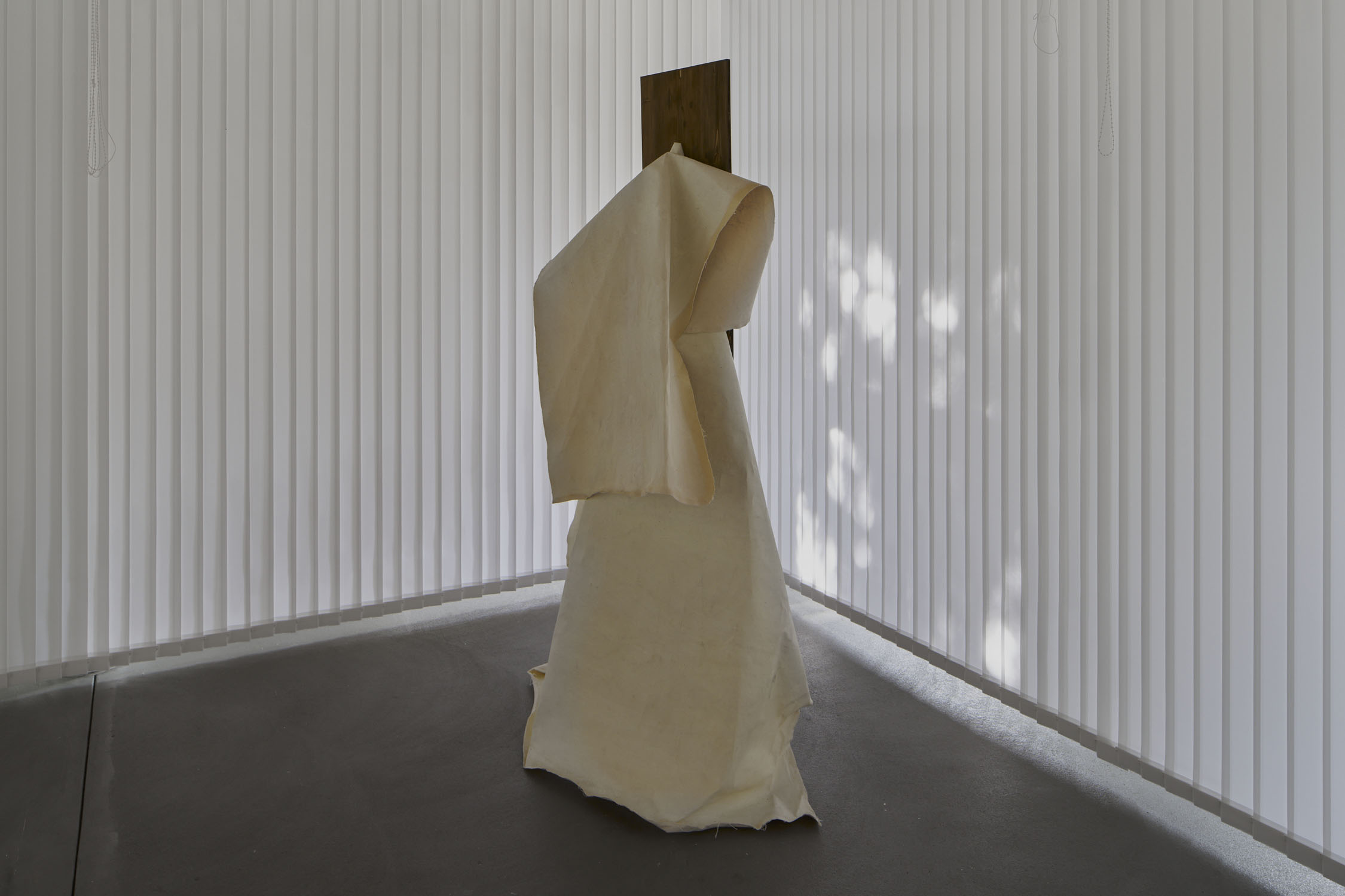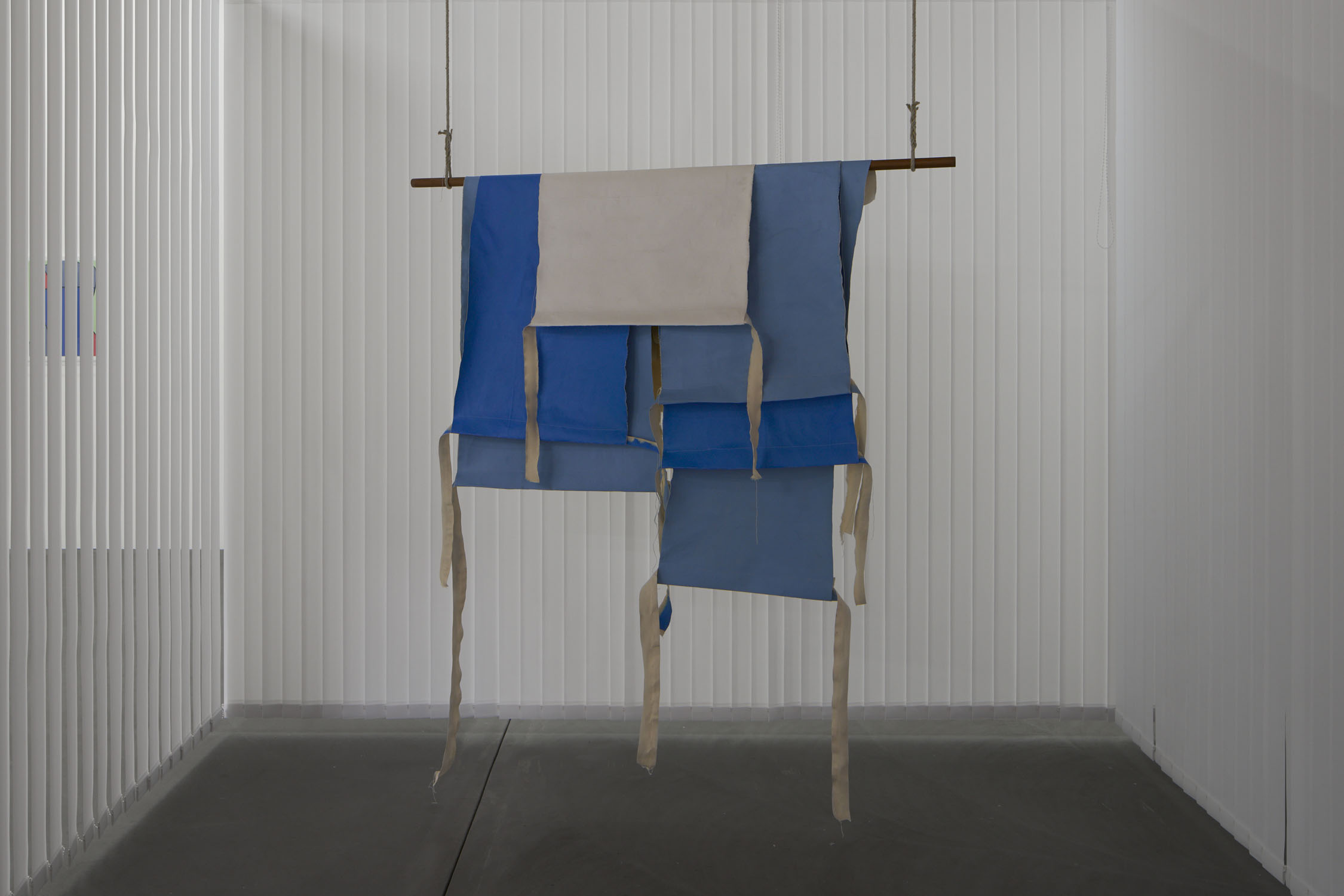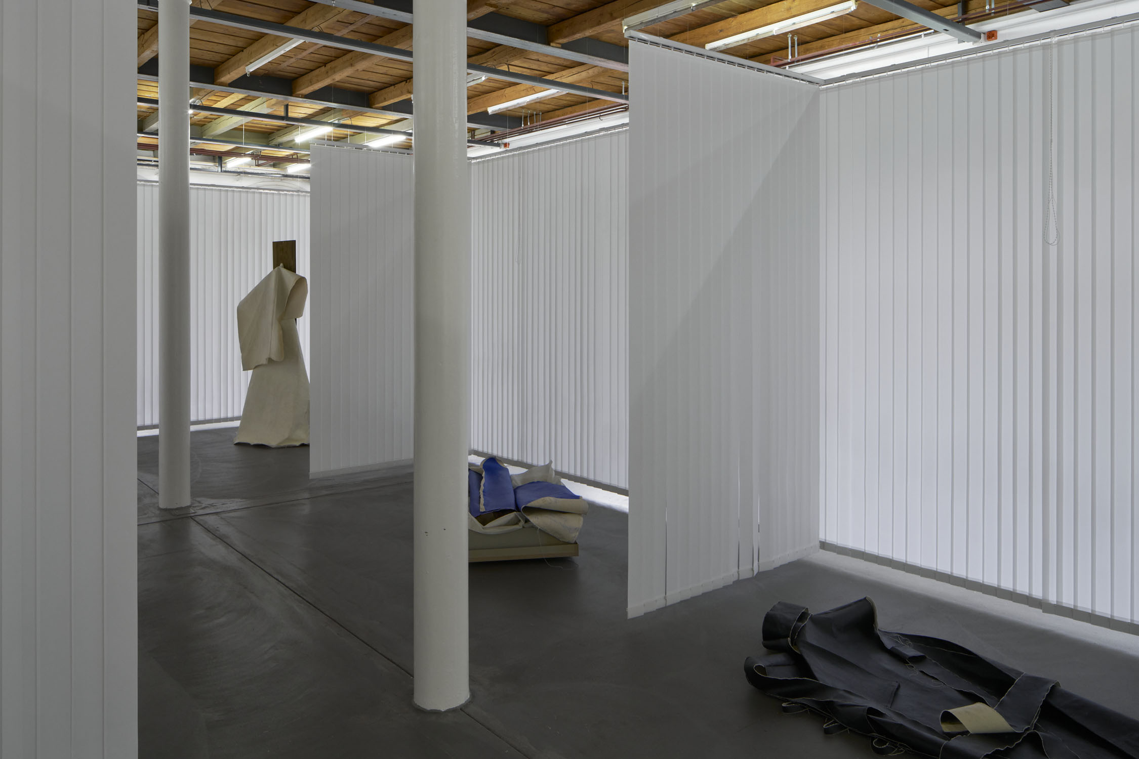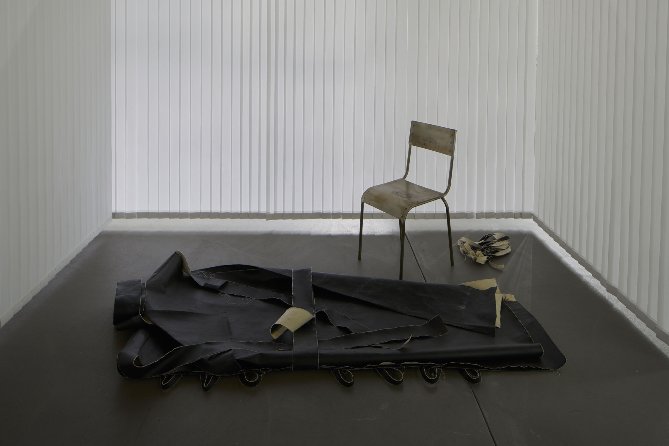 Inside a cage of curtains serving as a protective veil, clothing is used to reference typologies of people. The typologies are made of canvases freed from the surface of the painting. By reducing the textile pieces to their essence, the work forces the gaze to focus on the obvious. Clothes take on the weight of absent bodies, subjected to the authority of relationships of domination.