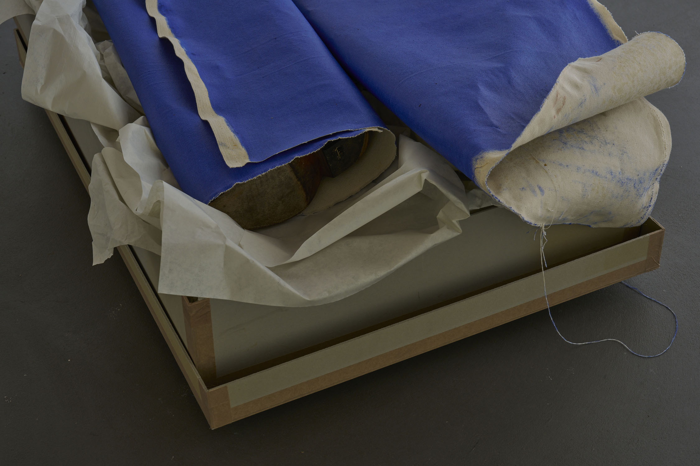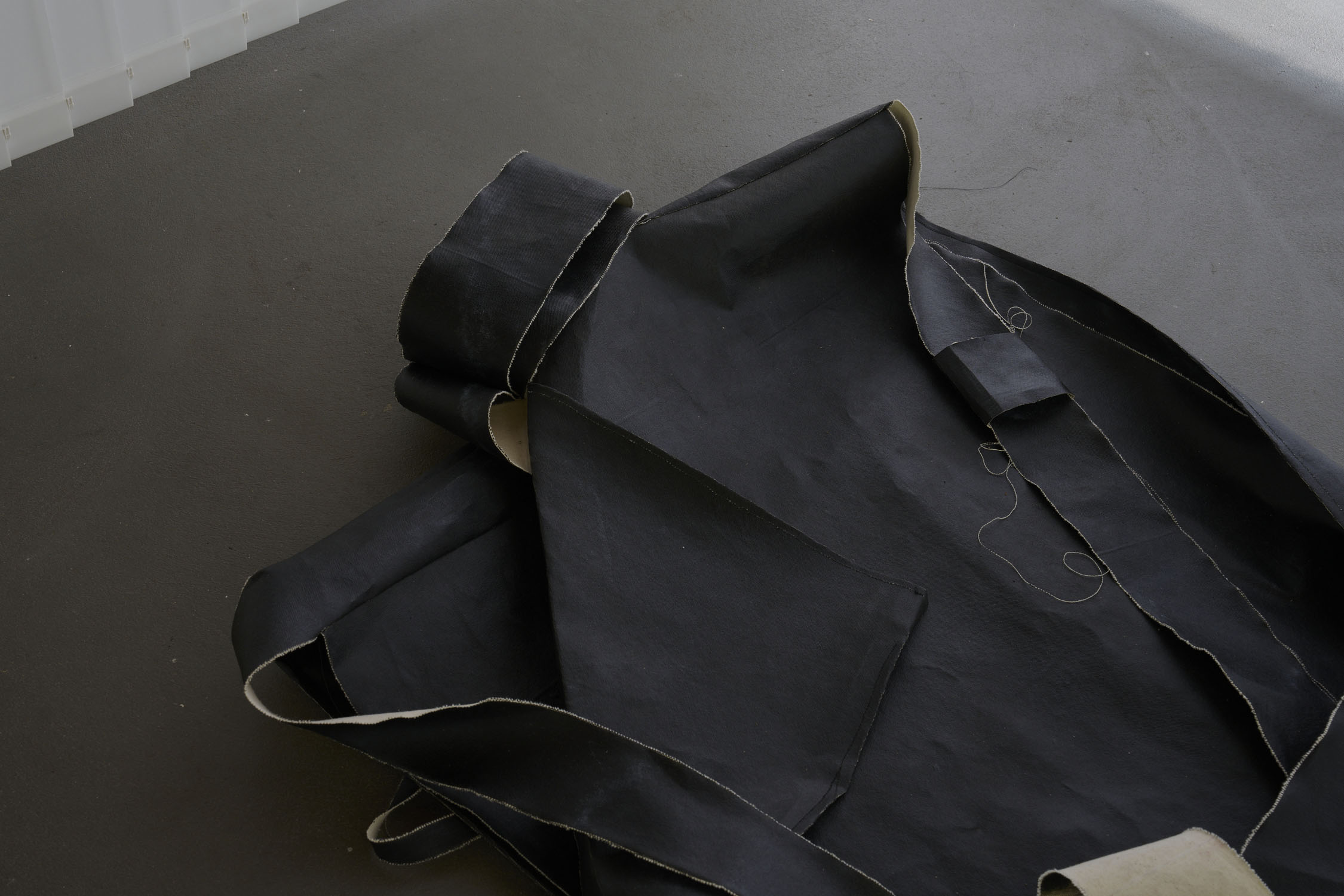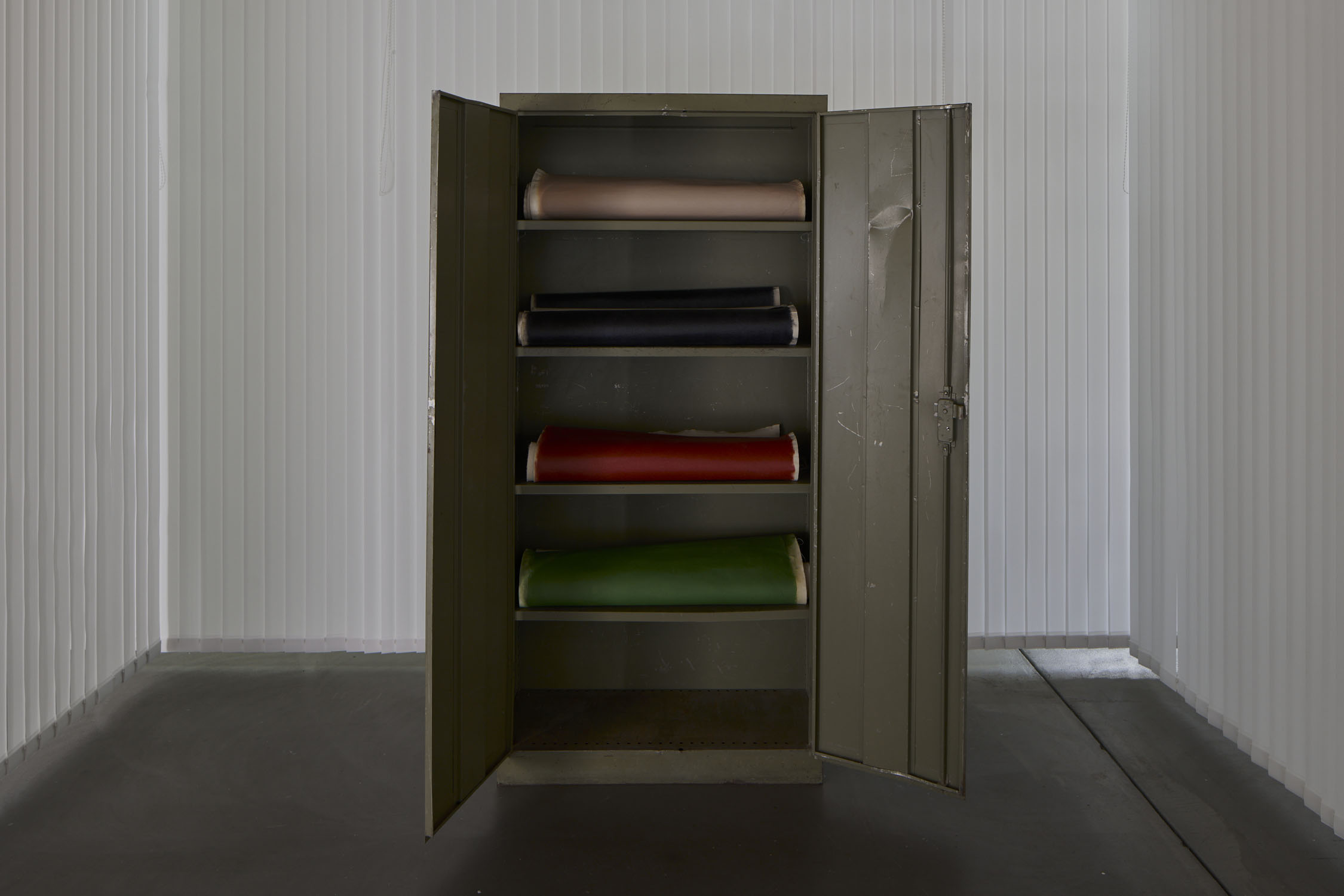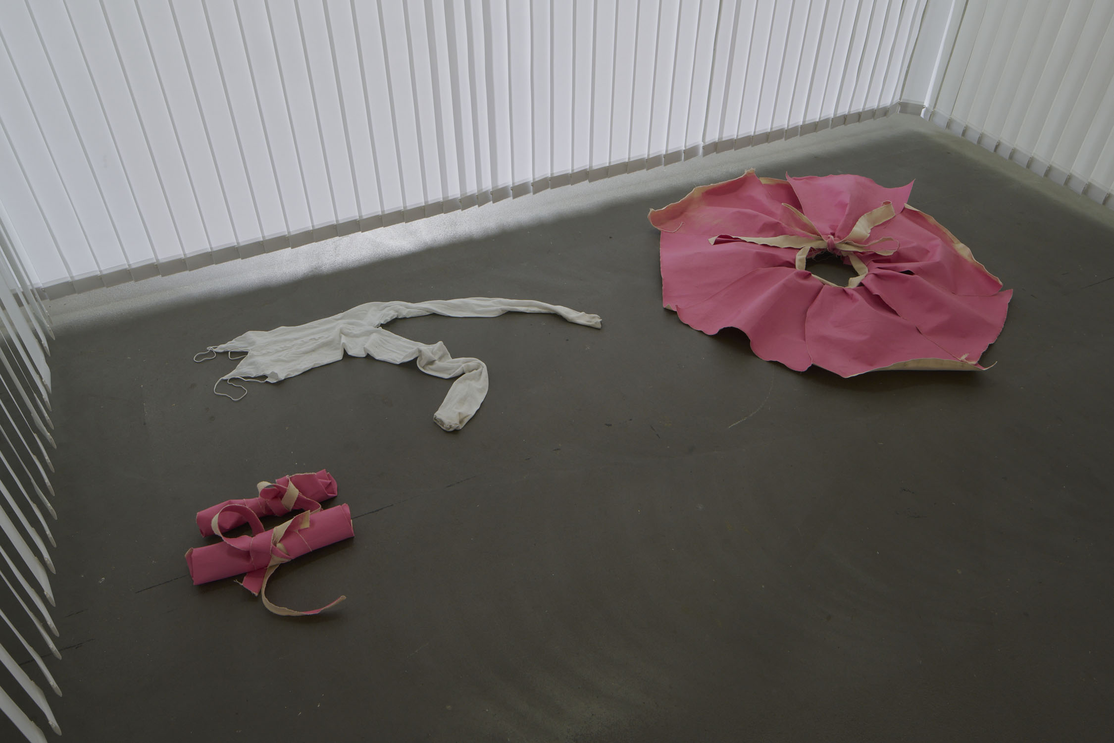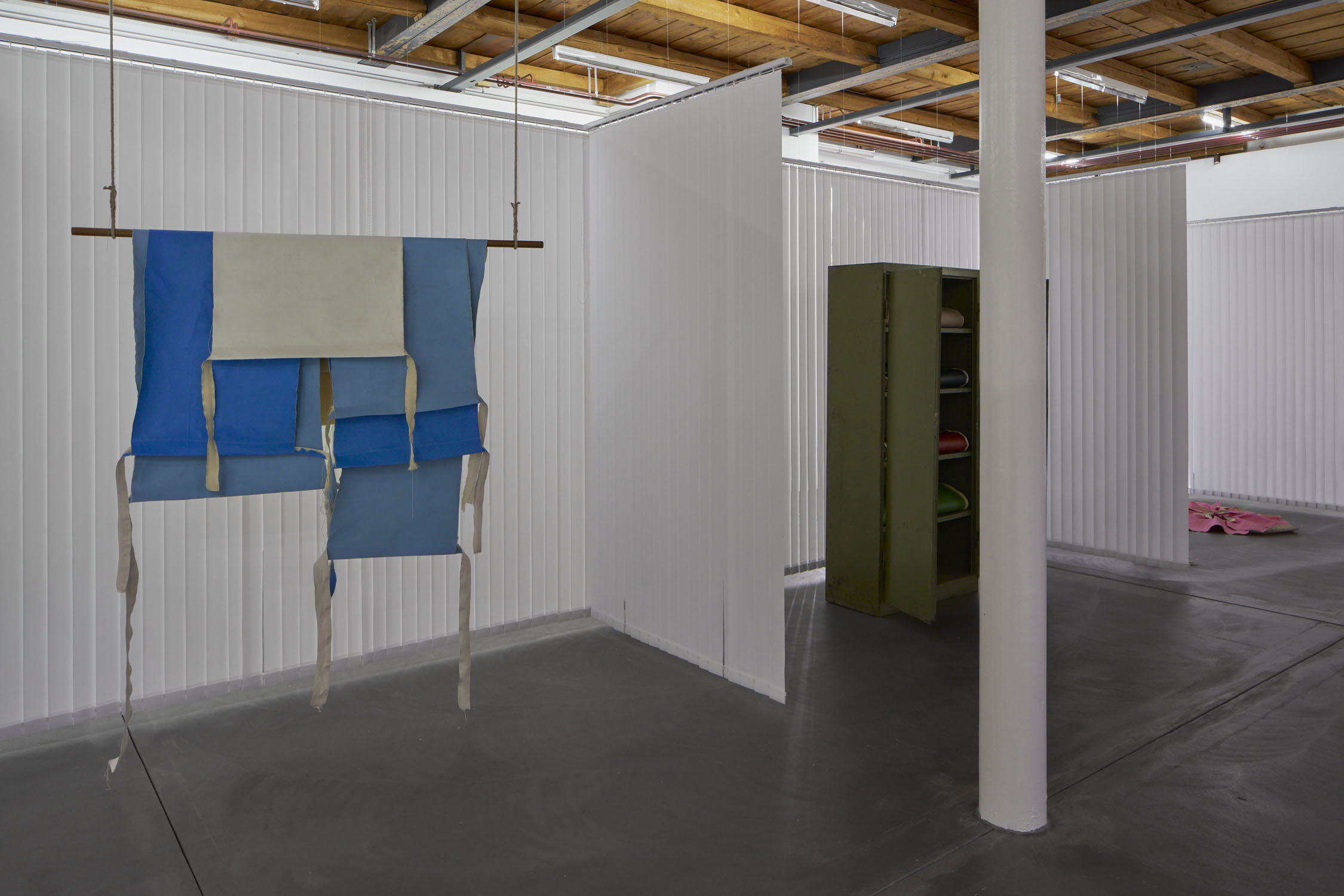 Inside a cage of curtains serving as a protective veil, clothing is used to reference typologies of people. The typologies are made of canvases freed from the surface of the painting. By reducing the textile pieces to their essence, the work forces the gaze to focus on the obvious. Clothes take on the weight of absent bodies, subjected to the authority of relationships of domination.