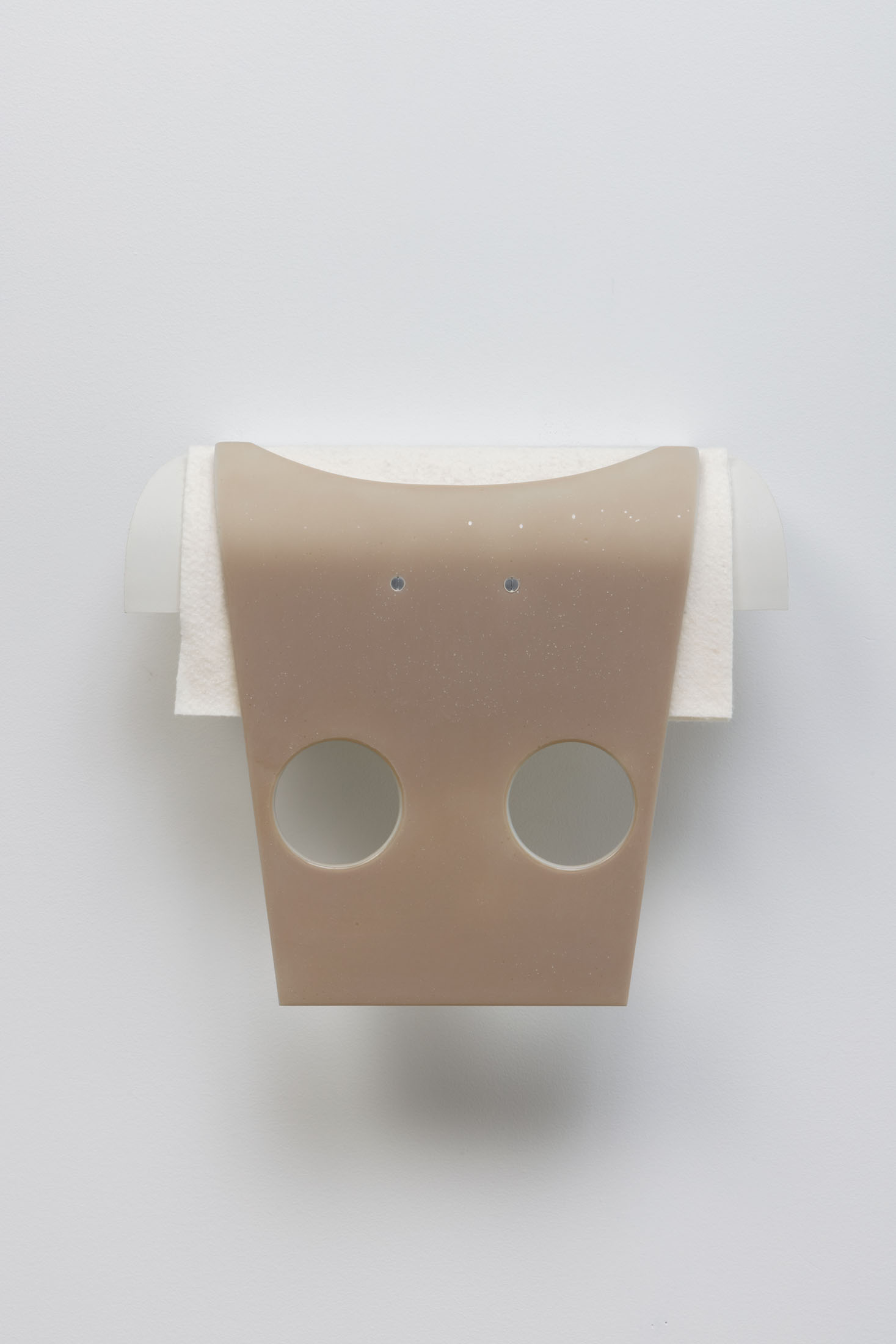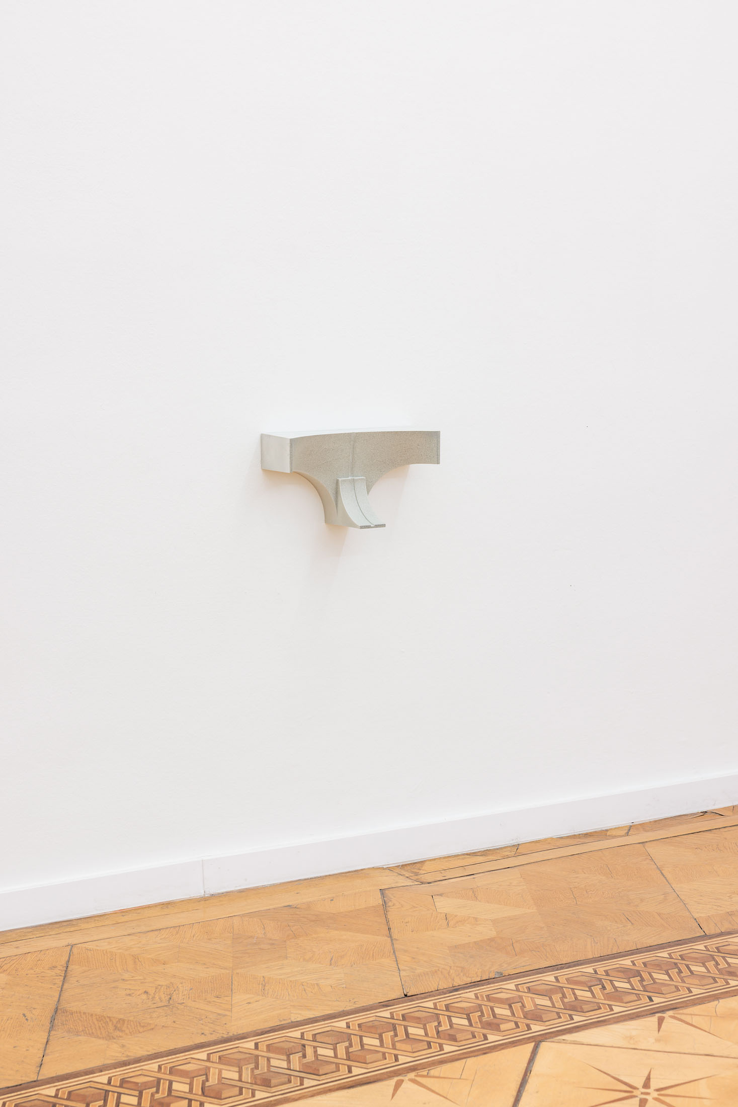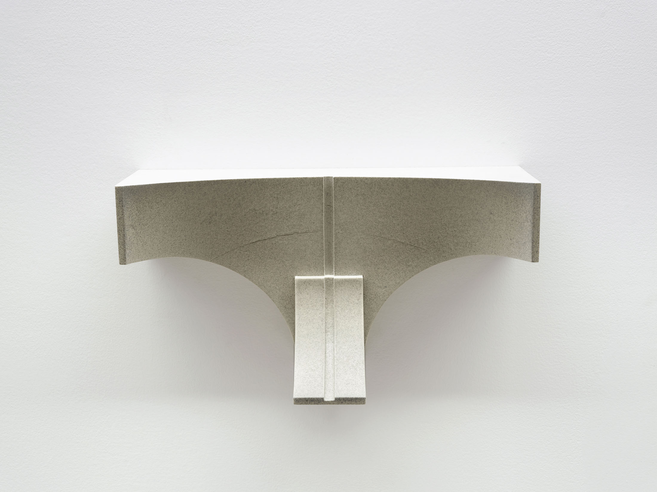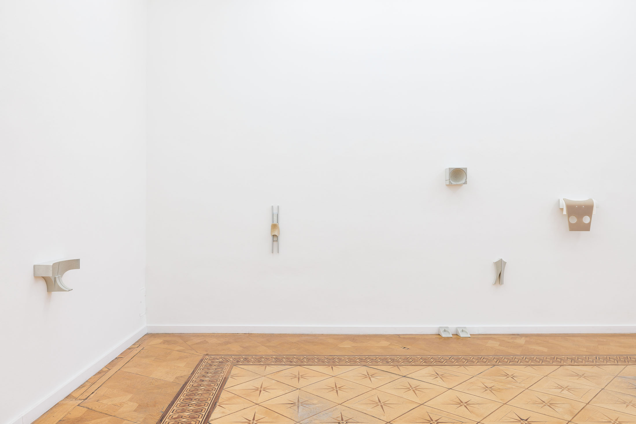 [M]others is a rare example of casting within Olson’s ongoing Index series, which are minimal reliefs that are abstractions of human body parts. To make the wall-mounted forms, the artist typically employs a subtractive carving process—involving a digital file and a CNC machine. However, in [M]others, the carved reliefs were instead used as ‘mother’ forms, which were then molded and cast into a mixture of polyurethane resin and ground ceramic. There are small insertions into and additions onto the recessed surfaces of the casts. These additional elements were made using processes and materials that both complement and exaggerate the hard edges and unnatural resin. The eight sculptural fragments are installed to correspond with the various heights of their bodily referents–head, chest, arm, crotch, feet–creating a marker of an absent and scattered figure.