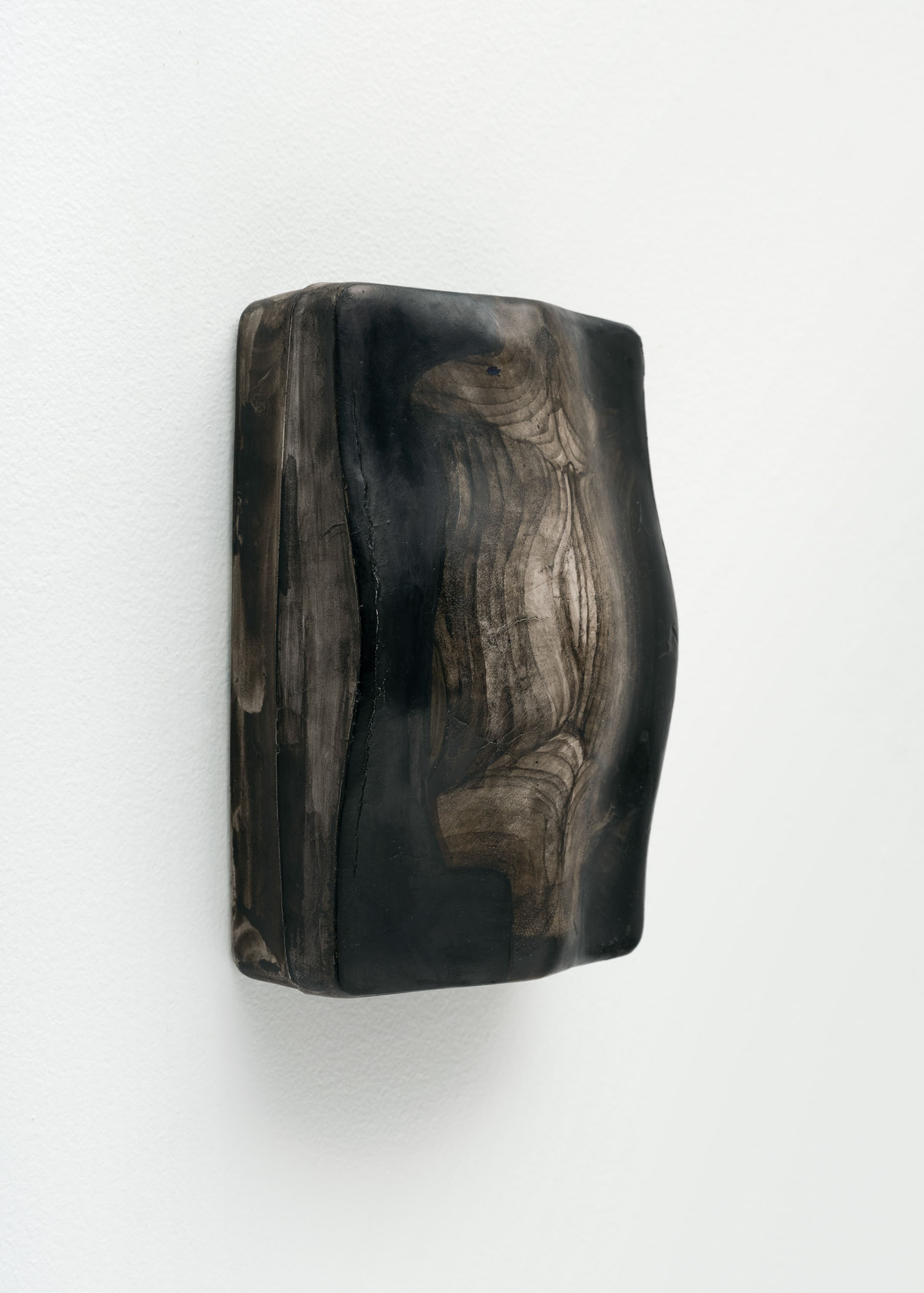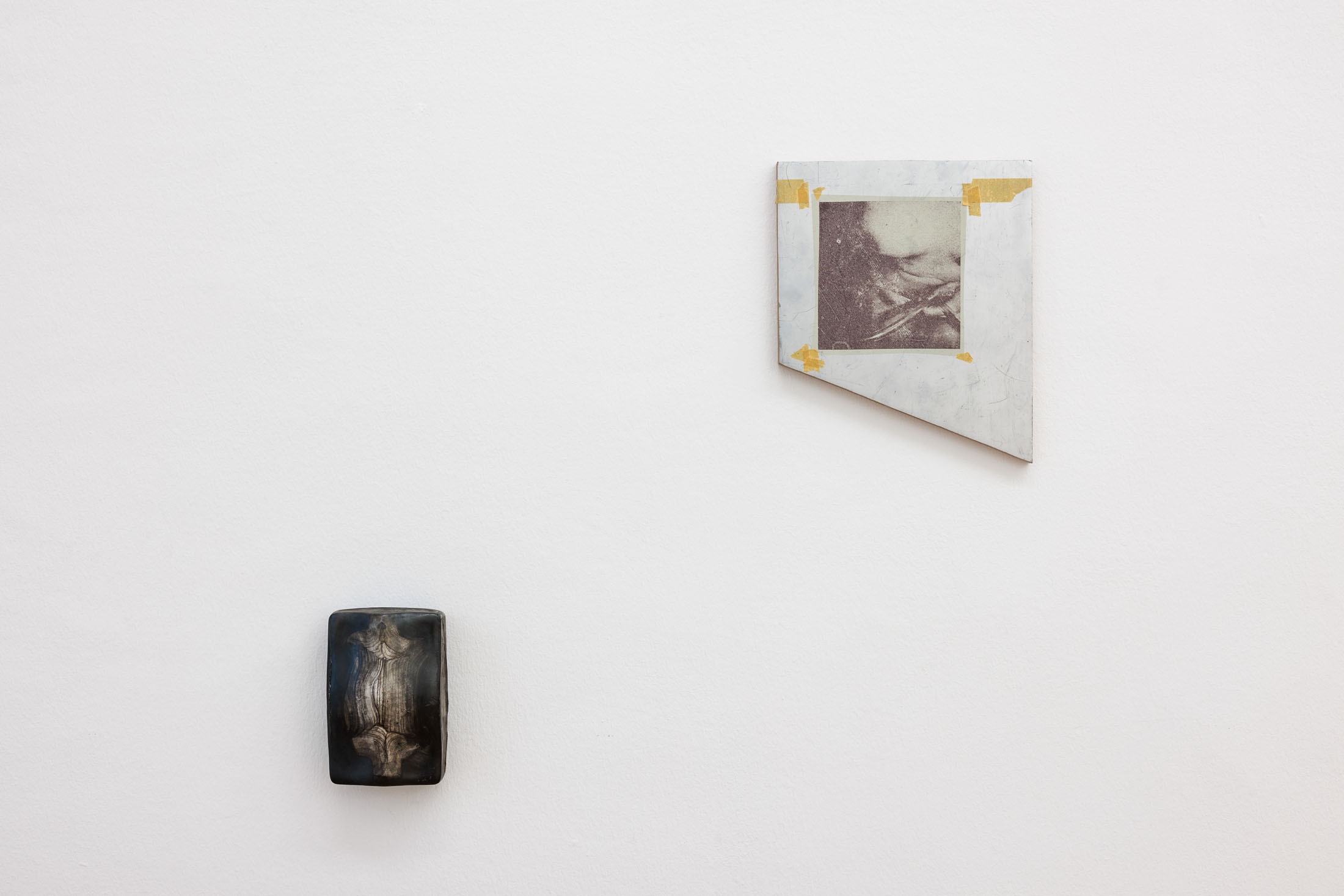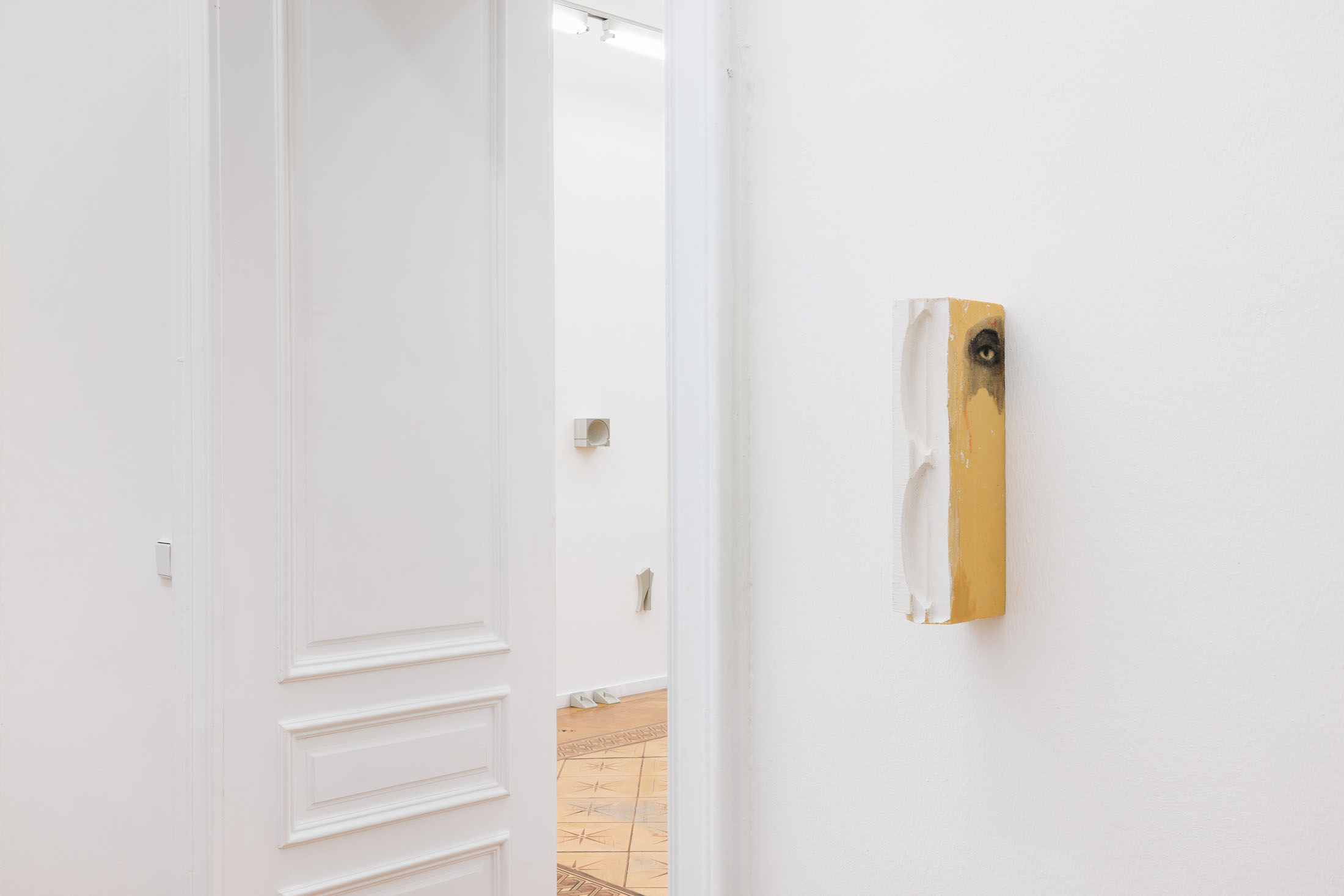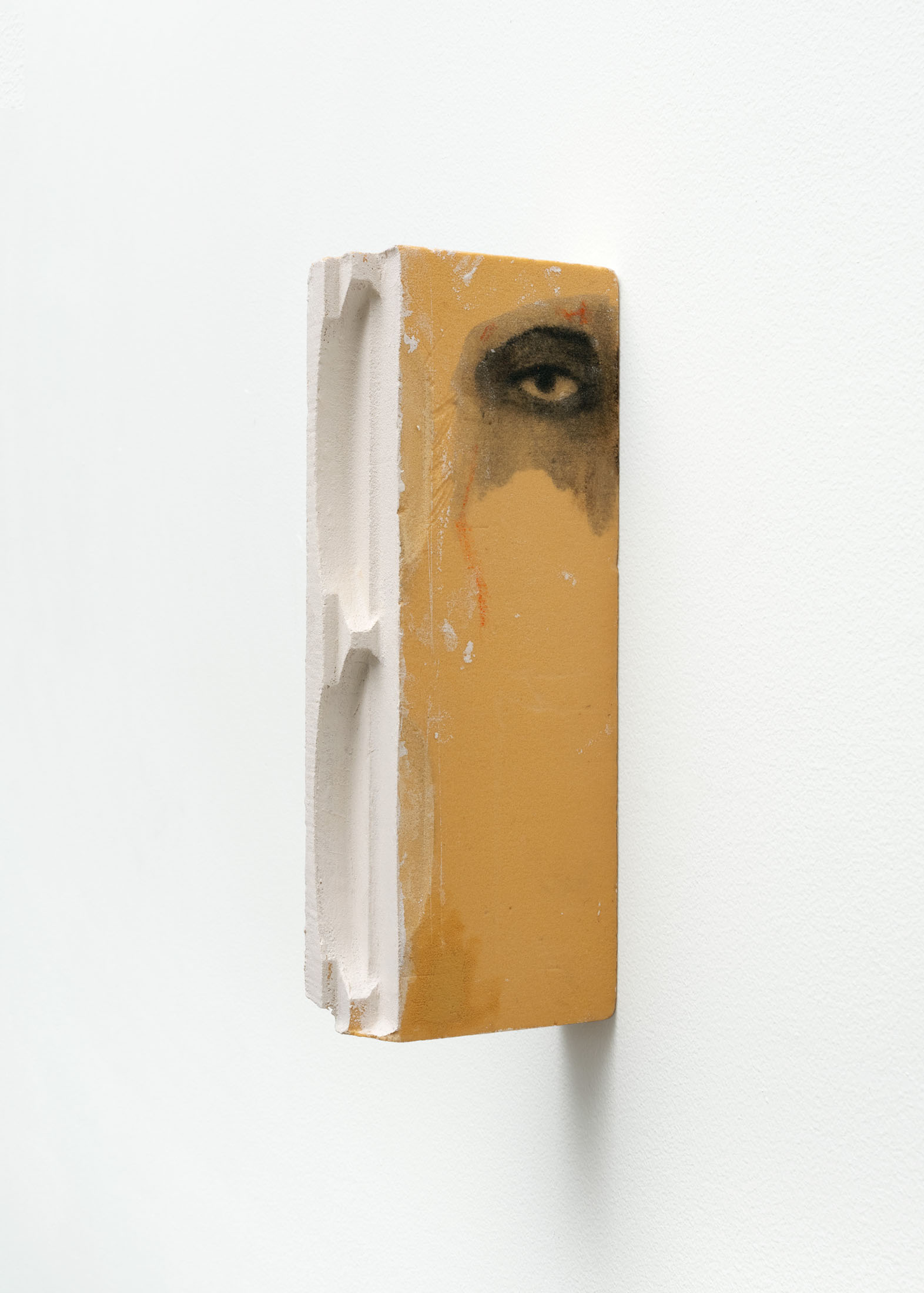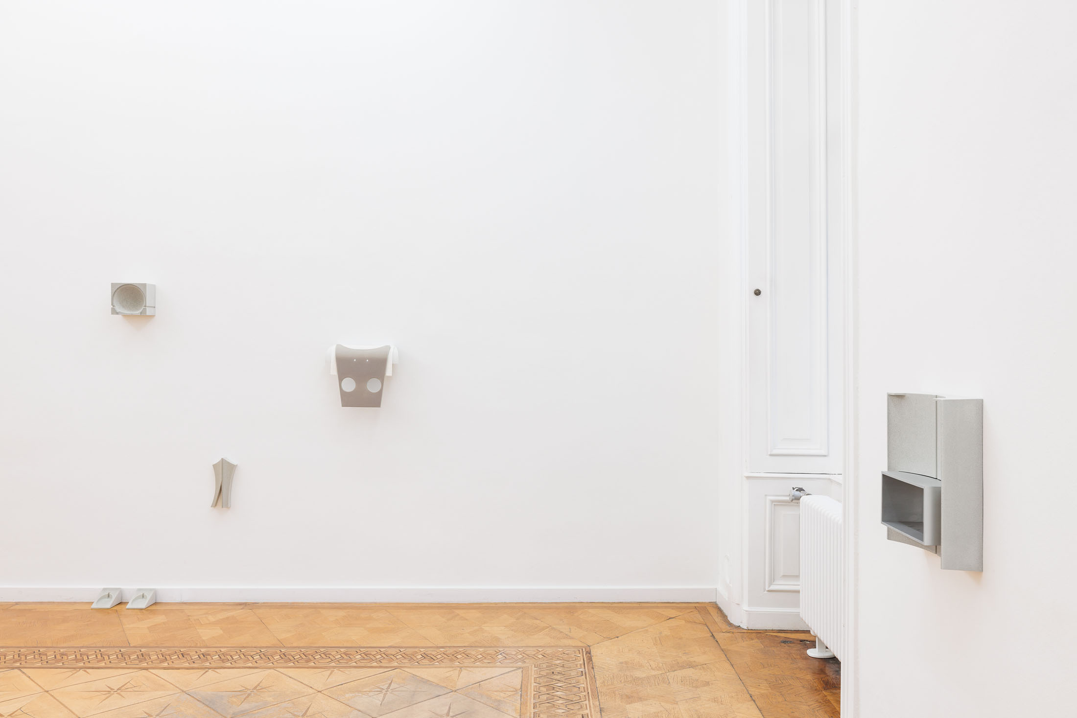 [M]others is a rare example of casting within Olson’s ongoing Index series, which are minimal reliefs that are abstractions of human body parts. To make the wall-mounted forms, the artist typically employs a subtractive carving process—involving a digital file and a CNC machine. However, in [M]others, the carved reliefs were instead used as ‘mother’ forms, which were then molded and cast into a mixture of polyurethane resin and ground ceramic. There are small insertions into and additions onto the recessed surfaces of the casts. These additional elements were made using processes and materials that both complement and exaggerate the hard edges and unnatural resin. The eight sculptural fragments are installed to correspond with the various heights of their bodily referents–head, chest, arm, crotch, feet–creating a marker of an absent and scattered figure.