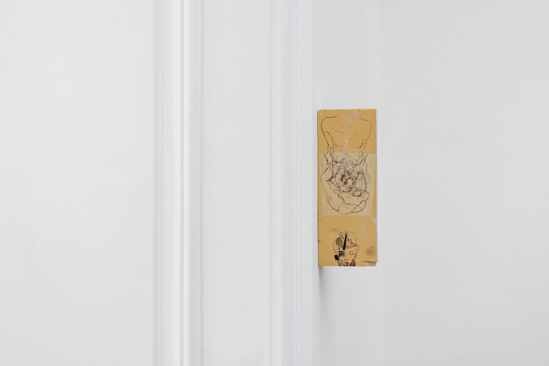 B. Ingrid Olson, Machines Complex, 2026, exhibition view, Croy Nielsen, ViennaB. Ingrid Olson, Machines Complex, 2026, exhibition view, Croy Nielsen, ViennaB. Ingrid Olson, Machines Complex, 2026, exhibition view, Croy Nielsen, ViennaB. Ingrid Olson, Machines Complex, 2026, exhibition view, Croy Nielsen, ViennaB. Ingrid Olson, Machines Complex, 2026, exhibition view, Croy Nielsen, ViennaB. Ingrid Olson, Machines Complex, 2026, exhibition view, Croy Nielsen, ViennaB. Ingrid Olson, Machines Complex, 2026, exhibition view, Croy Nielsen, ViennaB. Ingrid Olson, Machines Complex, 2026, exhibition view, Croy Nielsen, ViennaB. Ingrid Olson, Machines Complex, 2026, exhibition view, Croy Nielsen, ViennaB. Ingrid Olson, Machines Complex, 2026, exhibition view, Croy Nielsen, ViennaB. Ingrid Olson, Machines Complex, 2026, exhibition view, Croy Nielsen, ViennaB. Ingrid Olson, Machines Complex, 2026, exhibition view, Croy Nielsen, ViennaB. Ingrid Olson, Machines Complex, 2026, exhibition view, Croy Nielsen, ViennaB. Ingrid Olson, Machines Complex, 2026, exhibition view, Croy Nielsen, ViennaB. Ingrid Olson, Machines Complex, 2026, exhibition view, Croy Nielsen, ViennaB. Ingrid Olson, Machines Complex, 2026, exhibition view, Croy Nielsen, ViennaB. Ingrid Olson, Machines Complex, 2026, exhibition view, Croy Nielsen, ViennaB. Ingrid Olson, Called Ribbon, Felt Chorus, Multiple Bodies, Interior History, 2025, Acrylic paint, acrylic ink, milk paint, wood panel, MDF, wood glue, screws 32.4 × 90.8 × 5 cmB. Ingrid Olson, Halt before the chase (offcut), 2016-2025, Enamel paint, polyeurethane foam, tracing paper, ink, artist’s tape 30.5 × 25.4 × 2 cmB. Ingrid Olson, Halt before the chase (Psycho Painting, I), 2015-2025, Aluminum tape, acrylic paint, absorbant ground, graphite, glue, inkjet print, wood panel, wood glue 55.3 × 46.4 × 5 cmB. Ingrid Olson, I am wandering around an exhibition. The space is less like a gallery and more like an attic. Half lit and warm. There is a video monitor that is not turned on, so we turn it on. It begins near it’s end—it must not have been rewound. The video shows a man going up a set of stairs to a bridge over train tracks. Cuts to train tracks with the camera in center of tracks. The single headlight of a train comes closer and more into focus as it fast approaches. It will almost hit the camera but stops just short. Once stopped, the camera pans just to the right, to see a toy train strapped to the larger train. I almost laugh at the absurdity, the min-iaturization. The video switches scenes to a painterly ochre and pink pool of water. In the pool, a man and a woman are curled around each other performing oral sex. She holds a semi-transparent fake leather purse over her face to muffle her cries of pleasure. Then she stands, multiplies, and becomes many. She is a draw-ing now. Now the video is at the beginning again: an image of an intaglio print is animated. Two women who are twins are speaking into each other’s eyes and mouths, alternately. They are silhouettes asking: “Where should we begin?” Then the camera pans side to side showing oblique angles of the print, revealing that the flat image is not actually flat. It sticks out from the front and from the back. On the back side, a dark crevice between the frame and wall also has a silhouetted face. This silhouette whispers something inaudible., 2025 Gypsum cement, vinyl paint, acrylic ink, 17 × 10.8 × 6.4 cm