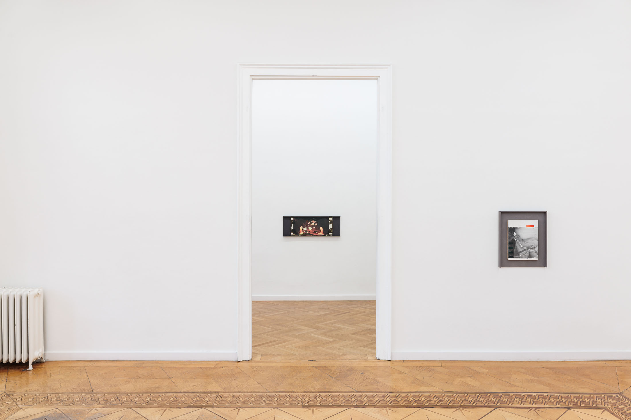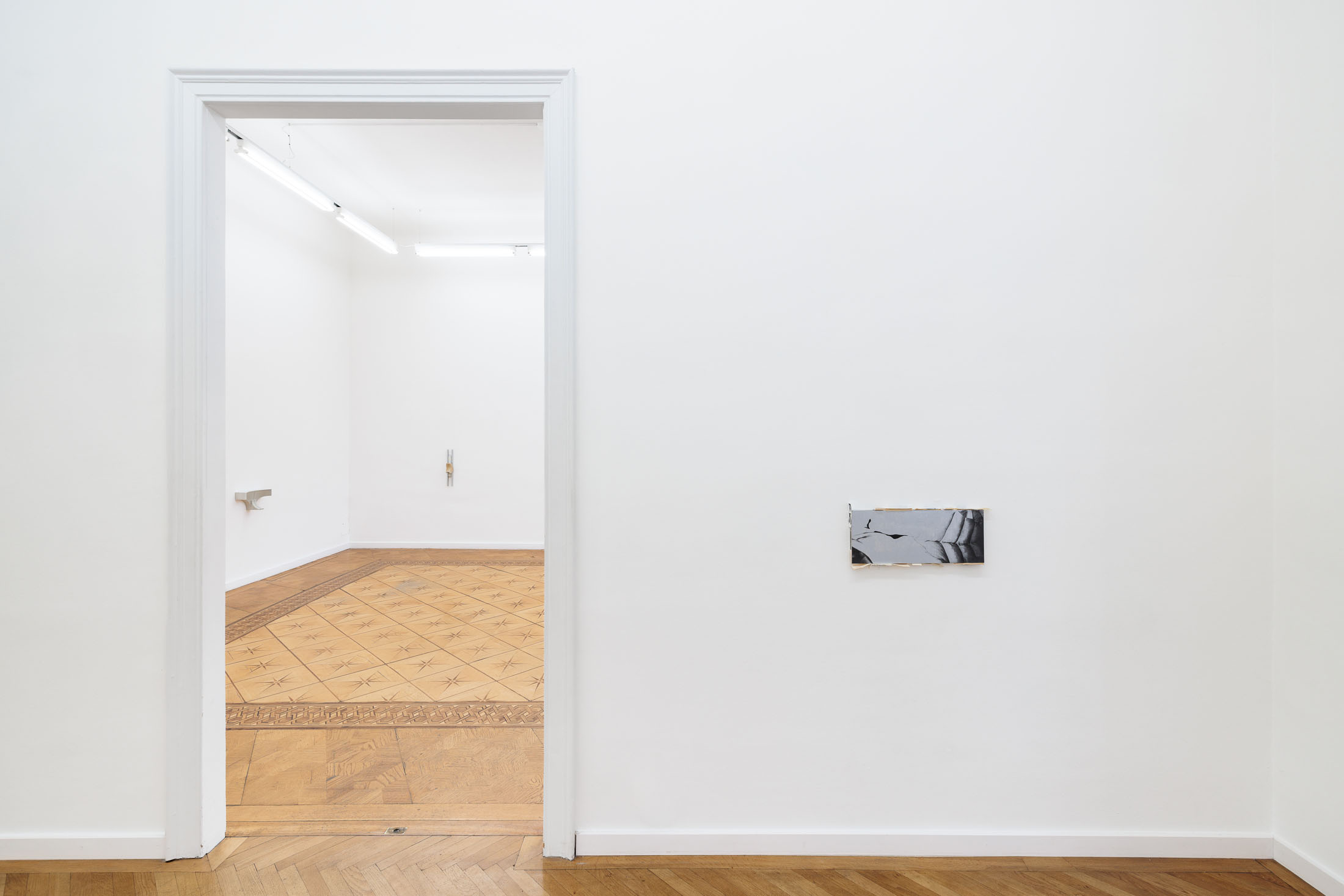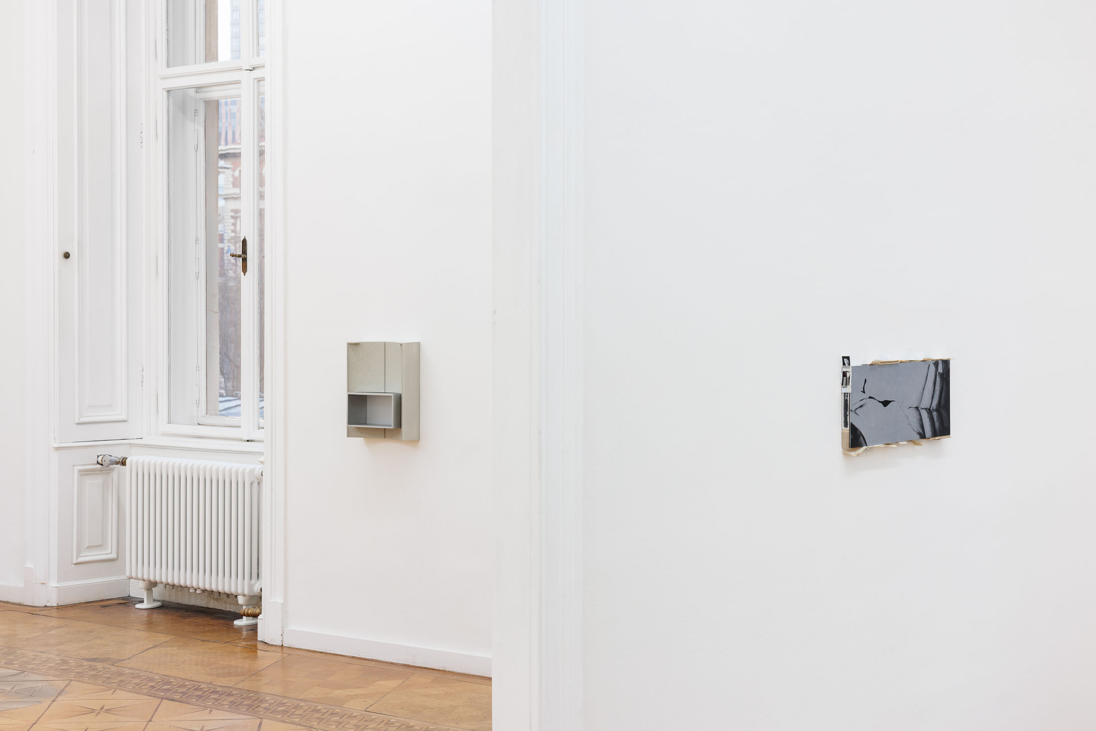 Walk up one flight of stairs to enter the gallery. Turn right into a small hallway, which leads to the first small entryway into the main gallery. This preliminary vestibule is a tight space to fit into if anyone else is in the space with you. More of a conjunctive than functional space, this little room is not designed to rest in. Yet, there is work installed here. Is it possible to look at it, if you can’t step back? Or is it possible to see it from a distance? Walking into the largest room, there is an openness and freedom to move after the first constriction. You can live in this room. Each step you take resounds through the wood floor in a range of taps, clicks, creaks, groans. Windows stretch along the farthest wall and sculptural reliefs punctuate the surrounding walls. Depending on the time of day, or if the sun is out when you are there, the natural light that falls across the reliefs will alter the angles and intensities of the shadow-images. Turn around again and there is another door that leads to the third room. It is a long and narrow space. It is tucked away. Here, you will find a group of paintings. Three of the panels are framed, either by thin board, or by clusters of photographic prints. You have to bend over to see the bottom edge and depending on your height, you may have to crane your neck to see the tops. Oblique and direct angles will offer different information. Turn around and see the exhibition in reverse.