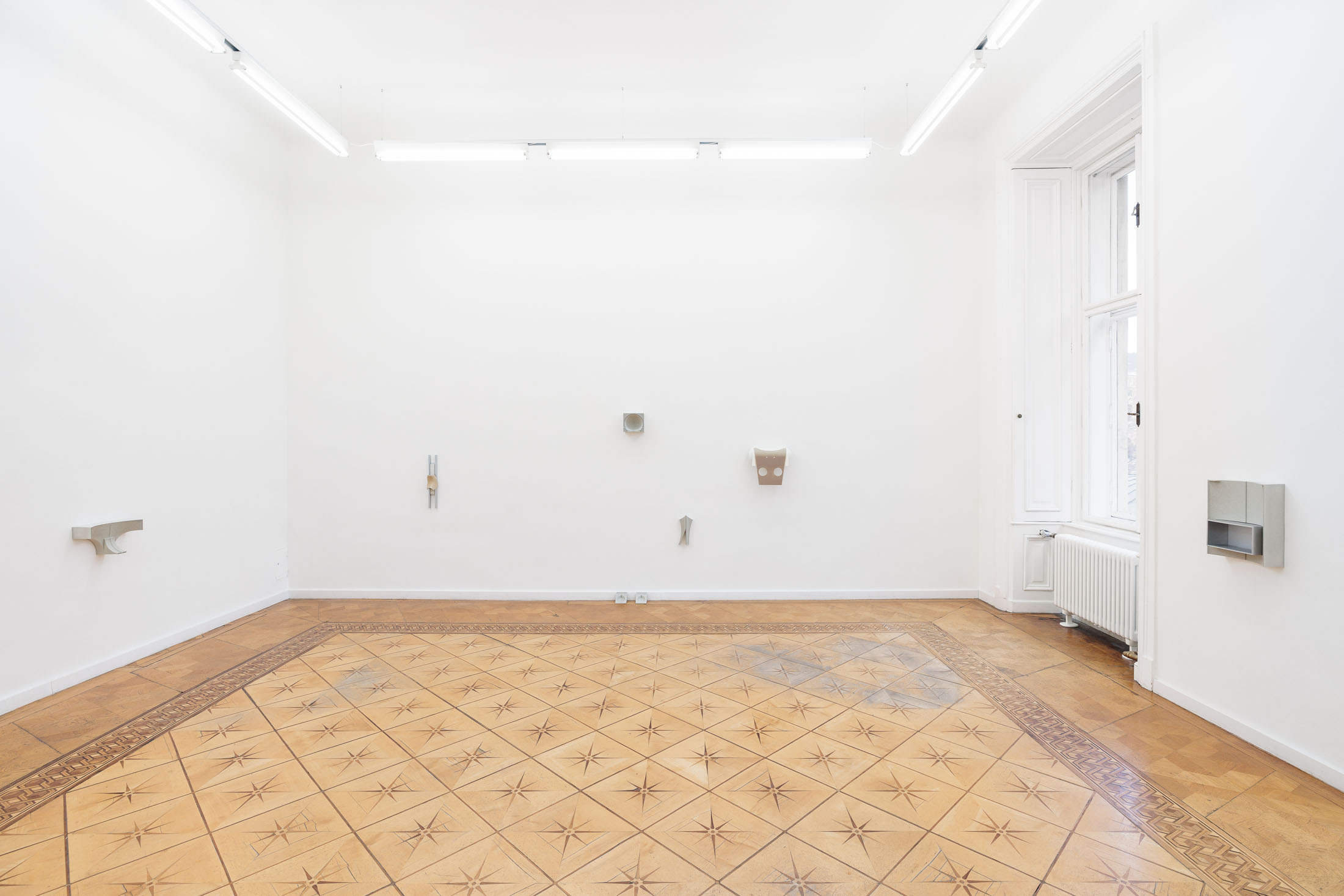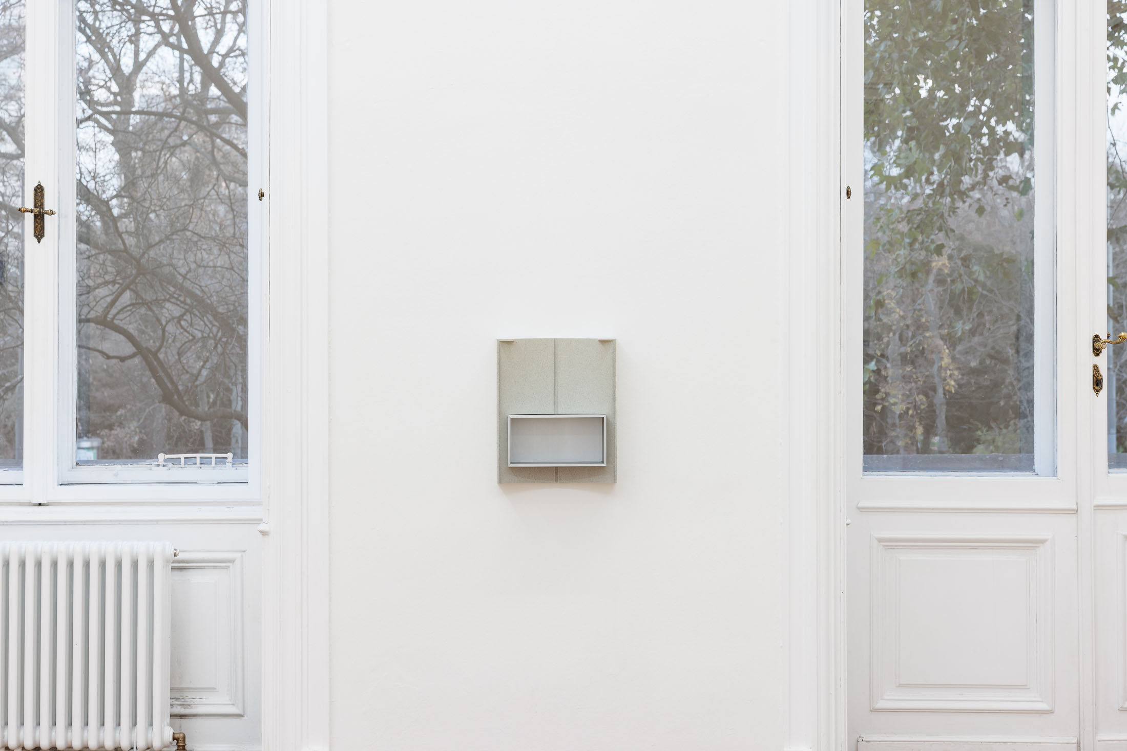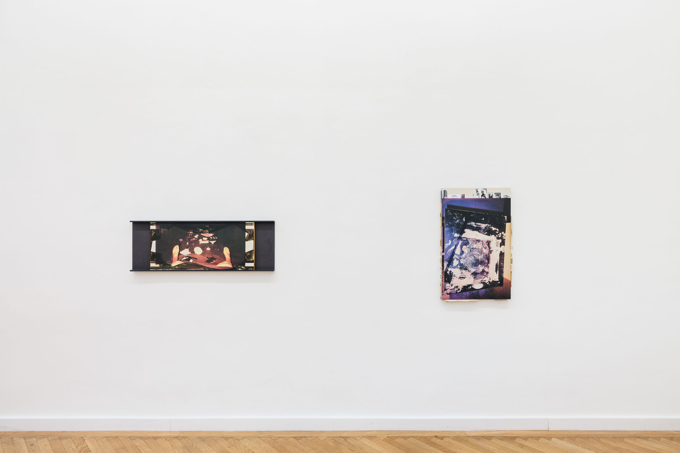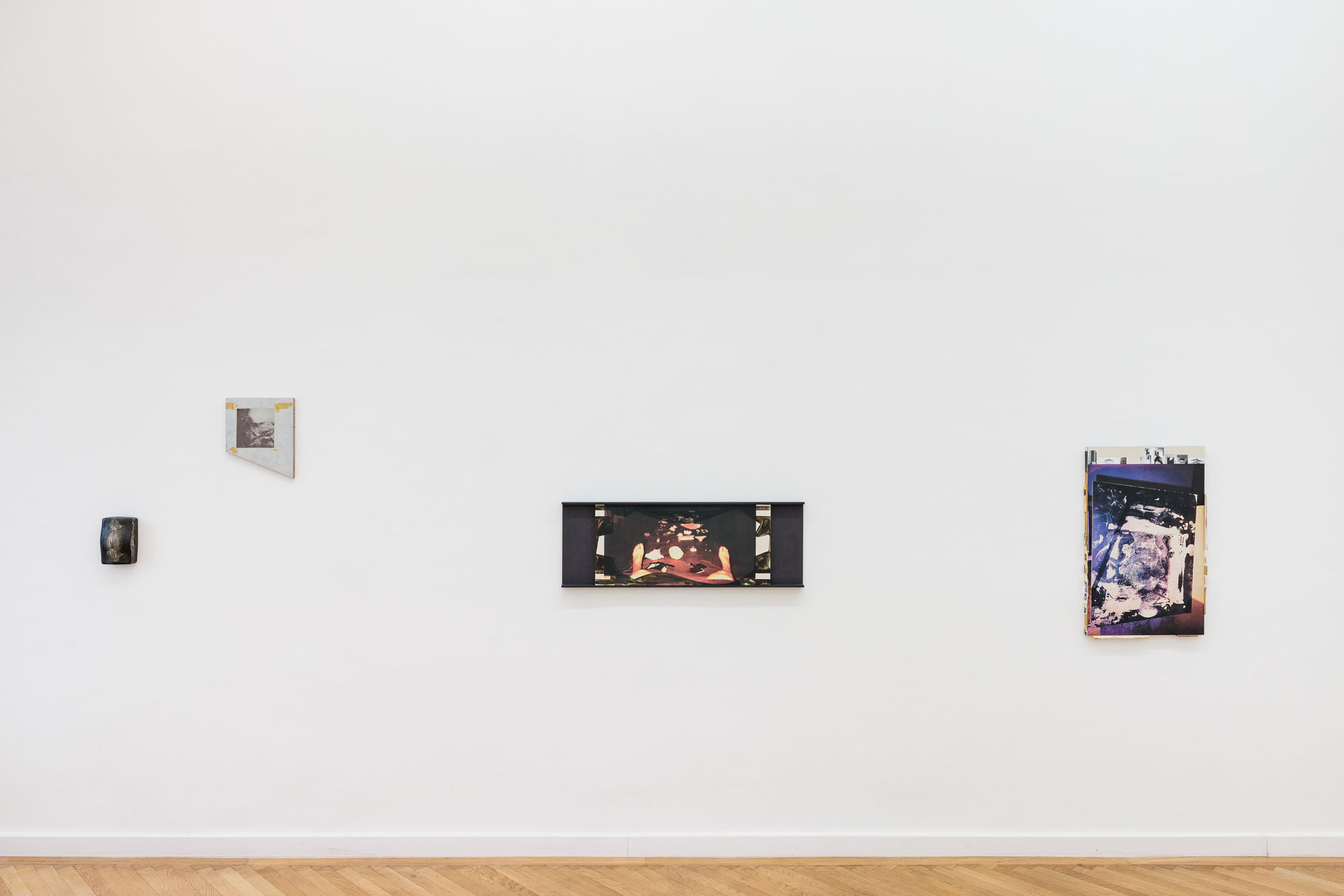 Walk up one flight of stairs to enter the gallery. Turn right into a small hallway, which leads to the first small entryway into the main gallery. This preliminary vestibule is a tight space to fit into if anyone else is in the space with you. More of a conjunctive than functional space, this little room is not designed to rest in. Yet, there is work installed here. Is it possible to look at it, if you can’t step back? Or is it possible to see it from a distance? Walking into the largest room, there is an openness and freedom to move after the first constriction. You can live in this room. Each step you take resounds through the wood floor in a range of taps, clicks, creaks, groans. Windows stretch along the farthest wall and sculptural reliefs punctuate the surrounding walls. Depending on the time of day, or if the sun is out when you are there, the natural light that falls across the reliefs will alter the angles and intensities of the shadow-images. Turn around again and there is another door that leads to the third room. It is a long and narrow space. It is tucked away. Here, you will find a group of paintings. Three of the panels are framed, either by thin board, or by clusters of photographic prints. You have to bend over to see the bottom edge and depending on your height, you may have to crane your neck to see the tops. Oblique and direct angles will offer different information. Turn around and see the exhibition in reverse.