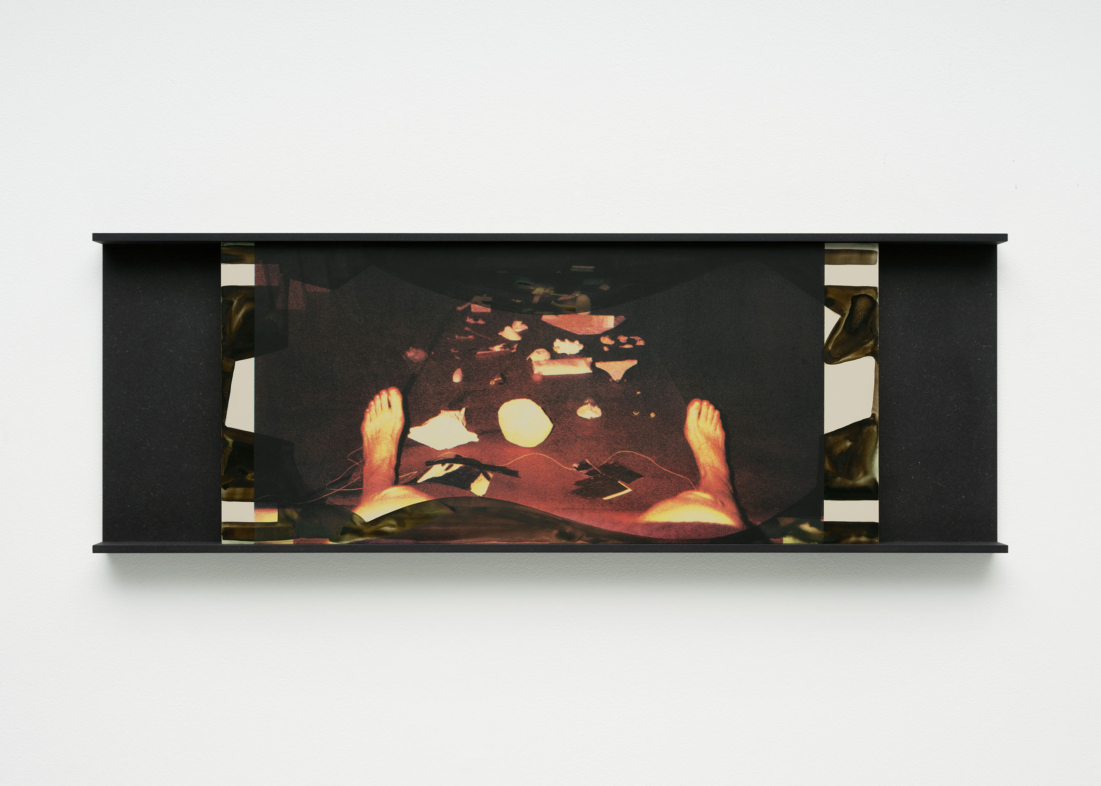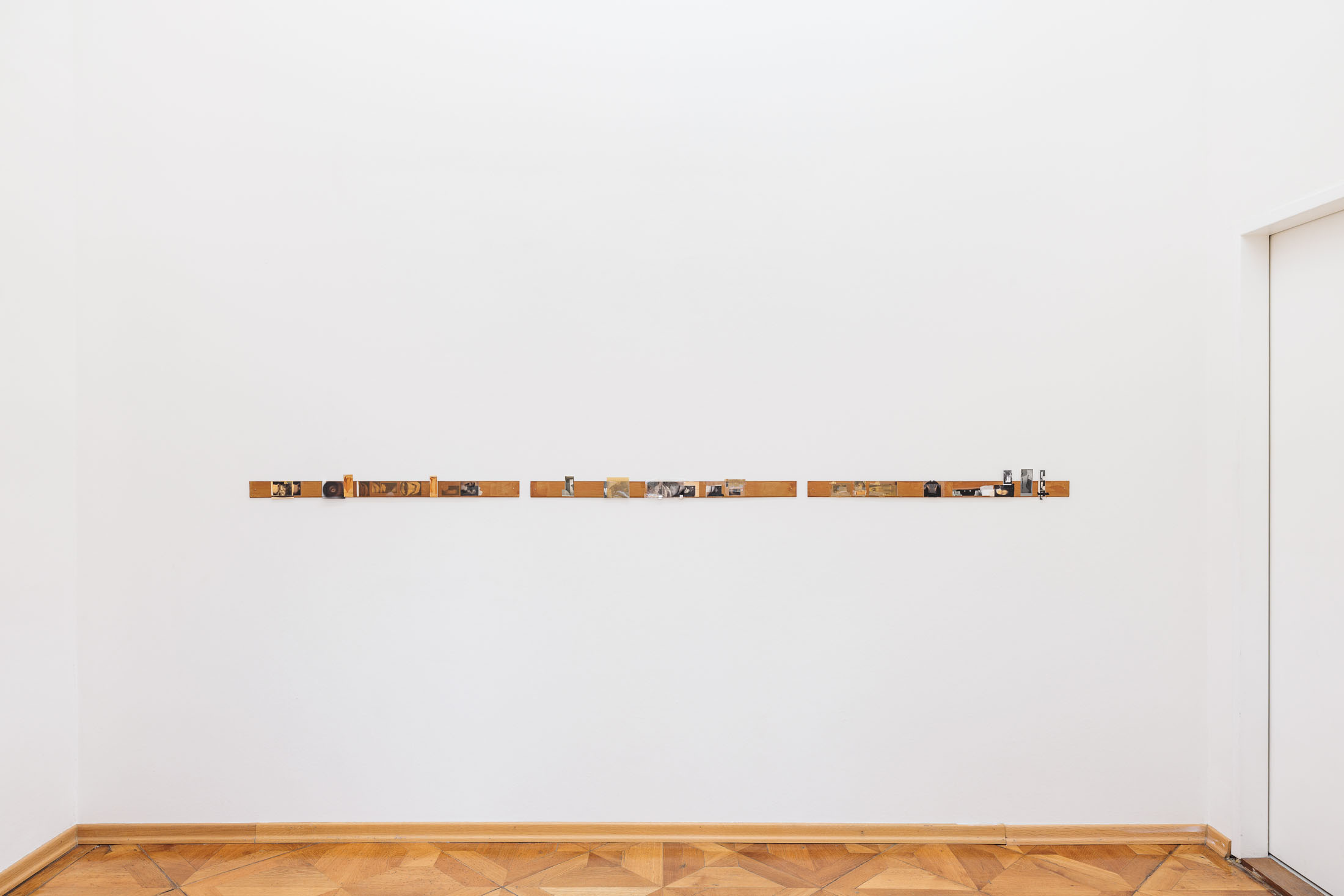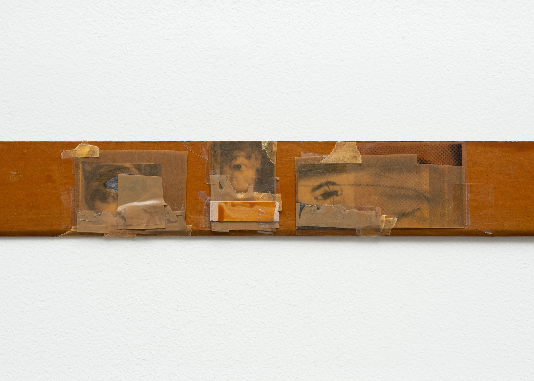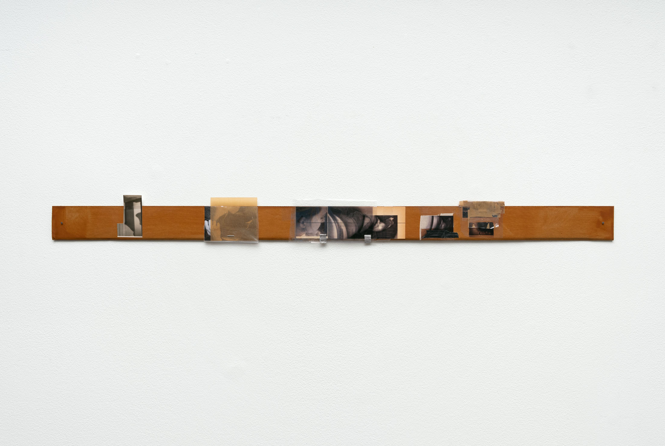 Small ad hoc photo-collages are also on view, related to the artist’s psycho index series. The hand-held size of the prints ties these works to the frenetic, haptic activity of jotting down notes on scrap paper, but the scale also functions as an attenuation of a visitor’s access and speed to view them. They are scaled so that they are only legible from a very proximate, or intimate distance. In three assemblages sharing the title Psychos Reservoir (Video Strip Contents), the tiny images are grouped, lined up in a row, and affixed to long, tabular chipboard strips. As with their predecessors, these works are culled from the artist’s full and growing repository of photographs, taken between 2011 and the present. The prints are stapled, taped, and glued to the chipboard along a horizontal axis, like a row of a spreadsheet, or stills on a strip of film. What presents as scattershot information gathers into something like a prostrate exquisite corpse made by a single artist over the course of more than a decade.