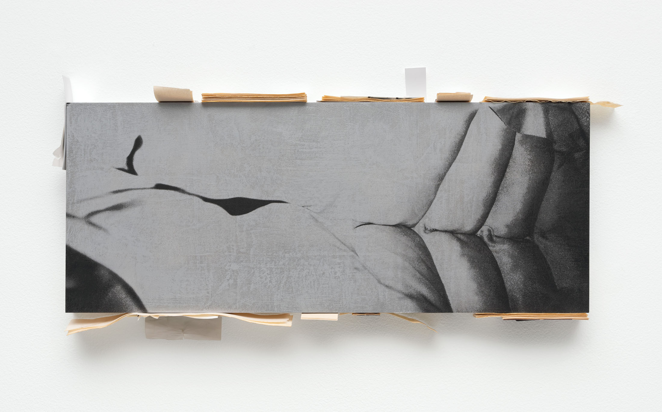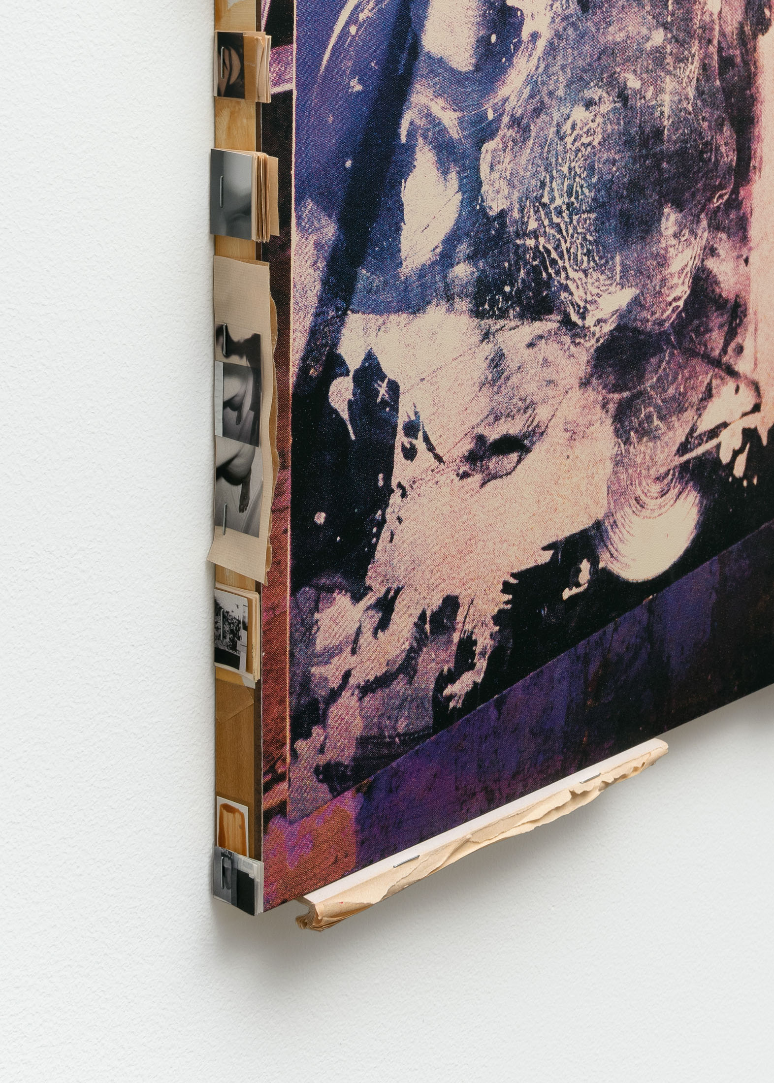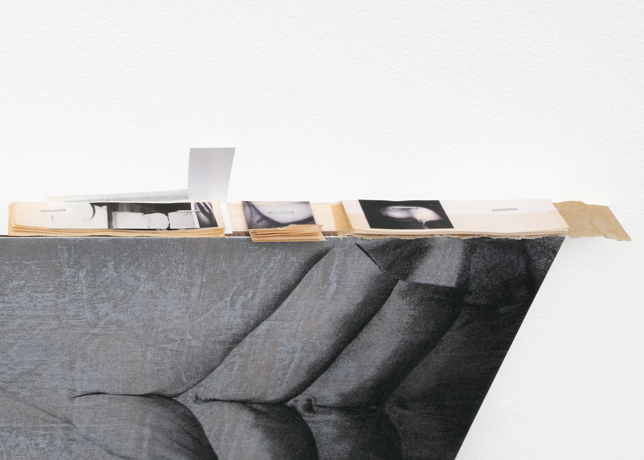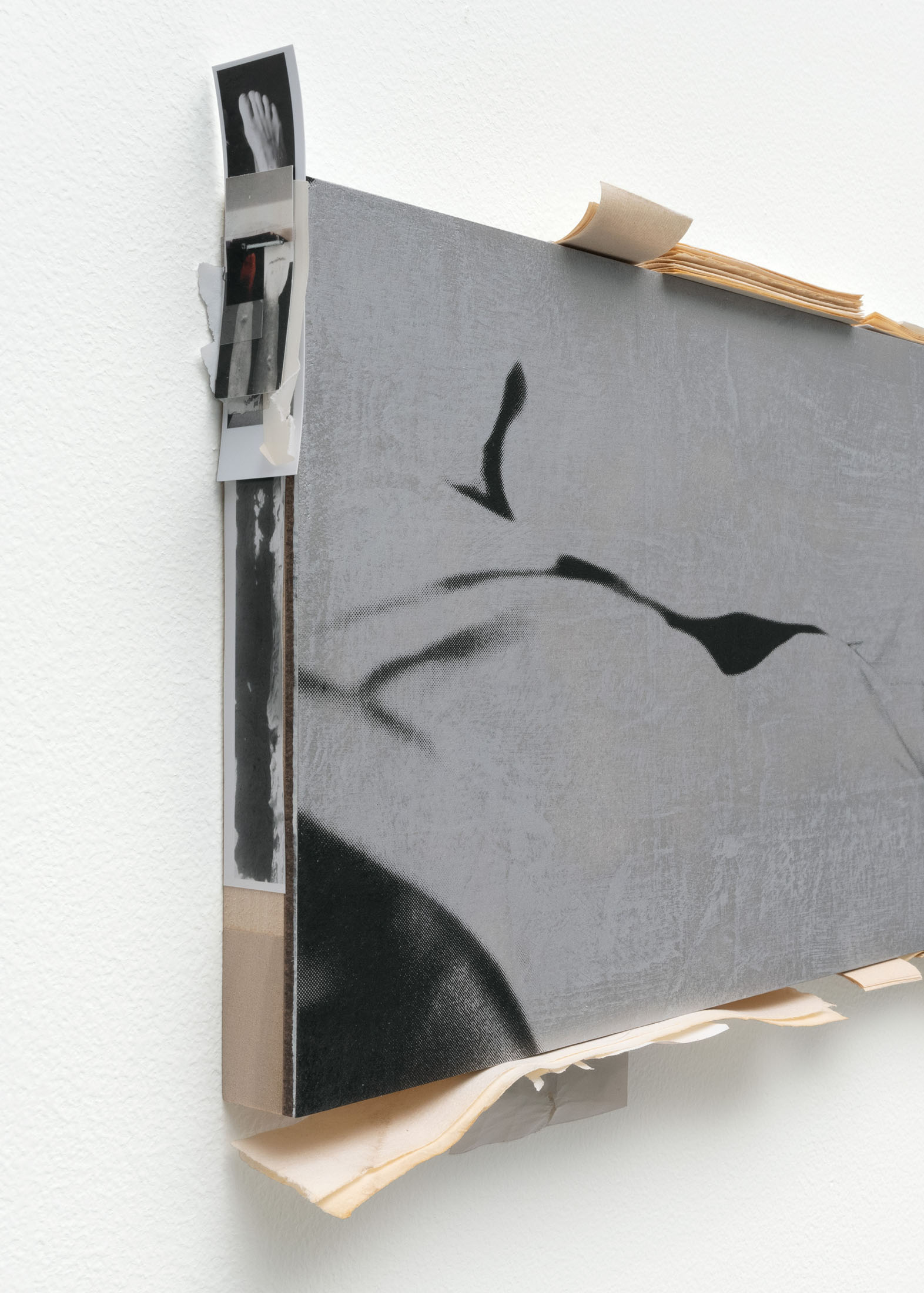 Two works from a new series of paintings on view also feature tiny psycho collages. Narrow stacks of photographic prints line the tops, bottoms, and sides—acting as fragile, notational frames. On the frontal plane, larger images have been screenprinted or glue transferred to the surface. Both techniques noticeably transform and alter the images, underscoring their quality of having been reproduced. The effect of this image-translation is one of color shift, detail loss, and image error, where the prints or transfers fail to impress or adhere to the surface. The paintings picture a cut, muscular torso; a clear plastic tube held from nipple to navel; a play of externalized viscera; and a liquid splayed across a slide-like surface for examination. While each pictures a separate operation, the works are united in their dualistic re-presentations of natural, soft and liquid bodies that have been subjected to an ongoing cycle of mechanical reproductions.