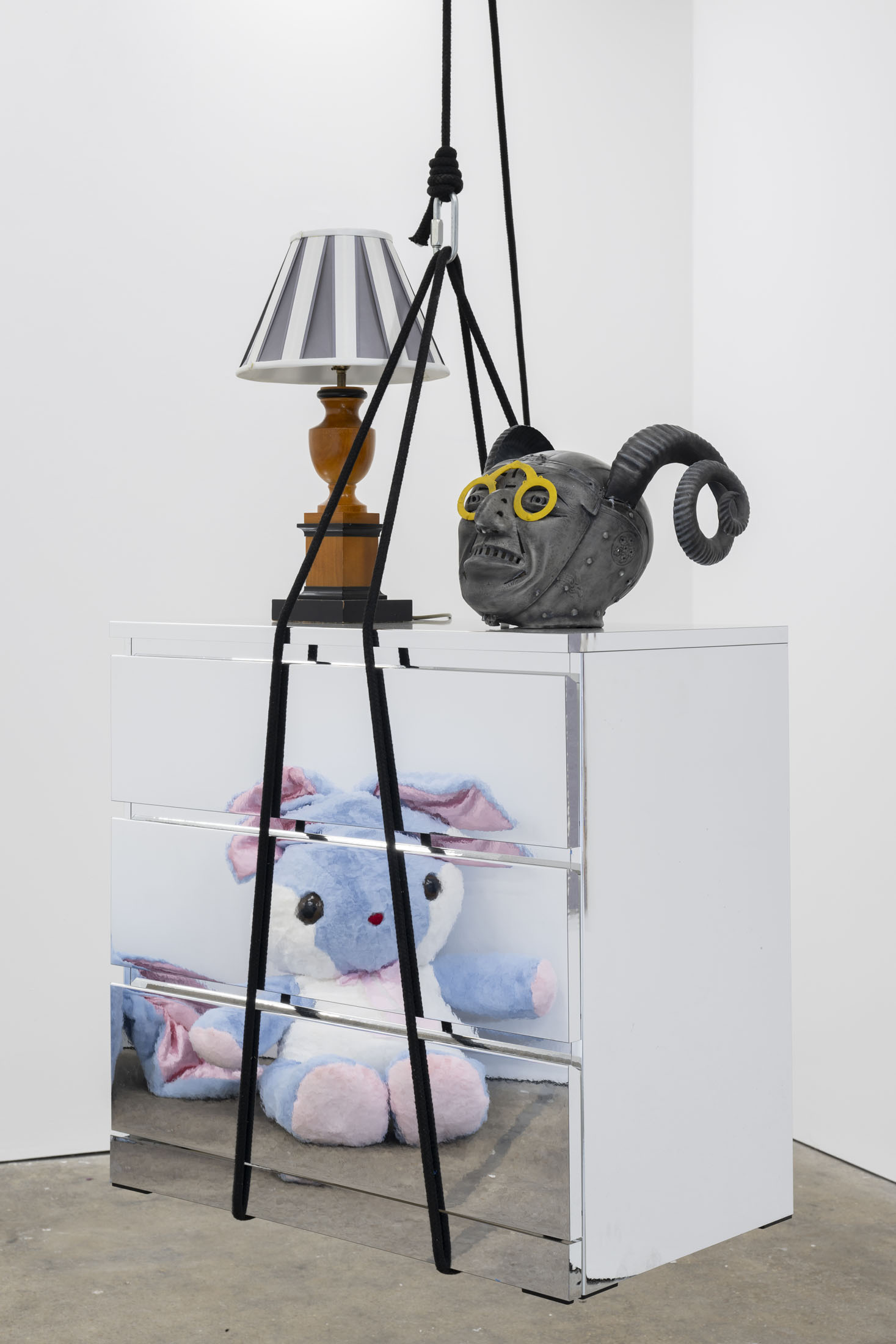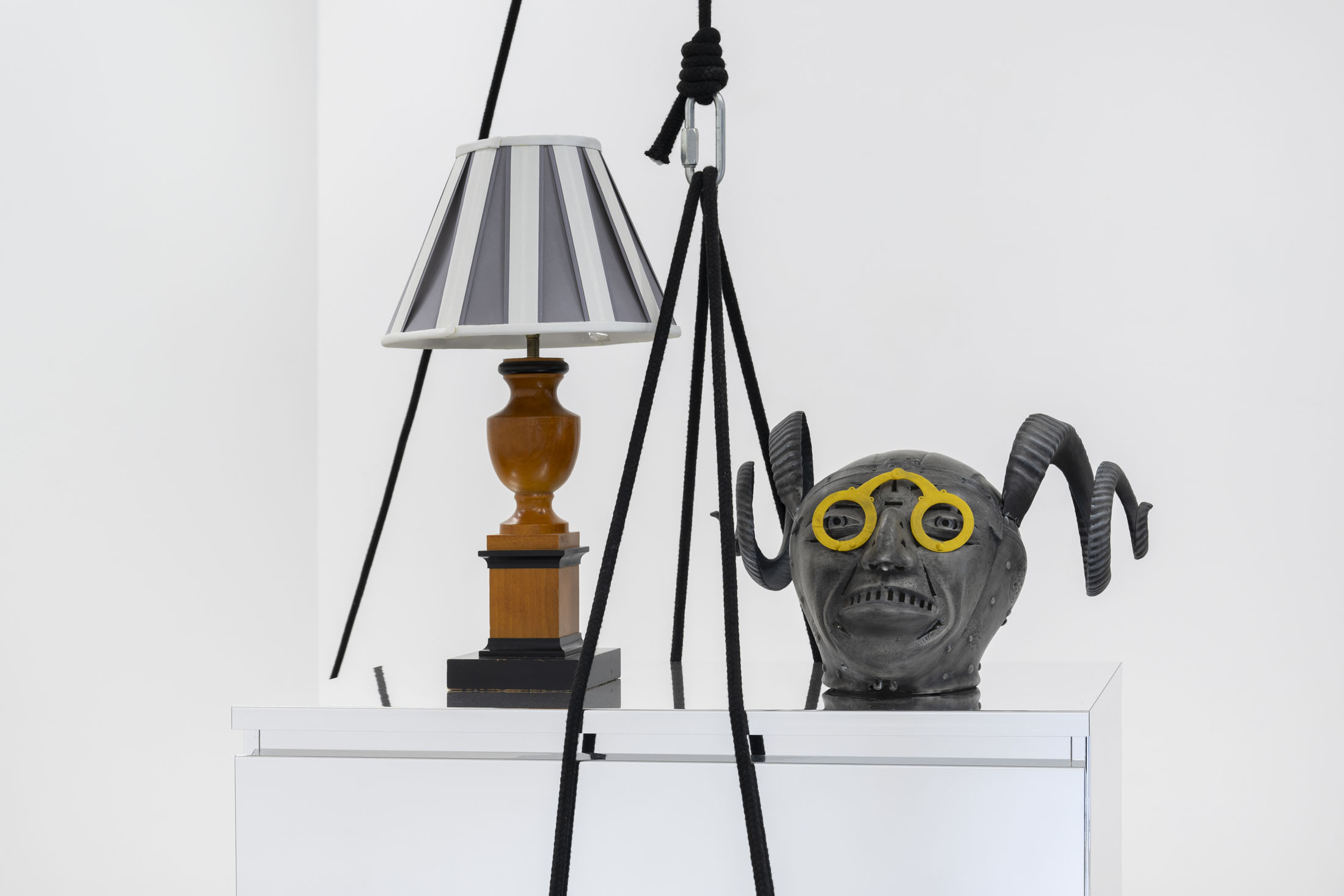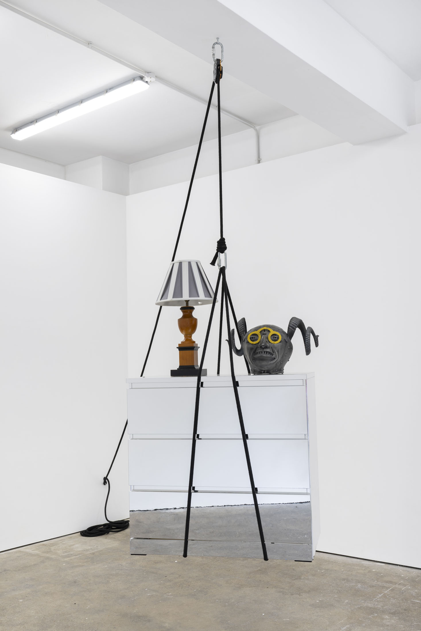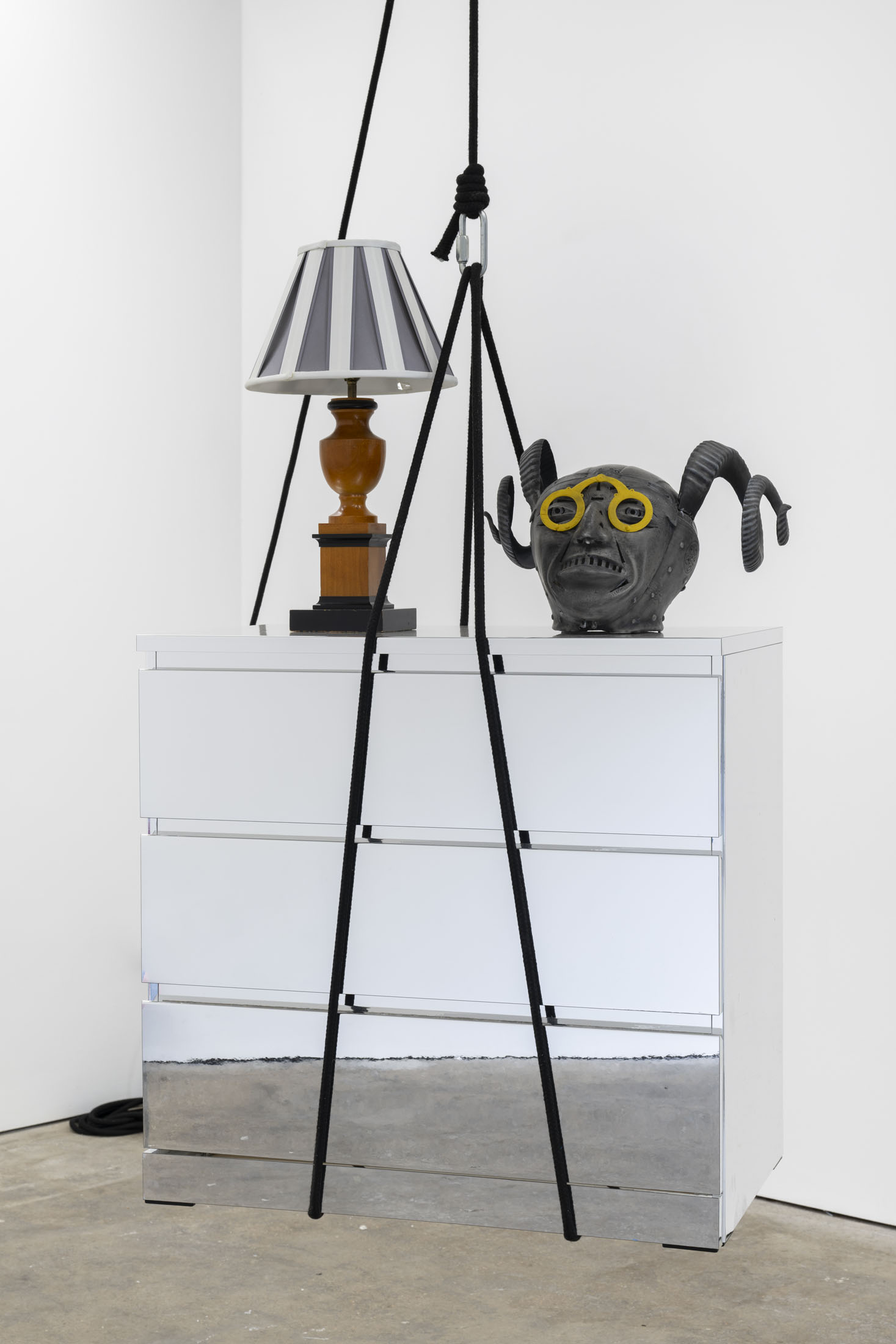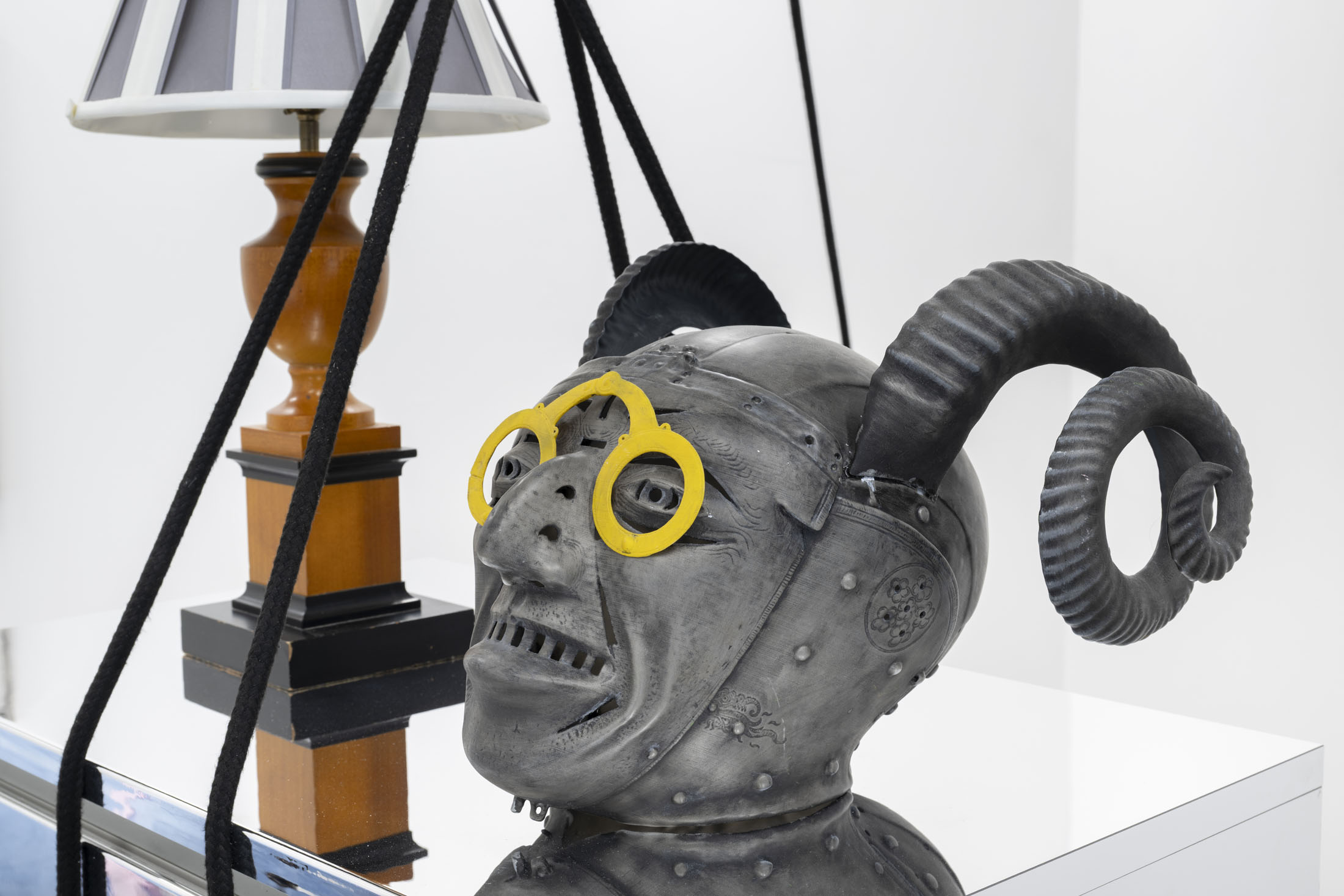 In another piece, a mirrored IKEA drawer floats mid-air, suspended by a black rope and pulley system. Balanced, tense. Atop it sits a replica of the Horned Helmet — a grotesque armor piece gifted by Emperor Maximilian I to Henry VIII, now the logo of the Royal Armouries Museum in Leeds. The replica was made from public-domain scans by artist Oliver Laric. Grinning teeth, bulging eyes, stubbly chin. In the 16th century, horns meant shame — cuckoldry, devilry. The armor became a symbol of disgrace. Henry may have worn it for courtly spectacle. Now, it weighs. It suffocates. It humiliates.