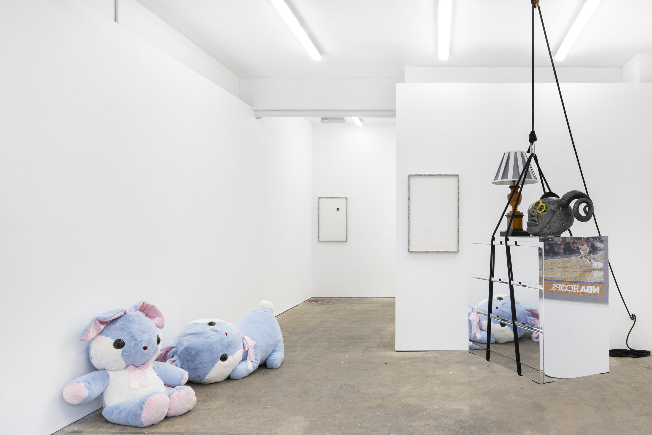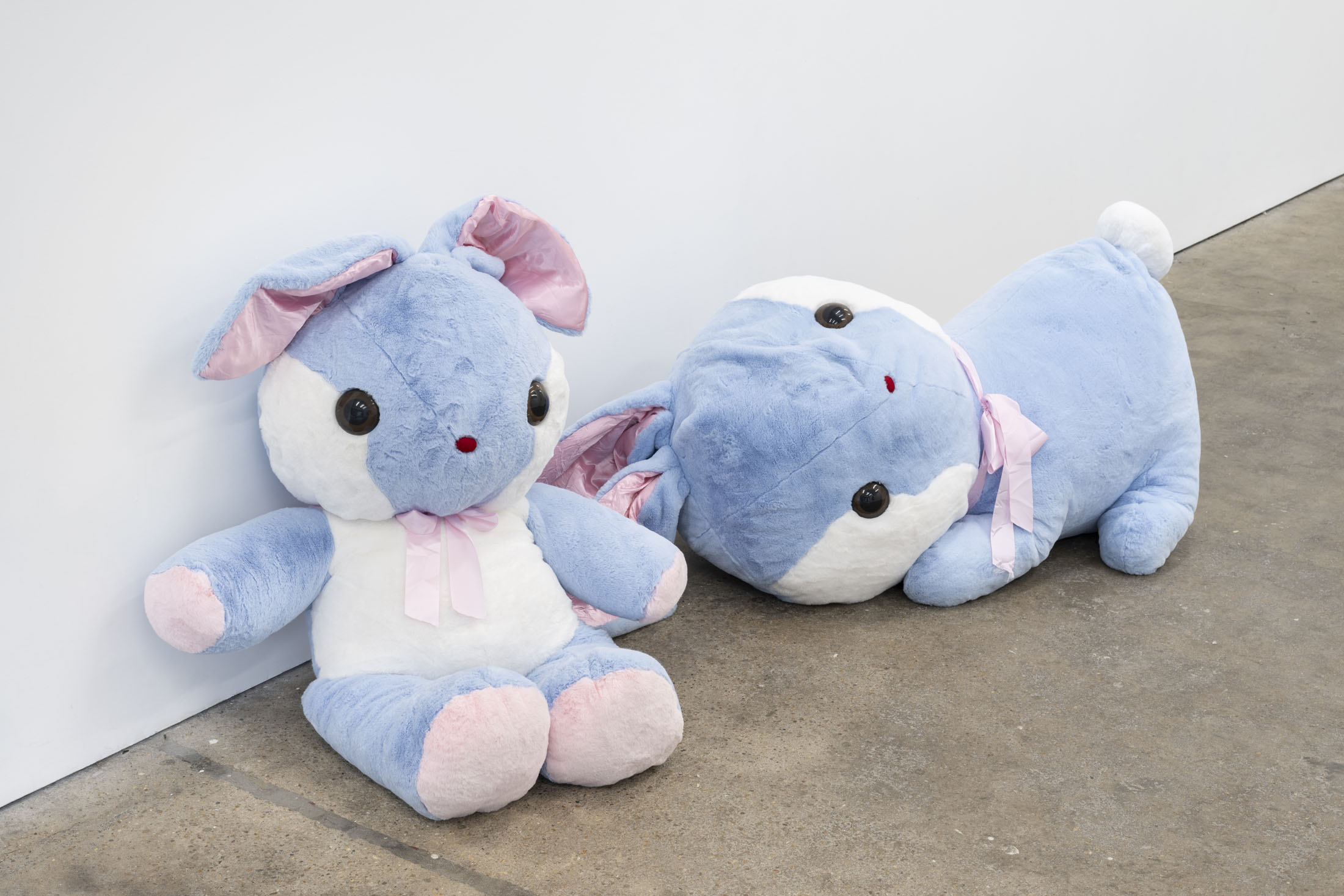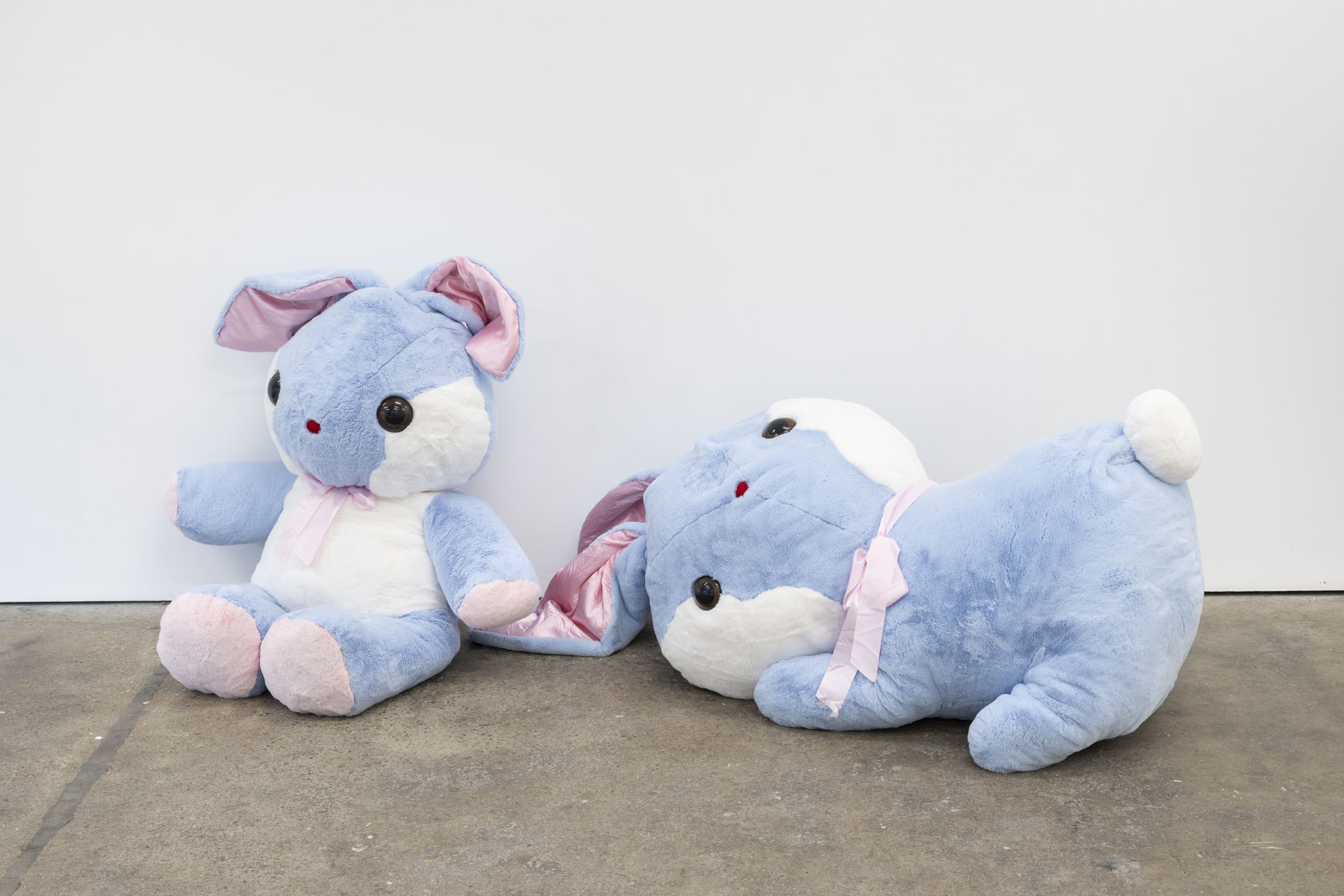 The Menendez brothers become less themselves and more like avatars — empty signifiers onto which various cultural anxieties are projected: class privilege, the failure of the nuclear family, repressed sexuality, the blur between victimhood and monstrosity. Their story becomes mythic not for its uniqueness but for its reproducibility — its availability as a dark fantasy kit. What happened matters less than how we keep using it. Slinger reproduces two plush toys — 150 cm tall blue bunnies — supposedly owned by the Menendez brothers. Baby-blue softness with pharmaceutical design: they look like OxyPharma mascots made to sell opioids to children. Everything is too clean, too sweet. Behind the cuteness: horror. Behind the teddy: rape.