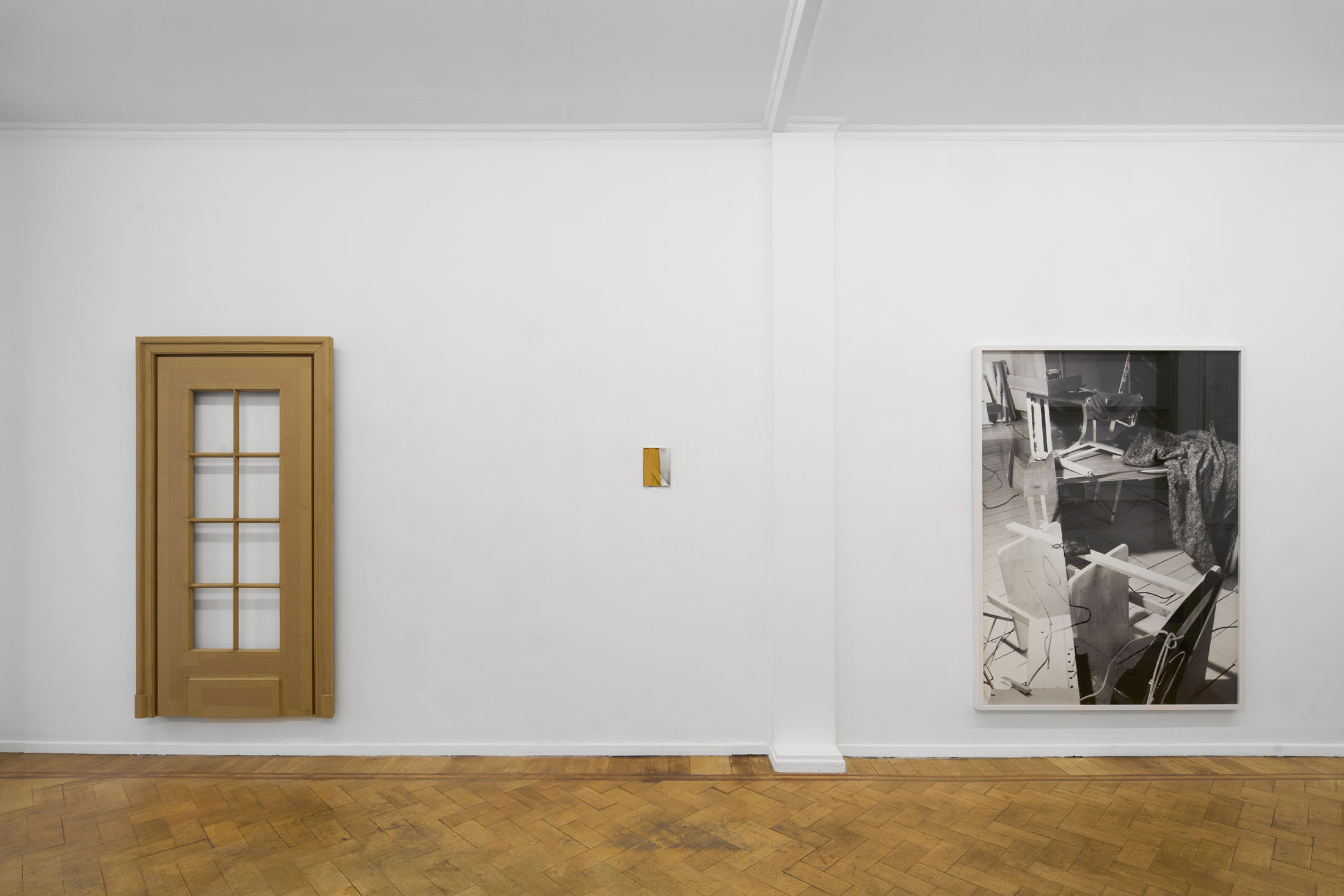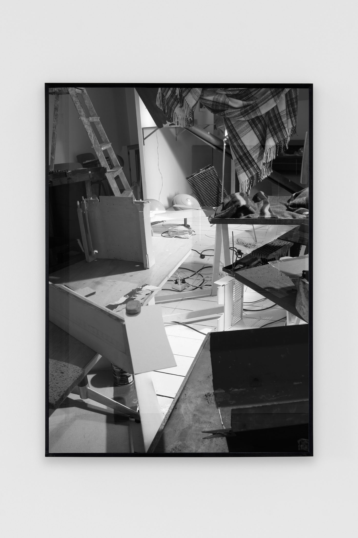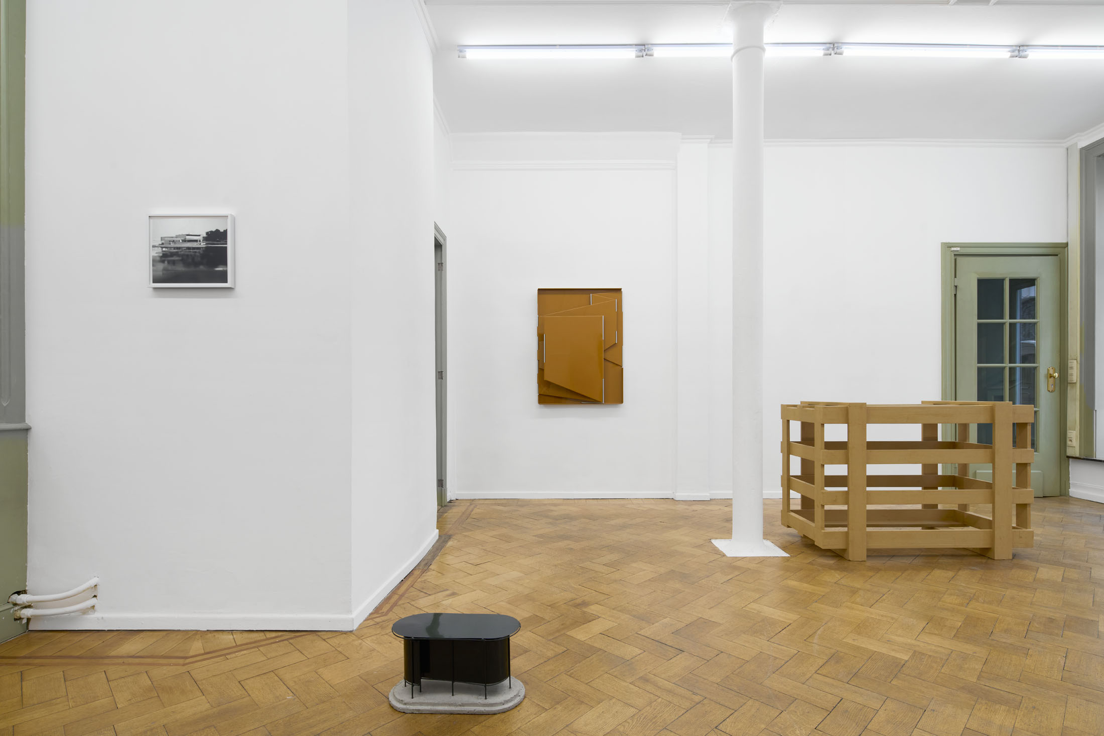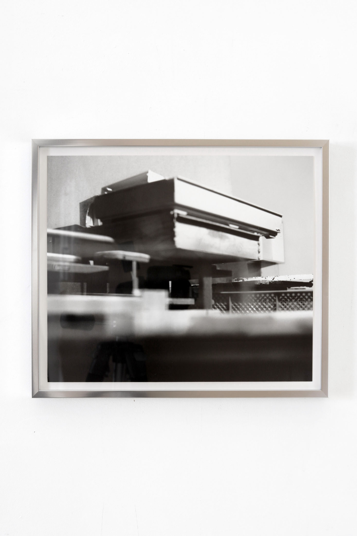 Voïta’s photographs are images of physical objects he sets up in his studio. As flat representations, they depart from their subject: One instead sees a camera, a building, a straight cut, a geometrical shape. They evoke a process of composition that gets illustrated in sculpture. Picture planes literally break in Voïta’s movable objects, which change two things at once: themselves and the space that contains them. It is as though photography told the artist what to sculpt.