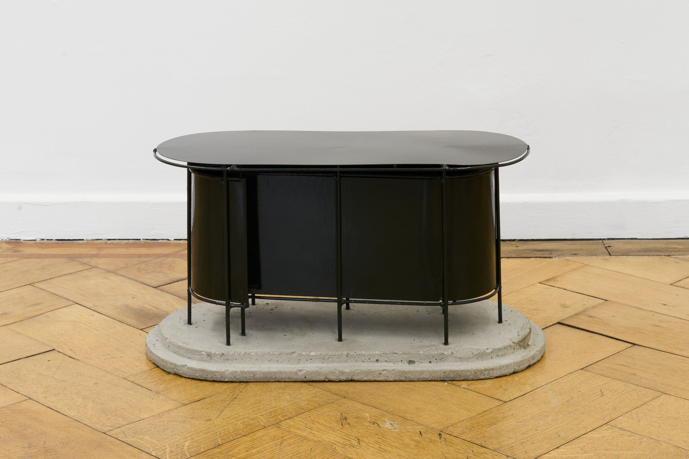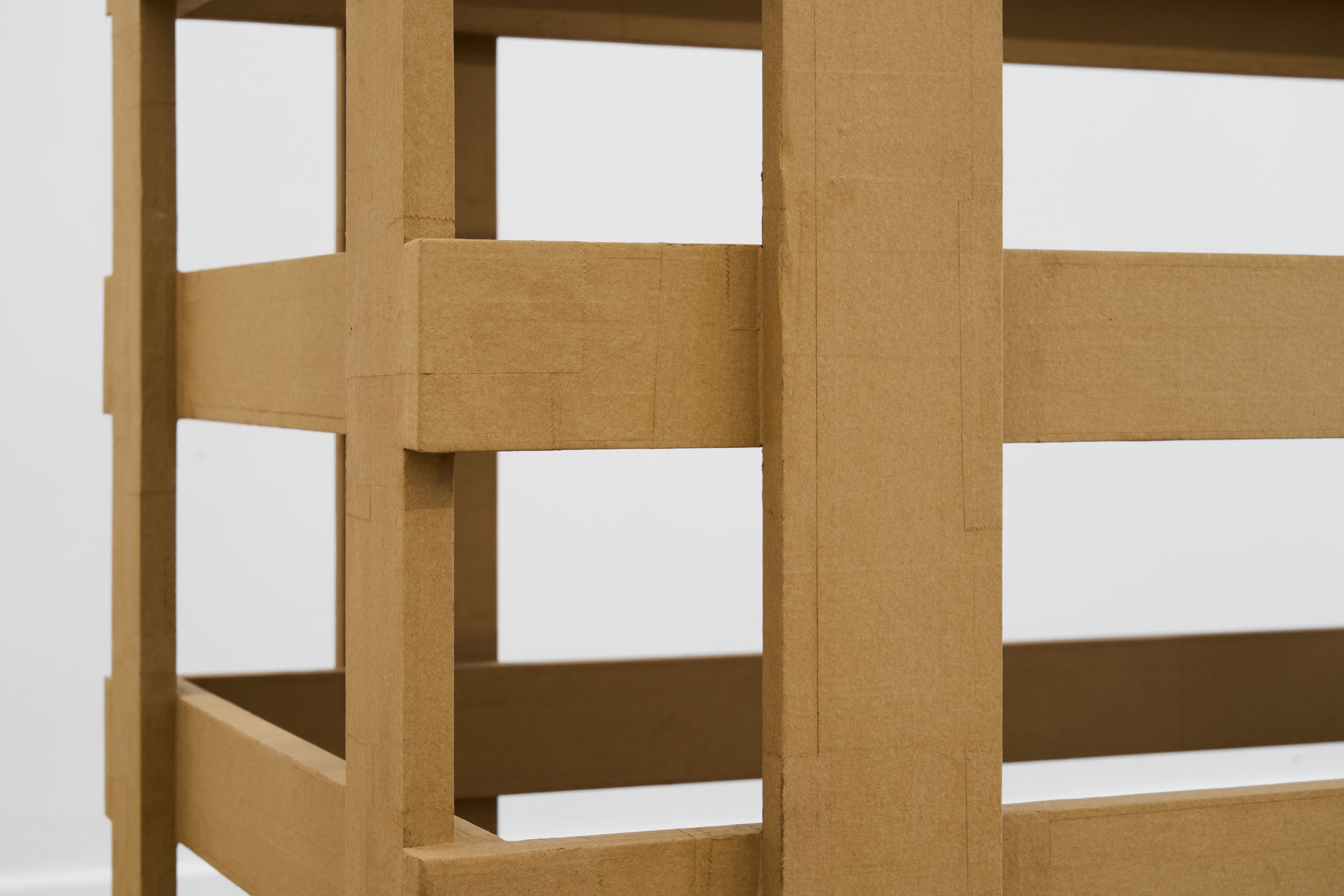 The architectural models and the cardboard works are personal takes on the broad conception of space. Voïta replicates the door of the gallery, opening a passage that leads nowhere physically but elsewhere mentally. He creates unusual spaces. For example, in the model of a public urinal where one cannot come in or out, or in a cardboard cage that opens only if ripped apart.