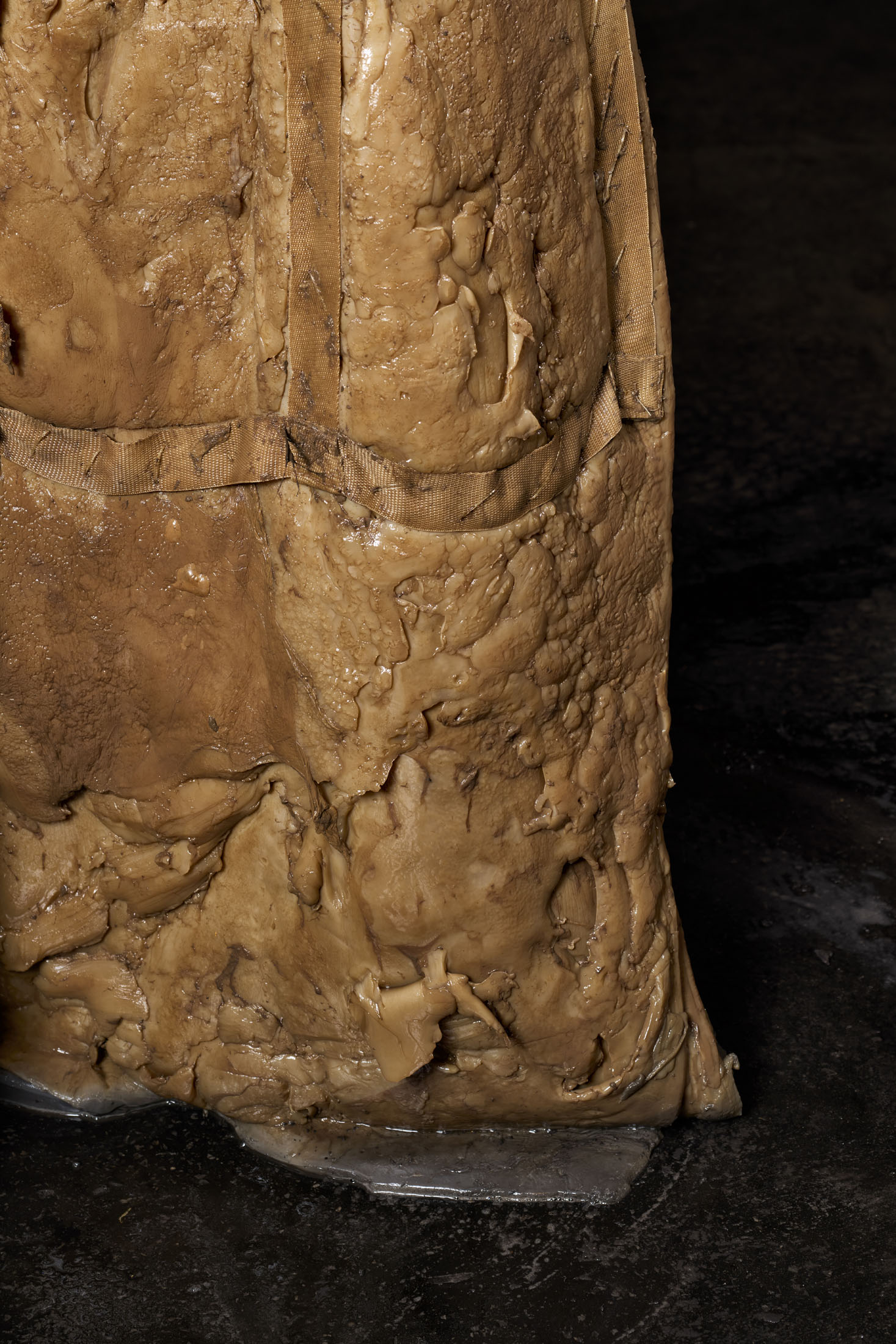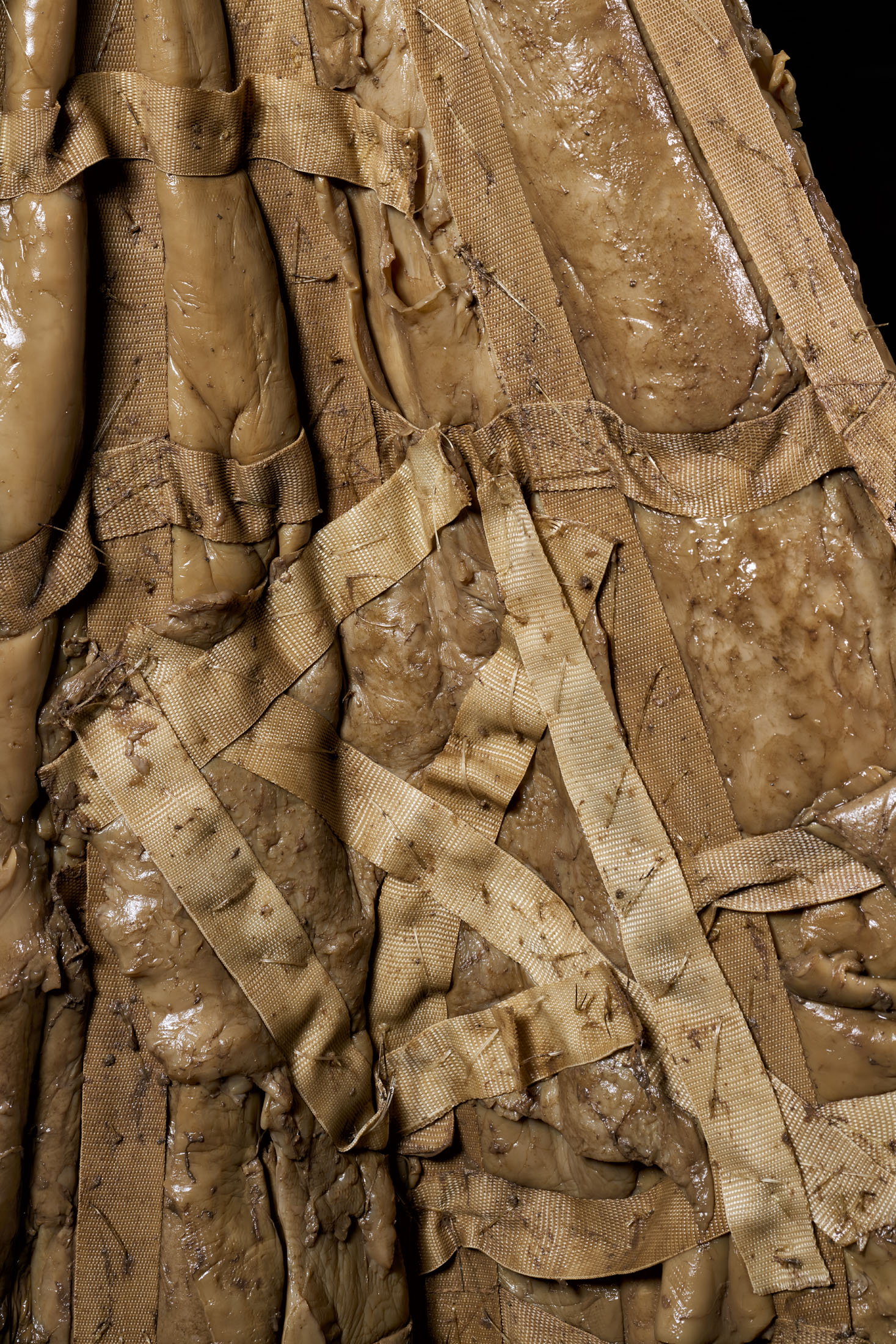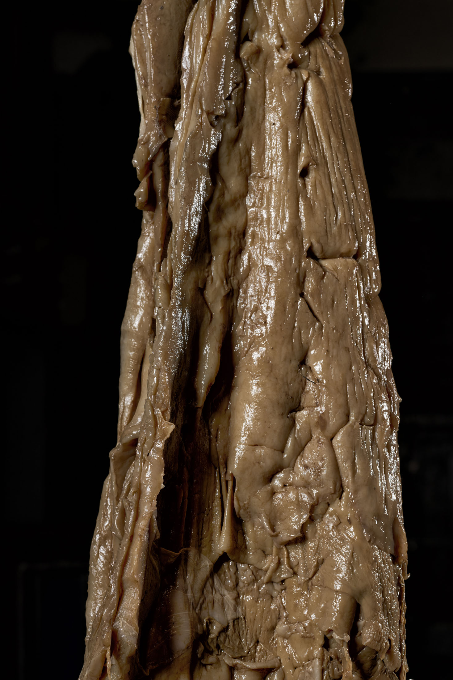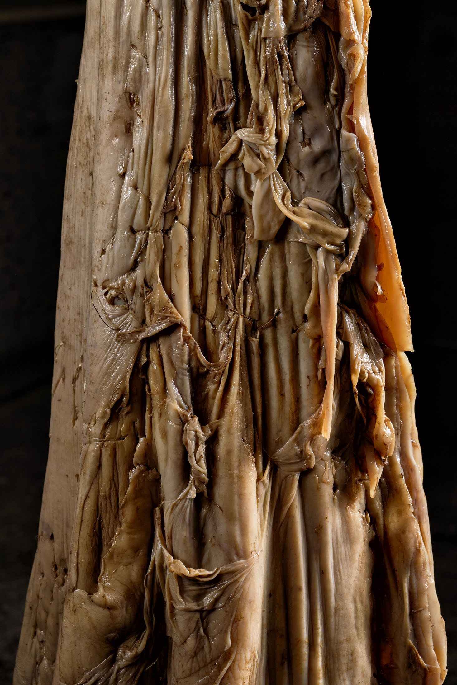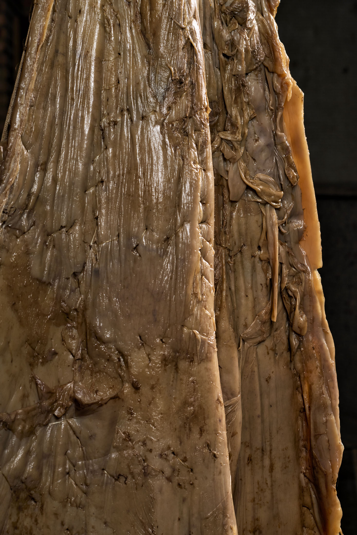 Bianca grows and manipulates SCOBY on a large scale, a formal operation that poses a perceptual, aesthetic challenge. As the SCOBY grows, the first film becomes thicker and transforms into a gelatinous, beige-colored, thick microbial layer that resembles flesh and is visually difficult to classify as life or non-life. The transformation Bianca subjects the domestic SCOBY to produces an estrangement that is extensible to fungi, bacteria, yeasts, and microbial life who are generally omnipresent in our bodies and/or the environment. All of them are often invisible, so when they grow and reach human scale, they become radically unfamiliar to us. Bianca uses this ambiguity to challenge pre-established categories and boundaries, practising an interrogative intimacy with a potentially repulsive and non-human ‘other’.