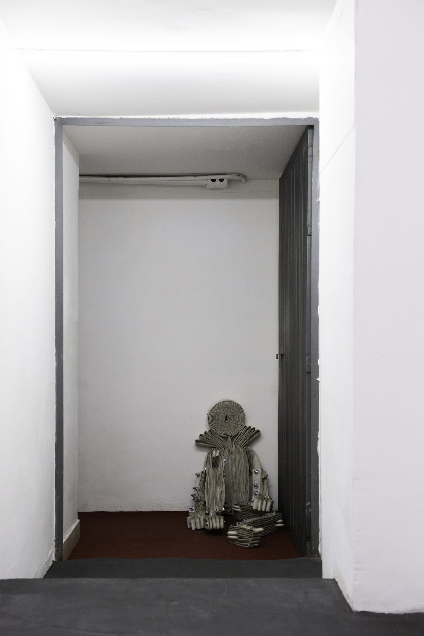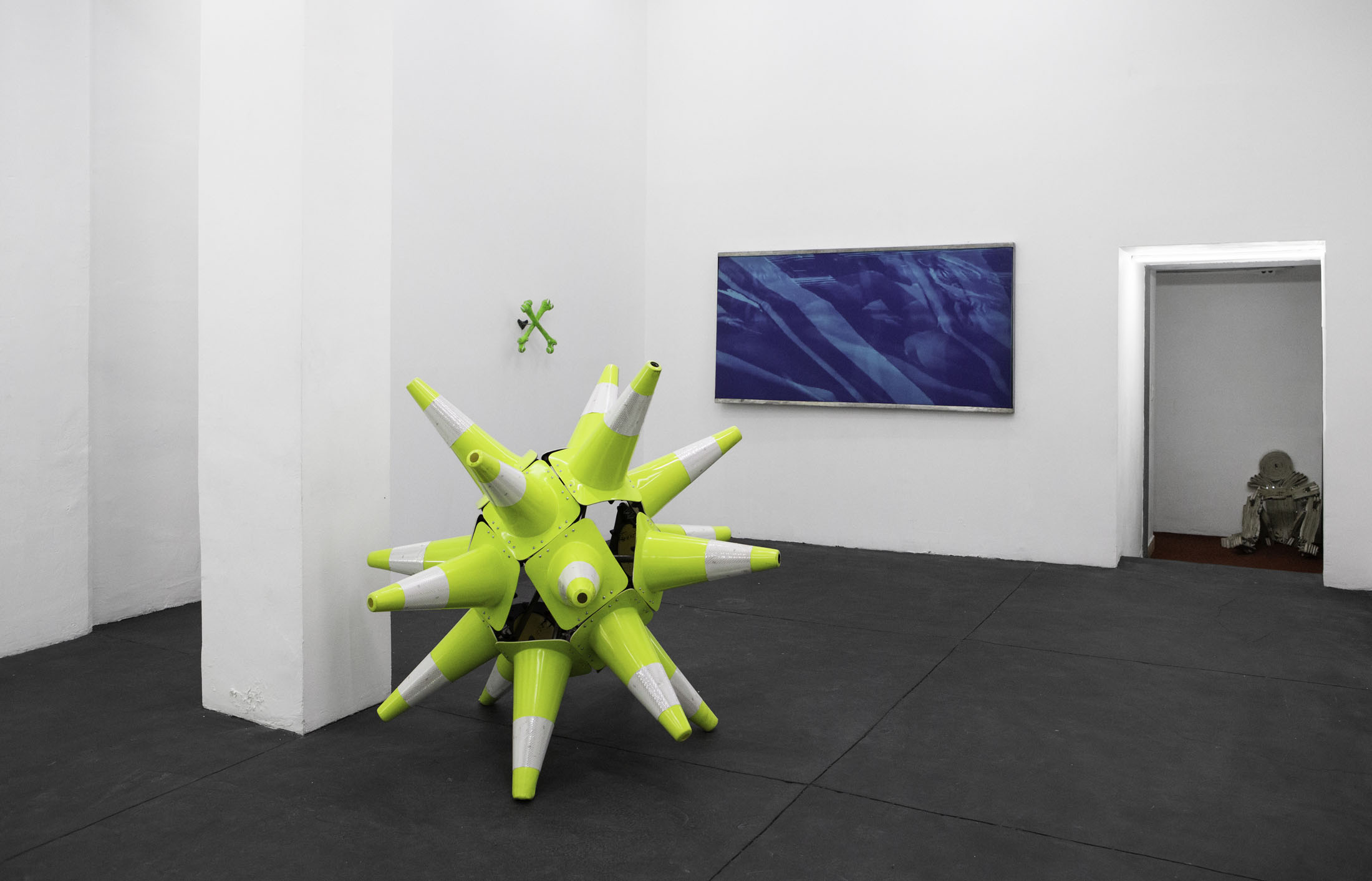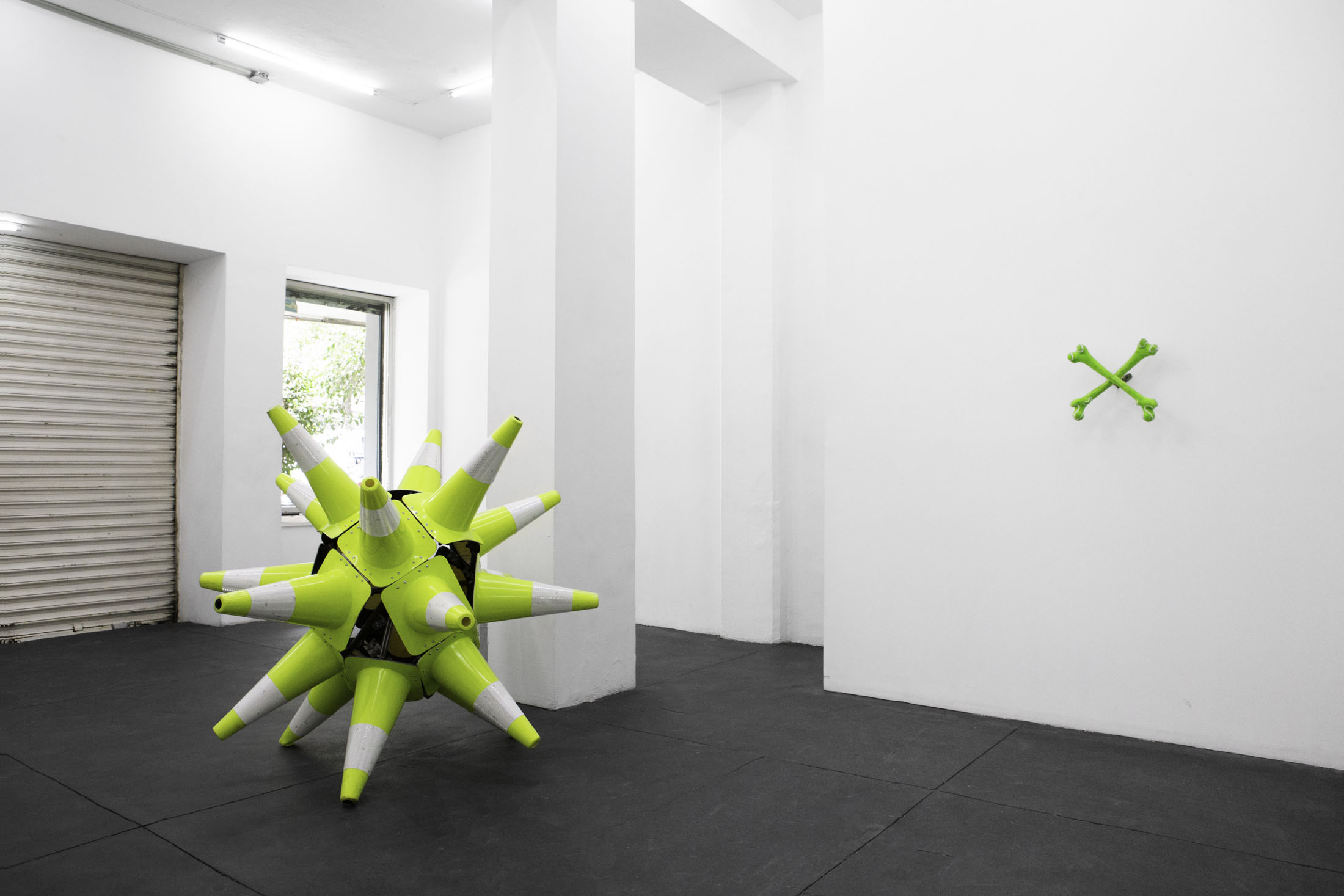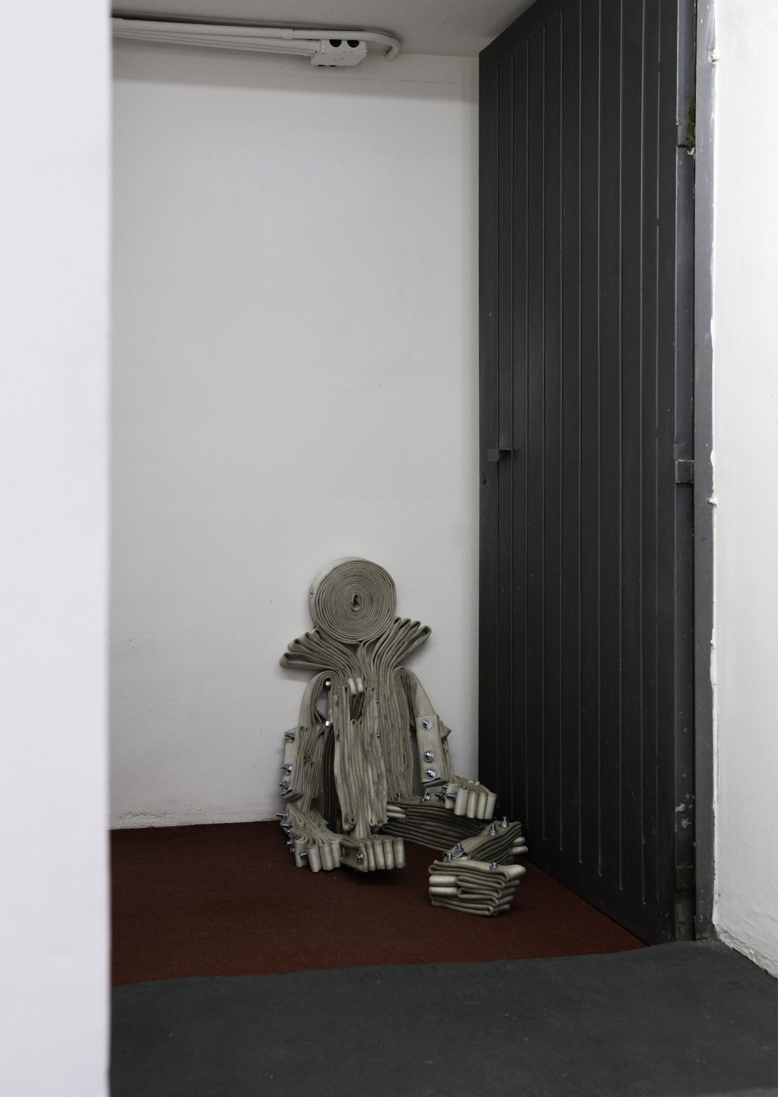 There are poignant ways with which the artists envision relaxation. For Clarken, sexual desire is addressed through materials and representative images. There is a deviant imperative which focuses in-between things which have and will continue to be consumed, such as pornographic imagery, although instead on focusing on obtrusive violence, she instead chooses to highlight the break in the signal. Essentially, the works Clarken presents bring inconclusive explorations by giving semiotic twists in the significance of universal symbols. In a similar exercise, Nordmark uses ready-made objects to assemble sculptures that reference the control we maintain over animals, thus dissecting the human obsession with categorization and enquiring into the problematics of zoological sciences and the imprisonment of certain animal species. But the complexity of Nordmark’s pieces go beyond complaint, by delving into playful assemblages where he utilizes human objects which are used to prevent accidents, such as making a life size dummy out of firehoses, a rhinoceros toy made from traffic cones, and a felted set of femurs flocked with tennis ball felt.